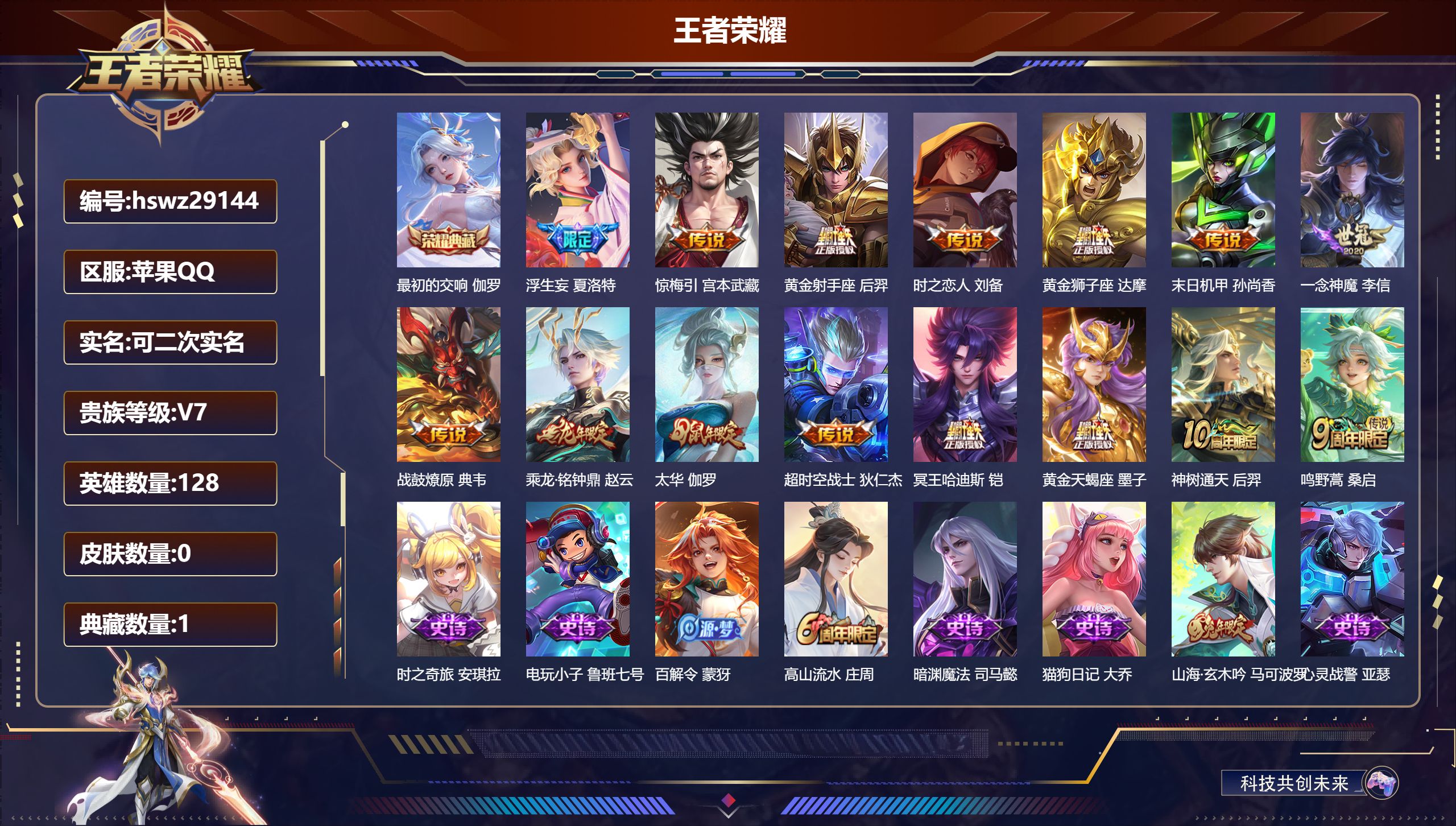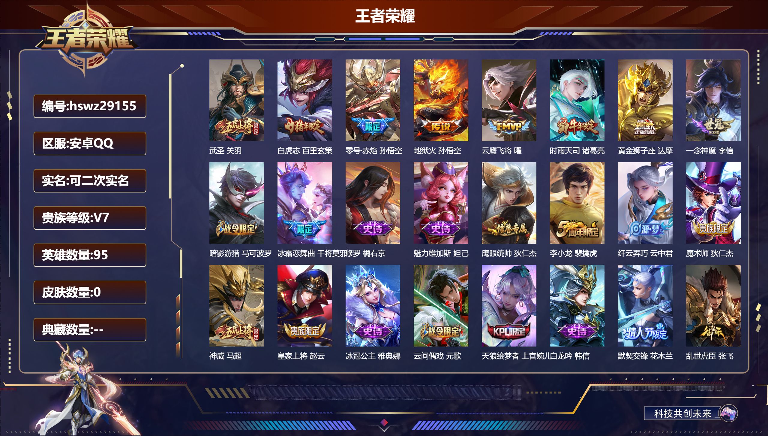 PX_2579108-Q/尊贵铂金/91皮肤/95英雄/0典藏/0珍品无双/0无双/0珍品传说/8传说/19史诗/7稀有英雄 【8,传说皮肤】武圣,关羽,白虎志,百里玄策,零号·赤焰,孙悟空,地狱火,孙悟空,云鹰飞将,曜,时雨天司,诸葛亮,黄金狮子座,达摩,一念神魔,李信, 【19,史诗皮肤】暗影游猎,马可波罗,冰霜恋舞曲,干将莫邪,修罗,橘右京,魅力维加斯,妲己,鹰眼统帅,狄仁杰,李小龙,裴擒虎,纤云弄巧,云中君,魔术师,狄仁杰,神威,马超,皇家上将,赵云,冰冠公主,雅典娜,云间偶戏,元歌,天狼绘梦者,上官婉儿,白龙吟,韩信,默契交锋,花木兰,乱世虎臣,张飞,龙胆,赵云,水果甜心,孙尚香,狂想玩偶喵,蒙犽, 【41,勇者皮肤】沙漠行僧,达摩,大漠名商,沈梦溪,缤纷绘卷,张良,拳王,达摩,醍醐杖,老夫子,白色死神,白起,黄金武士,典韦,阴阳师,狄仁杰,海滩派对,项羽,万华元夜,狄仁杰,无尽征程,廉颇,演武夺筹,程咬金,红桃皇后,芈月,野性能量,吕布,哥特玫瑰,露娜,原初探秘者,鬼谷子,西部大镖客,猪八戒,疑决卦,明世隐,化身博士,扁鹊,潮玩骑士王,亚瑟,救世之瞳,扁鹊,死亡骑士,亚瑟,掌控之力,诸葛亮,海滩丽影,钟无艳,忍·炎影,赵云,炽热元素使,姜子牙,坚韧之力,苏烈,乓乓大师,鲁班大师,兔女郎,花木兰,龙腾万里,关羽,千军破阵,苏烈,荣光之誓,亚瑟,万象初新,宫本武藏,单词大作战,雅典娜,教廷特使,韩信,街头霸王,韩信,云中旅人,李元芳,西部大镖客,孙悟空,少女阿狸,妲己,幻想奇妙夜,王昭君,驱傩正仪,钟馗, 【24,其他皮肤】芝加哥教父,黄忠,龙域领主,铠,死神来了,曹操,熊喵少女,阿古朵,木偶奇遇记,鲁班七号,福禄兄弟,鲁班七号,精灵王,后羿,午夜歌剧院,元歌,启蛰,司空震,异域舞娘,貂蝉,街头旋风,裴擒虎,修竹墨客,上官婉儿,剑舞者,花木兰,维京掠夺者,苍,归虚梦演,蒙犽,激情绿茵,马可波罗,归虚梦演,曜,幸存者,马超,荷鲁斯之眼,云中君,创世神祝,盘古,特种部队,李元芳,绝影神枪,百里守约,孤猎,澜,西部大镖客,孙悟空, 【7,稀有英雄】不知火舞,橘右京,夏洛特,娜可露露,韩信,艾琳,赵云, 营地ID:,