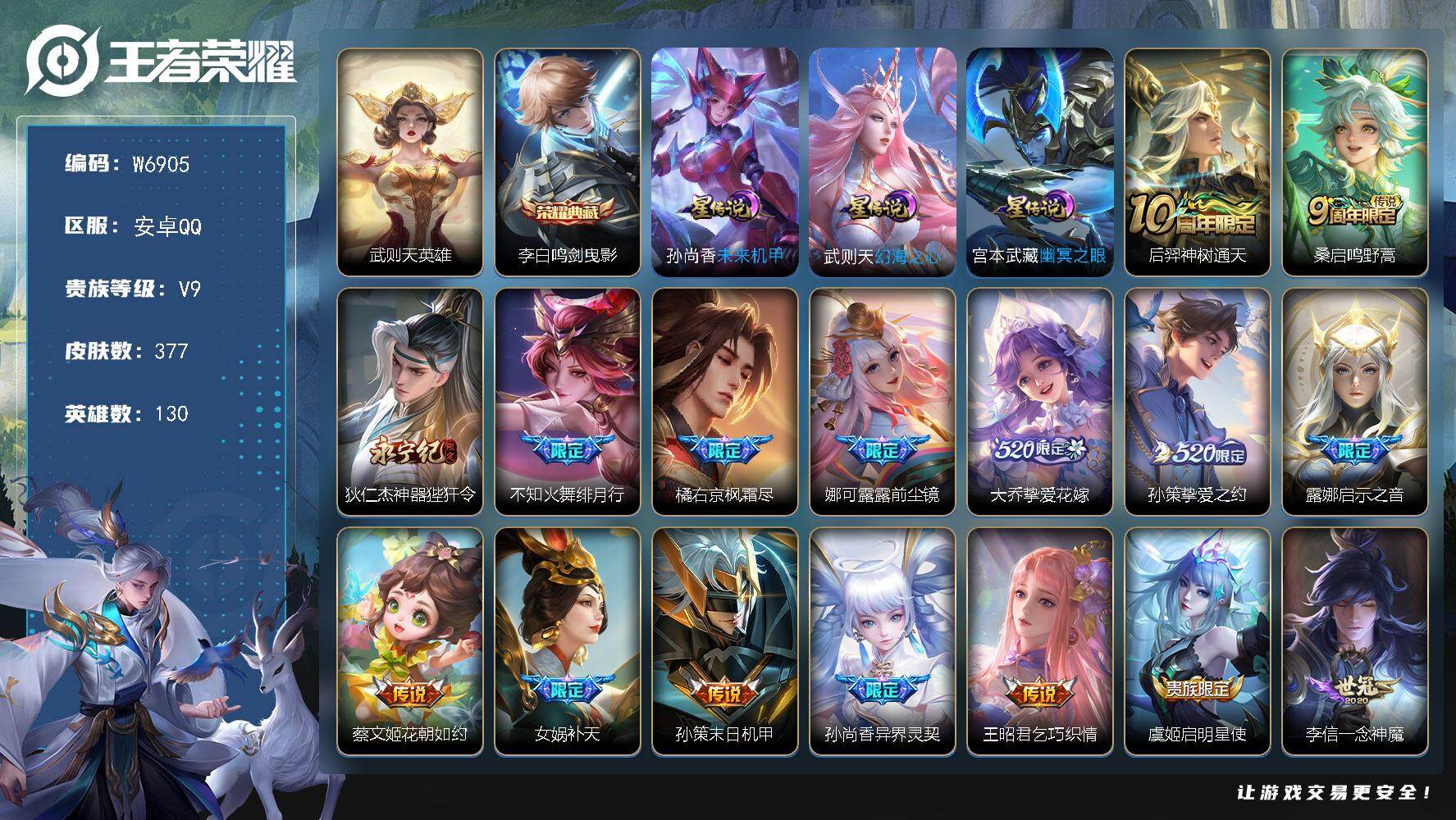 PX_2566397-,可二次,V9,贵族积分,苹果QQ/415皮肤/128英雄/3典藏/0珍品无双/3无双/3珍品传说/45传说/119史诗/9稀有英雄,,天幕,怪盗基德,敬我三分 【4,星传说皮肤】,时之思念,刘备,幽冥之眼,宫本武藏,金色仲夏夜,貂蝉,星际治安官,狄仁杰, 【3,珍品传说】,黑崎一护,宫本武藏,怪盗基德,马可波罗,兔狲·蓬尾,张飞, 【3,典藏皮肤】,鸣剑·曳影,李白,九霄神辉,花木兰,最初的交响,伽罗, 【3,无双皮肤】,碎月剑心,李白,花合斗,不知火舞,群星魔术团,韩信, 【45,传说皮肤】,胖达荣荣,梦奇,启明星使,虞姬,逐花归海,澜,电玩·雷克斯,澜,白虎志,百里玄策,九山相柳,司马懿,零号·赤焰,孙悟空,云鹰飞将,曜,凤求凰,李白,燃星之曲,花木兰,浮生妄,夏洛特,仲夏夜之梦,貂蝉,神骥·逐星野,马超,地狱之眼,宫本武藏,神骥·镇沧海,关羽,异界灵契,花木兰,鹤羽星尊,诸葛亮,时雨天司,诸葛亮,音你心动,周瑜,炽阳神光,镜,黄金射手座,后羿,霜月吟,露娜,时之恋人,刘备,黄金狮子座,达摩,久胜战神,干将莫邪,乘龙·淬吴钩,孙策,山海·炽霜斩,李信,画中仙,干将莫邪,乘龙·铭钟鼎,赵云,绛天战甲,铠,妄想实况,马可波罗,超时空战士,狄仁杰,山海·苍雷引,曜,琥珀纪元,马超,冠军飞将,花木兰,黄金白羊座,张良,星之鸣奏,杨玉环,愿照·九州拓,澜,诡秘之主,元歌,神树通天,后羿,愿照·山河定,司空震,愿照·岁时盈,虞姬,愿照·千秋盛,女娲,鸣野蒿,桑启,云诺千山,公孙离, 【119,史诗皮肤】,时之奇旅,安琪拉,末日机甲,吕布,蔬乡物语,鲁班七号,超元猎域,百里玄策,紫霞仙子,露娜,百解令,蒙犽,银河之约,李元芳,暗渊魔法,司马懿,暗影游猎,马可波罗,燃音魔法,高渐离,冰霜恋舞曲,干将莫邪,天秀·启明,杨戬,狮舞东方,鲁班七号,猫狗日记,大乔,德古拉伯爵,刘邦,心灵战警,亚瑟,星君·亢金,达摩,银翎春语,杨玉环,无心,元歌,巫礼祀神,少司缘,鬼剑武藏,宫本武藏,迷踪丽影,阿轲,星夜王子,白起,守夜人,弈星,无限星赏官,公孙离,线条小狗,周瑜,摇滚巨星,嬴政,顽趣,梦奇,修罗,橘右京,拒霜思,嫦娥,魅力维加斯,妲己,黄金分割率,诸葛亮,赞萌露比,云缨,偶像歌手,王昭君,荣光圣徽,蒙恬,女仆咖啡,妲己,九幽镇关,项羽,晚萤,娜可露露,遇见神鹿,瑶,舞动绿茵,蔡文姬,繁星吟游,蔡文姬,暗夜贵公子,嬴政,鹰眼统帅,狄仁杰,胡桃异想国,米莱狄,大圣娶亲,孙悟空,飞衡,韩信,孙行者,孙悟空,李小龙,裴擒虎,光弋星穹,莱西奥,纤云弄巧,云中君,驯魔猎人,兰陵王,龙骑士,墨子,特工魅影,百里守约,猫狗日记,孙策,原初追逐者,百里玄策,逐浪之夏,李元芳,奇幻香踪,扁鹊,藏狐·褐绒,老夫子,引擎之心,赵云,黎明之约,雅典娜,石田雨龙,后羿,魔术师,狄仁杰,埋骨钱,暃,龙之律动,狂铁,神威,马超,皇家上将,赵云,冰冠公主,雅典娜,至尊宝,孙悟空,辉光之辰,后羿,功夫厨神,程咬金,东方月初,大司命,梁祝,上官婉儿,电玩·爆裂旋风,刘禅,天才门将,刘禅,圣诞恋歌,貂蝉,云间偶戏,元歌,水晶猎龙者,花木兰,撼地雄心,廉颇,涂山容容,公孙离,破空之剑,亚连,神器·万象笔,上官婉儿,心动手记,海诺,御风骁将,吕布,圣诞狂欢,吕布,青焰无极,镜,浮光幕影,芈月,夏日便利店,蔡文姬,星界战将,牛魔,永昼,夏洛特,地狱岩魂,廉颇,茶境仙,孙膑,冰雪圆舞曲,甄姬,青蛇,小乔,默契交锋,花木兰,月团寄思,沈梦溪,千年之狐,李白,节奏热浪,阿轲,暗夜猫娘,阿轲,梦圆繁星,盾山,曙光守护者,铠,心灵骇客,安琪拉,箭羽风息,伽罗,乱世虎臣,张飞,琥珀纪元,伽罗,万物之道,弈星,谪仙醉月,李白,星界特工,马可波罗,缤纷独角兽,小乔,陌上桑,艾琳,百相守梦,百里守约,线条小狗,小乔,炽弈燎原,弈星,时之恋人,孙尚香,水果甜心,孙尚香,化蝶舞,阿轲,江河有灵,阿古朵,幽灵船长,曹操,乘风破浪,夏侯惇,暗隐猎兽者,兰陵王, 【175,勇者皮肤】,时空谍影,海诺,玲珑珍味,西施,圆桌骑士,盾山,烛龙,曹操,爱心护理,阿轲,太极少年,赵怀真,星际陆战队,达摩,沙漠行僧,达摩,大漠名商,沈梦溪,缤纷绘卷,张良,纽约教父,刘备,拳王,达摩,大发明家,达摩,龙舞盛年,沈梦溪,丁香结,小乔,功夫炙烤,廉颇,铁甲之心,典韦,沉稳之力,孙尚香,海盐诗旅,桑启,幻泉雾影,海月,朔风刀,夏侯惇,醍醐杖,老夫子,汉昭烈帝,刘备,白色死神,白起,黑桃队长,鲁班七号,黄金武士,典韦,王牌新星,海月,御旌,牛魔,阴阳师,狄仁杰,径山谋武,孙权,次元突破,哪吒,古海寻踪,张良,牛运亨通,牛魔,科学大爆炸,项羽,戏梦巡演,空空儿,功夫老勺,老夫子,鲨炮海盗猫,沈梦溪,虎啸剑宗,刘邦,海滩派对,项羽,万华元夜,狄仁杰,无尽征程,廉颇,克喵,鬼谷子,制霸全明星,牛魔,踏浪烽翎,莱西奥,演武夺筹,程咬金,红桃皇后,芈月,奇妙博物学,庄周,西部游侠,莱西奥,守护之力,大乔,无双福将,程咬金,百相守梦,影,原初探秘者,鬼谷子,星空之诺,沈梦溪,潮玩探月行,猪八戒,天穹祈灯,鬼谷子,西部大镖客,猪八戒,疑决卦,明世隐,化身博士,扁鹊,潮玩骑士王,亚瑟,阿尔法小队,后羿,无尽旅途,扁鹊,五福同心,张飞,金色潮汐,朵莉亚,次元傲视,杨戬,星际陆战队,程咬金,幻乐之宴,鬼谷子,霸王丸,宫本武藏,虹云星官,明世隐,雾影缉谜,兰陵王,潮玩牛仔,马可波罗,舞狮寰,吕布,救世之瞳,扁鹊,赤刃凌霄,敖隐,潮玩骑兵,杨戬,赤莲之焰,周瑜,死亡骑士,亚瑟,敏锐之力,李白,破局者,亚连,幽兰居士,张良,玩偶对对碰,安琪拉,掌控之力,诸葛亮,海滩丽影,钟无艳,落日弦歌,高渐离,忍·炎影,赵云,雪境奇遇,西施,重明,芈月,坚韧之力,