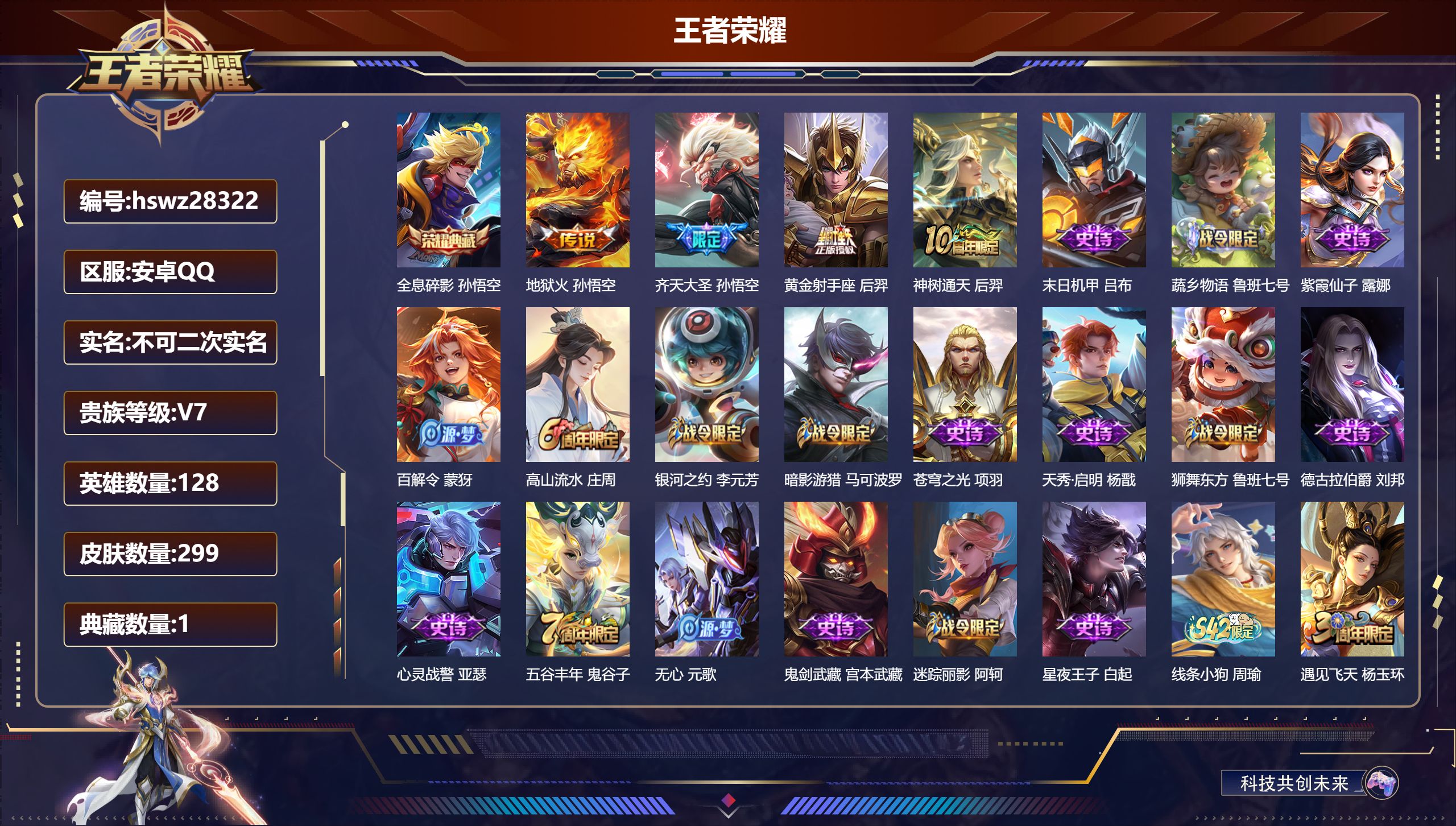 PX_2579356-Q/永恒钻石/299皮肤/128英雄/1典藏/0珍品无双/0无双/0珍品传说/4传说/78史诗/8稀有英雄 【1,典藏皮肤】全息碎影,孙悟空, 【4,传说皮肤】地狱火,孙悟空,齐天大圣,孙悟空,黄金射手座,后羿,神树通天,后羿, 【78,史诗皮肤】末日机甲,吕布,蔬乡物语,鲁班七号,紫霞仙子,露娜,百解令,蒙犽,高山流水,庄周,银河之约,李元芳,暗影游猎,马可波罗,苍穹之光,项羽,天秀·启明,杨戬,狮舞东方,鲁班七号,德古拉伯爵,刘邦,心灵战警,亚瑟,五谷丰年,鬼谷子,无心,元歌,鬼剑武藏,宫本武藏,迷踪丽影,阿轲,星夜王子,白起,线条小狗,周瑜,遇见飞天,杨玉环,摇滚巨星,嬴政,电玩高手,狂铁,拒霜思,嫦娥,魅力维加斯,妲己,女仆咖啡,妲己,星界游侠,暃,舞动绿茵,蔡文姬,繁星吟游,蔡文姬,鹰眼统帅,狄仁杰,胡桃异想国,米莱狄,飞衡,韩信,孙行者,孙悟空,李小龙,裴擒虎,光弋星穹,莱西奥,驯魔猎人,兰陵王,龙骑士,墨子,金属风暴,墨子,特工魅影,百里守约,逐浪之夏,李元芳,奇幻香踪,扁鹊,未来纪元,赵云,石田雨龙,后羿,优雅恋人,嬴政,魔术师,狄仁杰,皇家上将,赵云,至尊宝,孙悟空,辉光之辰,后羿,功夫厨神,程咬金,梁祝,上官婉儿,电玩·爆裂旋风,刘禅,天才门将,刘禅,圣诞恋歌,貂蝉,云间偶戏,元歌,水晶猎龙者,花木兰,烈魂,黄忠,圣诞狂欢,吕布,青焰无极,镜,地狱岩魂,廉颇,茶境仙,孙膑,冰雪圆舞曲,甄姬,火炮绅士,黄忠,月团寄思,沈梦溪,千年之狐,李白,节奏热浪,阿轲,超时空战士,钟无艳,游园惊梦,甄姬,曙光守护者,铠,万灵启世,女娲,心灵骇客,安琪拉,乱世虎臣,张飞,绅士熊喵,刘禅,缤纷独角兽,小乔,蓝屏警告,典韦,真爱魔法,干将莫邪,水果甜心,孙尚香,江河有灵,阿古朵,幽灵船长,曹操,乘风破浪,夏侯惇,暗隐猎兽者,兰陵王, 【147,勇者皮肤】时空谍影,海诺,圆桌骑士,盾山,爱心护理,阿轲,星际陆战队,达摩,沙漠行僧,达摩,大漠名商,沈梦溪,缤纷绘卷,张良,纽约教父,刘备,拳王,达摩,大发明家,达摩,乐园追猎者,白起,丁香结,小乔,功夫炙烤,廉颇,铁甲之心,典韦,沉稳之力,孙尚香,幻夜卜梦,芈月,爱与正义,程咬金,海盐诗旅,桑启,幻泉雾影,海月,朔风刀,夏侯惇,醍醐杖,老夫子,朔望之晖,女娲,归虚梦演,孙膑,汉昭烈帝,刘备,白色死神,白起,黑桃队长,鲁班七号,黄金武士,典韦,落雪兰心,甄姬,夺宝奇兵,刘邦,御旌,牛魔,阴阳师,狄仁杰,次元突破,哪吒,古海寻踪,张良,牛运亨通,牛魔,功夫老勺,老夫子,西部大镖客,牛魔,鲨炮海盗猫,沈梦溪,虎啸剑宗,刘邦,海滩派对,项羽,完美运算,后羿,万华元夜,狄仁杰,制霸全明星,牛魔,演武夺筹,程咬金,红桃皇后,芈月,奇妙博物学,庄周,西部游侠,莱西奥,野性能量,吕布,哥特玫瑰,露娜,守护之力,大乔,无双福将,程咬金,瓷语鉴心,露娜,原初探秘者,鬼谷子,星空之诺,沈梦溪,潮玩探月行,猪八戒,鸿运当头,亚瑟,天穹祈灯,鬼谷子,决胜大满贯,曹操,西部大镖客,猪八戒,疑决卦,明世隐,如懿,安琪拉,化身博士,扁鹊,潮玩骑士王,亚瑟,阿尔法小队,后羿,无尽旅途,扁鹊,五福同心,张飞,金色潮汐,朵莉亚,次元傲视,杨戬,幻乐之宴,鬼谷子,霸王丸,宫本武藏,虹云星官,明世隐,潮玩牛仔,马可波罗,救世之瞳,扁鹊,潮玩骑兵,杨戬,赤莲之焰,周瑜,死亡骑士,亚瑟,敏锐之力,李白,危途狂花,戈娅,玩偶对对碰,安琪拉,掌控之力,诸葛亮,海滩丽影,钟无艳,圣弓游侠,后羿,忍·炎影,赵云,雪境奇遇,西施,炽热元素使,姜子牙,坚韧之力,苏烈,唤灵魔甲,刘禅,万事如意,刘备,擒涛扼浪,裴擒虎,乓乓大师,鲁班大师,逐霄之志,曹操,探海日志,鲁班大师,女武神,艾琳,天使之翼,孙膑,玩趣恶龙,高渐离,兔女郎,花木兰,龙腾万里,关羽,金庭之子,兰陵王,幻夜行动,兰陵王,未来纪元,宫本武藏,千军破阵,苏烈,往忆晖光,明世隐,荣光之誓,亚瑟,花好人间,甄姬,万象初新,宫本武藏,潮玩造梦师,刘备,御銮,盾山,时尚教父,姜子牙,春野之旅,钟无艳,秘密基地,刘禅,穷奇,典韦,教廷特使,韩信,街头霸王,韩信,云中旅人,李元芳,妄想特派,李元芳,西部大镖客,孙悟空,进击墨子号,墨子,蔬乡物语,李元芳,少女阿狸,妲己,混沌棋,弈星,御霄,米莱狄,蔚蓝守将,蒙恬,暖冬·兔眠,嫦娥,命运加冕,露娜,午后时光,王昭君,幻想奇妙夜,王昭君,驱傩正仪,钟馗,神迹守卫,钟馗,命运角斗场,狂铁,特工战影,狂铁,白执事,赵云,劲辣红锅,太乙真人,剑破天穹,刘邦,异域游侠,刘备,苍威无极,项羽,铁骨偃魂,典韦,苍林狼骑,苍,魅影绮裳,影,长夏之忆,貂蝉,访茗客,马超,星梦巡礼,姜子牙,谧流熔炉,太乙真人,群星魔术团,程咬金,暗都幽影,大司命,鹤鸣心笺,艾琳,线条小狗,周瑜,线条小狗,桑启,噬灭天穹,东皇太一, 【71,其他皮肤】伊势巫女,大乔,金属狂潮,高渐离,前尘,金蝉,战争骑士,夏侯惇,圣殿之光,刘邦,芝加哥教父,黄忠,潮流仙人,老夫子,三太子,哪吒,棒球奇才,沈梦溪,极冰防御线,盾山,龙域领主,铠,生化警戒,钟无艳,死神来了,曹操,超能战警,曹操,花见巫女,伽罗,未来旅行,孙膑,第七人偶,干将莫邪,万圣前夜,小乔,灼热之刃,李信,海之征途,孙策,木偶奇遇记,鲁班七号,福禄兄弟,鲁班七号,帝国元帅,项羽,精灵王,后羿,碧珀绯影,暃,海军大将,周瑜,星航指挥官,诸葛亮,英喵野望,刘禅,午夜歌剧院,元歌,启蛰,司空震,隐刃,兰陵王,霓裳曲,杨玉环,花间舞,公孙离,异域舞娘,貂蝉,街头旋风,裴擒虎,东海龙王,东皇太一,剑舞者,花木兰,范海辛,李白,维京掠夺者,苍,占星师,明世隐,归虚梦演,蒙犽,激情绿茵,马可波罗,归虚梦演,