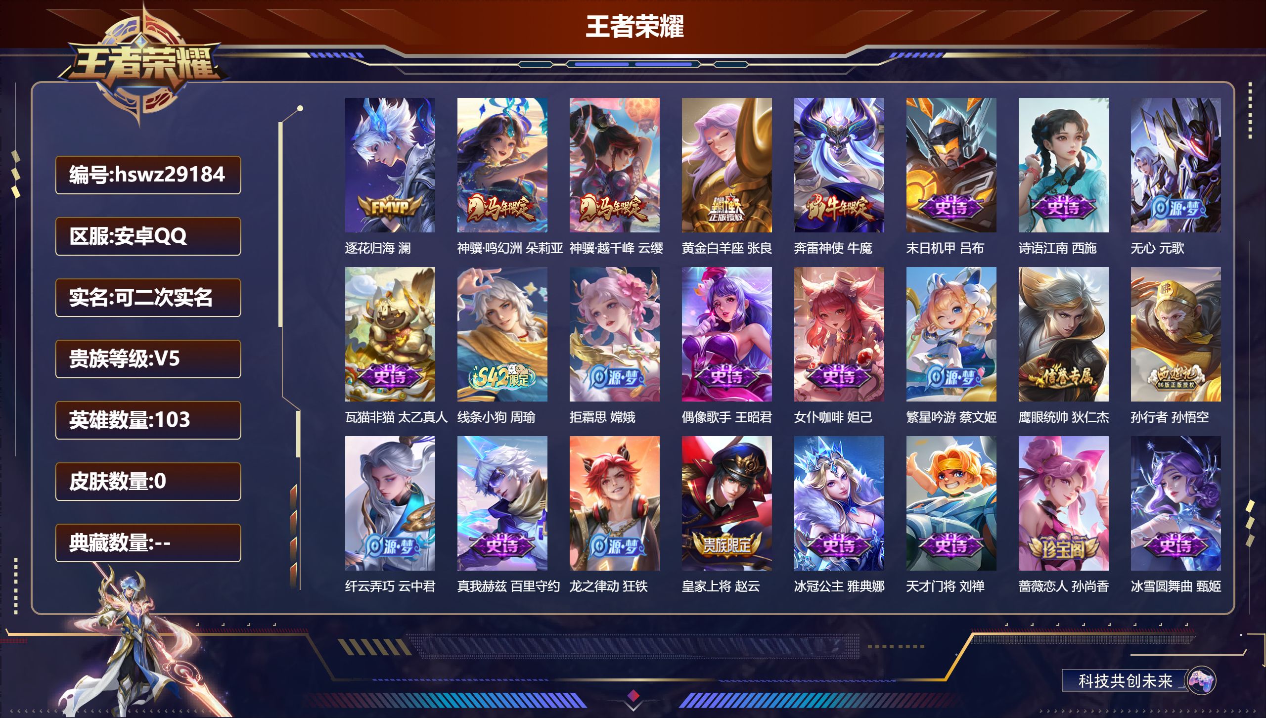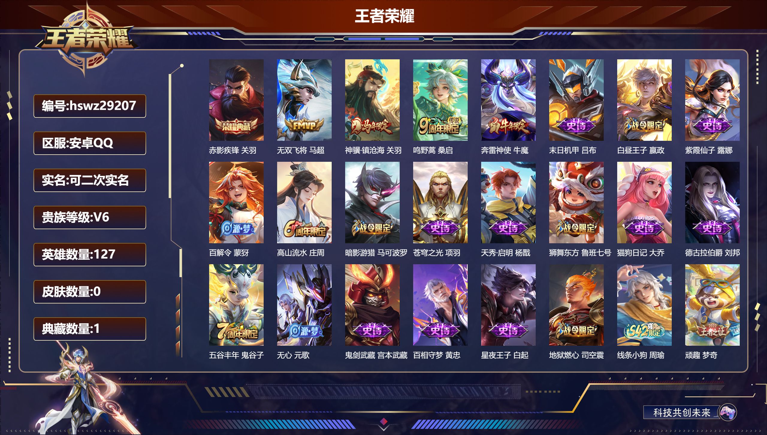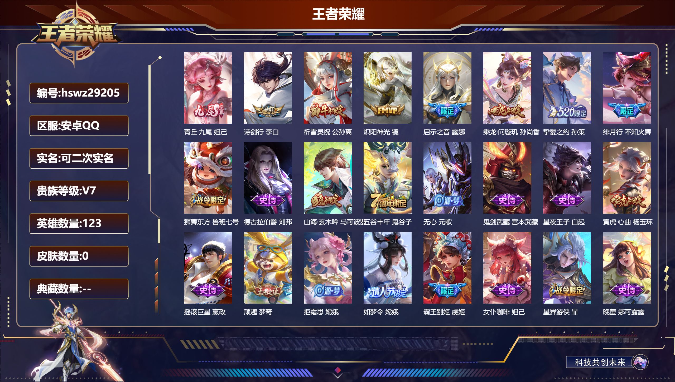 PX_2579388-可换绑【V9高质量中路精品号·金标万战火舞·金标韩信·万战司空震·38段中路·虎年全套·2典藏·貂蝉曦玄引·李逍遥·祈雪灵祝·白虎志·武陵仙君·凤求凰·傲雪梅枪·孙行者·白鹤梁神女·神威·婉儿KPL·飞衡·嫦娥如梦令·冰霜恋舞曲·10万贵族积分】4星传说,1天幕,2按键,21王者印记,满级铭文,可二次安卓Q-V9-287皮肤-1典藏皮肤-1典藏英雄-17传说-90史诗【荣耀典藏】:武则天英雄,小乔天鹅之梦【星元皮肤】:孙尚香未来机甲,武则天幻海之心,孙悟空幽冥火,貂蝉金色仲夏夜【天幕】:共赏芳华天幕【传说皮肤】:貂蝉曦玄引,澜逐花归海,裴擒虎寅虎赤拳,鲁班七号寅虎瑞焰,曜李逍遥,,公孙离祈雪灵祝,虞姬启明星使,李信一念神魔,百里玄策白虎志,后羿黄金射手座,诸葛亮武陵仙君,貂蝉仲夏夜之梦,李白凤求凰,孙尚香末日机甲,宫本武藏地狱之眼,孙悟空地狱火,武则天海洋之心【限定皮肤】:白起狰,狄仁杰阴阳师,虞姬凯尔特女王,廉颇寅虎御盾,赵云皇家上将,墨子神迹守卫,嬴政优雅恋人,嬴政白昼王子,鲁班七号狮舞东方,鲁班七号寅虎瑞焰,庄周蜃楼王,高渐离死亡摇滚,高渐离玩趣恶龙,孙膑妖精王,孙膑天狼运算者,孙膑寅虎展翼,扁鹊炼金王,白起夜都怪侠,芈月重明,吕布猎兽之王,周瑜赤莲之焰,元歌云间偶戏,夏侯惇朔风刀,甄姬游园惊梦,曹操烛龙,典韦穷奇,典韦蓝屏警告,马可波罗逐梦之星,马可波罗暗影游猎,狄仁杰魔术师,狄仁杰万华元夜,达摩沙漠行僧,项羽海滩派对,老夫子醍醐杖,老夫子航海奇遇记,关羽冰锋战神,貂蝉逐梦之音,程咬金演武夺筹,韩信飞衡,韩信傲雪梅枪,王昭君凤凰于飞,兰陵王驯魔猎人,兰陵王金庭之子,花木兰瑞麟志,花木兰默契交锋,亚瑟潮玩骑士王,孙悟空孙行者,牛魔御旌,后羿辉光之辰,张飞虎魄,李元芳银河之约,李元芳云中旅人,虞姬启明星使,钟馗神迹守卫,钟馗驱傩正仪,杨玉环遇见飞天,杨玉环寅虎心曲,女娲朔望之晖,干将莫邪冰霜恋舞曲,雅典娜单词大作战,雅典娜黎明之约,蔡文姬繁星吟游,太乙真人饕餮,太乙真人华丽摇滚,鬼谷子原初探秘者,鬼谷子五谷丰年,诸葛亮武陵仙君,大乔白鹤梁神女,铠青龙志,苏烈千军破阵,百里玄策白虎志,百里玄策原初追逐者,百里守约朱雀志,弈星混沌棋,梦奇顽趣,公孙离祈雪灵祝,沈梦溪星空之诺,沈梦溪大漠名商,明世隐疑决卦,明世隐吟游魔法,裴擒虎李小龙,裴擒虎寅虎赤拳,裴擒虎擒涛扼浪,狂铁御狮,米莱狄御霄,云中君纤云弄巧,伽罗天狼溯光者,盾山御銮,猪八戒西部大镖客,猪八戒猪悟能,上官婉儿梁祝,上官婉儿天狼绘梦者,嫦娥如梦令,嫦娥拒霜思,曜李逍遥,,蒙犽狂想玩偶喵,鲁班大师探海日志,镜匿光追影者,桑启海盐诗旅,蒙恬荣光圣徽,鬼谷子天穹祈灯,貂蝉曦玄引,刘邦剑破天穹【年限皮肤】:王昭君凤凰于飞,李白凤求凰,后羿辉光之辰,花木兰瑞麟志,百里玄策白虎志,百里守约朱雀志,铠青龙志,韩信飞衡,公孙离祈雪灵祝,裴擒虎寅虎赤拳,鲁班七号寅虎瑞焰,孙膑寅虎展翼,廉颇寅虎御盾,杨玉环寅虎心曲【赛季限定】:庄周蜃楼王,孙膑妖精王,扁鹊炼金王,虞姬凯尔特女王,白起狰,太乙真人饕餮,曹操烛龙,芈月重明,典韦穷奇,狂铁御狮,米莱狄御霄,牛魔御旌,盾山御銮,夏侯惇朔风刀,弈星混沌棋,明世隐疑决卦,老夫子醍醐杖,鬼谷子原初探秘者,狄仁杰万华元夜,程咬金演武夺筹,钟馗驱傩正仪,苏烈千军破阵,达摩沙漠行僧,兰陵王金庭之子,沈梦溪大漠名商,李元芳云中旅人,桑启海盐诗旅,裴擒虎擒涛扼浪,鲁班大师探海日志,鬼谷子天穹祈灯,刘邦剑破天穹,百里玄策原初追逐者,雅典娜黎明之约,梦奇顽趣,蒙恬荣光圣徽【战令限定】:嬴政白昼王子,吕布猎兽之王,典韦蓝屏警告,女娲朔望之晖,鲁班七号狮舞东方,钟馗神迹守卫,兰陵王驯魔猎人,周瑜赤莲之焰,李元芳银河之约,沈梦溪星空之诺,马可波罗暗影游猎,猪八戒西部大镖客,蒙犽狂想玩偶喵,雅典娜单词大作战,元歌云间偶戏,亚瑟潮玩骑士王,老夫子航海奇遇记,墨子神迹守卫,明世隐吟游魔法,白起夜都怪侠,周瑜线条小狗【史诗皮肤】:周瑜线条小狗,后羿石田雨龙,狂铁龙之律动,蒙恬荣光圣徽,梦奇顽趣,鬼谷子五谷丰年,明世隐吟游魔法,孙膑寅虎展翼,廉颇寅虎御盾,杨玉环寅虎心曲,韩信傲雪梅枪,雅典娜黎明之约,镜匿光追影者,嫦娥拒霜思,猪八戒猪悟能,孙悟空孙行者,安琪拉时之奇旅,大乔白鹤梁神女,伽罗天狼溯光者,老夫子航海奇遇记,花木兰默契交锋,元歌云间偶戏,孙膑天狼运算者,云中君纤云弄巧,裴擒虎李小龙,百里玄策原初追逐者,蒙犽狂想玩偶喵,张飞虎魄,马可波罗暗影游猎,上官婉儿天狼绘梦者,孙尚香时之恋人,马超神威,橘右京修罗,不知火舞魅语,嫦娥如梦令,韩信飞衡,娜可露露晚萤,李元芳银河之约,蔡文姬繁星吟游,上官婉儿梁祝,兰陵王驯魔猎人,公孙离无限星赏官,狄仁杰鹰眼统帅,鲁班七号狮舞东方,典韦蓝屏警告,花木兰瑞麟志,干将莫邪冰霜恋舞曲,百里守约朱雀志,铠青龙志,大乔猫狗日记,嬴政白昼王子,杨玉环遇见飞天,白起星夜王子,程咬金功夫厨神,李元芳逐浪之夏,蔡文姬舞动绿茵,百里守约特工魅影,后羿辉光之辰,安琪拉心灵骇客,雅典娜冰冠公主,亚瑟心灵战警,马可波罗逐梦之星,甄姬游园惊梦,诸葛亮黄金分割率,兰陵王暗隐猎兽者,小乔缤纷独角兽,夏侯惇乘风破浪,刘邦德古拉伯爵,王昭君凤凰于飞,貂蝉逐梦之音,关羽冰锋战神,吕布末日