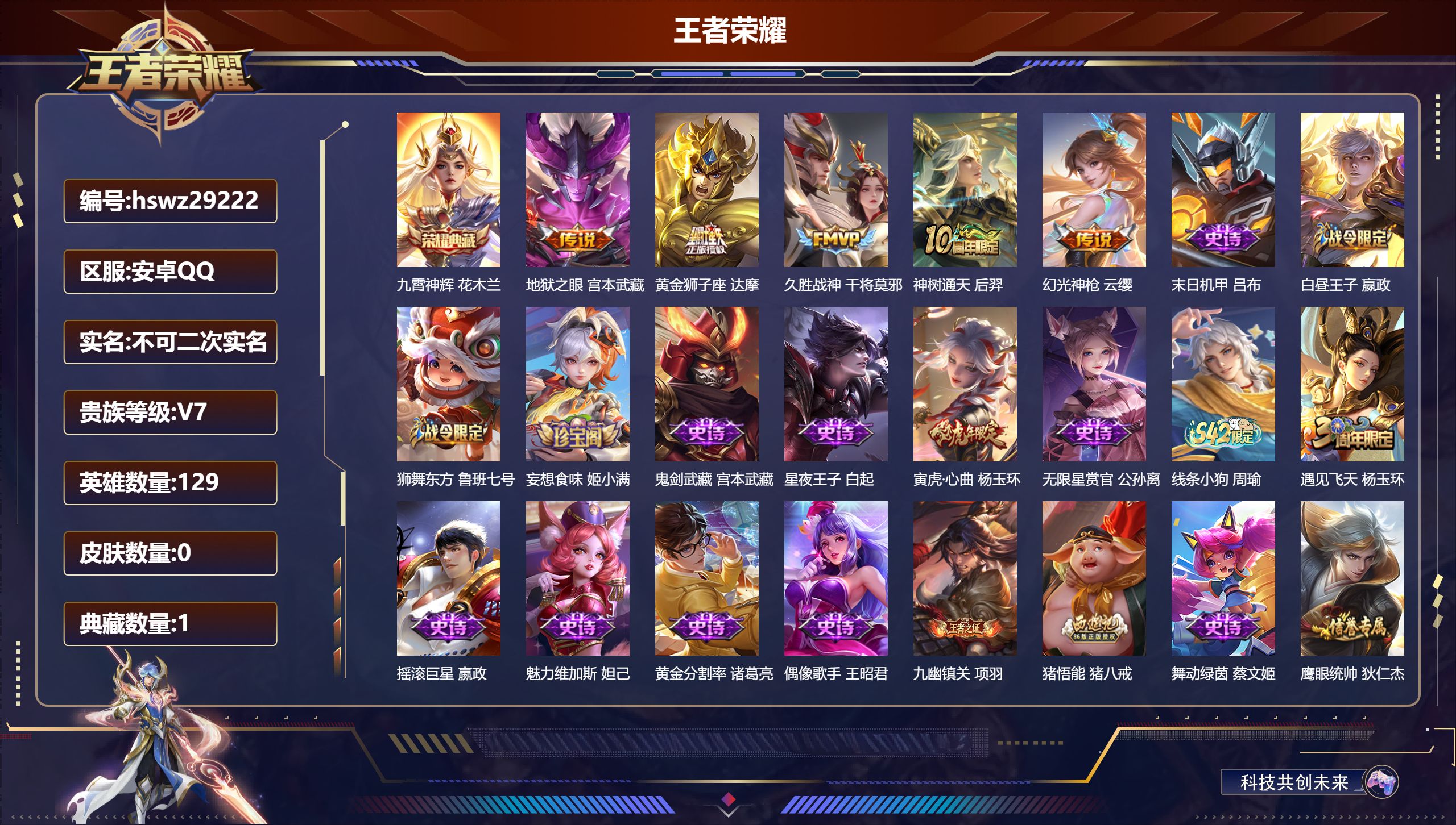 PX_2579348-Q/至尊星耀/212皮肤/129英雄/1典藏/0珍品无双/0无双/0珍品传说/5传说/59史诗/9稀有英雄 【1,典藏皮肤】九霄神辉,花木兰, 【5,传说皮肤】地狱之眼,宫本武藏,黄金狮子座,达摩,久胜战神,干将莫邪,神树通天,后羿,幻光神枪,云缨, 【59,史诗皮肤】末日机甲,吕布,白昼王子,嬴政,狮舞东方,鲁班七号,妄想食味,姬小满,鬼剑武藏,宫本武藏,星夜王子,白起,寅虎·心曲,杨玉环,无限星赏官,公孙离,线条小狗,周瑜,遇见飞天,杨玉环,摇滚巨星,嬴政,魅力维加斯,妲己,黄金分割率,诸葛亮,偶像歌手,王昭君,九幽镇关,项羽,猪悟能,猪八戒,舞动绿茵,蔡文姬,鹰眼统帅,狄仁杰,胡桃异想国,米莱狄,大圣娶亲,孙悟空,李小龙,裴擒虎,纤云弄巧,云中君,如梦令,后羿,龙骑士,墨子,金属风暴,墨子,傲雪梅枪,韩信,特工魅影,百里守约,原初追逐者,百里玄策,逐浪之夏,李元芳,未来纪元,赵云,石田雨龙,后羿,魔术师,狄仁杰,龙之律动,狂铁,皇家上将,赵云,冰冠公主,雅典娜,至尊宝,孙悟空,功夫厨神,程咬金,梁祝,上官婉儿,圣诞恋歌,貂蝉,水晶猎龙者,花木兰,涂山容容,公孙离,圣诞狂欢,吕布,魅语,不知火舞,白龙吟,韩信,圣诞老人,老夫子,蔷薇恋人,孙尚香,千年之狐,李白,节奏热浪,阿轲,游园惊梦,甄姬,万灵启世,女娲,乘龙·聚宝船,安琪拉,乱世虎臣,张飞,缤纷独角兽,小乔,蓝屏警告,典韦,水果甜心,孙尚香,瑰影绮梦,芈月,化蝶舞,阿轲,乘风破浪,夏侯惇,暗隐猎兽者,兰陵王, 【110,勇者皮肤】时空谍影,海诺,圆桌骑士,盾山,烛龙,曹操,星际陆战队,达摩,缤纷绘卷,张良,纽约教父,刘备,拳王,达摩,大发明家,达摩,龙舞盛年,沈梦溪,丁香结,小乔,功夫炙烤,廉颇,朔风刀,夏侯惇,醍醐杖,老夫子,朔望之晖,女娲,归虚梦演,孙膑,汉昭烈帝,刘备,白色死神,白起,黄金武士,典韦,御旌,牛魔,阴阳师,狄仁杰,致命风华,阿轲,次元突破,哪吒,古海寻踪,张良,功夫老勺,老夫子,西部大镖客,牛魔,鲨炮海盗猫,沈梦溪,海滩派对,项羽,完美运算,后羿,万华元夜,狄仁杰,踏浪烽翎,莱西奥,演武夺筹,程咬金,猎兽之王,吕布,野性能量,吕布,哥特玫瑰,露娜,守护之力,大乔,无双福将,程咬金,瓷语鉴心,露娜,原初探秘者,鬼谷子,潮玩探月行,猪八戒,天穹祈灯,鬼谷子,疑决卦,明世隐,化身博士,扁鹊,阿尔法小队,后羿,次元傲视,杨戬,幻乐之宴,鬼谷子,霸王丸,宫本武藏,虹云星官,明世隐,雾影缉谜,兰陵王,死亡骑士,亚瑟,浪漫序章,刘备,敏锐之力,李白,破局者,亚连,幽兰居士,张良,玩偶对对碰,安琪拉,掌控之力,诸葛亮,海滩丽影,钟无艳,忍·炎影,赵云,狰,白起,重明,芈月,炽热元素使,姜子牙,坚韧之力,苏烈,万事如意,刘备,乓乓大师,鲁班大师,探海日志,鲁班大师,天使之翼,孙膑,玩趣恶龙,高渐离,兔女郎,花木兰,龙腾万里,关羽,罗小黑战记,哪吒,荣光之誓,亚瑟,花好人间,甄姬,万象初新,宫本武藏,聚星闪耀,钟无艳,御銮,盾山,秘密基地,刘禅,穷奇,典韦,教廷特使,韩信,街头霸王,韩信,妄想特派,李元芳,西部大镖客,孙悟空,少女阿狸,妲己,混沌棋,弈星,御霄,米莱狄,蔚蓝守将,蒙恬,布丁狗之约,阿古朵,幻想奇妙夜,王昭君,驱傩正仪,钟馗,神迹守卫,钟馗,命运角斗场,狂铁,死霸装,白起,特工战影,狂铁,虚灵犬护,钟馗,御狮,狂铁,白执事,赵云,饕餮,太乙真人,剑破天穹,刘邦,熔金海岸,周瑜,苍林狼骑,苍,魅影绮裳,影,星梦巡礼,姜子牙,谧流熔炉,太乙真人,暗都幽影,大司命,鹤鸣心笺,艾琳,锦麟游梦,庄周,逆浪荇歌,甄姬,海之女神,海月,线条小狗,周瑜,噬灭天穹,东皇太一,玫蓝誓约,戈娅,景韶洛都,明世隐, 【39,其他皮肤】前尘,金蝉,芝加哥教父,黄忠,三太子,哪吒,龙域领主,铠,花见巫女,伽罗,爱与和平,苏烈,第七人偶,干将莫邪,灼热之刃,李信,木偶奇遇记,鲁班七号,福禄兄弟,鲁班七号,精灵王,后羿,绯红之刃,露娜,冰刃幻境,镜,星航指挥官,诸葛亮,魇语军师,司马懿,午夜歌剧院,元歌,启蛰,司空震,隐刃,兰陵王,花间舞,公孙离,异域舞娘,貂蝉,修竹墨客,上官婉儿,范海辛,李白,维京掠夺者,苍,占星师,明世隐,埃及法老,杨戬,归虚梦演,西施,归虚梦演,曜,威尼斯狂欢,百里玄策,幸存者,马超,特种部队,李元芳,绝影神枪,百里守约,孤猎,澜,加勒比小姐,虞姬,秩序猎龙将,蒙恬,精灵公主,王昭君,赤焰之缨,云缨,美梦成真,梦奇,天启骑士,关羽,西部大镖客,孙悟空, 【9,稀有英雄】敖隐,嬴政,不知火舞,橘右京,夏洛特,娜可露露,韩信,艾琳,赵云, 营地ID:,