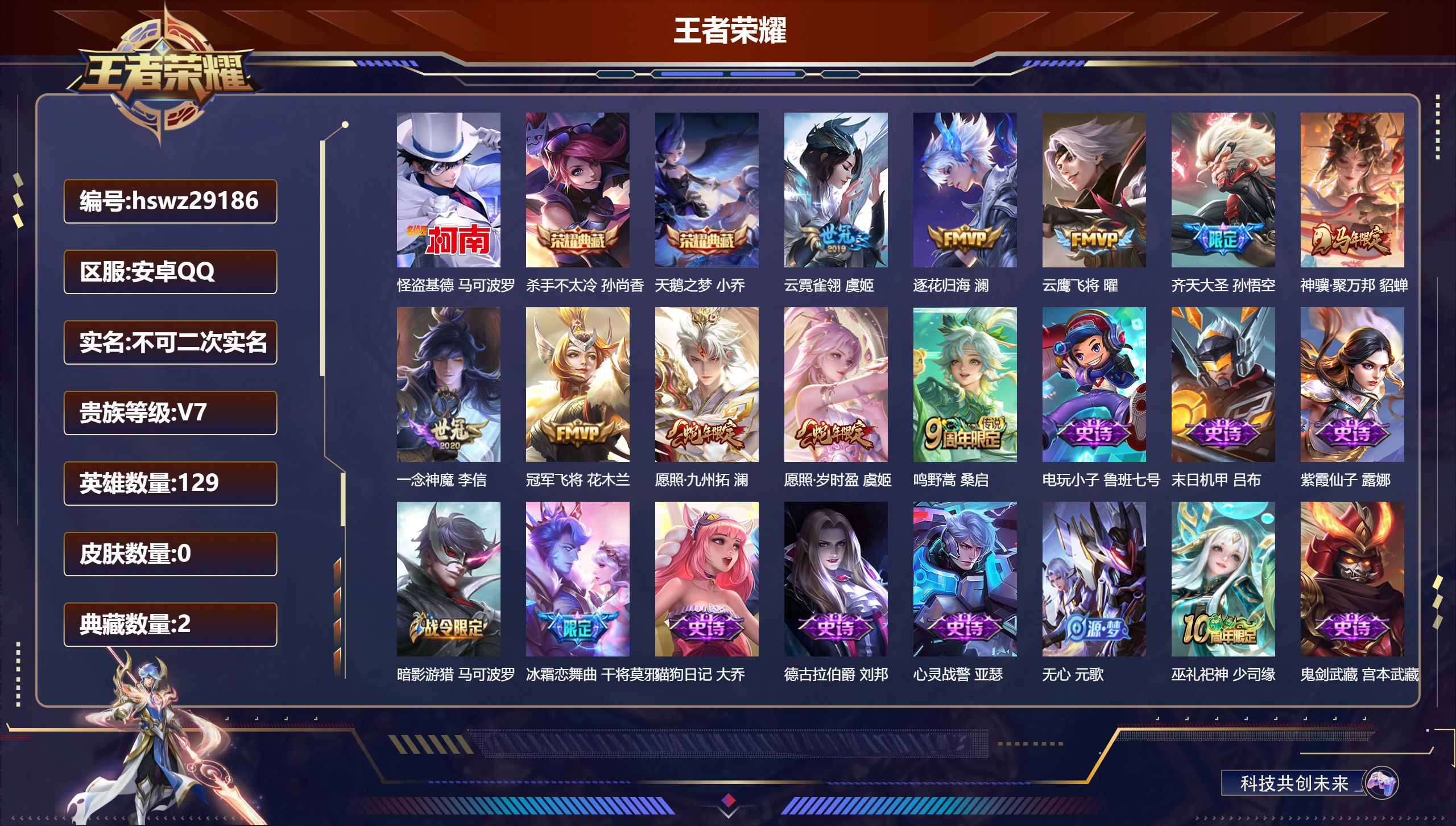 PX_2579232-Q/最强王者/206皮肤/129英雄/2典藏/0珍品无双/0无双/1珍品传说/10传说/68史诗/9稀有英雄 【1,珍品传说】怪盗基德,马可波罗, 【2,典藏皮肤】杀手不太冷,孙尚香,天鹅之梦,小乔, 【10,传说皮肤】云霓雀翎,虞姬,逐花归海,澜,云鹰飞将,曜,齐天大圣,孙悟空,神骥·聚万邦,貂蝉,一念神魔,李信,冠军飞将,花木兰,愿照·九州拓,澜,愿照·岁时盈,虞姬,鸣野蒿,桑启, 【68,史诗皮肤】电玩小子,鲁班七号,末日机甲,吕布,紫霞仙子,露娜,暗影游猎,马可波罗,冰霜恋舞曲,干将莫邪,猫狗日记,大乔,德古拉伯爵,刘邦,心灵战警,亚瑟,无心,元歌,巫礼祀神,少司缘,鬼剑武藏,宫本武藏,星夜王子,白起,无限星赏官,公孙离,线条小狗,周瑜,黄金分割率,诸葛亮,偶像歌手,王昭君,女仆咖啡,妲己,白蛇,大乔,九幽镇关,项羽,晚萤,娜可露露,繁星吟游,蔡文姬,鹰眼统帅,狄仁杰,傩神司,兰陵王,李小龙,裴擒虎,光弋星穹,莱西奥,特工魅影,百里守约,原初追逐者,百里玄策,逐浪之夏,李元芳,未来纪元,赵云,雪豹·霜爪,百里守约,魔术师,狄仁杰,龙之律动,狂铁,顽岩魄,蒙犽,皇家上将,赵云,冰冠公主,雅典娜,至尊宝,孙悟空,辉光之辰,后羿,功夫厨神,程咬金,圣诞恋歌,貂蝉,水晶猎龙者,花木兰,涂山容容,公孙离,破空之剑,亚连,烈魂,黄忠,御风骁将,吕布,圣诞狂欢,吕布,魅语,不知火舞,浮光幕影,芈月,罗小黑战记,百里玄策,夏日便利店,蔡文姬,茶境仙,孙膑,蔷薇恋人,孙尚香,冰雪圆舞曲,甄姬,千年之狐,李白,节奏热浪,阿轲,曙光守护者,铠,万灵启世,女娲,乘龙·聚宝船,安琪拉,箭羽风息,伽罗,绅士熊喵,刘禅,星界特工,马可波罗,百相守梦,百里守约,线条小狗,小乔,时之恋人,孙尚香,水果甜心,孙尚香,化蝶舞,阿轲,幽灵船长,曹操,乘风破浪,夏侯惇,暗隐猎兽者,兰陵王, 【96,勇者皮肤】圆桌骑士,盾山,爱心护理,阿轲,缤纷绘卷,张良,拳王,达摩,功夫炙烤,廉颇,铁甲之心,典韦,沉稳之力,孙尚香,海盐诗旅,桑启,幻泉雾影,海月,醍醐杖,老夫子,汉昭烈帝,刘备,白色死神,白起,落雪兰心,甄姬,阴阳师,狄仁杰,径山谋武,孙权,次元突破,哪吒,牛运亨通,牛魔,功夫老勺,老夫子,鲨炮海盗猫,沈梦溪,海滩派对,项羽,万华元夜,狄仁杰,无尽征程,廉颇,克喵,鬼谷子,踏浪烽翎,莱西奥,演武夺筹,程咬金,红桃皇后,芈月,西部游侠,莱西奥,野性能量,吕布,原初探秘者,鬼谷子,潮玩探月行,猪八戒,天穹祈灯,鬼谷子,西部大镖客,猪八戒,疑决卦,明世隐,阿尔法小队,后羿,五福同心,张飞,救世之瞳,扁鹊,赤刃凌霄,敖隐,死亡骑士,亚瑟,浪漫序章,刘备,胡桃狂想曲,蒙犽,海滩丽影,钟无艳,忍·炎影,赵云,雪境奇遇,西施,逐霄战戟,吕布,擒涛扼浪,裴擒虎,苍云破阵,蒙恬,糖果风暴,安琪拉,乓乓大师,鲁班大师,溯影追猎,虞姬,极光幻客,蚩奼,探海日志,鲁班大师,玩趣恶龙,高渐离,兔女郎,花木兰,龙腾万里,关羽,流音漫舞,艾琳,罗小黑战记,哪吒,往忆晖光,明世隐,荣光之誓,亚瑟,花好人间,甄姬,秘密基地,刘禅,教廷特使,韩信,街头霸王,韩信,云中旅人,李元芳,西部大镖客,孙悟空,紫罗兰之誓,妲己,蔚蓝守将,蒙恬,春野闲踪,苏烈,布丁狗之约,阿古朵,绒语心约,大乔,幻想奇妙夜,王昭君,灵野札记,张良,驱傩正仪,钟馗,命运角斗场,狂铁,虚灵犬护,钟馗,劲辣红锅,太乙真人,神迹守卫,孙悟空,苍林狼骑,苍,天穹之誓,姜子牙,长夏之忆,貂蝉,访茗客,马超,星梦巡礼,姜子牙,谧流熔炉,太乙真人,金福满堂,东皇太一,夏日便利店,虞姬,鹤鸣心笺,艾琳,线条小狗,妲己,逆浪荇歌,甄姬,线条小狗,周瑜,线条小狗,桑启,百相守梦,老夫子,噬灭天穹,东皇太一,灵卦秘语,少司缘,敬我三分,盘古,爆裂喵拳,达摩,玫蓝誓约,戈娅,景韶洛都,明世隐, 【32,其他皮肤】伊势巫女,大乔,前尘,金蝉,圣殿之光,刘邦,芝加哥教父,黄忠,龙域领主,铠,生化警戒,钟无艳,未来旅行,孙膑,第七人偶,干将莫邪,万圣前夜,小乔,灼热之刃,李信,熊喵少女,阿古朵,海之征途,孙策,午夜歌剧院,元歌,异域舞娘,貂蝉,街头旋风,裴擒虎,修竹墨客,上官婉儿,归虚梦演,蒙犽,激情绿茵,马可波罗,埃及法老,杨戬,尼罗河女神,女娲,锦衣卫,狄仁杰,一千零一夜,张良,归虚梦演,曜,荷鲁斯之眼,云中君,创世神祝,盘古,绝影神枪,百里守约,孤猎,澜,精准探案法,米莱狄,赤焰之缨,云缨,天启骑士,关羽,怪盗基德,马可波罗,西部大镖客,孙悟空, 【9,稀有英雄】敖隐,嬴政,不知火舞,橘右京,夏洛特,娜可露露,韩信,艾琳,赵云, 营地ID:,