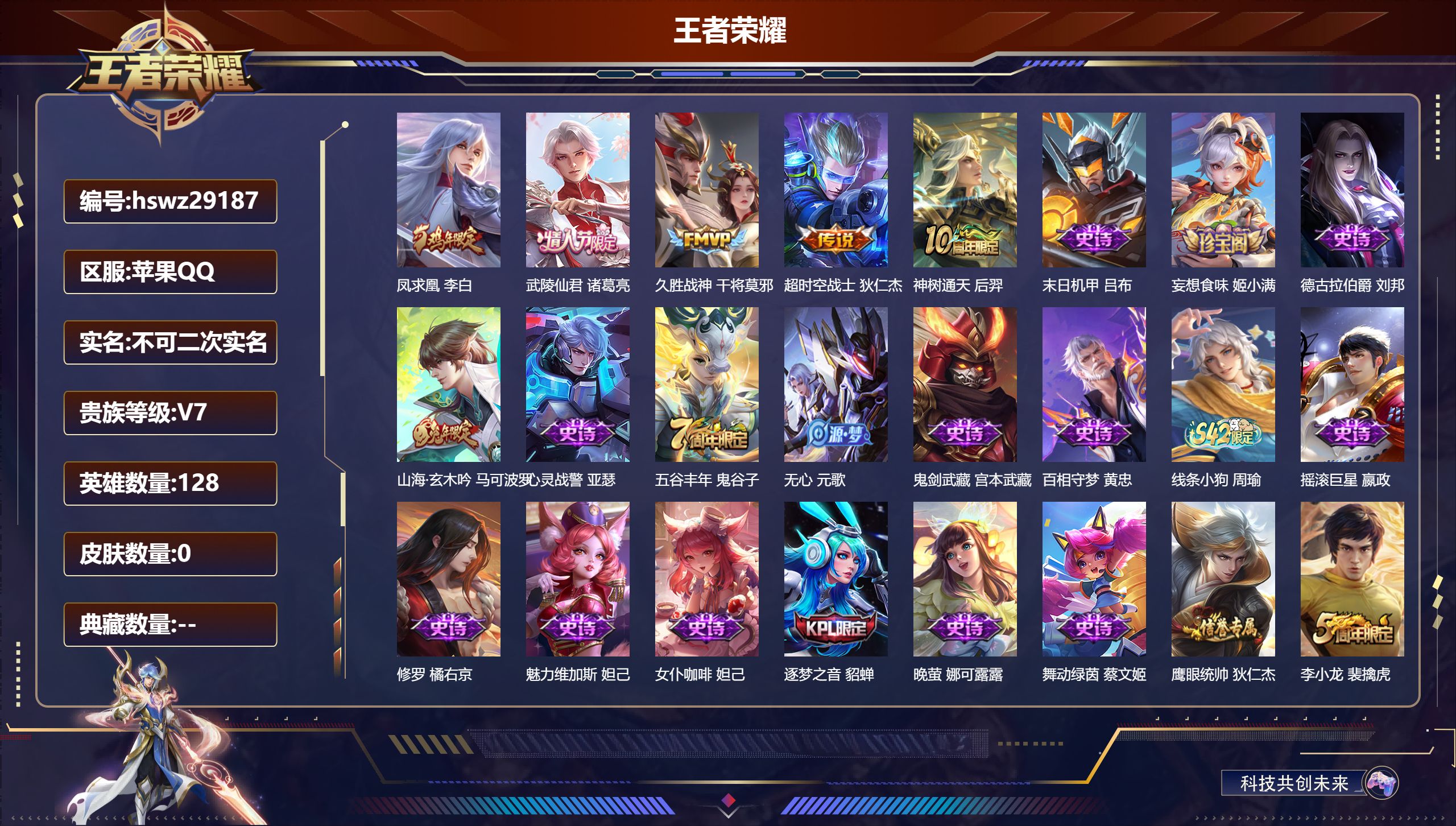 PX_2579236-Q/至尊星耀/195皮肤/128英雄/0典藏/0珍品无双/0无双/0珍品传说/5传说/53史诗/8稀有英雄 【5,传说皮肤】凤求凰,李白,武陵仙君,诸葛亮,久胜战神,干将莫邪,超时空战士,狄仁杰,神树通天,后羿, 【53,史诗皮肤】末日机甲,吕布,妄想食味,姬小满,德古拉伯爵,刘邦,山海·玄木吟,马可波罗,心灵战警,亚瑟,五谷丰年,鬼谷子,无心,元歌,鬼剑武藏,宫本武藏,百相守梦,黄忠,线条小狗,周瑜,摇滚巨星,嬴政,修罗,橘右京,魅力维加斯,妲己,女仆咖啡,妲己,逐梦之音,貂蝉,晚萤,娜可露露,舞动绿茵,蔡文姬,鹰眼统帅,狄仁杰,李小龙,裴擒虎,金属风暴,墨子,匿光侦查者,李元芳,特工魅影,百里守约,猫狗日记,孙策,逐浪之夏,李元芳,真我赫兹,百里守约,未来纪元,赵云,灵蛊蚀心,扁鹊,驭风魔法,戈娅,魔术师,狄仁杰,龙之律动,狂铁,皇家上将,赵云,冰冠公主,雅典娜,至尊宝,孙悟空,功夫厨神,程咬金,天才门将,刘禅,水晶猎龙者,花木兰,涂山容容,公孙离,圣诞狂欢,吕布,冰雪圆舞曲,甄姬,节奏热浪,阿轲,超时空战士,钟无艳,青春决赛季,花木兰,曙光守护者,铠,心灵骇客,安琪拉,箭羽风息,伽罗,乱世虎臣,张飞,百相守梦,周瑜,时之恋人,孙尚香,水果甜心,孙尚香,江河有灵,阿古朵,幽灵船长,曹操,乘风破浪,夏侯惇,暗隐猎兽者,兰陵王, 【95,勇者皮肤】玲珑珍味,西施,烛龙,曹操,沙漠行僧,达摩,大漠名商,沈梦溪,缤纷绘卷,张良,纽约教父,刘备,大发明家,达摩,功夫炙烤,廉颇,铁甲之心,典韦,海盐诗旅,桑启,幻泉雾影,海月,汉昭烈帝,刘备,热血海滩,哪吒,白色死神,白起,落雪兰心,甄姬,御旌,牛魔,阴阳师,狄仁杰,炼金王,扁鹊,致命风华,阿轲,古海寻踪,张良,牛运亨通,牛魔,功夫老勺,老夫子,鲨炮海盗猫,沈梦溪,海滩派对,项羽,克喵,鬼谷子,踏浪烽翎,莱西奥,蜃楼王,庄周,野性能量,吕布,无双福将,程咬金,潮玩探月行,猪八戒,疑决卦,明世隐,化身博士,扁鹊,五福同心,张飞,幻乐之宴,鬼谷子,虹云星官,明世隐,潮玩牛仔,马可波罗,死亡骑士,亚瑟,破局者,亚连,玩偶对对碰,安琪拉,掌控之力,诸葛亮,海滩丽影,钟无艳,狰,白起,雪境奇遇,西施,重明,芈月,炽热元素使,姜子牙,万事如意,刘备,乓乓大师,鲁班大师,溯影追猎,虞姬,探海日志,鲁班大师,天使之翼,孙膑,玩趣恶龙,高渐离,兔女郎,花木兰,龙腾万里,关羽,流音漫舞,艾琳,金庭之子,兰陵王,幻夜行动,兰陵王,未来纪元,宫本武藏,千军破阵,苏烈,荣光之誓,亚瑟,花好人间,甄姬,万象初新,宫本武藏,聚星闪耀,钟无艳,秘密基地,刘禅,教廷特使,韩信,街头霸王,韩信,云中旅人,李元芳,妄想特派,李元芳,西部大镖客,孙悟空,重装意志,盘古,凯尔特女王,虞姬,进击墨子号,墨子,少女阿狸,妲己,御霄,米莱狄,蔚蓝守将,蒙恬,春野闲踪,苏烈,命运加冕,露娜,幻想奇妙夜,王昭君,灵野札记,张良,命运角斗场,狂铁,死霸装,白起,特工战影,狂铁,虚灵犬护,钟馗,御狮,狂铁,班班快跑,鲁班七号,白执事,赵云,铁骨偃魂,典韦,苍林狼骑,苍,星梦巡礼,姜子牙,谧流熔炉,太乙真人,鹤鸣心笺,艾琳,逆浪荇歌,甄姬,百相守梦,孙策,线条小狗,周瑜,爆裂喵拳,达摩,玫蓝誓约,戈娅, 【44,其他皮肤】金属狂潮,高渐离,芝加哥教父,黄忠,三太子,哪吒,棒球奇才,沈梦溪,极冰防御线,盾山,龙域领主,铠,超能战警,曹操,花见巫女,伽罗,爱与和平,苏烈,灼热之刃,李信,海之征途,孙策,木偶奇遇记,鲁班七号,福禄兄弟,鲁班七号,精灵王,后羿,冰刃幻境,镜,星航指挥官,诸葛亮,英喵野望,刘禅,午夜歌剧院,元歌,启蛰,司空震,隐刃,兰陵王,花间舞,公孙离,异域舞娘,貂蝉,街头旋风,裴擒虎,修竹墨客,上官婉儿,剑舞者,花木兰,占星师,明世隐,激情绿茵,马可波罗,埃及法老,杨戬,阿摩司公爵,鬼谷子,年年有余,猪八戒,锦衣卫,狄仁杰,归虚梦演,曜,威尼斯狂欢,百里玄策,幸存者,马超,战争女神,雅典娜,创世神祝,盘古,特种部队,李元芳,绝影神枪,百里守约,精准探案法,米莱狄,赤焰之缨,云缨,地府判官,钟馗,美梦成真,梦奇,圆桌骑士,太乙真人,西部大镖客,孙悟空, 【8,稀有英雄】嬴政,不知火舞,橘右京,夏洛特,娜可露露,韩信,艾琳,赵云, 营地ID:,