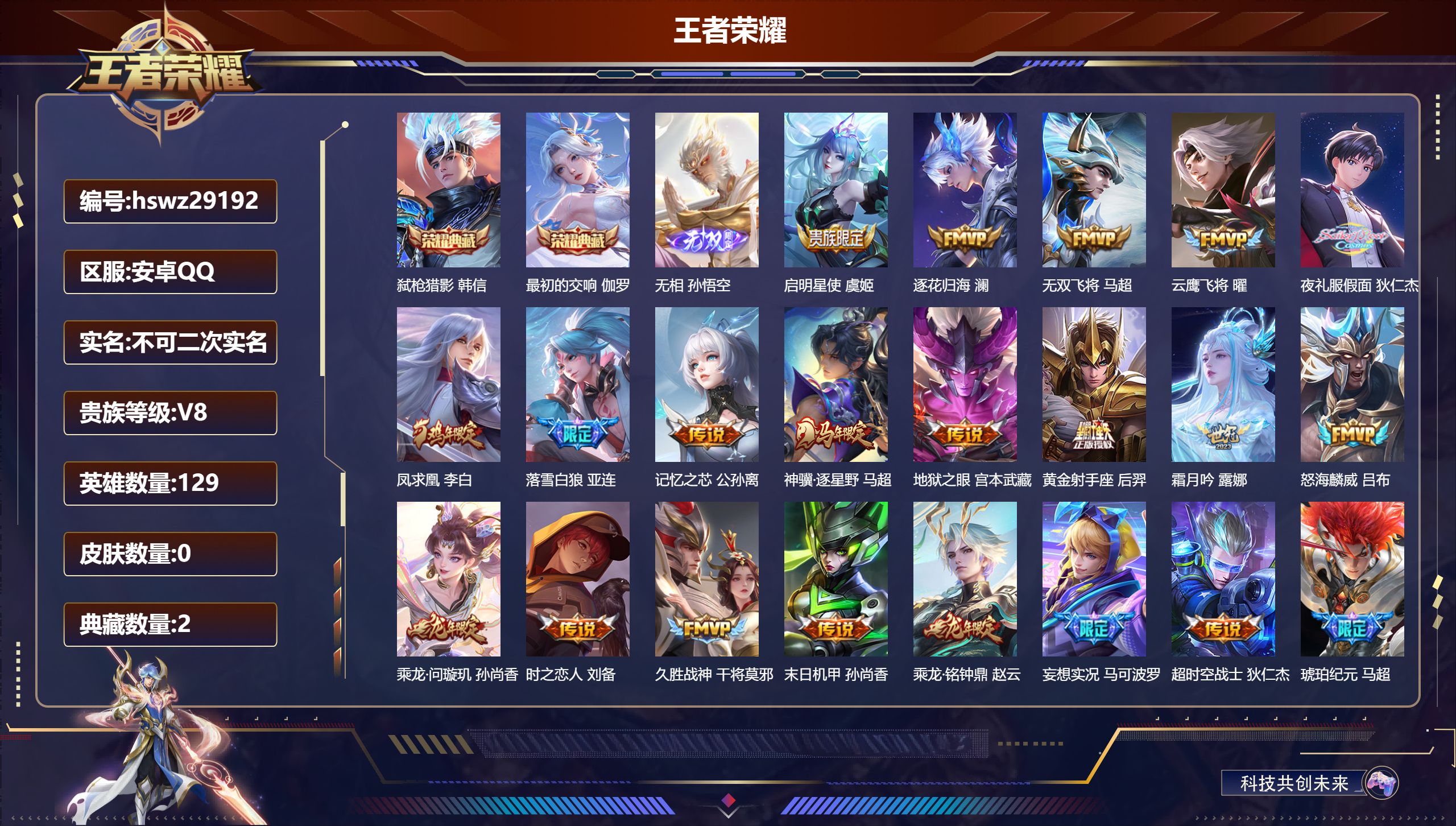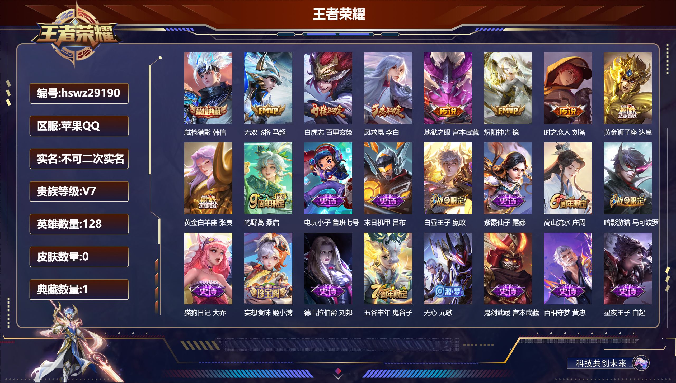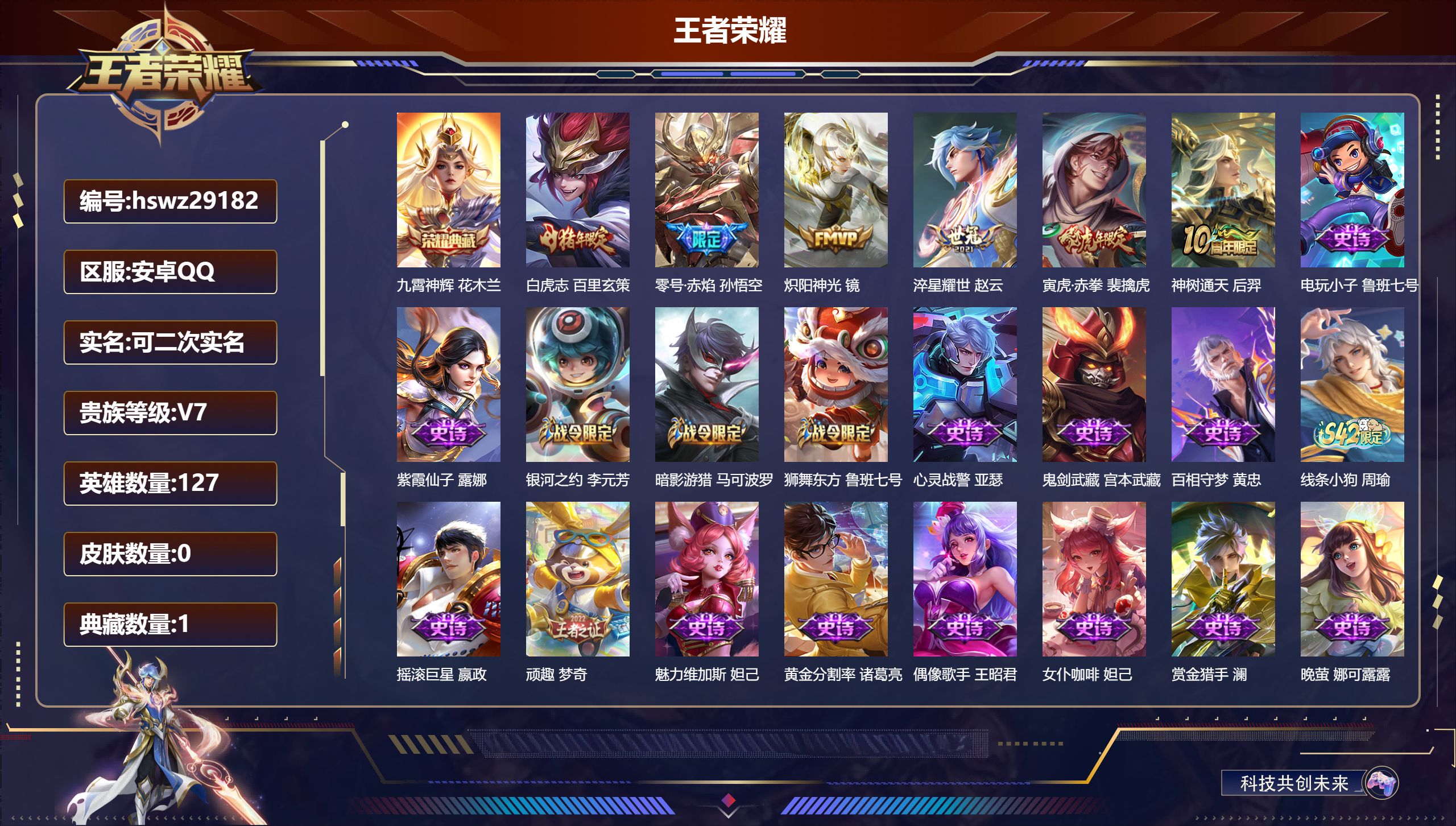 PX_2579214-Q/至尊星耀/196皮肤/127英雄/1典藏/0珍品无双/0无双/0珍品传说/6传说/59史诗/8稀有英雄 【1,典藏皮肤】九霄神辉,花木兰, 【6,传说皮肤】白虎志,百里玄策,零号·赤焰,孙悟空,炽阳神光,镜,淬星耀世,赵云,寅虎·赤拳,裴擒虎,神树通天,后羿, 【59,史诗皮肤】电玩小子,鲁班七号,紫霞仙子,露娜,银河之约,李元芳,暗影游猎,马可波罗,狮舞东方,鲁班七号,心灵战警,亚瑟,鬼剑武藏,宫本武藏,百相守梦,黄忠,线条小狗,周瑜,摇滚巨星,嬴政,顽趣,梦奇,魅力维加斯,妲己,黄金分割率,诸葛亮,偶像歌手,王昭君,女仆咖啡,妲己,赏金猎手,澜,晚萤,娜可露露,繁星吟游,蔡文姬,鹰眼统帅,狄仁杰,飞衡,韩信,李小龙,裴擒虎,纤云弄巧,云中君,驯魔猎人,兰陵王,如梦令,后羿,龙骑士,墨子,金属风暴,墨子,特工魅影,百里守约,猫狗日记,孙策,原初追逐者,百里玄策,时之祈愿,云中君,黎明之约,雅典娜,魔术师,狄仁杰,皇家上将,赵云,冰冠公主,雅典娜,至尊宝,孙悟空,功夫厨神,程咬金,梁祝,上官婉儿,云间偶戏,元歌,水晶猎龙者,花木兰,圣诞狂欢,吕布,永昼,夏洛特,天狼溯光者,伽罗,地狱岩魂,廉颇,蔷薇恋人,孙尚香,冰雪圆舞曲,甄姬,火炮绅士,黄忠,航海奇遇记,老夫子,千年之狐,李白,节奏热浪,阿轲,织梦人,西施,万灵启世,女娲,箭羽风息,伽罗,乱世虎臣,张飞,缤纷独角兽,小乔,蓝屏警告,典韦,水果甜心,孙尚香,幽灵船长,曹操,乘风破浪,夏侯惇,暗隐猎兽者,兰陵王, 【87,勇者皮肤】圆桌骑士,盾山,爱心护理,阿轲,沙漠行僧,达摩,缤纷绘卷,张良,纽约教父,刘备,拳王,达摩,大发明家,达摩,功夫炙烤,廉颇,沉稳之力,孙尚香,幻夜卜梦,芈月,朔风刀,夏侯惇,醍醐杖,老夫子,朔望之晖,女娲,归虚梦演,孙膑,汉昭烈帝,刘备,白色死神,白起,黑桃队长,鲁班七号,御旌,牛魔,阴阳师,狄仁杰,次元突破,哪吒,古海寻踪,张良,科学大爆炸,项羽,功夫老勺,老夫子,鲨炮海盗猫,沈梦溪,海滩派对,项羽,万华元夜,狄仁杰,踏浪烽翎,莱西奥,演武夺筹,程咬金,红桃皇后,芈月,奇妙博物学,庄周,无双福将,程咬金,瓷语鉴心,露娜,原初探秘者,鬼谷子,星空之诺,沈梦溪,潮玩探月行,猪八戒,天穹祈灯,鬼谷子,西部大镖客,猪八戒,疑决卦,明世隐,化身博士,扁鹊,潮玩骑士王,亚瑟,五福同心,张飞,幻乐之宴,鬼谷子,霸王丸,宫本武藏,虹云星官,明世隐,赤莲之焰,周瑜,死亡骑士,亚瑟,敏锐之力,李白,玩偶对对碰,安琪拉,海滩丽影,钟无艳,忍·炎影,赵云,炽热元素使,姜子牙,坚韧之力,苏烈,万事如意,刘备,乓乓大师,鲁班大师,极光幻客,蚩奼,探海日志,鲁班大师,兔女郎,花木兰,龙腾万里,关羽,金庭之子,兰陵王,零食大作战,姬小满,荣光之誓,亚瑟,花好人间,甄姬,万象初新,宫本武藏,御銮,盾山,秘密基地,刘禅,教廷特使,韩信,西部大镖客,孙悟空,神迹守卫,墨子,重装意志,盘古,少女阿狸,妲己,混沌棋,弈星,御霄,米莱狄,布丁狗之约,阿古朵,幻想奇妙夜,王昭君,驱傩正仪,钟馗,神迹守卫,钟馗,命运角斗场,狂铁,死霸装,白起,虚灵犬护,钟馗,罗小黑战记,张良,星梦巡礼,姜子牙,谧流熔炉,太乙真人,鹤鸣心笺,艾琳,锦麟游梦,庄周,逆浪荇歌,甄姬,线条小狗,周瑜,线条小狗,桑启, 【45,其他皮肤】伊势巫女,大乔,前尘,金蝉,战争骑士,夏侯惇,芝加哥教父,黄忠,生化警戒,钟无艳,花见巫女,伽罗,未来旅行,孙膑,第七人偶,干将莫邪,万圣前夜,小乔,灼热之刃,李信,熊喵少女,阿古朵,海之征途,孙策,福禄兄弟,鲁班七号,精灵王,后羿,冰刃幻境,镜,海军大将,周瑜,魇语军师,司马懿,午夜歌剧院,元歌,启蛰,司空震,花间舞,公孙离,街头旋风,裴擒虎,归虚梦演,鲁班大师,修竹墨客,上官婉儿,归虚梦演,蒙犽,埃及法老,杨戬,归虚梦演,西施,阿摩司公爵,鬼谷子,画中游,桑启,一千零一夜,张良,归虚梦演,曜,威尼斯狂欢,百里玄策,幸存者,马超,荷鲁斯之眼,云中君,特种部队,李元芳,绝影神枪,百里守约,蔷薇王座,蔡文姬,森,瑶,孤猎,澜,踏雪寻梅,弈星,秩序猎龙将,蒙恬,赤焰之缨,云缨,露花倒影,嫦娥,地府判官,钟馗,美梦成真,梦奇,西部大镖客,孙悟空, 【8,稀有英雄】嬴政,不知火舞,橘右京,夏洛特,娜可露露,韩信,艾琳,赵云, 营地ID:,