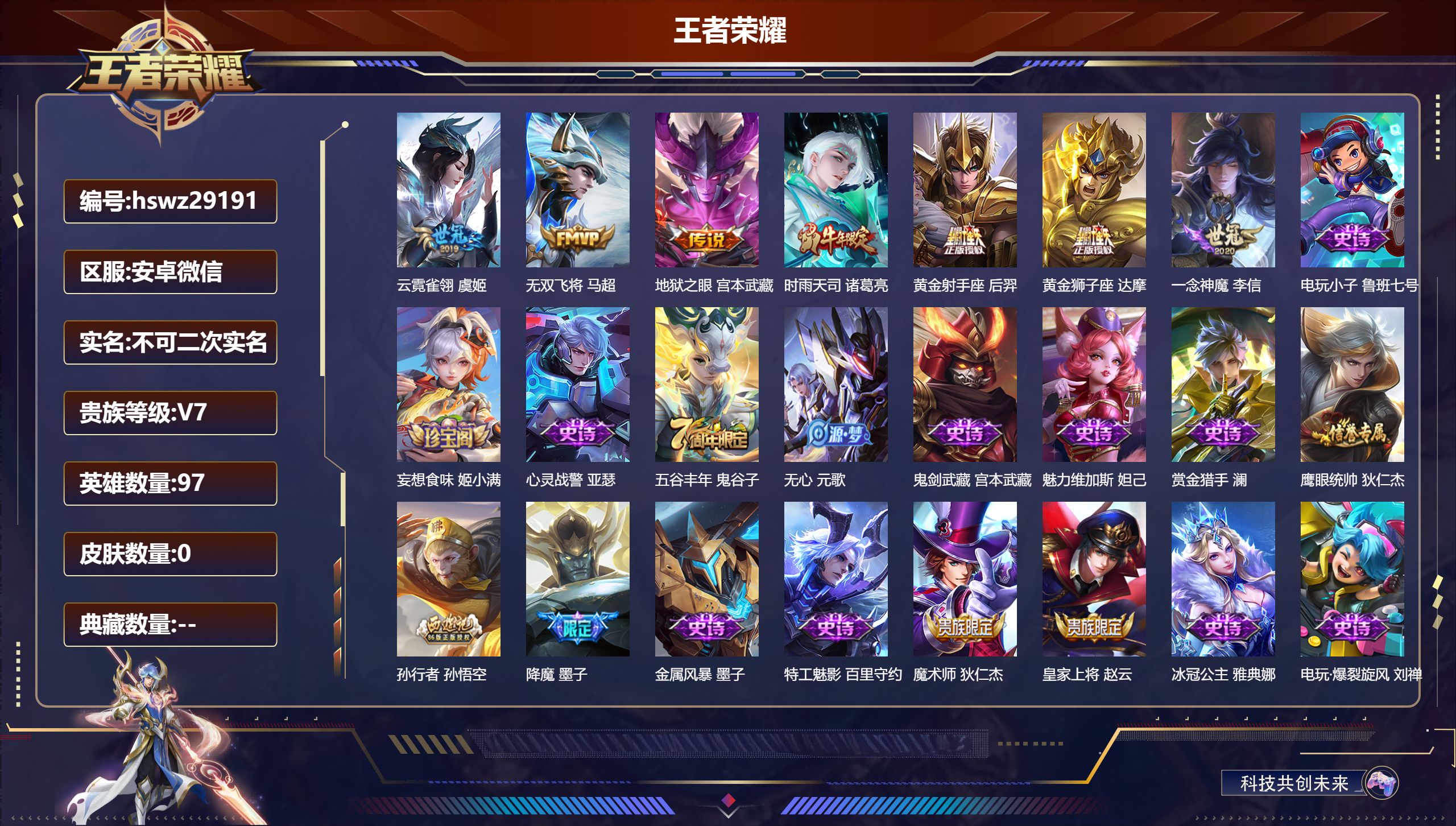 PX_2579250-??信/尊贵铂金/88皮肤/97英雄/0典藏/0珍品无双/0无双/0珍品传说/7传说/28史诗/6稀有英雄 【7,传说皮肤】云霓雀翎,虞姬,无双飞将,马超,地狱之眼,宫本武藏,时雨天司,诸葛亮,黄金射手座,后羿,黄金狮子座,达摩,一念神魔,李信, 【28,史诗皮肤】电玩小子,鲁班七号,妄想食味,姬小满,心灵战警,亚瑟,五谷丰年,鬼谷子,无心,元歌,鬼剑武藏,宫本武藏,魅力维加斯,妲己,赏金猎手,澜,鹰眼统帅,狄仁杰,孙行者,孙悟空,降魔,墨子,金属风暴,墨子,特工魅影,百里守约,魔术师,狄仁杰,皇家上将,赵云,冰冠公主,雅典娜,电玩·爆裂旋风,刘禅,天才门将,刘禅,水晶猎龙者,花木兰,圣诞狂欢,吕布,白龙吟,韩信,地狱岩魂,廉颇,节奏热浪,阿轲,超时空战士,钟无艳,曙光守护者,铠,绅士熊喵,刘禅,时之恋人,孙尚香,水果甜心,孙尚香, 【37,勇者皮肤】拳王,达摩,龙舞盛年,沈梦溪,丁香结,小乔,功夫炙烤,廉颇,海盐诗旅,桑启,落雪兰心,甄姬,阴阳师,狄仁杰,古海寻踪,张良,功夫老勺,老夫子,西部大镖客,牛魔,鲨炮海盗猫,沈梦溪,海滩派对,项羽,完美运算,后羿,潮玩探月行,猪八戒,鸿运当头,亚瑟,天穹祈灯,鬼谷子,决胜大满贯,曹操,死亡骑士,亚瑟,忍·炎影,赵云,万事如意,刘备,擒涛扼浪,裴擒虎,探海日志,鲁班大师,潮玩造梦师,刘备,时尚教父,姜子牙,教廷特使,韩信,街头霸王,韩信,云中旅人,李元芳,妄想特派,李元芳,灵野札记,张良,特工战影,狂铁,劲辣红锅,太乙真人,剑破天穹,刘邦,苍林狼骑,苍,魅影绮裳,影,谧流熔炉,太乙真人,鹤鸣心笺,艾琳,噬灭天穹,东皇太一, 【16,其他皮肤】战争骑士,夏侯惇,芝加哥教父,黄忠,龙域领主,铠,第七人偶,干将莫邪,灼热之刃,李信,福禄兄弟,鲁班七号,启蛰,司空震,隐刃,兰陵王,范海辛,李白,激情绿茵,马可波罗,画中游,桑启,尼罗河女神,女娲,锦衣卫,狄仁杰,归虚梦演,曜,绝影神枪,百里守约,加勒比小姐,虞姬, 【6,稀有英雄】不知火舞,橘右京,夏洛特,韩信,艾琳,赵云, 营地ID:,