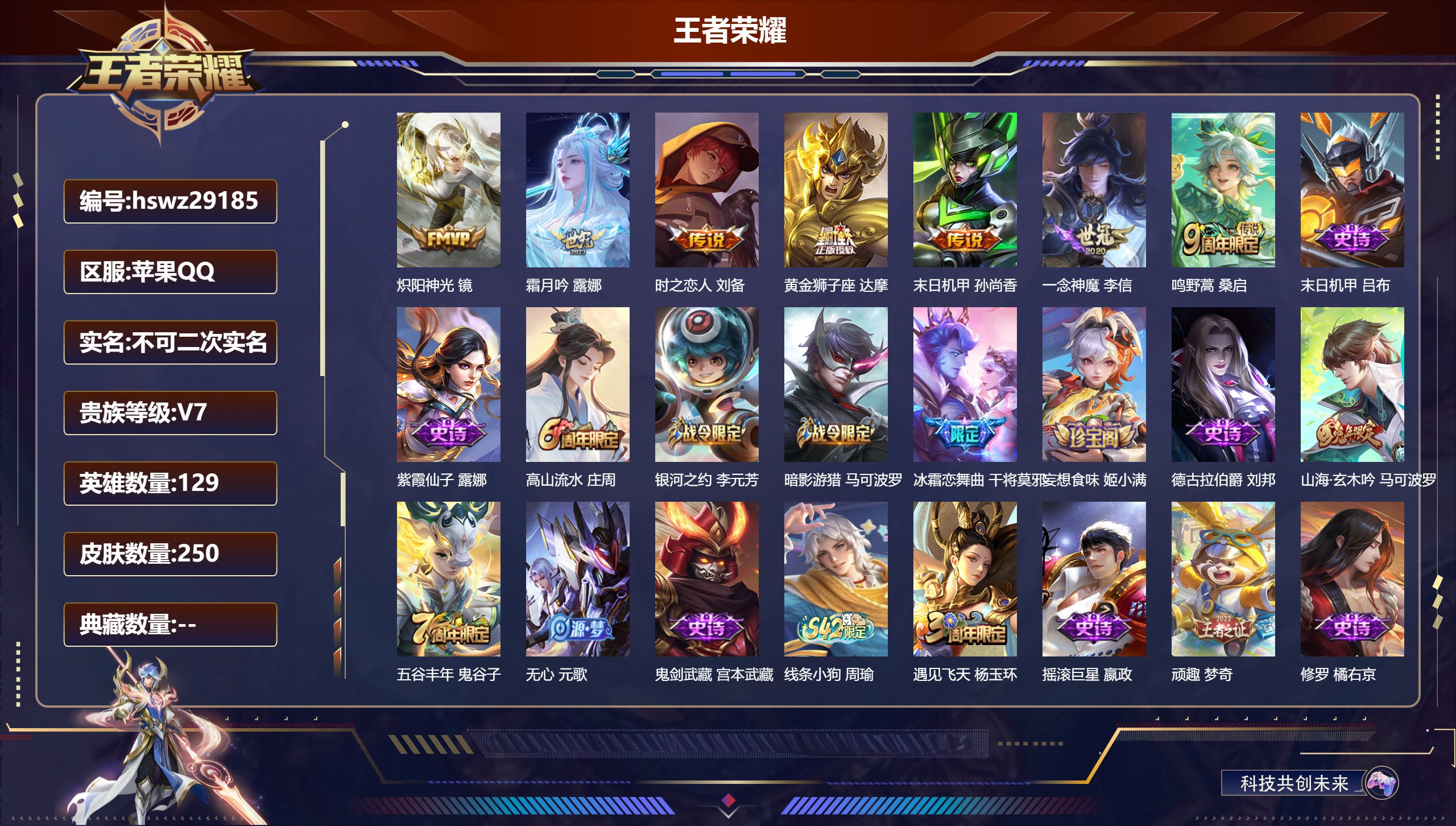 PX_2579229-Q/至尊星耀/250皮肤/129英雄/0典藏/0珍品无双/0无双/0珍品传说/7传说/57史诗/9稀有英雄 【7,传说皮肤】炽阳神光,镜,霜月吟,露娜,时之恋人,刘备,黄金狮子座,达摩,末日机甲,孙尚香,一念神魔,李信,鸣野蒿,桑启, 【57,史诗皮肤】末日机甲,吕布,紫霞仙子,露娜,高山流水,庄周,银河之约,李元芳,暗影游猎,马可波罗,冰霜恋舞曲,干将莫邪,妄想食味,姬小满,德古拉伯爵,刘邦,山海·玄木吟,马可波罗,五谷丰年,鬼谷子,无心,元歌,鬼剑武藏,宫本武藏,线条小狗,周瑜,遇见飞天,杨玉环,摇滚巨星,嬴政,顽趣,梦奇,修罗,橘右京,魅力维加斯,妲己,黄金分割率,诸葛亮,偶像歌手,王昭君,荣光圣徽,蒙恬,女仆咖啡,妲己,九幽镇关,项羽,繁星吟游,蔡文姬,鹰眼统帅,狄仁杰,李小龙,裴擒虎,纤云弄巧,云中君,金属风暴,墨子,特工魅影,百里守约,原初追逐者,百里玄策,逐浪之夏,李元芳,未来纪元,赵云,黎明之约,雅典娜,石田雨龙,后羿,魔术师,狄仁杰,皇家上将,赵云,至尊宝,孙悟空,梁祝,上官婉儿,天才门将,刘禅,云间偶戏,元歌,水晶猎龙者,花木兰,圣诞狂欢,吕布,白龙吟,韩信,星界战将,牛魔,冰雪圆舞曲,甄姬,航海奇遇记,老夫子,千年之狐,李白,节奏热浪,阿轲,乱世虎臣,张飞,天穹守望者,后羿,王者之锤,钟无艳,线条小狗,小乔,水果甜心,孙尚香,狂想玩偶喵,蒙犽,江河有灵,阿古朵,幽灵船长,曹操,暗隐猎兽者,兰陵王, 【125,勇者皮肤】时空谍影,海诺,圆桌骑士,盾山,爱心护理,阿轲,沙漠行僧,达摩,大漠名商,沈梦溪,缤纷绘卷,张良,纽约教父,刘备,拳王,达摩,大发明家,达摩,龙舞盛年,沈梦溪,乐园追猎者,白起,功夫炙烤,廉颇,沉稳之力,孙尚香,海盐诗旅,桑启,朔风刀,夏侯惇,醍醐杖,老夫子,归虚梦演,孙膑,汉昭烈帝,刘备,热血海滩,哪吒,白色死神,白起,黑桃队长,鲁班七号,黄金武士,典韦,御旌,牛魔,阴阳师,狄仁杰,次元突破,哪吒,古海寻踪,张良,功夫老勺,老夫子,西部大镖客,牛魔,鲨炮海盗猫,沈梦溪,海滩派对,项羽,万华元夜,狄仁杰,克喵,鬼谷子,演武夺筹,程咬金,红桃皇后,芈月,奇妙博物学,庄周,西部游侠,莱西奥,野性能量,吕布,哥特玫瑰,露娜,无双福将,程咬金,瓷语鉴心,露娜,百相守梦,影,原初探秘者,鬼谷子,星空之诺,沈梦溪,潮玩探月行,猪八戒,天穹祈灯,鬼谷子,西部大镖客,猪八戒,疑决卦,明世隐,化身博士,扁鹊,潮玩骑士王,亚瑟,阿尔法小队,后羿,五福同心,张飞,次元傲视,杨戬,星际陆战队,程咬金,幻乐之宴,鬼谷子,霸王丸,宫本武藏,虹云星官,明世隐,雾影缉谜,兰陵王,救世之瞳,扁鹊,死亡骑士,亚瑟,敏锐之力,李白,危途狂花,戈娅,掌控之力,诸葛亮,海滩丽影,钟无艳,忍·炎影,赵云,雪境奇遇,西施,炽热元素使,姜子牙,坚韧之力,苏烈,唤灵魔甲,刘禅,万事如意,刘备,谜偶窥秘,鬼谷子,擒涛扼浪,裴擒虎,乓乓大师,鲁班大师,极光幻客,蚩奼,探海日志,鲁班大师,女武神,艾琳,天使之翼,孙膑,玩趣恶龙,高渐离,兔女郎,花木兰,龙腾万里,关羽,金庭之子,兰陵王,未来纪元,宫本武藏,罗小黑战记,哪吒,千军破阵,苏烈,零食大作战,姬小满,花好人间,甄姬,万象初新,宫本武藏,聚星闪耀,钟无艳,潮玩造梦师,刘备,御銮,盾山,单词大作战,雅典娜,春野之旅,钟无艳,秘密基地,刘禅,教廷特使,韩信,街头霸王,韩信,云中旅人,李元芳,妄想特派,李元芳,西部大镖客,孙悟空,神迹守卫,墨子,重装意志,盘古,混沌棋,弈星,蔚蓝守将,蒙恬,布丁狗之约,阿古朵,命运加冕,露娜,小满鸭,姬小满,幻想奇妙夜,王昭君,驱傩正仪,钟馗,命运角斗场,狂铁,死霸装,白起,特工战影,狂铁,虚灵犬护,钟馗,华丽摇滚,太乙真人,剑破天穹,刘邦,铁骨偃魂,典韦,熔金海岸,周瑜,苍林狼骑,苍,天穹之誓,姜子牙,星梦巡礼,姜子牙,谧流熔炉,太乙真人,群星魔术团,程咬金,鹤鸣心笺,艾琳,逆浪荇歌,甄姬,海之女神,海月,线条小狗,周瑜,噬灭天穹,东皇太一,敬我三分,盘古, 【63,其他皮肤】伊势巫女,大乔,金属狂潮,高渐离,前尘,金蝉,圣殿之光,刘邦,芝加哥教父,黄忠,潮流仙人,老夫子,三太子,哪吒,棒球奇才,沈梦溪,龙域领主,铠,死神来了,曹操,超能战警,曹操,花见巫女,伽罗,灼热之刃,李信,熊喵少女,阿古朵,海之征途,孙策,木偶奇遇记,鲁班七号,帝国元帅,项羽,精灵王,后羿,绯红之刃,露娜,冰刃幻境,镜,碧珀绯影,暃,魇语军师,司马懿,英喵野望,刘禅,午夜歌剧院,元歌,启蛰,司空震,隐刃,兰陵王,花间舞,公孙离,异域舞娘,貂蝉,街头旋风,裴擒虎,东海龙王,东皇太一,修竹墨客,上官婉儿,剑舞者,花木兰,范海辛,李白,维京掠夺者,苍,占星师,明世隐,归虚梦演,蒙犽,激情绿茵,马可波罗,埃及法老,杨戬,阿摩司公爵,鬼谷子,画中游,桑启,年年有余,猪八戒,尼罗河女神,女娲,锦衣卫,狄仁杰,一千零一夜,张良,归虚梦演,曜,威尼斯狂欢,百里玄策,幸存者,马超,创世神祝,盘古,特种部队,李元芳,绝影神枪,百里守约,森,瑶,孤猎,澜,加勒比小姐,虞姬,踏雪寻梅,弈星,秩序猎龙将,蒙恬,精准探案法,米莱狄,精灵公主,王昭君,赤焰之缨,云缨,地府判官,钟馗,美梦成真,梦奇,天启骑士,关羽,圆桌骑士,太乙真人,西部大镖客,孙悟空, 【9,稀有英雄】敖隐,嬴政,不知火舞,橘右京,夏洛特,娜可露露,韩信,艾琳,赵云, 营地ID:,