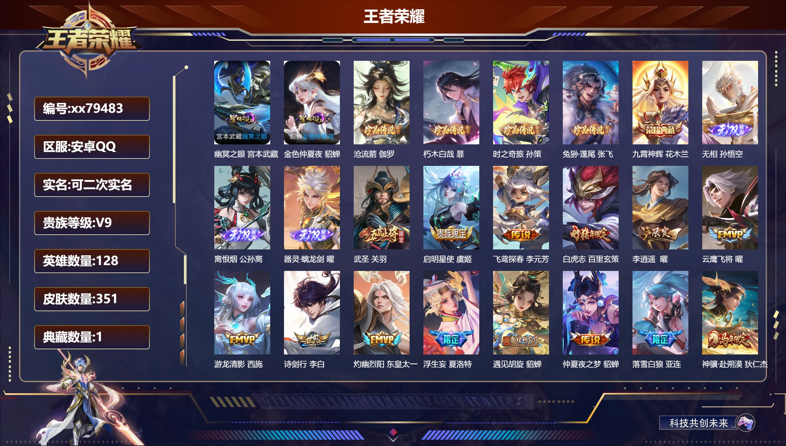 PX_2576095-,可二次,V9,贵族积分,安卓QQ/351皮肤/128英雄/1典藏/0珍品无双/3无双/4珍品传说/39传说/114史诗/8稀有英雄,对抗路31段,历史(省标上官婉儿,鬼谷子,),幸运值:330,天幕:共赏芳华 【2,星传说皮肤】,幽冥之眼,宫本武藏,金色仲夏夜,貂蝉, 【4,珍品传说】,沧流箭,伽罗,朽木白哉,暃,时之奇旅,孙策,兔狲·蓬尾,张飞, 【1,典藏皮肤】,九霄神辉,花木兰, 【3,无双皮肤】,无相,孙悟空,离恨烟,公孙离,器灵·螭龙剑,曜, 【39,传说皮肤】,武圣,关羽,启明星使,虞姬,飞鸢探春,李元芳,白虎志,百里玄策,李逍遥,,曜,云鹰飞将,曜,游龙清影,西施,诗剑行,李白,灼幽烈阳,东皇太一,浮生妄,夏洛特,遇见胡旋,貂蝉,仲夏夜之梦,貂蝉,落雪白狼,亚连,神骥·赴朔漠,狄仁杰,神骥·鸣幻洲,朵莉亚,神骥·聚万邦,貂蝉,神骥·逐星野,马超,地狱之眼,宫本武藏,神骥·镇沧海,关羽,祈雪灵祝,公孙离,神骥·越千峰,云缨,时雨天司,诸葛亮,炽阳神光,镜,黄金射手座,后羿,霜月吟,露娜,黄金狮子座,达摩,绯月行,不知火舞,久胜战神,干将莫邪,一念神魔,李信,太华,伽罗,寅虎·赤拳,裴擒虎,千山共赴,干将莫邪,愿照·九州拓,澜,愿照·众生和,妲己,愿照·福禄聚,蔡文姬,诡秘之主,元歌,愿照·山河定,司空震,愿照·岁时盈,虞姬,愿照·千秋盛,女娲, 【114,史诗皮肤】,时之奇旅,安琪拉,电玩小子,鲁班七号,末日机甲,吕布,逐梦之星,马可波罗,紫霞仙子,露娜,百解令,蒙犽,高山流水,庄周,云端筑梦师,庄周,暗影游猎,马可波罗,冰霜恋舞曲,干将莫邪,白鹤梁神女,大乔,猫狗日记,大乔,妄想食味,姬小满,德古拉伯爵,刘邦,山海·玄木吟,马可波罗,心灵战警,亚瑟,五谷丰年,鬼谷子,诗语江南,西施,无心,元歌,鬼剑武藏,宫本武藏,幻珠鲛人,朵莉亚,星夜王子,白起,寅虎·心曲,杨玉环,瓦猫非猫,太乙真人,线条小狗,周瑜,百晓客,明世隐,遇见飞天,杨玉环,摇滚巨星,嬴政,顽趣,梦奇,冰锋战神,关羽,蜜橘之夏,公孙离,修罗,橘右京,拒霜思,嫦娥,魅力维加斯,妲己,赞萌露比,云缨,如梦令,嫦娥,苍鳞隐世,白起,偶像歌手,王昭君,荣光圣徽,蒙恬,女仆咖啡,妲己,九幽镇关,项羽,晚萤,娜可露露,遇见神鹿,瑶,暗夜贵公子,嬴政,鹰眼统帅,狄仁杰,胡桃异想国,米莱狄,白晶晶,芈月,孙行者,孙悟空,李小龙,裴擒虎,光弋星穹,莱西奥,纤云弄巧,云中君,金属风暴,墨子,冰霜神祇,盘古,特工魅影,百里守约,猫狗日记,孙策,原初追逐者,百里玄策,逐浪之夏,李元芳,奇幻香踪,扁鹊,时之祈愿,云中君,未来纪元,赵云,藏狐·褐绒,老夫子,朱雀志,百里守约,雪豹·霜爪,百里守约,黎明之约,雅典娜,鸭鸭历险记,刘禅,魔术师,狄仁杰,龙之律动,狂铁,神威,马超,皇家上将,赵云,涂山红红,少司缘,功夫厨神,程咬金,电玩·爆裂旋风,刘禅,云间偶戏,元歌,水晶猎龙者,花木兰,涂山容容,公孙离,御风骁将,吕布,圣诞狂欢,吕布,器灵·浮梦炉,赵怀真,天狼绘梦者,上官婉儿,罗小黑战记,百里玄策,夏日便利店,蔡文姬,天狼运算者,孙膑,星界战将,牛魔,永昼,夏洛特,天狼溯光者,伽罗,地狱岩魂,廉颇,茶境仙,孙膑,蔷薇恋人,孙尚香,冰雪圆舞曲,甄姬,火炮绅士,黄忠,青蛇,小乔,默契交锋,花木兰,月团寄思,沈梦溪,航海奇遇记,老夫子,节奏热浪,阿轲,超时空战士,钟无艳,游园惊梦,甄姬,曙光守护者,铠,心灵骇客,安琪拉,寅虎·御盾,廉颇,箭羽风息,伽罗,乱世虎臣,张飞,百相守梦,周瑜,绅士熊喵,刘禅,缤纷独角兽,小乔,线条小狗,小乔,真爱魔法,干将莫邪,水果甜心,孙尚香,狂想玩偶喵,蒙犽,化蝶舞,阿轲,江河有灵,阿古朵,幽灵船长,曹操,乘风破浪,夏侯惇,暗隐猎兽者,兰陵王, 【135,勇者皮肤】,时空谍影,海诺,太极少年,赵怀真,星际陆战队,达摩,沙漠行僧,达摩,大漠名商,沈梦溪,缤纷绘卷,张良,纽约教父,刘备,拳王,达摩,大发明家,达摩,龙舞盛年,沈梦溪,乐园追猎者,白起,丁香结,小乔,功夫炙烤,廉颇,铁甲之心,典韦,幻夜卜梦,芈月,海盐诗旅,桑启,幻泉雾影,海月,醍醐杖,老夫子,归虚梦演,孙膑,汉昭烈帝,刘备,白色死神,白起,黄金武士,典韦,落雪兰心,甄姬,阴阳师,狄仁杰,径山谋武,孙权,次元突破,哪吒,古海寻踪,张良,牛运亨通,牛魔,科学大爆炸,项羽,戏梦巡演,空空儿,功夫老勺,老夫子,鲨炮海盗猫,沈梦溪,虎啸剑宗,刘邦,海滩派对,项羽,完美运算,后羿,万华元夜,狄仁杰,制霸全明星,牛魔,踏浪烽翎,莱西奥,演武夺筹,程咬金,红桃皇后,芈月,奇妙博物学,庄周,西部游侠,莱西奥,野性能量,吕布,守护之力,大乔,无双福将,程咬金,瓷语鉴心,露娜,百相守梦,影,原初探秘者,鬼谷子,潮玩探月行,猪八戒,天穹祈灯,鬼谷子,化身博士,扁鹊,潮玩骑士王,亚瑟,五福同心,张飞,次元傲视,杨戬,幻乐之宴,鬼谷子,东方不败,武则天,虹云星官,明世隐,雾影缉谜,兰陵王,潮玩牛仔,马可波罗,救世之瞳,扁鹊,潮玩骑兵,杨戬,死亡骑士,亚瑟,浪漫序章,刘备,玩偶对对碰,安琪拉,掌控之力,诸葛亮,海滩丽影,钟无艳,圣弓游侠,后羿,忍·炎影,赵云,雪境奇遇,西施,炽热元素使,姜子牙,坚韧之力,苏烈,万事如意,刘备,擒涛扼浪,裴擒虎,乓乓大师,鲁班大师,死亡摇滚,高渐离,溯影追猎,虞姬,极光幻客,蚩奼,探海日志,鲁班大师,女武神,艾琳,天使之翼,孙膑,兔女郎,花木兰,龙腾万里,关羽,金庭之子,兰陵王,未来纪元,宫本武藏,千军破阵,苏烈,往忆晖光,明世隐,荣光之誓,亚瑟,花好人间,甄姬,万象初新,宫本武藏,聚星闪耀,钟无艳,单词大作战,雅典娜,时尚教父,姜子牙,秘密基地,刘禅,教廷特使,韩信,街头霸王,韩