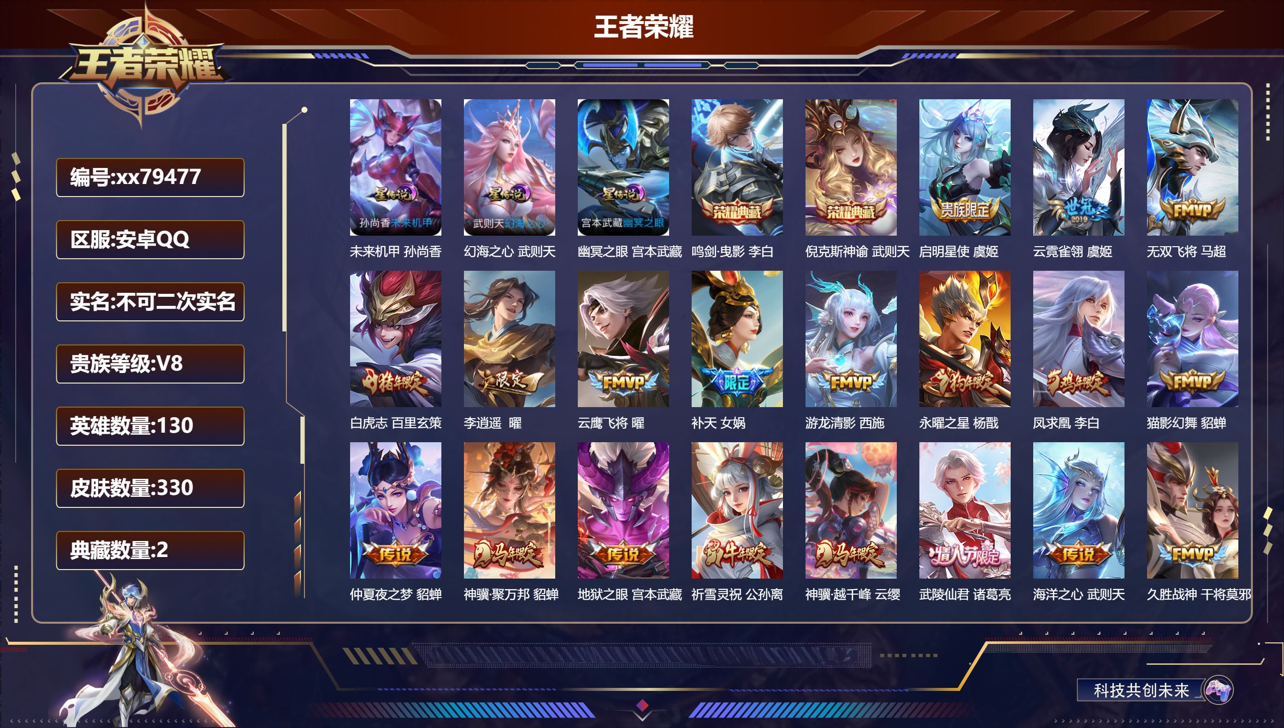 PX_2576082-,不包人脸,V8,贵族积分91577,安卓QQ/330皮肤/130英雄/2典藏/0珍品无双/0无双/0珍品传说/25传说/95史诗/10稀有英雄,对抗路35段,,对抗路35段,,中路37段,历史(万战小国标女娲,省标司马懿,)天幕-秋月华灯 【1,小国标】,小国标女娲, 【3,星传说皮肤】,未来机甲,孙尚香,幻海之心,武则天,幽冥之眼,宫本武藏, 【2,典藏皮肤】,鸣剑·曳影,李白,倪克斯神谕,武则天, 【25,传说皮肤】,启明星使,虞姬,云霓雀翎,虞姬,无双飞将,马超,白虎志,百里玄策,李逍遥,,曜,云鹰飞将,曜,补天,女娲,游龙清影,西施,永曜之星,杨戬,凤求凰,李白,猫影幻舞,貂蝉,仲夏夜之梦,貂蝉,神骥·聚万邦,貂蝉,地狱之眼,宫本武藏,祈雪灵祝,公孙离,神骥·越千峰,云缨,武陵仙君,诸葛亮,海洋之心,武则天,久胜战神,干将莫邪,末日机甲,孙尚香,一念神魔,李信,太华,伽罗,神树通天,后羿,愿照·千秋盛,女娲,鸣野蒿,桑启, 【95,史诗皮肤】,奔雷神使,牛魔,电玩小子,鲁班七号,末日机甲,吕布,紫霞仙子,露娜,高山流水,庄周,暗渊魔法,司马懿,暗影游猎,马可波罗,妄想食味,姬小满,德古拉伯爵,刘邦,心灵战警,亚瑟,五谷丰年,鬼谷子,无心,元歌,巫礼祀神,少司缘,鬼剑武藏,宫本武藏,百相守梦,黄忠,星夜王子,白起,线条小狗,周瑜,遇见飞天,杨玉环,摇滚巨星,嬴政,电玩高手,狂铁,顽趣,梦奇,冰锋战神,关羽,修罗,橘右京,拒霜思,嫦娥,魅力维加斯,妲己,乐园奇幻夜,钟馗,偶像歌手,王昭君,荣光圣徽,蒙恬,女仆咖啡,妲己,白蛇,大乔,赏金猎手,澜,九幽镇关,项羽,星界游侠,暃,晚萤,娜可露露,猪悟能,猪八戒,舞动绿茵,蔡文姬,繁星吟游,蔡文姬,鹰眼统帅,狄仁杰,胡桃异想国,米莱狄,李小龙,裴擒虎,纤云弄巧,云中君,龙骑士,墨子,金属风暴,墨子,猫狗日记,孙策,原初追逐者,百里玄策,逐浪之夏,李元芳,未来纪元,赵云,朱雀志,百里守约,黎明之约,雅典娜,驭风魔法,戈娅,魔术师,狄仁杰,龙之律动,狂铁,神威,马超,皇家上将,赵云,冰冠公主,雅典娜,至尊宝,孙悟空,功夫厨神,程咬金,天才门将,刘禅,圣诞恋歌,貂蝉,云间偶戏,元歌,水晶猎龙者,花木兰,破空之剑,亚连,圣诞狂欢,吕布,青焰无极,镜,魅语,不知火舞,星界战将,牛魔,永昼,夏洛特,地狱岩魂,廉颇,茶境仙,孙膑,蔷薇恋人,孙尚香,冰雪圆舞曲,甄姬,火炮绅士,黄忠,月团寄思,沈梦溪,航海奇遇记,老夫子,千年之狐,李白,节奏热浪,阿轲,超时空战士,钟无艳,游园惊梦,甄姬,青春决赛季,花木兰,曙光守护者,铠,万灵启世,女娲,心灵骇客,安琪拉,百相守梦,周瑜,吟游魔法,明世隐,万物之道,弈星,缤纷独角兽,小乔,线条小狗,小乔,真爱魔法,干将莫邪,时之恋人,孙尚香,水果甜心,孙尚香,狂想玩偶喵,蒙犽,化蝶舞,阿轲,幽灵船长,曹操,乘风破浪,夏侯惇,暗隐猎兽者,兰陵王, 【147,勇者皮肤】,玲珑珍味,西施,圆桌骑士,盾山,烛龙,曹操,爱心护理,阿轲,太极少年,赵怀真,星际陆战队,达摩,沙漠行僧,达摩,大漠名商,沈梦溪,缤纷绘卷,张良,纽约教父,刘备,拳王,达摩,龙舞盛年,沈梦溪,乐园追猎者,白起,功夫炙烤,廉颇,沉稳之力,孙尚香,幻夜卜梦,芈月,爱与正义,程咬金,海盐诗旅,桑启,朔风刀,夏侯惇,醍醐杖,老夫子,朔望之晖,女娲,归虚梦演,孙膑,白色死神,白起,黑桃队长,鲁班七号,黄金武士,典韦,落雪兰心,甄姬,御旌,牛魔,阴阳师,狄仁杰,炼金王,扁鹊,径山谋武,孙权,致命风华,阿轲,次元突破,哪吒,古海寻踪,张良,牛运亨通,牛魔,科学大爆炸,项羽,功夫老勺,老夫子,鲨炮海盗猫,沈梦溪,虎啸剑宗,刘邦,海滩派对,项羽,万华元夜,狄仁杰,制霸全明星,牛魔,踏浪烽翎,莱西奥,演武夺筹,程咬金,奇妙博物学,庄周,西部游侠,莱西奥,蜃楼王,庄周,野性能量,吕布,哥特玫瑰,露娜,无双福将,程咬金,瓷语鉴心,露娜,原初探秘者,鬼谷子,潮玩探月行,猪八戒,天穹祈灯,鬼谷子,西部大镖客,猪八戒,疑决卦,明世隐,化身博士,扁鹊,潮玩骑士王,亚瑟,阿尔法小队,后羿,五福同心,张飞,夜都怪侠,白起,金色潮汐,朵莉亚,次元傲视,杨戬,幻乐之宴,鬼谷子,东方不败,武则天,霸王丸,宫本武藏,虹云星官,明世隐,雾影缉谜,兰陵王,潮玩牛仔,马可波罗,赤刃凌霄,敖隐,潮玩骑兵,杨戬,死亡骑士,亚瑟,浪漫序章,刘备,胡桃狂想曲,蒙犽,破局者,亚连,幽兰居士,张良,玩偶对对碰,安琪拉,掌控之力,诸葛亮,海滩丽影,钟无艳,圣弓游侠,后羿,忍·炎影,赵云,狰,白起,雪境奇遇,西施,重明,芈月,炽热元素使,姜子牙,坚韧之力,苏烈,万事如意,刘备,擒涛扼浪,裴擒虎,糖果风暴,安琪拉,乓乓大师,鲁班大师,逐霄之志,曹操,死亡摇滚,高渐离,妖精王,孙膑,极光幻客,蚩奼,探海日志,鲁班大师,天使之翼,孙膑,龙腾万里,关羽,金庭之子,兰陵王,罗小黑战记,哪吒,千军破阵,苏烈,荣光之誓,亚瑟,花好人间,甄姬,万象初新,宫本武藏,御銮,盾山,单词大作战,雅典娜,秘密基地,刘禅,穷奇,典韦,教廷特使,韩信,云中旅人,李元芳,西部大镖客,孙悟空,紫罗兰之誓,妲己,神迹守卫,墨子,重装意志,盘古,凯尔特女王,虞姬,少女阿狸,妲己,混沌棋,弈星,御霄,米莱狄,蔚蓝守将,蒙恬,春野闲踪,苏烈,布丁狗之约,阿古朵,暖冬·兔眠,嫦娥,命运加冕,露娜,午后时光,王昭君,幻想奇妙夜,王昭君,驱傩正仪,钟馗,特工战影,狂铁,御狮,狂铁,班班快跑,鲁班七号,饕餮,太乙真人,华丽摇滚,太乙真人,神迹守卫,孙悟空,剑破天穹,刘邦,铁骨偃魂,典韦,苍林狼骑,苍,访茗客,马超,星梦巡礼,姜子牙,谧流熔炉,太乙真人,金福满堂,东皇太一,暗都幽影,大司命,鹤鸣心笺,艾琳,线条