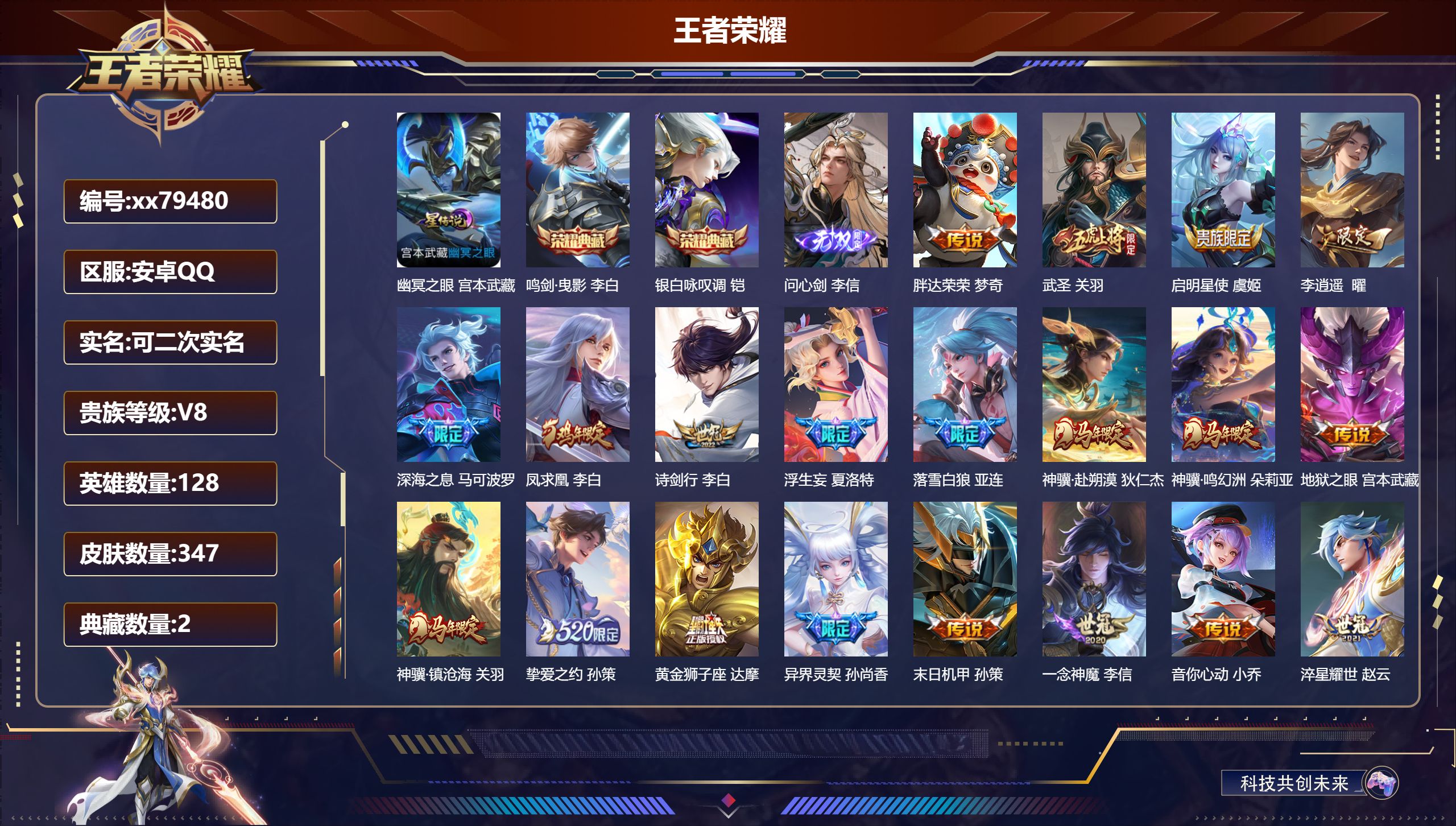 PX_2576090-,可二次,V8,贵族积分88375,安卓QQ/347皮肤/128英雄/2典藏/0珍品无双/1无双/0珍品传说/27传说/105史诗/8稀有英雄游走50段,,打野33段,历史(省标万战苏烈,)天幕-花朝如约 【1,星传说皮肤】,幽冥之眼,宫本武藏, 【2,典藏皮肤】,鸣剑·曳影,李白,银白咏叹调,铠, 【1,无双皮肤】,问心剑,李信, 【27,传说皮肤】,胖达荣荣,梦奇,武圣,关羽,启明星使,虞姬,李逍遥,,曜,深海之息,马可波罗,凤求凰,李白,诗剑行,李白,浮生妄,夏洛特,落雪白狼,亚连,神骥·赴朔漠,狄仁杰,神骥·鸣幻洲,朵莉亚,地狱之眼,宫本武藏,神骥·镇沧海,关羽,挚爱之约,孙策,黄金狮子座,达摩,异界灵契,孙尚香,末日机甲,孙策,一念神魔,李信,音你心动,小乔,淬星耀世,赵云,寅虎·赤拳,裴擒虎,黄金白羊座,张良,愿照·九州拓,澜,幻光神枪,云缨,愿照·山河定,司空震,愿照·岁时盈,虞姬,鸣野蒿,桑启, 【105,史诗皮肤】,末日机甲,吕布,白昼王子,嬴政,紫霞仙子,露娜,高山流水,庄周,银河之约,李元芳,匿光追影者,镜,狮舞东方,鲁班七号,猫狗日记,大乔,妄想食味,姬小满,德古拉伯爵,刘邦,山海·玄木吟,马可波罗,心灵战警,亚瑟,五谷丰年,鬼谷子,诗语江南,西施,无心,元歌,鬼剑武藏,宫本武藏,百相守梦,黄忠,星夜王子,白起,瓦猫非猫,太乙真人,线条小狗,周瑜,遇见飞天,杨玉环,摇滚巨星,嬴政,电玩高手,狂铁,顽趣,梦奇,冰锋战神,关羽,修罗,橘右京,拒霜思,嫦娥,魅力维加斯,妲己,黄金分割率,诸葛亮,乐园奇幻夜,钟馗,偶像歌手,王昭君,荣光圣徽,蒙恬,女仆咖啡,妲己,赏金猎手,澜,九幽镇关,项羽,星界游侠,暃,晚萤,娜可露露,猪悟能,猪八戒,遇见神鹿,瑶,舞动绿茵,蔡文姬,繁星吟游,蔡文姬,暗夜贵公子,嬴政,鹰眼统帅,狄仁杰,大圣娶亲,孙悟空,飞衡,韩信,玫瑰异探,镜,孙行者,孙悟空,李小龙,裴擒虎,纤云弄巧,云中君,金属风暴,墨子,傲雪梅枪,韩信,特工魅影,百里守约,猫狗日记,孙策,原初追逐者,百里玄策,逐浪之夏,李元芳,未来纪元,赵云,灵蛊蚀心,扁鹊,黎明之约,雅典娜,石田雨龙,后羿,魔术师,狄仁杰,热力回旋,百里玄策,龙之律动,狂铁,神威,马超,皇家上将,赵云,冰冠公主,雅典娜,功夫厨神,程咬金,梁祝,上官婉儿,电玩·爆裂旋风,刘禅,天才门将,刘禅,圣诞恋歌,貂蝉,云间偶戏,元歌,水晶猎龙者,花木兰,百木心枪,赵云,圣诞狂欢,吕布,魅语,不知火舞,器灵·浮梦炉,赵怀真,罗小黑战记,百里玄策,星界战将,牛魔,地狱岩魂,廉颇,茶境仙,孙膑,蔷薇恋人,孙尚香,冰雪圆舞曲,甄姬,火炮绅士,黄忠,月团寄思,沈梦溪,雪上飞焰,哪吒,千年之狐,李白,节奏热浪,阿轲,暗夜猫娘,阿轲,女儿国国王,甄姬,超时空战士,钟无艳,曙光守护者,铠,心灵骇客,安琪拉,箭羽风息,伽罗,乱世虎臣,张飞,百相守梦,周瑜,吟游魔法,明世隐,绅士熊喵,刘禅,缤纷独角兽,小乔,线条小狗,小乔,真爱魔法,干将莫邪,水果甜心,孙尚香,化蝶舞,阿轲,幽灵船长,曹操,乘风破浪,夏侯惇,暗隐猎兽者,兰陵王, 【151,勇者皮肤】,时空谍影,海诺,圆桌骑士,盾山,烛龙,曹操,爱心护理,阿轲,太极少年,赵怀真,沙漠行僧,达摩,大漠名商,沈梦溪,缤纷绘卷,张良,纽约教父,刘备,拳王,达摩,大发明家,达摩,乐园追猎者,白起,功夫炙烤,廉颇,铁甲之心,典韦,沉稳之力,孙尚香,幻夜卜梦,芈月,海盐诗旅,桑启,朔风刀,夏侯惇,醍醐杖,老夫子,归虚梦演,孙膑,汉昭烈帝,刘备,白色死神,白起,黑桃队长,鲁班七号,黄金武士,典韦,落雪兰心,甄姬,御旌,牛魔,阴阳师,狄仁杰,径山谋武,孙权,次元突破,哪吒,古海寻踪,张良,牛运亨通,牛魔,科学大爆炸,项羽,戏梦巡演,空空儿,功夫老勺,老夫子,西部大镖客,牛魔,鲨炮海盗猫,沈梦溪,虎啸剑宗,刘邦,海滩派对,项羽,万华元夜,狄仁杰,克喵,鬼谷子,制霸全明星,牛魔,演武夺筹,程咬金,奇妙博物学,庄周,西部游侠,莱西奥,猎兽之王,吕布,野性能量,吕布,哥特玫瑰,露娜,守护之力,大乔,无双福将,程咬金,瓷语鉴心,露娜,百相守梦,影,原初探秘者,鬼谷子,星空之诺,沈梦溪,潮玩探月行,猪八戒,天穹祈灯,鬼谷子,疑决卦,明世隐,如懿,安琪拉,化身博士,扁鹊,潮玩骑士王,亚瑟,阿尔法小队,后羿,五福同心,张飞,夜都怪侠,白起,金色潮汐,朵莉亚,次元傲视,杨戬,幻乐之宴,鬼谷子,霸王丸,宫本武藏,虹云星官,明世隐,雾影缉谜,兰陵王,潮玩牛仔,马可波罗,救世之瞳,扁鹊,死亡骑士,亚瑟,敏锐之力,李白,危途狂花,戈娅,胡桃狂想曲,蒙犽,玩偶对对碰,安琪拉,掌控之力,诸葛亮,海滩丽影,钟无艳,圣弓游侠,后羿,忍·炎影,赵云,雪境奇遇,西施,重明,芈月,炽热元素使,姜子牙,坚韧之力,苏烈,唤灵魔甲,刘禅,擒涛扼浪,裴擒虎,乓乓大师,鲁班大师,死亡摇滚,高渐离,极光幻客,蚩奼,探海日志,鲁班大师,女武神,艾琳,天使之翼,孙膑,雾都夜雨,干将莫邪,兔女郎,花木兰,龙腾万里,关羽,金庭之子,兰陵王,未来纪元,宫本武藏,千军破阵,苏烈,花好人间,甄姬,万象初新,宫本武藏,御銮,盾山,时尚教父,姜子牙,秘密基地,刘禅,穷奇,典韦,教廷特使,韩信,街头霸王,韩信,云中旅人,李元芳,妄想特派,李元芳,西部大镖客,孙悟空,紫罗兰之誓,妲己,重装意志,盘古,进击墨子号,墨子,少女阿狸,妲己,混沌棋,弈星,御霄,米莱狄,蔚蓝守将,蒙恬,契约魔法,米莱狄,布丁狗之约,阿古朵,暖冬·兔眠,嫦娥,午后时光,王昭君,幻想奇妙夜,王昭君,驱傩正仪,钟馗,神迹守卫,钟馗,命运角斗场,狂铁,特工战影,狂铁,虚灵犬护,钟馗,御狮,狂铁,华丽摇滚,太乙真人,劲辣红锅,太乙真人,罗小黑战记,张良
