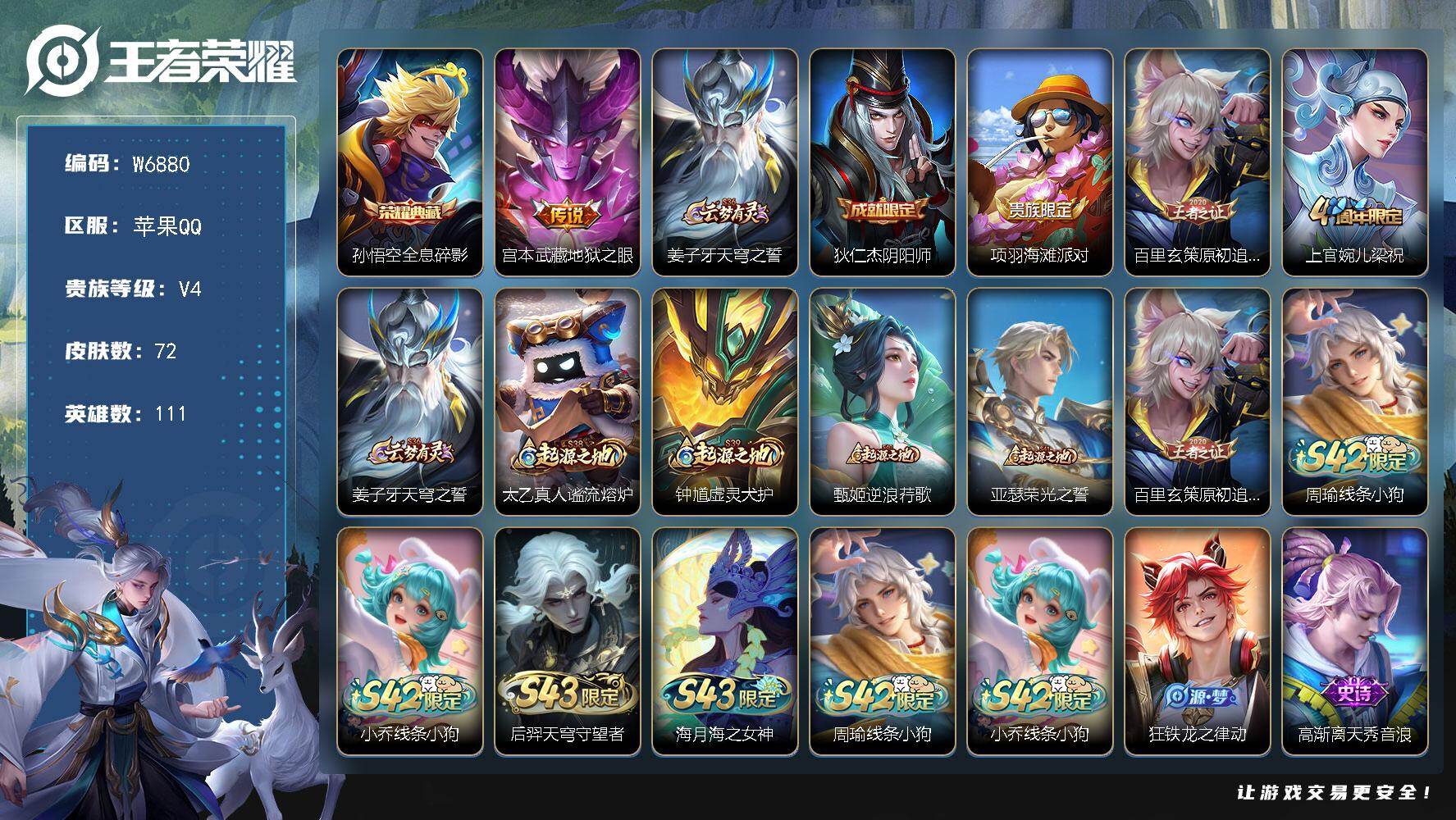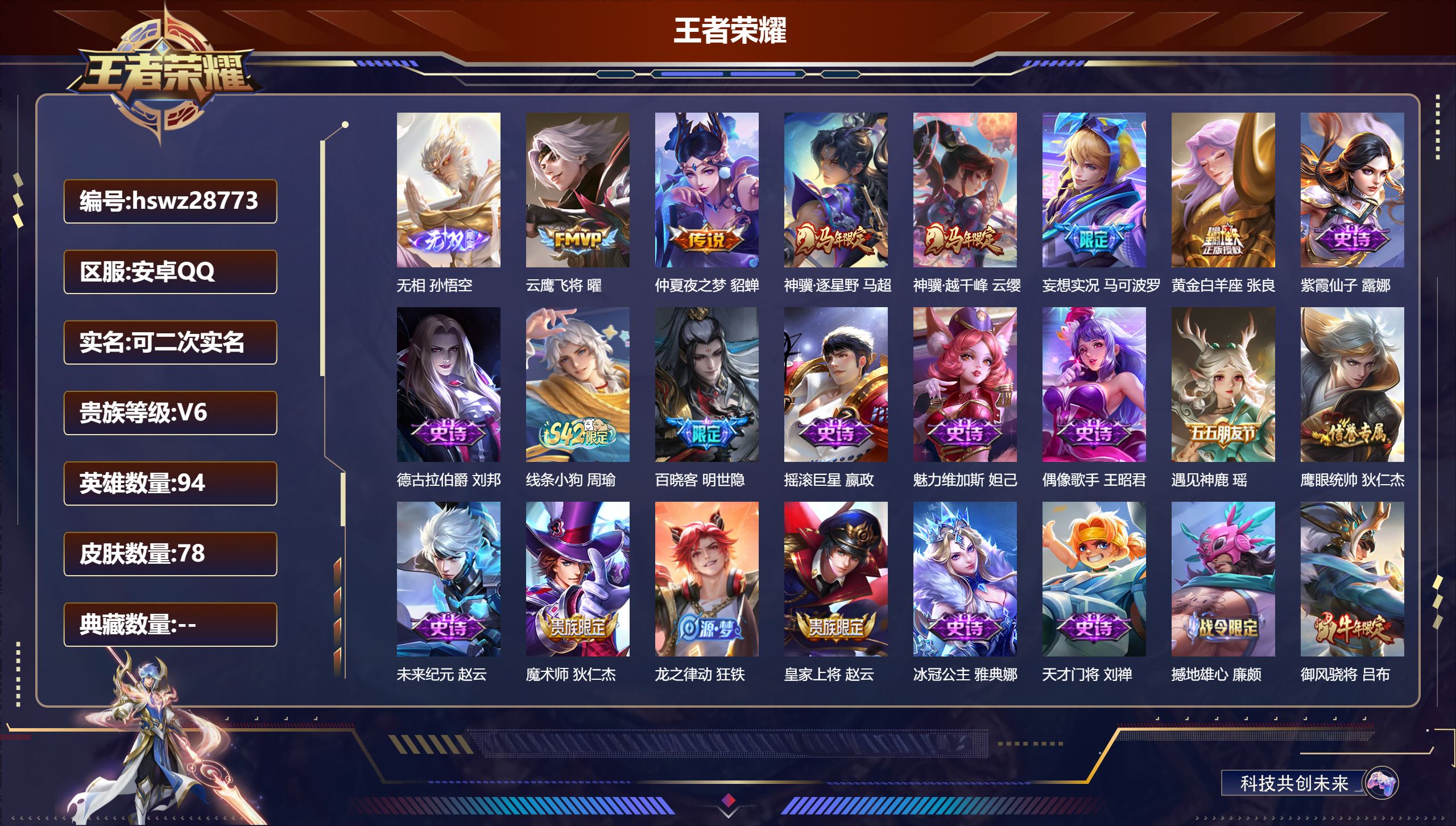 PX_2569890-Q/最强王者/78皮肤/94英雄/0典藏/0珍品无双/1无双/0珍品传说/6传说/22史诗/5稀有英雄 【1,无双皮肤】无相,孙悟空, 【6,传说皮肤】云鹰飞将,曜,仲夏夜之梦,貂蝉,神骥·逐星野,马超,神骥·越千峰,云缨,妄想实况,马可波罗,黄金白羊座,张良, 【22,史诗皮肤】紫霞仙子,露娜,德古拉伯爵,刘邦,线条小狗,周瑜,百晓客,明世隐,摇滚巨星,嬴政,魅力维加斯,妲己,偶像歌手,王昭君,遇见神鹿,瑶,鹰眼统帅,狄仁杰,未来纪元,赵云,魔术师,狄仁杰,龙之律动,狂铁,皇家上将,赵云,冰冠公主,雅典娜,天才门将,刘禅,撼地雄心,廉颇,御风骁将,吕布,圣诞狂欢,吕布,千年之狐,李白,曙光守护者,铠,线条小狗,小乔,水果甜心,孙尚香, 【31,勇者皮肤】海盐诗旅,桑启,阴阳师,狄仁杰,径山谋武,孙权,次元突破,哪吒,西部大镖客,牛魔,海滩派对,项羽,万华元夜,狄仁杰,演武夺筹,程咬金,天穹祈灯,鬼谷子,阿尔法小队,后羿,五福同心,张飞,赤刃凌霄,敖隐,死亡骑士,亚瑟,炽热元素使,姜子牙,坚韧之力,苏烈,万事如意,刘备,谜偶窥秘,鬼谷子,擒涛扼浪,裴擒虎,探海日志,鲁班大师,兔女郎,花木兰,龙腾万里,关羽,未来纪元,宫本武藏,零食大作战,姬小满,街头霸王,韩信,云中旅人,李元芳,西部大镖客,孙悟空,灵野札记,张良,驱傩正仪,钟馗,虚灵犬护,钟馗,剑破天穹,刘邦,线条小狗,周瑜, 【20,其他皮肤】圣殿之光,刘邦,棒球奇才,沈梦溪,极冰防御线,盾山,龙域领主,铠,超能战警,曹操,灼热之刃,李信,海之征途,孙策,精灵王,后羿,魇语军师,司马懿,维京掠夺者,苍,激情绿茵,马可波罗,埃及法老,杨戬,阿摩司公爵,鬼谷子,画中游,桑启,威尼斯狂欢,百里玄策,战争女神,雅典娜,绝影神枪,百里守约,加勒比小姐,虞姬,秩序猎龙将,蒙恬,西部大镖客,孙悟空, 【5,稀有英雄】敖隐,嬴政,橘右京,韩信,赵云, 营地ID:,
