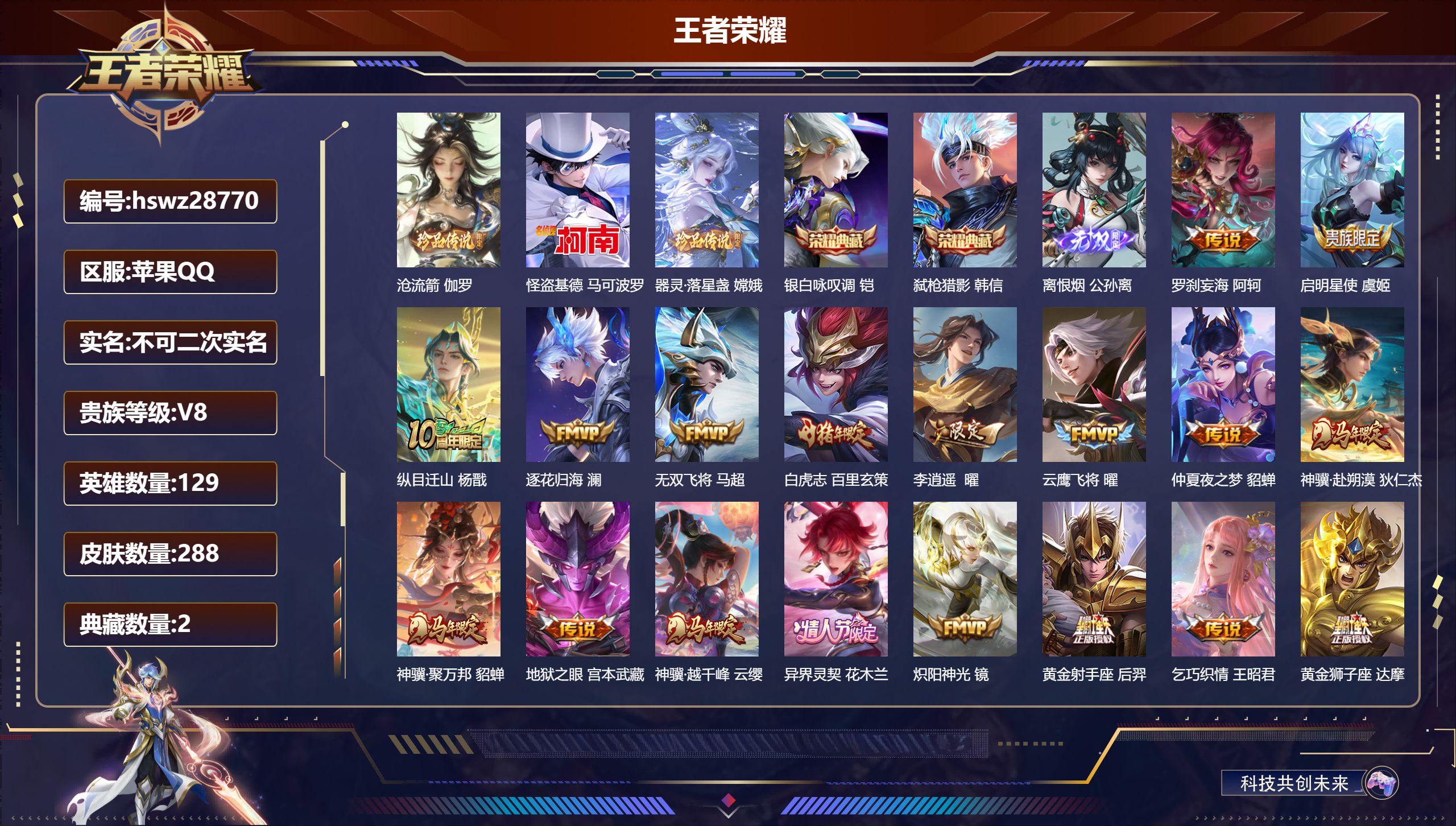 PX_2569881-Q/最强王者/288皮肤/129英雄/2典藏/0珍品无双/1无双/3珍品传说/33传说/81史诗/9稀有英雄 【3,珍品传说】沧流箭,伽罗,怪盗基德,马可波罗,器灵·落星盏,嫦娥, 【2,典藏皮肤】银白咏叹调,铠,弑枪猎影,韩信, 【1,无双皮肤】离恨烟,公孙离, 【33,传说皮肤】罗刹妄海,阿轲,启明星使,虞姬,纵目迁山,杨戬,逐花归海,澜,无双飞将,马超,白虎志,百里玄策,李逍遥,,曜,云鹰飞将,曜,仲夏夜之梦,貂蝉,神骥·赴朔漠,狄仁杰,神骥·聚万邦,貂蝉,地狱之眼,宫本武藏,神骥·越千峰,云缨,异界灵契,花木兰,炽阳神光,镜,黄金射手座,后羿,乞巧织情,王昭君,黄金狮子座,达摩,末日机甲,孙尚香,异界灵契,孙尚香,音你心动,小乔,绛天战甲,铠,冠军飞将,花木兰,黄金白羊座,张良,愿照·九州拓,澜,黄金天蝎座,墨子,神树通天,后羿,幻光神枪,云缨,愿照·山河定,司空震,祥瑞亨通,裴擒虎,愿照·千秋盛,女娲,鸣野蒿,桑启,云诺千山,公孙离, 【81,史诗皮肤】紫霞仙子,露娜,奇遇舞章,艾琳,天秀·启明,杨戬,德古拉伯爵,刘邦,山海·玄木吟,马可波罗,心灵战警,亚瑟,星君·亢金,达摩,五谷丰年,鬼谷子,无心,元歌,巫礼祀神,少司缘,鬼剑武藏,宫本武藏,百相守梦,黄忠,星夜王子,白起,无限星赏官,公孙离,瓦猫非猫,太乙真人,线条小狗,周瑜,撼世英歌,盘古,摇滚巨星,嬴政,顽趣,梦奇,修罗,橘右京,魅力维加斯,妲己,黄金分割率,诸葛亮,偶像歌手,王昭君,荣光圣徽,蒙恬,女仆咖啡,妲己,九幽镇关,项羽,星界游侠,暃,晚萤,娜可露露,鹰眼统帅,狄仁杰,孙行者,孙悟空,光弋星穹,莱西奥,春霖将至,上官婉儿,特工魅影,百里守约,猫狗日记,孙策,原初追逐者,百里玄策,时之彼端,妲己,黎明之约,雅典娜,石田雨龙,后羿,魔术师,狄仁杰,龙之律动,狂铁,顽岩魄,蒙犽,皇家上将,赵云,冰冠公主,雅典娜,功夫厨神,程咬金,东方月初,大司命,天才门将,刘禅,圣诞恋歌,貂蝉,水晶猎龙者,花木兰,涂山容容,公孙离,破空之剑,亚连,怒海争锋,黄忠,圣诞狂欢,吕布,青焰无极,镜,魅语,不知火舞,器灵·浮梦炉,赵怀真,浮光幕影,芈月,罗小黑战记,百里玄策,夏日便利店,蔡文姬,星界战将,牛魔,永昼,夏洛特,茶境仙,孙膑,蔷薇恋人,孙尚香,冰雪圆舞曲,甄姬,千年之狐,李白,节奏热浪,阿轲,织梦人,西施,曙光守护者,铠,万灵启世,女娲,心灵骇客,安琪拉,鹤归松栖,赵怀真,箭羽风息,伽罗,龙胆,赵云,缤纷独角兽,小乔,百相守梦,百里守约,线条小狗,小乔,时之恋人,孙尚香,水果甜心,孙尚香,化蝶舞,阿轲,幽灵船长,曹操,乘风破浪,夏侯惇,暗隐猎兽者,兰陵王, 【124,勇者皮肤】爱心护理,阿轲,沙漠行僧,达摩,大漠名商,沈梦溪,缤纷绘卷,张良,纽约教父,刘备,龙舞盛年,沈梦溪,丁香结,小乔,功夫炙烤,廉颇,沉稳之力,孙尚香,海盐诗旅,桑启,汉昭烈帝,刘备,白色死神,白起,黄金武士,典韦,阴阳师,狄仁杰,径山谋武,孙权,次元突破,哪吒,古海寻踪,张良,牛运亨通,牛魔,功夫老勺,老夫子,西部大镖客,牛魔,鲨炮海盗猫,沈梦溪,海滩派对,项羽,克喵,鬼谷子,踏浪烽翎,莱西奥,西部游侠,莱西奥,野性能量,吕布,守护之力,大乔,无双福将,程咬金,百相守梦,影,潮玩探月行,猪八戒,天穹祈灯,鬼谷子,化身博士,扁鹊,阿尔法小队,后羿,五福同心,张飞,幻乐之宴,鬼谷子,虹云星官,明世隐,雾影缉谜,兰陵王,舞狮寰,吕布,赤刃凌霄,敖隐,死亡骑士,亚瑟,敏锐之力,李白,玩偶对对碰,安琪拉,掌控之力,诸葛亮,海滩丽影,钟无艳,忍·炎影,赵云,雪境奇遇,西施,坚韧之力,苏烈,万事如意,刘备,逐霄战戟,吕布,擒涛扼浪,裴擒虎,苍云破阵,蒙恬,糖果风暴,安琪拉,乓乓大师,鲁班大师,逐霄之志,曹操,溯影追猎,虞姬,极光幻客,蚩奼,探海日志,鲁班大师,女武神,艾琳,天使之翼,孙膑,雾都夜雨,干将莫邪,兔女郎,花木兰,龙腾万里,关羽,金庭之子,兰陵王,未来纪元,宫本武藏,罗小黑战记,哪吒,千军破阵,苏烈,往忆晖光,明世隐,零食大作战,姬小满,荣光之誓,亚瑟,花好人间,甄姬,万象初新,宫本武藏,聚星闪耀,钟无艳,时尚教父,姜子牙,春野之旅,钟无艳,秘密基地,刘禅,教廷特使,韩信,街头霸王,韩信,云中旅人,李元芳,西部大镖客,孙悟空,神迹守卫,墨子,重装意志,盘古,进击墨子号,墨子,少女阿狸,妲己,灵卜魔法,妲己,暖冬·兔眠,嫦娥,命运加冕,露娜,幻想奇妙夜,王昭君,驱傩正仪,钟馗,死霸装,白起,特工战影,狂铁,虚灵犬护,钟馗,班班快跑,鲁班七号,白执事,赵云,劲辣红锅,太乙真人,神迹守卫,孙悟空,剑破天穹,刘邦,青衿临川,桑启,苍威无极,项羽,铁骨偃魂,典韦,熔金海岸,周瑜,苍林狼骑,苍,天穹之誓,姜子牙,长夏之忆,貂蝉,访茗客,马超,星梦巡礼,姜子牙,破阵·退雄兵,杨戬,谧流熔炉,太乙真人,群星魔术团,程咬金,暗都幽影,大司命,夏日便利店,虞姬,鹤鸣心笺,艾琳,线条小狗,妲己,锦麟游梦,庄周,逆浪荇歌,甄姬,海之女神,海月,微风如诗,大乔,线条小狗,周瑜,线条小狗,桑启,百相守梦,老夫子,噬灭天穹,东皇太一,灵卦秘语,少司缘,敬我三分,盘古,玫蓝誓约,戈娅,景韶洛都,明世隐, 【49,其他皮肤】沧流箭,伽罗,前尘,金蝉,圣殿之光,刘邦,芝加哥教父,黄忠,潮流仙人,老夫子,棒球奇才,沈梦溪,龙域领主,铠,超能战警,曹操,未来旅行,孙膑,灼热之刃,李信,熊喵少女,阿古朵,海之征途,孙策,帝国元帅,项羽,精灵王,后羿,绯红之刃,露娜,冰刃幻境,镜,海军大将,周瑜,星航指挥官,诸葛亮,魇语军师,司马懿,启蛰,司空震,霓裳曲,杨玉环,花间舞,公孙离,异域舞娘,貂蝉,街头旋风,裴擒虎,修
