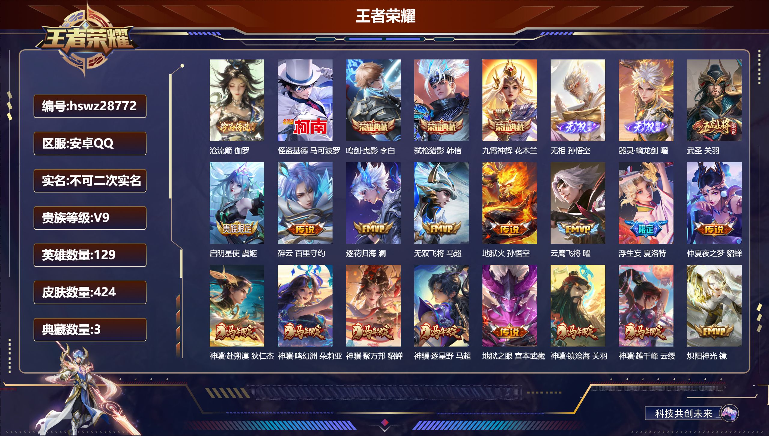 PX_2569896-Q/至尊星耀/424皮肤/129英雄/3典藏/0珍品无双/2无双/2珍品传说/34传说/129史诗/9稀有英雄 【2,珍品传说】沧流箭,伽罗,怪盗基德,马可波罗, 【3,典藏皮肤】鸣剑·曳影,李白,弑枪猎影,韩信,九霄神辉,花木兰, 【2,无双皮肤】无相,孙悟空,器灵·螭龙剑,曜, 【34,传说皮肤】武圣,关羽,启明星使,虞姬,碎云,百里守约,逐花归海,澜,无双飞将,马超,地狱火,孙悟空,云鹰飞将,曜,浮生妄,夏洛特,仲夏夜之梦,貂蝉,神骥·赴朔漠,狄仁杰,神骥·鸣幻洲,朵莉亚,神骥·聚万邦,貂蝉,神骥·逐星野,马超,地狱之眼,宫本武藏,神骥·镇沧海,关羽,神骥·越千峰,云缨,炽阳神光,镜,启示之音,露娜,黄金射手座,后羿,遇见神鼓,吕布,时之恋人,刘备,黄金狮子座,达摩,久胜战神,干将莫邪,末日机甲,孙尚香,异界灵契,孙尚香,末日机甲,孙策,一念神魔,李信,战鼓燎原,典韦,画中仙,干将莫邪,超时空战士,狄仁杰,冥王哈迪斯,铠,冠军飞将,花木兰,黄金白羊座,张良,神树通天,后羿, 【129,史诗皮肤】时之奇旅,安琪拉,电玩小子,鲁班七号,末日机甲,吕布,紫霞仙子,露娜,高山流水,庄周,银河之约,李元芳,暗渊魔法,司马懿,暗影游猎,马可波罗,燃音魔法,高渐离,苍穹之光,项羽,天秀·启明,杨戬,猫狗日记,大乔,妄想食味,姬小满,德古拉伯爵,刘邦,心灵战警,亚瑟,星君·亢金,达摩,五谷丰年,鬼谷子,诗语江南,西施,无心,元歌,鬼剑武藏,宫本武藏,迷踪丽影,阿轲,星夜王子,白起,无限星赏官,公孙离,线条小狗,周瑜,遇见飞天,杨玉环,摇滚巨星,嬴政,电玩高手,狂铁,顽趣,梦奇,修罗,橘右京,拒霜思,嫦娥,魅力维加斯,妲己,黄金分割率,诸葛亮,偶像歌手,王昭君,荣光圣徽,蒙恬,女仆咖啡,妲己,赏金猎手,澜,星界游侠,暃,晚萤,娜可露露,猪悟能,猪八戒,舞动绿茵,蔡文姬,暗夜贵公子,嬴政,鹰眼统帅,狄仁杰,胡桃异想国,米莱狄,飞衡,韩信,傩神司,兰陵王,李小龙,裴擒虎,光弋星穹,莱西奥,春霖将至,上官婉儿,纤云弄巧,云中君,龙骑士,墨子,金属风暴,墨子,特工魅影,百里守约,猫狗日记,孙策,原初追逐者,百里玄策,逐浪之夏,李元芳,奇幻香踪,扁鹊,真我赫兹,百里守约,未来纪元,赵云,灵蛊蚀心,扁鹊,黎明之约,雅典娜,优雅恋人,嬴政,驭风魔法,戈娅,魔术师,狄仁杰,埋骨钱,暃,龙之律动,狂铁,神威,马超,顽岩魄,蒙犽,皇家上将,赵云,冰冠公主,雅典娜,至尊宝,孙悟空,涂山红红,少司缘,战舞者,姬小满,功夫厨神,程咬金,东方月初,大司命,梁祝,上官婉儿,电玩·爆裂旋风,刘禅,天才门将,刘禅,圣诞恋歌,貂蝉,云间偶戏,元歌,水晶猎龙者,花木兰,撼地雄心,廉颇,涂山容容,公孙离,决胜骁骑,关羽,破空之剑,亚连,百木心枪,赵云,圣诞狂欢,吕布,魅语,不知火舞,群星魔术团,上官婉儿,浮梦罗烟,海月,器灵·浮梦炉,赵怀真,罗小黑战记,百里玄策,夏日便利店,蔡文姬,星界战将,牛魔,永昼,夏洛特,天狼溯光者,伽罗,地狱岩魂,廉颇,冰雪圆舞曲,甄姬,火炮绅士,黄忠,青蛇,小乔,逐梦之翼,哪吒,航海奇遇记,老夫子,雪上飞焰,哪吒,千年之狐,李白,节奏热浪,阿轲,暗夜猫娘,阿轲,游园惊梦,甄姬,梦圆繁星,盾山,曙光守护者,铠,万灵启世,女娲,心灵骇客,安琪拉,箭羽风息,伽罗,乱世虎臣,张飞,吟游魔法,明世隐,龙胆,赵云,王者之锤,钟无艳,谪仙醉月,李白,绅士熊喵,刘禅,缤纷独角兽,小乔,魔法小厨娘,安琪拉,线条小狗,小乔,炽弈燎原,弈星,天狼狩猎者,裴擒虎,真爱魔法,干将莫邪,水果甜心,孙尚香,狂想玩偶喵,蒙犽,江河有灵,阿古朵,幽灵船长,曹操,乘风破浪,夏侯惇,暗隐猎兽者,兰陵王, 【176,勇者皮肤】时空谍影,海诺,玲珑珍味,西施,圆桌骑士,盾山,爱心护理,阿轲,太极少年,赵怀真,星际陆战队,达摩,沙漠行僧,达摩,大漠名商,沈梦溪,缤纷绘卷,张良,纽约教父,刘备,拳王,达摩,大发明家,达摩,龙舞盛年,沈梦溪,丁香结,小乔,功夫炙烤,廉颇,铁甲之心,典韦,沉稳之力,孙尚香,幻夜卜梦,芈月,海盐诗旅,桑启,幻泉雾影,海月,朔风刀,夏侯惇,醍醐杖,老夫子,朔望之晖,女娲,归虚梦演,孙膑,汉昭烈帝,刘备,热血海滩,哪吒,白色死神,白起,黑桃队长,鲁班七号,黄金武士,典韦,夺宝奇兵,刘邦,御旌,牛魔,阴阳师,狄仁杰,径山谋武,孙权,次元突破,哪吒,古海寻踪,张良,牛运亨通,牛魔,戏梦巡演,空空儿,功夫老勺,老夫子,西部大镖客,牛魔,鲨炮海盗猫,沈梦溪,虎啸剑宗,刘邦,海滩派对,项羽,完美运算,后羿,万华元夜,狄仁杰,无尽征程,廉颇,克喵,鬼谷子,踏浪烽翎,莱西奥,演武夺筹,程咬金,红桃皇后,芈月,西部游侠,莱西奥,野性能量,吕布,哥特玫瑰,露娜,守护之力,大乔,无双福将,程咬金,百相守梦,影,原初探秘者,鬼谷子,星空之诺,沈梦溪,潮玩探月行,猪八戒,天穹祈灯,鬼谷子,决胜大满贯,曹操,西部大镖客,猪八戒,疑决卦,明世隐,化身博士,扁鹊,潮玩骑士王,亚瑟,阿尔法小队,后羿,五福同心,张飞,夜都怪侠,白起,金色潮汐,朵莉亚,星际陆战队,程咬金,幻乐之宴,鬼谷子,霸王丸,宫本武藏,虹云星官,明世隐,雾影缉谜,兰陵王,舞狮寰,吕布,救世之瞳,扁鹊,赤刃凌霄,敖隐,潮玩骑兵,杨戬,赤莲之焰,周瑜,死亡骑士,亚瑟,敏锐之力,李白,危途狂花,戈娅,破局者,亚连,玩偶对对碰,安琪拉,掌控之力,诸葛亮,海滩丽影,钟无艳,圣弓游侠,后羿,忍·炎影,赵云,狰,白起,雪境奇遇,西施,重明,芈月,炽热元素使,姜子牙,坚韧之力,苏烈,唤灵魔甲,刘禅,万事如意,刘备,逐霄战戟,吕布,谜偶窥秘,鬼谷子,擒涛扼浪,裴擒虎,苍云破阵,蒙恬,乓乓大师,鲁班大师,逐霄之志,曹操,死亡摇