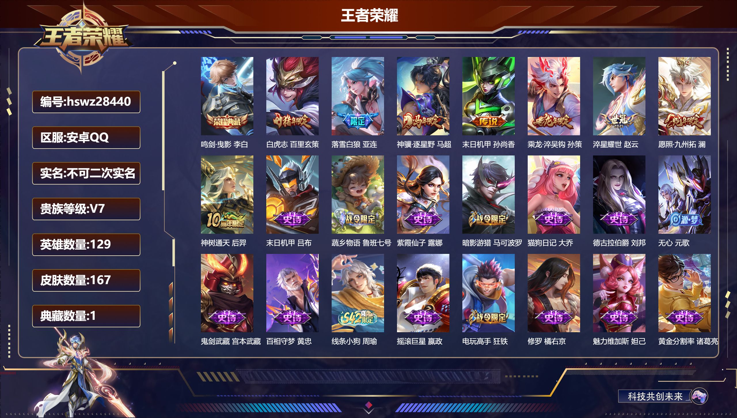 PX_2561797-Q/尊贵铂金/167皮肤/129英雄/1典藏/0珍品无双/0无双/0珍品传说/8传说/52史诗/9稀有英雄 【1,典藏皮肤】鸣剑·曳影,李白, 【8,传说皮肤】白虎志,百里玄策,落雪白狼,亚连,神骥·逐星野,马超,末日机甲,孙尚香,乘龙·淬吴钩,孙策,淬星耀世,赵云,愿照·九州拓,澜,神树通天,后羿, 【52,史诗皮肤】末日机甲,吕布,蔬乡物语,鲁班七号,紫霞仙子,露娜,暗影游猎,马可波罗,猫狗日记,大乔,德古拉伯爵,刘邦,无心,元歌,鬼剑武藏,宫本武藏,百相守梦,黄忠,线条小狗,周瑜,摇滚巨星,嬴政,电玩高手,狂铁,修罗,橘右京,魅力维加斯,妲己,黄金分割率,诸葛亮,女仆咖啡,妲己,暗夜贵公子,嬴政,鹰眼统帅,狄仁杰,光弋星穹,莱西奥,纤云弄巧,云中君,金属风暴,墨子,特工魅影,百里守约,猫狗日记,孙策,未来纪元,赵云,魔术师,狄仁杰,龙之律动,狂铁,皇家上将,赵云,冰冠公主,雅典娜,东方月初,大司命,电玩·爆裂旋风,刘禅,圣诞恋歌,貂蝉,水晶猎龙者,花木兰,涂山容容,公孙离,破空之剑,亚连,御风骁将,吕布,怒海争锋,黄忠,圣诞狂欢,吕布,夏日便利店,蔡文姬,星界战将,牛魔,茶境仙,孙膑,千年之狐,李白,心灵骇客,安琪拉,箭羽风息,伽罗,百相守梦,周瑜,绅士熊喵,刘禅,时之恋人,孙尚香,水果甜心,孙尚香,瑰影绮梦,芈月,化蝶舞,阿轲,江河有灵,阿古朵,狼魂孤将,苍,幽灵船长,曹操, 【88,勇者皮肤】爱心护理,阿轲,拳王,达摩,龙舞盛年,沈梦溪,丁香结,小乔,沉稳之力,孙尚香,幻泉雾影,海月,汉昭烈帝,刘备,热血海滩,哪吒,黑桃队长,鲁班七号,黄金武士,典韦,王牌新星,海月,阴阳师,狄仁杰,古海寻踪,张良,戏梦巡演,空空儿,功夫老勺,老夫子,虎啸剑宗,刘邦,海滩派对,项羽,完美运算,后羿,踏浪烽翎,莱西奥,西部游侠,莱西奥,哥特玫瑰,露娜,百相守梦,影,潮玩探月行,猪八戒,天穹祈灯,鬼谷子,阿尔法小队,后羿,五福同心,张飞,赤刃凌霄,敖隐,死亡骑士,亚瑟,浪漫序章,刘备,敏锐之力,李白,危途狂花,戈娅,破局者,亚连,忍·炎影,赵云,雪境奇遇,西施,炽热元素使,姜子牙,擒涛扼浪,裴擒虎,乓乓大师,鲁班大师,逐霄之志,曹操,极光幻客,蚩奼,探海日志,鲁班大师,女武神,艾琳,兔女郎,花木兰,龙腾万里,关羽,罗小黑战记,哪吒,往忆晖光,明世隐,零食大作战,姬小满,聚星闪耀,钟无艳,潮玩造梦师,刘备,时尚教父,姜子牙,春野之旅,钟无艳,教廷特使,韩信,街头霸王,韩信,云中旅人,李元芳,妄想特派,李元芳,西部大镖客,孙悟空,蔬乡物语,李元芳,春野闲踪,苏烈,布丁狗之约,阿古朵,暖冬·兔眠,嫦娥,命运加冕,露娜,小满鸭,姬小满,幻想奇妙夜,王昭君,灵野札记,张良,命运角斗场,狂铁,死霸装,白起,特工战影,狂铁,虚灵犬护,钟馗,神迹守卫,孙悟空,剑破天穹,刘邦,铁骨偃魂,典韦,熔金海岸,周瑜,苍林狼骑,苍,天穹之誓,姜子牙,魅影绮裳,影,访茗客,马超,谧流熔炉,太乙真人,经纬探寻者,盘古,暗都幽影,大司命,夏日便利店,虞姬,鹤鸣心笺,艾琳,锦麟游梦,庄周,逆浪荇歌,甄姬,百相守梦,孙策,线条小狗,周瑜,噬灭天穹,东皇太一,敬我三分,盘古,玫蓝誓约,戈娅,景韶洛都,明世隐, 【20,其他皮肤】芝加哥教父,黄忠,花见巫女,伽罗,绯红之刃,露娜,冰刃幻境,镜,海军大将,周瑜,启蛰,司空震,花间舞,公孙离,维京掠夺者,苍,埃及法老,杨戬,年年有余,猪八戒,尼罗河女神,女娲,威尼斯狂欢,百里玄策,幸存者,马超,绝影神枪,百里守约,孤猎,澜,秩序猎龙将,蒙恬,赤焰之缨,云缨,露花倒影,嫦娥,圆桌骑士,太乙真人,西部大镖客,孙悟空, 【9,稀有英雄】敖隐,嬴政,不知火舞,橘右京,夏洛特,娜可露露,韩信,艾琳,赵云, 营地ID:,