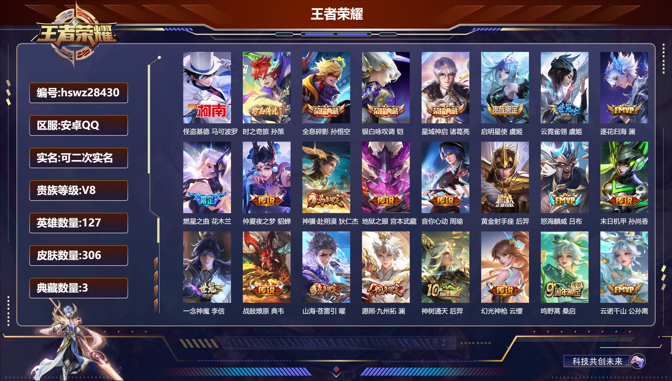 PX_2561891-Q/至尊星耀/145皮肤/125英雄/0典藏/0珍品无双/0无双/2珍品传说/14传说/33史诗/8稀有英雄 【2,珍品传说】怪盗基德,马可波罗,器灵·落星盏,嫦娥, 【14,传说皮肤】逐花归海,澜,无双飞将,马超,神骥·赴朔漠,狄仁杰,记忆之芯,公孙离,神骥·逐星野,马超,地狱之眼,宫本武藏,神骥·镇沧海,关羽,神骥·越千峰,云缨,炽阳神光,镜,霜月吟,露娜,黄金狮子座,达摩,神树通天,后羿,鸣野蒿,桑启,云诺千山,公孙离, 【33,史诗皮肤】末日机甲,吕布,紫霞仙子,露娜,暗渊魔法,司马懿,无心,元歌,巫礼祀神,少司缘,鬼剑武藏,宫本武藏,百相守梦,黄忠,线条小狗,周瑜,百晓客,明世隐,九幽镇关,项羽,鹰眼统帅,狄仁杰,李小龙,裴擒虎,原初追逐者,百里玄策,逐浪之夏,李元芳,魔术师,狄仁杰,龙之律动,狂铁,皇家上将,赵云,功夫厨神,程咬金,东方月初,大司命,破空之剑,亚连,圣诞狂欢,吕布,星界战将,牛魔,茶境仙,孙膑,曙光守护者,铠,星界特工,马可波罗,缤纷独角兽,小乔,百相守梦,百里守约,线条小狗,小乔,时之恋人,孙尚香,水果甜心,孙尚香,化蝶舞,阿轲,幽灵船长,曹操,乘风破浪,夏侯惇, 【68,勇者皮肤】胡桃夹子,干将莫邪,太极少年,赵怀真,龙舞盛年,沈梦溪,丁香结,小乔,铁甲之心,典韦,白色死神,白起,黄金武士,典韦,阴阳师,狄仁杰,径山谋武,孙权,海滩派对,项羽,克喵,鬼谷子,踏浪烽翎,莱西奥,红桃皇后,芈月,西部游侠,莱西奥,野性能量,吕布,哥特玫瑰,露娜,无双福将,程咬金,百相守梦,影,潮玩探月行,猪八戒,五福同心,张飞,赤刃凌霄,敖隐,浪漫序章,刘备,危途狂花,戈娅,玩偶对对碰,安琪拉,海滩丽影,钟无艳,忍·炎影,赵云,雪境奇遇,西施,乓乓大师,鲁班大师,逐霄之志,曹操,溯影追猎,虞姬,极光幻客,蚩奼,雾都夜雨,干将莫邪,金庭之子,兰陵王,未来纪元,宫本武藏,荣光之誓,亚瑟,教廷特使,韩信,黑猫爱糖果,李元芳,街头霸王,韩信,西部大镖客,孙悟空,少女阿狸,妲己,春野闲踪,苏烈,布丁狗之约,阿古朵,命运加冕,露娜,小满鸭,姬小满,灵野札记,张良,潮玩士官长,雅典娜,命运角斗场,狂铁,死霸装,白起,虚灵犬护,钟馗,班班快跑,鲁班七号,神迹守卫,孙悟空,剑破天穹,刘邦,铁骨偃魂,典韦,苍林狼骑,苍,天穹之誓,姜子牙,魅影绮裳,影,访茗客,马超,谧流熔炉,太乙真人,鹤鸣心笺,艾琳,锦麟游梦,庄周,逆浪荇歌,甄姬,海之女神,海月,线条小狗,周瑜,百相守梦,老夫子,噬灭天穹,东皇太一,敬我三分,盘古,玫蓝誓约,戈娅,景韶洛都,明世隐, 【32,其他皮肤】龙域领主,铠,花见巫女,伽罗,灼热之刃,李信,熊喵少女,阿古朵,海之征途,孙策,木偶奇遇记,鲁班七号,精灵王,后羿,冰刃幻境,镜,碧珀绯影,暃,启蛰,司空震,花间舞,公孙离,街头旋风,裴擒虎,修竹墨客,上官婉儿,剑舞者,花木兰,维京掠夺者,苍,激情绿茵,马可波罗,埃及法老,杨戬,归虚梦演,西施,威尼斯狂欢,百里玄策,幸存者,马超,创世神祝,盘古,特种部队,李元芳,绝影神枪,百里守约,孤猎,澜,加勒比小姐,虞姬,秩序猎龙将,蒙恬,精准探案法,米莱狄,赤焰之缨,云缨,露花倒影,嫦娥,怪盗基德,马可波罗,西部大镖客,孙悟空,器灵·落星盏,嫦娥, 【8,稀有英雄】敖隐,不知火舞,橘右京,夏洛特,娜可露露,韩信,艾琳,赵云, 营地ID:,