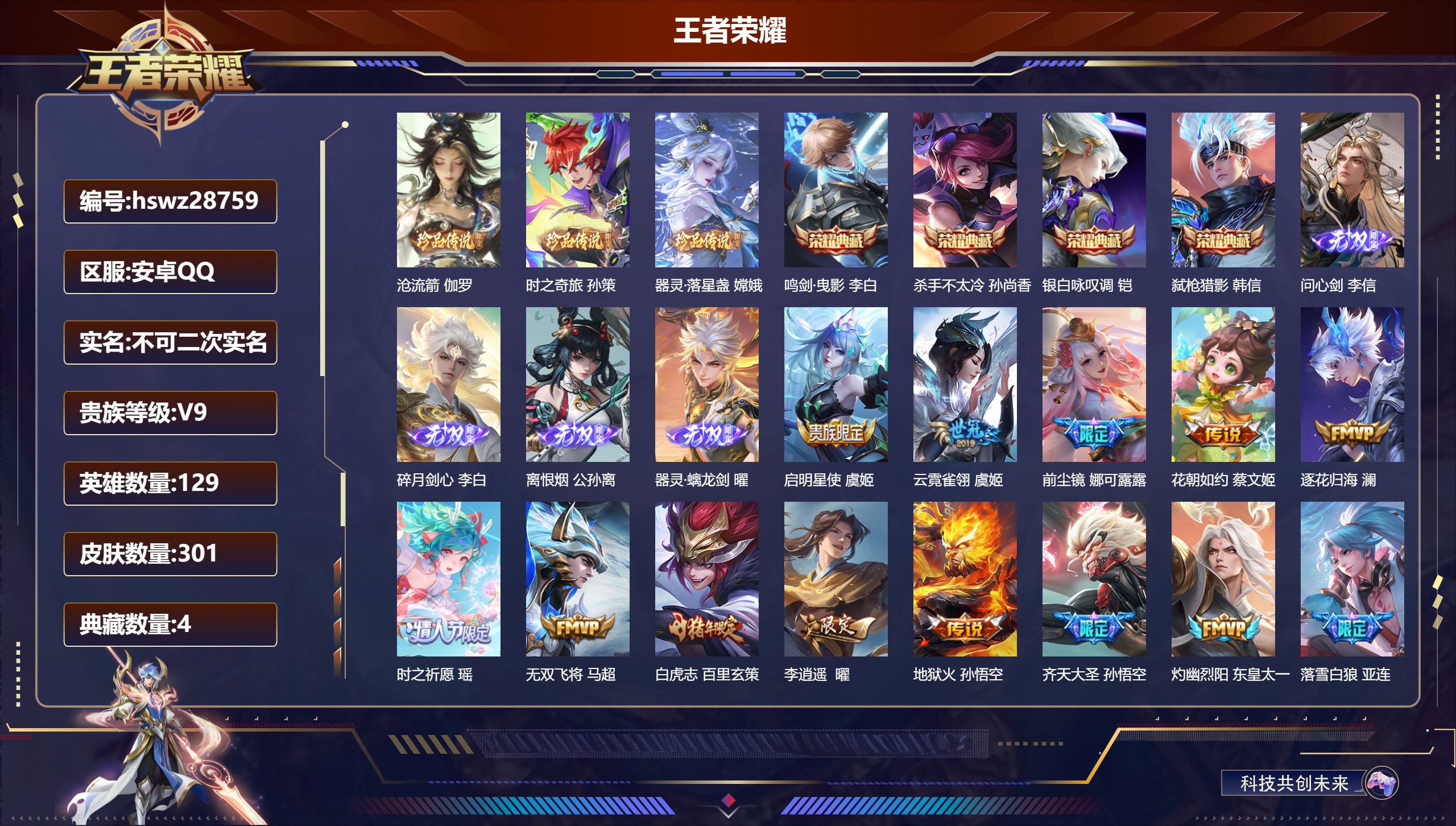 PX_2561790-Q/至尊星耀/436皮肤/129英雄/3典藏/0珍品无双/6无双/4珍品传说/54传说/127史诗/9稀有英雄 【4,珍品传说】沧流箭,伽罗,酷洛米之心,安琪拉,大耳狗之梦,瑶,兔狲·蓬尾,张飞, 【3,典藏皮肤】鸣剑·曳影,李白,全息碎影,孙悟空,九霄神辉,花木兰, 【6,无双皮肤】问心剑,李信,天机白泽,诸葛亮,无相,孙悟空,碎月剑心,李白,离恨烟,公孙离,群星魔术团,韩信, 【54,传说皮肤】启明星使,虞姬,碎云,百里守约,逐花归海,澜,无双飞将,马超,白虎志,百里玄策,九山相柳,司马懿,死亡执政官,大司命,李逍遥,,曜,夜礼服假面,狄仁杰,深海之息,马可波罗,觅芳踪,艾琳,永曜之星,杨戬,凤求凰,李白,诗剑行,李白,灼幽烈阳,东皇太一,猫影幻舞,貂蝉,落雪白狼,亚连,神骥·赴朔漠,狄仁杰,神骥·鸣幻洲,朵莉亚,神骥·聚万邦,貂蝉,神骥·逐星野,马超,星君·娄金,李元芳,地狱之眼,宫本武藏,神骥·镇沧海,关羽,神骥·越千峰,云缨,异界灵契,花木兰,时雨天司,诸葛亮,炽阳神光,镜,启示之音,露娜,黄金射手座,后羿,曦玄引,吕布,无限倾心,项羽,乞巧织情,王昭君,时之恋人,刘备,挚爱之约,孙策,久胜战神,干将莫邪,末日机甲,孙尚香,乘龙·淬吴钩,孙策,异界灵契,孙尚香,山海·炽霜斩,李信,一念神魔,李信,画中仙,干将莫邪,天魔缭乱,吕布,淬星耀世,赵云,绛天战甲,铠,山海·苍雷引,曜,琥珀纪元,马超,黄金白羊座,张良,愿照·九州拓,澜,诡秘之主,元歌,神树通天,后羿,幻光神枪,云缨,愿照·千秋盛,女娲,鸣野蒿,桑启, 【127,史诗皮肤】电玩小子,鲁班七号,末日机甲,吕布,紫霞仙子,露娜,百解令,蒙犽,高山流水,庄周,银河之约,李元芳,暗影游猎,马可波罗,燃音魔法,高渐离,冰霜恋舞曲,干将莫邪,苍穹之光,项羽,天秀·启明,杨戬,狮舞东方,鲁班七号,猫狗日记,大乔,妄想食味,姬小满,德古拉伯爵,刘邦,山海·玄木吟,马可波罗,心灵战警,亚瑟,五谷丰年,鬼谷子,诗语江南,西施,无心,元歌,巫礼祀神,少司缘,鬼剑武藏,宫本武藏,百相守梦,黄忠,迷踪丽影,阿轲,幻珠鲛人,朵莉亚,星夜王子,白起,地狱燃心,司空震,线条小狗,周瑜,百晓客,明世隐,撼世英歌,盘古,摇滚巨星,嬴政,冰锋战神,关羽,修罗,橘右京,魅力维加斯,妲己,黄金分割率,诸葛亮,赞萌露比,云缨,乐园奇幻夜,钟馗,偶像歌手,王昭君,荣光圣徽,蒙恬,女仆咖啡,妲己,赏金猎手,澜,九幽镇关,项羽,星界游侠,暃,舞动绿茵,蔡文姬,繁星吟游,蔡文姬,暗夜贵公子,嬴政,鹰眼统帅,狄仁杰,大圣娶亲,孙悟空,飞衡,韩信,孙行者,孙悟空,李小龙,裴擒虎,纤云弄巧,云中君,驯魔猎人,兰陵王,龙骑士,墨子,金属风暴,墨子,冰霜神祇,盘古,特工魅影,百里守约,猫狗日记,孙策,原初追逐者,百里玄策,逐浪之夏,李元芳,奇幻香踪,扁鹊,时之祈愿,云中君,未来纪元,赵云,藏狐·褐绒,老夫子,灵蛊蚀心,扁鹊,朱雀志,百里守约,雪豹·霜爪,百里守约,石田雨龙,后羿,鸭鸭历险记,刘禅,驭风魔法,戈娅,魔术师,狄仁杰,埋骨钱,暃,龙之律动,狂铁,神威,马超,皇家上将,赵云,冰冠公主,雅典娜,至尊宝,孙悟空,辉光之辰,后羿,功夫厨神,程咬金,梁祝,上官婉儿,天才门将,刘禅,云间偶戏,元歌,水晶猎龙者,花木兰,撼地雄心,廉颇,涂山容容,公孙离,破空之剑,亚连,心动手记,海诺,圣诞狂欢,吕布,青焰无极,镜,魅语,不知火舞,器灵·浮梦炉,赵怀真,浮光幕影,芈月,罗小黑战记,百里玄策,白龙吟,韩信,夏日便利店,蔡文姬,百相守梦,刘备,星界战将,牛魔,地狱岩魂,廉颇,茶境仙,孙膑,冰雪圆舞曲,甄姬,青蛇,小乔,默契交锋,花木兰,月团寄思,沈梦溪,千年之狐,李白,节奏热浪,阿轲,暗夜猫娘,阿轲,超时空战士,钟无艳,曙光守护者,铠,心灵骇客,安琪拉,箭羽风息,伽罗,乱世虎臣,张飞,百相守梦,周瑜,真我赫兹,镜,琥珀纪元,伽罗,万物之道,弈星,龙胆,赵云,谪仙醉月,李白,绅士熊喵,刘禅,缤纷独角兽,小乔,百相守梦,百里守约,线条小狗,小乔,水果甜心,孙尚香,狂想玩偶喵,蒙犽,江河有灵,阿古朵,幽灵船长,曹操,乘风破浪,夏侯惇,暗隐猎兽者,兰陵王, 【178,勇者皮肤】时空谍影,海诺,玲珑珍味,西施,圆桌骑士,盾山,爱心护理,阿轲,太极少年,赵怀真,星际陆战队,达摩,大漠名商,沈梦溪,缤纷绘卷,张良,纽约教父,刘备,拳王,达摩,大发明家,达摩,龙舞盛年,沈梦溪,乐园追猎者,白起,丁香结,小乔,功夫炙烤,廉颇,铁甲之心,典韦,沉稳之力,孙尚香,海盐诗旅,桑启,幻泉雾影,海月,朔风刀,夏侯惇,醍醐杖,老夫子,归虚梦演,孙膑,汉昭烈帝,刘备,热血海滩,哪吒,白色死神,白起,黑桃队长,鲁班七号,黄金武士,典韦,王牌新星,海月,落雪兰心,甄姬,夺宝奇兵,刘邦,御旌,牛魔,阴阳师,狄仁杰,径山谋武,孙权,次元突破,哪吒,古海寻踪,张良,科学大爆炸,项羽,戏梦巡演,空空儿,功夫老勺,老夫子,鲨炮海盗猫,沈梦溪,虎啸剑宗,刘邦,海滩派对,项羽,完美运算,后羿,万华元夜,狄仁杰,克喵,鬼谷子,制霸全明星,牛魔,踏浪烽翎,莱西奥,演武夺筹,程咬金,红桃皇后,芈月,奇妙博物学,庄周,西部游侠,莱西奥,野性能量,吕布,哥特玫瑰,露娜,守护之力,大乔,无双福将,程咬金,百相守梦,影,原初探秘者,鬼谷子,星空之诺,沈梦溪,潮玩探月行,猪八戒,天穹祈灯,鬼谷子,决胜大满贯,曹操,西部大镖客,猪八戒,疑决卦,明世隐,化身博士,扁鹊,潮玩骑士王,亚瑟,阿尔法小队,后羿,五福同心,张飞,次元傲视,杨戬,星际陆战队,程咬金,幻乐之宴,鬼谷子,霸王丸,宫本武藏,虹云星官,明世隐,雾影缉谜,兰陵王,舞狮寰,吕布,救世之瞳,扁鹊,赤刃凌霄,敖隐,潮