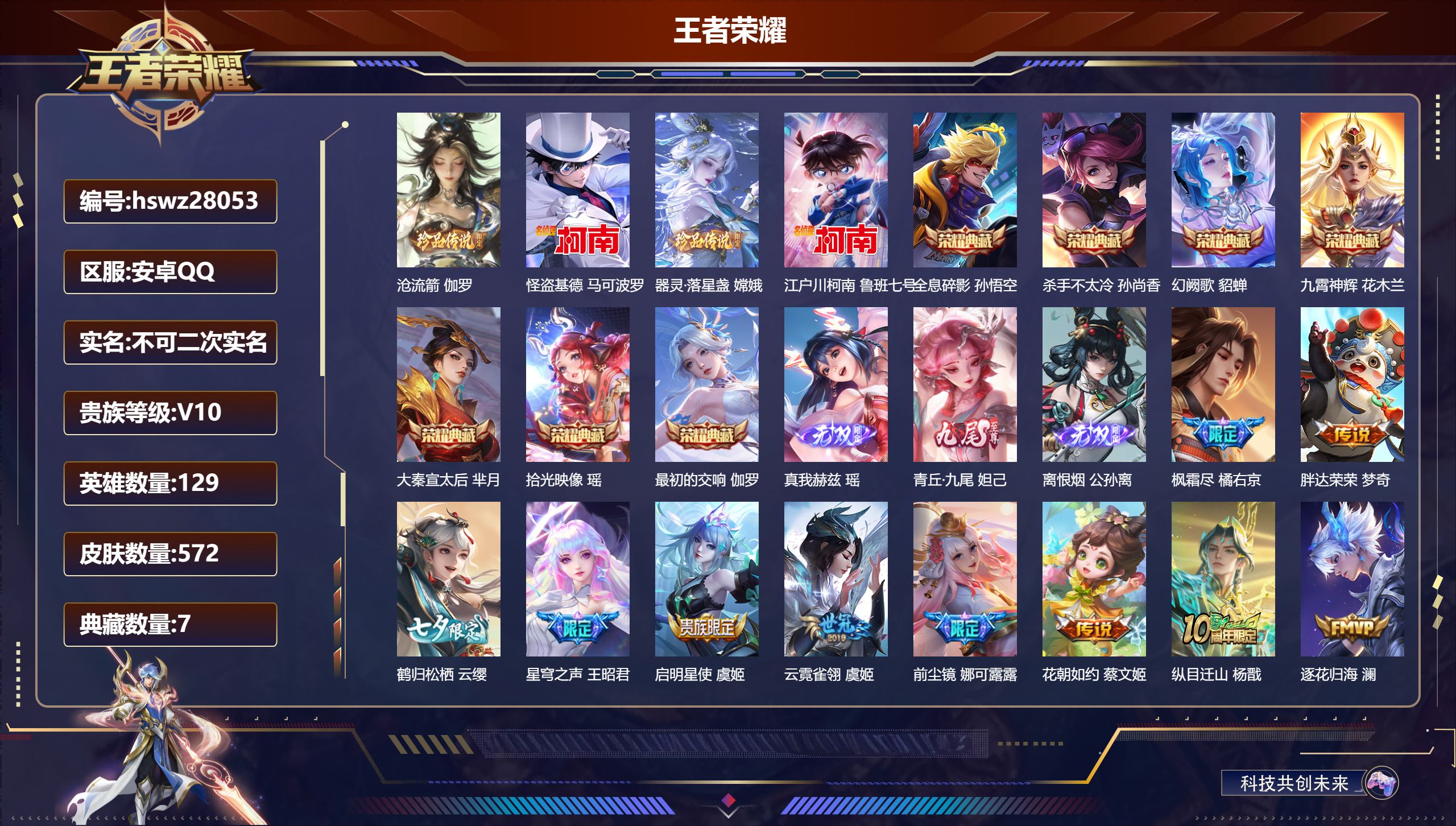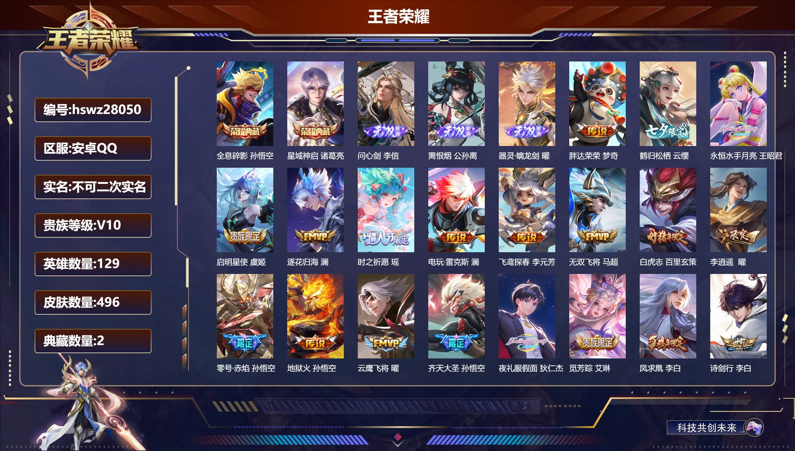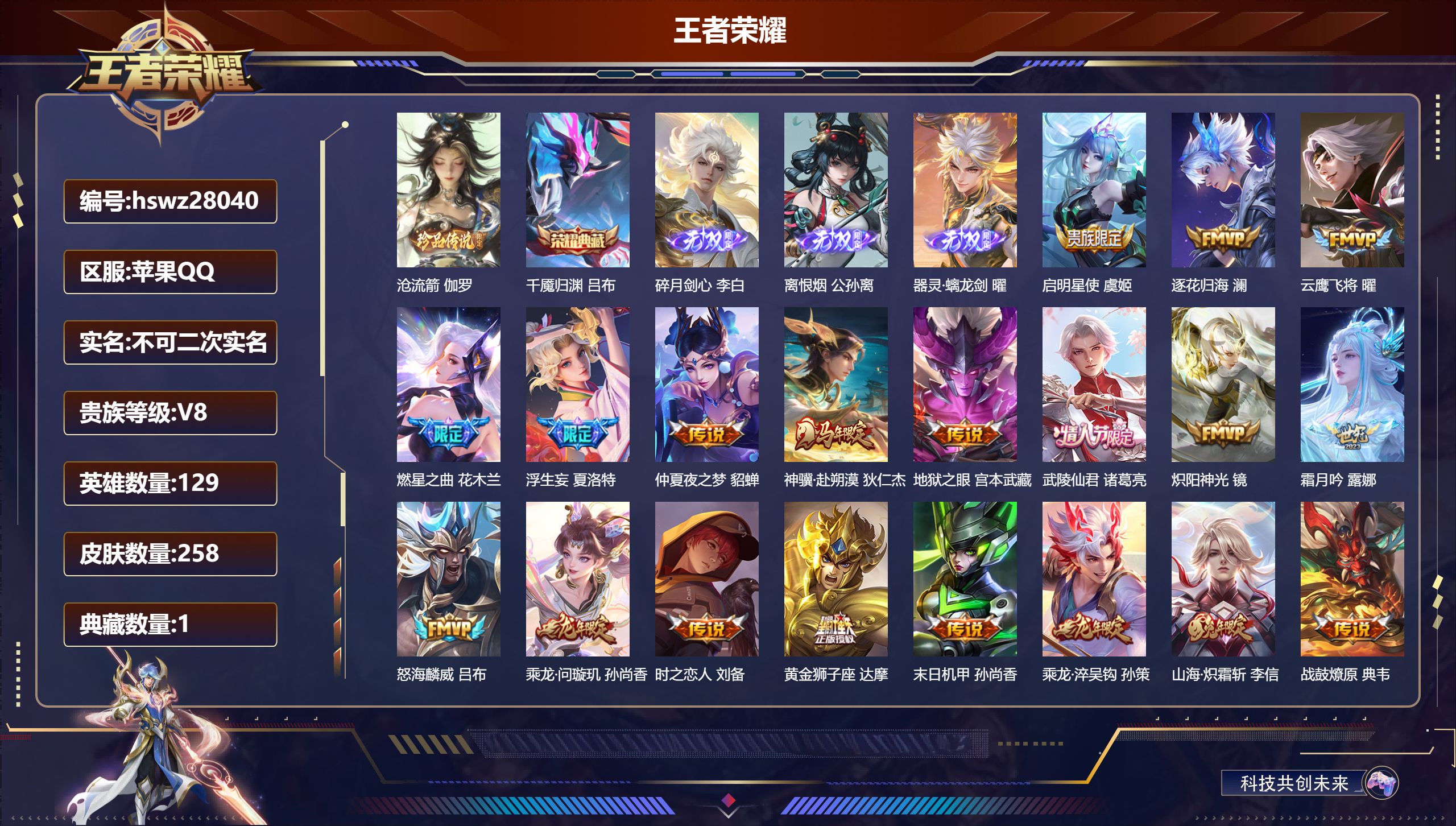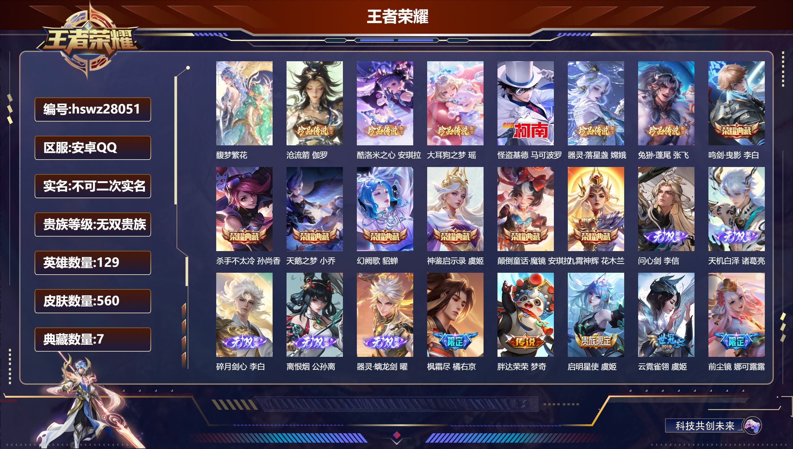 PX_2543895-Q/非凡王者/249皮肤/126英雄/1典藏/0珍品无双/1无双/1珍品传说/17传说/64史诗/7稀有英雄 【1,珍品传说】沧流箭,伽罗, 【1,典藏皮肤】最初的交响,伽罗, 【1,无双皮肤】器灵·螭龙剑,曜, 【17,传说皮肤】无双飞将,马超,李逍遥,,曜,地狱火,孙悟空,齐天大圣,孙悟空,神器·狴犴令,狄仁杰,诗剑行,李白,地狱之眼,宫本武藏,神骥·越千峰,云缨,鹤羽星尊,诸葛亮,炽阳神光,镜,末日机甲,孙尚香,一念神魔,李信,淬星耀世,赵云,绛天战甲,铠,妄想实况,马可波罗,山海·苍雷引,曜,鸣野蒿,桑启, 【64,史诗皮肤】末日机甲,吕布,暗渊魔法,司马懿,匿光决锋者,夏侯惇,燃音魔法,高渐离,天秀·启明,杨戬,妄想食味,姬小满,心灵战警,亚瑟,五谷丰年,鬼谷子,无心,元歌,鬼剑武藏,宫本武藏,百相守梦,黄忠,星夜王子,白起,地狱燃心,司空震,线条小狗,周瑜,百晓客,明世隐,摇滚巨星,嬴政,顽趣,梦奇,修罗,橘右京,魅力维加斯,妲己,黄金分割率,诸葛亮,偶像歌手,王昭君,荣光圣徽,蒙恬,女仆咖啡,妲己,赏金猎手,澜,星界游侠,暃,暗夜贵公子,嬴政,鹰眼统帅,狄仁杰,李小龙,裴擒虎,光弋星穹,莱西奥,龙骑士,墨子,金属风暴,墨子,匿光侦查者,李元芳,特工魅影,百里守约,猫狗日记,孙策,原初追逐者,百里玄策,未来纪元,赵云,魔术师,狄仁杰,龙之律动,狂铁,顽岩魄,蒙犽,皇家上将,赵云,至尊宝,孙悟空,功夫厨神,程咬金,天才门将,刘禅,圣诞恋歌,貂蝉,水晶猎龙者,花木兰,圣诞狂欢,吕布,魅语,不知火舞,白龙吟,韩信,百相守梦,刘备,星界战将,牛魔,蔷薇恋人,孙尚香,冰雪圆舞曲,甄姬,青蛇,小乔,千年之狐,李白,节奏热浪,阿轲,青龙志,铠,万物之道,弈星,绅士熊喵,刘禅,线条小狗,小乔,水果甜心,孙尚香,江河有灵,阿古朵,幽灵船长,曹操,乘风破浪,夏侯惇,暗隐猎兽者,兰陵王, 【110,勇者皮肤】烛龙,曹操,太极少年,赵怀真,沙漠行僧,达摩,大漠名商,沈梦溪,暖冬絮语,程咬金,缤纷绘卷,张良,纽约教父,刘备,拳王,达摩,龙舞盛年,沈梦溪,乐园追猎者,白起,功夫炙烤,廉颇,沉稳之力,孙尚香,海盐诗旅,桑启,汉昭烈帝,刘备,白色死神,白起,黄金武士,典韦,阴阳师,狄仁杰,径山谋武,孙权,次元突破,哪吒,古海寻踪,张良,功夫老勺,老夫子,鲨炮海盗猫,沈梦溪,海滩派对,项羽,完美运算,后羿,万华元夜,狄仁杰,演武夺筹,程咬金,西部游侠,莱西奥,野性能量,吕布,哥特玫瑰,露娜,守护之力,大乔,无双福将,程咬金,百相守梦,影,潮玩探月行,猪八戒,天穹祈灯,鬼谷子,如懿,安琪拉,化身博士,扁鹊,阿尔法小队,后羿,五福同心,张飞,幻乐之宴,鬼谷子,虹云星官,明世隐,赤刃凌霄,敖隐,死亡骑士,亚瑟,敏锐之力,李白,胡桃狂想曲,蒙犽,破局者,亚连,掌控之力,诸葛亮,海滩丽影,钟无艳,忍·炎影,赵云,雪境奇遇,西施,重明,芈月,炽热元素使,姜子牙,坚韧之力,苏烈,唤灵魔甲,刘禅,万事如意,刘备,擒涛扼浪,裴擒虎,苍云破阵,蒙恬,乓乓大师,鲁班大师,溯影追猎,虞姬,探海日志,鲁班大师,天使之翼,孙膑,兔女郎,花木兰,龙腾万里,关羽,流音漫舞,艾琳,金庭之子,兰陵王,未来纪元,宫本武藏,千军破阵,苏烈,往忆晖光,明世隐,荣光之誓,亚瑟,花好人间,甄姬,聚星闪耀,钟无艳,御銮,盾山,时尚教父,姜子牙,秘密基地,刘禅,穷奇,典韦,教廷特使,韩信,街头霸王,韩信,云中旅人,李元芳,妄想特派,李元芳,西部大镖客,孙悟空,少女阿狸,妲己,灵卜魔法,妲己,混沌棋,弈星,御霄,米莱狄,蔚蓝守将,蒙恬,契约魔法,米莱狄,布丁狗之约,阿古朵,暖冬·兔眠,嫦娥,驱傩正仪,钟馗,命运角斗场,狂铁,特工战影,狂铁,虚灵犬护,钟馗,御狮,狂铁,班班快跑,鲁班七号,漠中幻影,嫦娥,白执事,赵云,劲辣红锅,太乙真人,剑破天穹,刘邦,铁骨偃魂,典韦,熔金海岸,周瑜,苍林狼骑,苍,天穹之誓,姜子牙,星梦巡礼,姜子牙,谧流熔炉,太乙真人,群星魔术团,程咬金,暗都幽影,大司命,夏日便利店,虞姬,线条小狗,妲己,线条小狗,周瑜,线条小狗,桑启,噬灭天穹,东皇太一, 【58,其他皮肤】沧流箭,伽罗,伊势巫女,大乔,金属狂潮,高渐离,前尘,金蝉,圣殿之光,刘邦,芝加哥教父,黄忠,潮流仙人,老夫子,棒球奇才,沈梦溪,龙域领主,铠,生化警戒,钟无艳,超能战警,曹操,花见巫女,伽罗,未来旅行,孙膑,第七人偶,干将莫邪,万圣前夜,小乔,灼热之刃,李信,海之征途,孙策,福禄兄弟,鲁班七号,精灵王,后羿,绯红之刃,露娜,冰刃幻境,镜,海军大将,周瑜,星航指挥官,诸葛亮,魇语军师,司马懿,英喵野望,刘禅,午夜歌剧院,元歌,启蛰,司空震,花间舞,公孙离,异域舞娘,貂蝉,街头旋风,裴擒虎,归虚梦演,鲁班大师,东海龙王,东皇太一,修竹墨客,上官婉儿,范海辛,李白,维京掠夺者,苍,归虚梦演,蒙犽,激情绿茵,马可波罗,埃及法老,杨戬,归虚梦演,西施,尼罗河女神,女娲,锦衣卫,狄仁杰,一千零一夜,张良,归虚梦演,曜,幸存者,马超,战争女神,雅典娜,荷鲁斯之眼,云中君,创世神祝,盘古,特种部队,李元芳,绝影神枪,百里守约,蔷薇王座,蔡文姬,孤猎,澜,加勒比小姐,虞姬,踏雪寻梅,弈星,秩序猎龙将,蒙恬,赤焰之缨,云缨,露花倒影,嫦娥,天启骑士,关羽,西部大镖客,孙悟空, 【7,稀有英雄】不知火舞,橘右京,夏洛特,娜可露露,韩信,艾琳,赵云, 营地ID:,