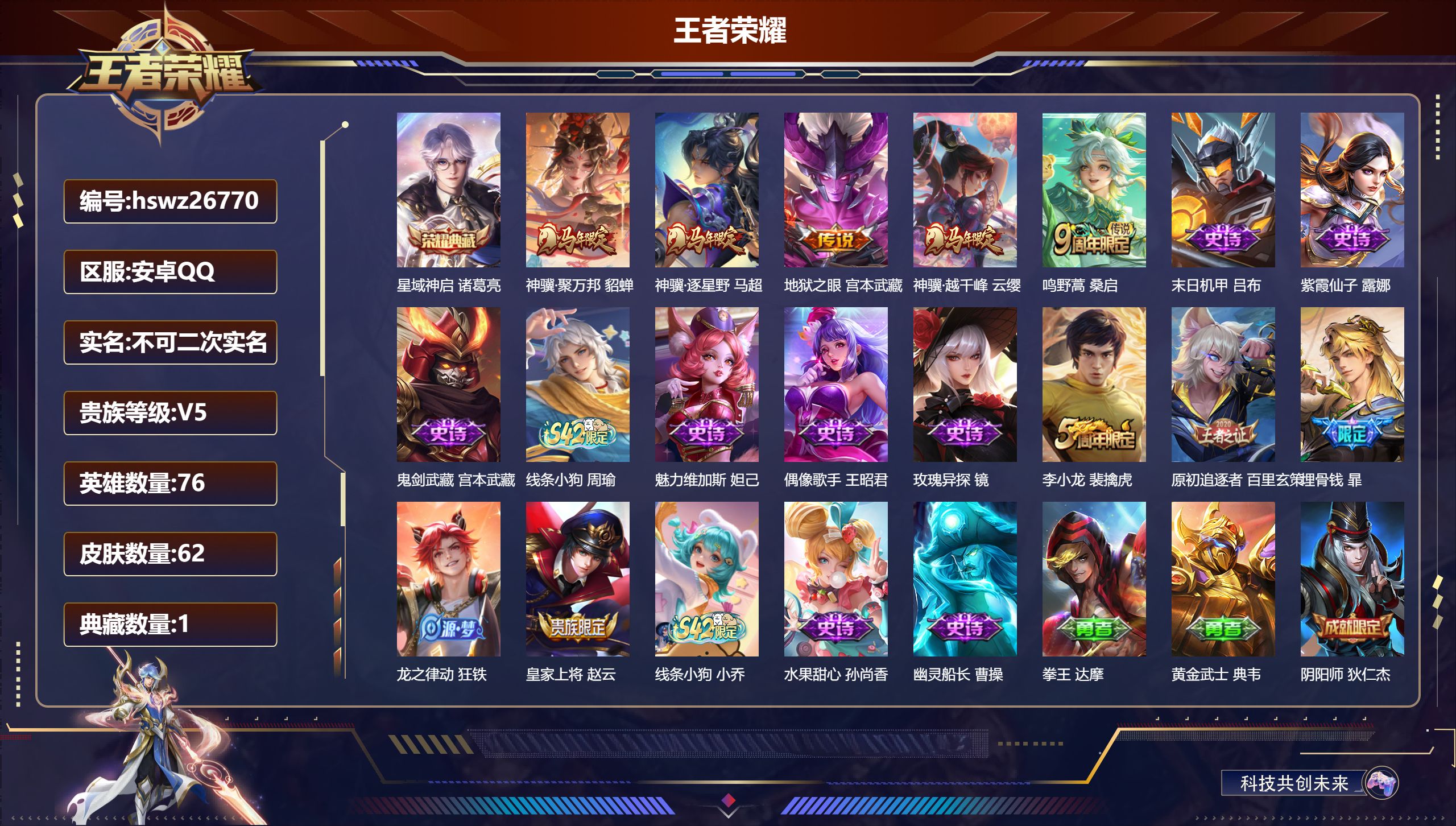 PX_2571766-Q/无双王者/62皮肤/76英雄/1典藏/0珍品无双/0无双/0珍品传说/5传说/15史诗/5稀有英雄 【1,典藏皮肤】星域神启,诸葛亮, 【5,传说皮肤】神骥·聚万邦,貂蝉,神骥·逐星野,马超,地狱之眼,宫本武藏,神骥·越千峰,云缨,鸣野蒿,桑启, 【15,史诗皮肤】末日机甲,吕布,紫霞仙子,露娜,鬼剑武藏,宫本武藏,线条小狗,周瑜,魅力维加斯,妲己,偶像歌手,王昭君,玫瑰异探,镜,李小龙,裴擒虎,原初追逐者,百里玄策,埋骨钱,暃,龙之律动,狂铁,皇家上将,赵云,线条小狗,小乔,水果甜心,孙尚香,幽灵船长,曹操, 【25,勇者皮肤】拳王,达摩,黄金武士,典韦,阴阳师,狄仁杰,海滩派对,项羽,红桃皇后,芈月,西部游侠,莱西奥,哥特玫瑰,露娜,死亡骑士,亚瑟,掌控之力,诸葛亮,忍·炎影,赵云,逐霄之志,曹操,极光幻客,蚩奼,雾都夜雨,干将莫邪,兔女郎,花木兰,荣光之誓,亚瑟,万象初新,宫本武藏,命运加冕,露娜,幻想奇妙夜,王昭君,虚灵犬护,钟馗,天穹之誓,姜子牙,暗都幽影,大司命,鹤鸣心笺,艾琳,逆浪荇歌,甄姬,线条小狗,周瑜,噬灭天穹,东皇太一, 【17,其他皮肤】灼热之刃,李信,绯红之刃,露娜,冰刃幻境,镜,碧珀绯影,暃,英喵野望,刘禅,启蛰,司空震,剑舞者,花木兰,归虚梦演,蒙犽,激情绿茵,马可波罗,埃及法老,杨戬,尼罗河女神,女娲,归虚梦演,曜,威尼斯狂欢,百里玄策,幸存者,马超,孤猎,澜,赤焰之缨,云缨,露花倒影,嫦娥, 【5,稀有英雄】嬴政,不知火舞,娜可露露,韩信,艾琳, 营地ID:,