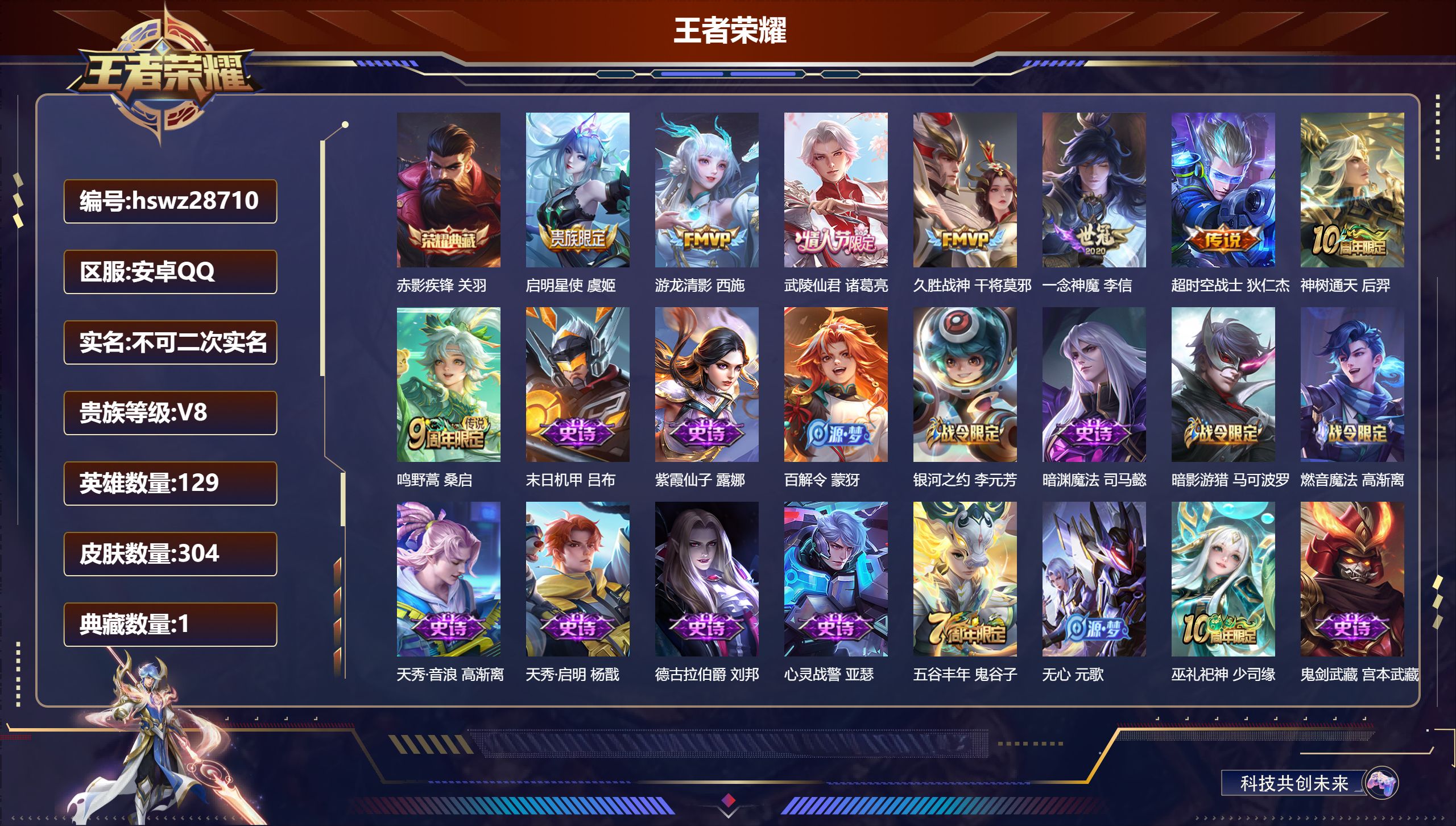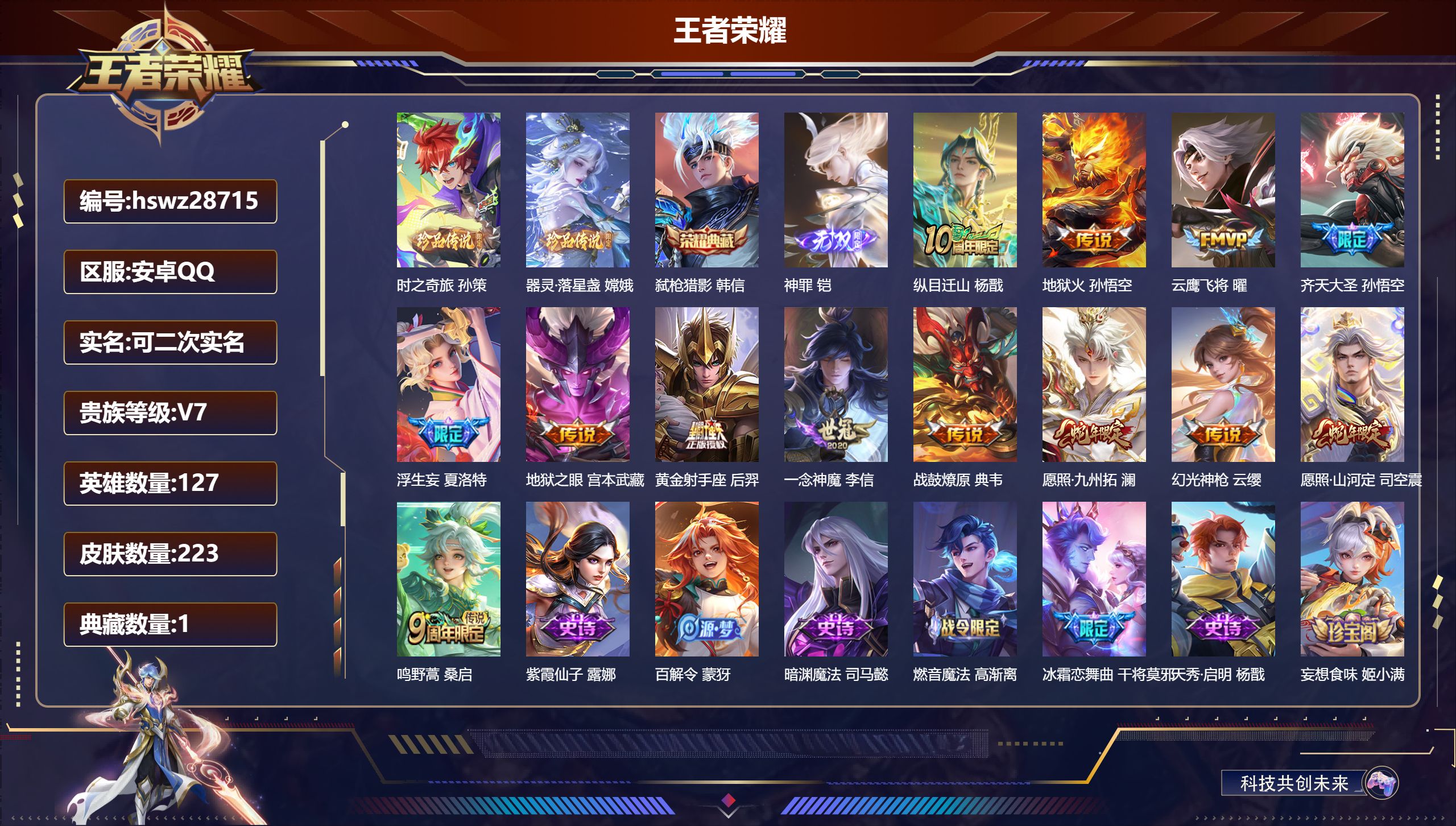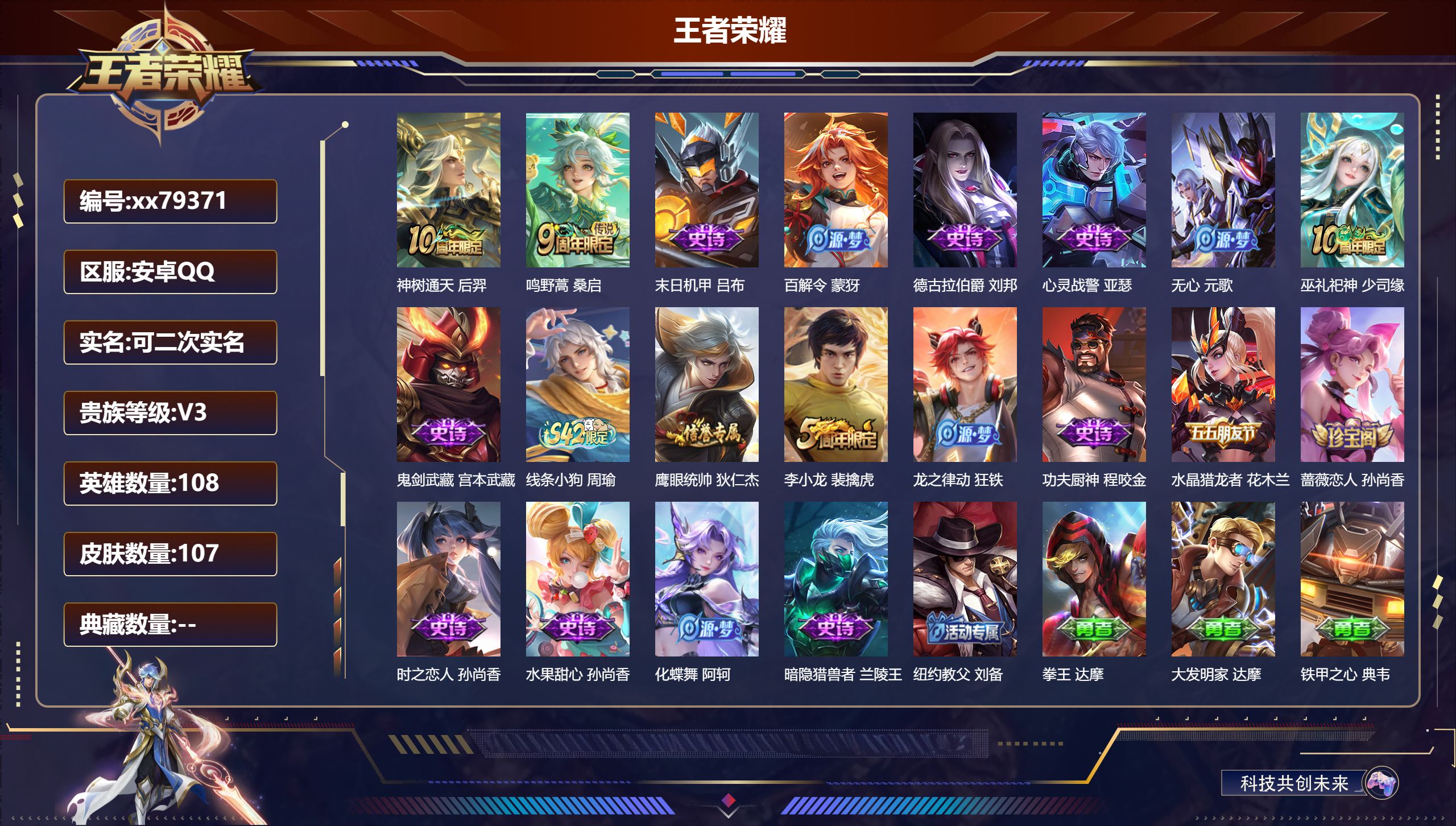 PX_2573306-,可二次,V3,贵族积分1659,安卓QQ/107皮肤/108英雄/0典藏/0珍品无双/0无双/0珍品传说/2传说/18史诗/6稀有英雄 【2,传说皮肤】,神树通天,后羿,鸣野蒿,桑启, 【18,史诗皮肤】,末日机甲,吕布,百解令,蒙犽,德古拉伯爵,刘邦,心灵战警,亚瑟,无心,元歌,巫礼祀神,少司缘,鬼剑武藏,宫本武藏,线条小狗,周瑜,鹰眼统帅,狄仁杰,李小龙,裴擒虎,龙之律动,狂铁,功夫厨神,程咬金,水晶猎龙者,花木兰,蔷薇恋人,孙尚香,时之恋人,孙尚香,水果甜心,孙尚香,化蝶舞,阿轲,暗隐猎兽者,兰陵王, 【67,勇者皮肤】,纽约教父,刘备,拳王,达摩,大发明家,达摩,铁甲之心,典韦,海盐诗旅,桑启,汉昭烈帝,刘备,黄金武士,典韦,阴阳师,狄仁杰,径山谋武,孙权,次元突破,哪吒,古海寻踪,张良,戏梦巡演,空空儿,完美运算,后羿,克喵,鬼谷子,踏浪烽翎,莱西奥,野性能量,吕布,守护之力,大乔,潮玩探月行,猪八戒,天穹祈灯,鬼谷子,阿尔法小队,后羿,五福同心,张飞,金色潮汐,朵莉亚,星际陆战队,程咬金,潮玩牛仔,马可波罗,死亡骑士,亚瑟,浪漫序章,刘备,掌控之力,诸葛亮,落日弦歌,高渐离,忍·炎影,赵云,雪境奇遇,西施,万事如意,刘备,乓乓大师,鲁班大师,逐霄之志,曹操,溯影追猎,虞姬,探海日志,鲁班大师,兔女郎,花木兰,龙腾万里,关羽,未来纪元,宫本武藏,罗小黑战记,哪吒,荣光之誓,亚瑟,万象初新,宫本武藏,教廷特使,韩信,街头霸王,韩信,西部大镖客,孙悟空,重装意志,盘古,少女阿狸,妲己,春野闲踪,苏烈,布丁狗之约,阿古朵,命运加冕,露娜,小满鸭,姬小满,灵野札记,张良,潮玩士官长,雅典娜,命运角斗场,狂铁,死霸装,白起,特工战影,狂铁,虚灵犬护,钟馗,白执事,赵云,剑破天穹,刘邦,苍林狼骑,苍,星梦巡礼,姜子牙,谧流熔炉,太乙真人,鹤鸣心笺,艾琳,锦麟游梦,庄周,逆浪荇歌,甄姬,线条小狗,周瑜,噬灭天穹,东皇太一,玫蓝誓约,戈娅, 【22,其他皮肤】,龙域领主,铠,第七人偶,干将莫邪,万圣前夜,小乔,灼热之刃,李信,木偶奇遇记,鲁班七号,精灵王,后羿,绯红之刃,露娜,冰刃幻境,镜,海军大将,周瑜,东海龙王,东皇太一,范海辛,李白,归虚梦演,蒙犽,尼罗河女神,女娲,锦衣卫,狄仁杰,一千零一夜,张良,归虚梦演,曜,幸存者,马超,创世神祝,盘古,绝影神枪,百里守约,孤猎,澜,秩序猎龙将,蒙恬,西部大镖客,孙悟空, 【6,稀有英雄】,不知火舞,橘右京,夏洛特,娜可露露,韩信,赵云, 营地ID:,