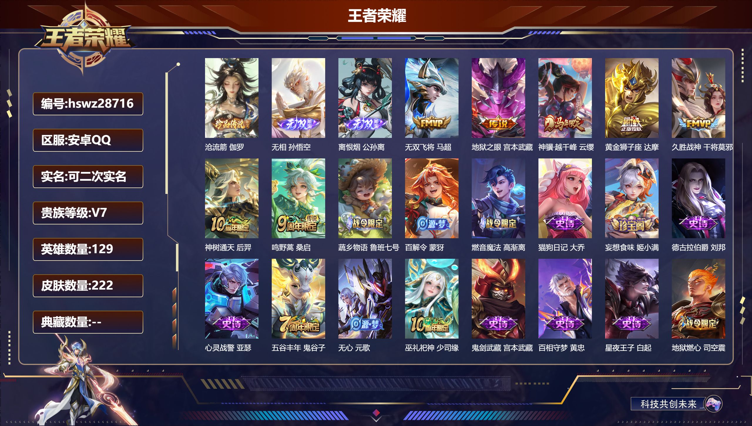 PX_2568311-Q/至尊星耀/222皮肤/129英雄/0典藏/0珍品无双/2无双/1珍品传说/7传说/64史诗/9稀有英雄 【1,珍品传说】沧流箭,伽罗, 【2,无双皮肤】无相,孙悟空,离恨烟,公孙离, 【7,传说皮肤】无双飞将,马超,地狱之眼,宫本武藏,神骥·越千峰,云缨,黄金狮子座,达摩,久胜战神,干将莫邪,神树通天,后羿,鸣野蒿,桑启, 【64,史诗皮肤】蔬乡物语,鲁班七号,百解令,蒙犽,燃音魔法,高渐离,猫狗日记,大乔,妄想食味,姬小满,德古拉伯爵,刘邦,心灵战警,亚瑟,五谷丰年,鬼谷子,无心,元歌,巫礼祀神,少司缘,鬼剑武藏,宫本武藏,百相守梦,黄忠,星夜王子,白起,地狱燃心,司空震,线条小狗,周瑜,遇见飞天,杨玉环,摇滚巨星,嬴政,顽趣,梦奇,魅力维加斯,妲己,黄金分割率,诸葛亮,偶像歌手,王昭君,荣光圣徽,蒙恬,女仆咖啡,妲己,九幽镇关,项羽,舞动绿茵,蔡文姬,鹰眼统帅,狄仁杰,李小龙,裴擒虎,光弋星穹,莱西奥,纤云弄巧,云中君,金属风暴,墨子,特工魅影,百里守约,猫狗日记,孙策,原初追逐者,百里玄策,逐浪之夏,李元芳,未来纪元,赵云,黎明之约,雅典娜,鸭鸭历险记,刘禅,魔术师,狄仁杰,皇家上将,赵云,冰冠公主,雅典娜,至尊宝,孙悟空,功夫厨神,程咬金,天才门将,刘禅,圣诞恋歌,貂蝉,水晶猎龙者,花木兰,涂山容容,公孙离,星界战将,牛魔,蔷薇恋人,孙尚香,冰雪圆舞曲,甄姬,青蛇,小乔,千年之狐,李白,节奏热浪,阿轲,织梦人,西施,曙光守护者,铠,万灵启世,女娲,心灵骇客,安琪拉,百相守梦,周瑜,琥珀纪元,伽罗,水果甜心,孙尚香,狂想玩偶喵,蒙犽,江河有灵,阿古朵,幽灵船长,曹操,乘风破浪,夏侯惇,暗隐猎兽者,兰陵王, 【112,勇者皮肤】时空谍影,海诺,圆桌骑士,盾山,爱心护理,阿轲,沙漠行僧,达摩,大漠名商,沈梦溪,缤纷绘卷,张良,纽约教父,刘备,拳王,达摩,大发明家,达摩,龙舞盛年,沈梦溪,功夫炙烤,廉颇,沉稳之力,孙尚香,海盐诗旅,桑启,幻泉雾影,海月,朔风刀,夏侯惇,醍醐杖,老夫子,归虚梦演,孙膑,汉昭烈帝,刘备,黄金武士,典韦,王牌新星,海月,阴阳师,狄仁杰,径山谋武,孙权,次元突破,哪吒,古海寻踪,张良,功夫老勺,老夫子,鲨炮海盗猫,沈梦溪,海滩派对,项羽,万华元夜,狄仁杰,无尽征程,廉颇,克喵,鬼谷子,踏浪烽翎,莱西奥,演武夺筹,程咬金,红桃皇后,芈月,野性能量,吕布,哥特玫瑰,露娜,守护之力,大乔,无双福将,程咬金,瓷语鉴心,露娜,原初探秘者,鬼谷子,潮玩探月行,猪八戒,天穹祈灯,鬼谷子,疑决卦,明世隐,化身博士,扁鹊,阿尔法小队,后羿,五福同心,张飞,星际陆战队,程咬金,幻乐之宴,鬼谷子,霸王丸,宫本武藏,虹云星官,明世隐,雾影缉谜,兰陵王,赤刃凌霄,敖隐,死亡骑士,亚瑟,危途狂花,戈娅,掌控之力,诸葛亮,海滩丽影,钟无艳,忍·炎影,赵云,炽热元素使,姜子牙,坚韧之力,苏烈,谜偶窥秘,鬼谷子,擒涛扼浪,裴擒虎,乓乓大师,鲁班大师,死亡摇滚,高渐离,溯影追猎,虞姬,极光幻客,蚩奼,探海日志,鲁班大师,女武神,艾琳,天使之翼,孙膑,兔女郎,花木兰,龙腾万里,关羽,流音漫舞,艾琳,金庭之子,兰陵王,罗小黑战记,哪吒,千军破阵,苏烈,往忆晖光,明世隐,零食大作战,姬小满,荣光之誓,亚瑟,花好人间,甄姬,万象初新,宫本武藏,聚星闪耀,钟无艳,御銮,盾山,单词大作战,雅典娜,时尚教父,姜子牙,秘密基地,刘禅,教廷特使,韩信,街头霸王,韩信,云中旅人,李元芳,灵卜魔法,妲己,混沌棋,弈星,蔚蓝守将,蒙恬,春野闲踪,苏烈,布丁狗之约,阿古朵,命运加冕,露娜,灵野札记,张良,驱傩正仪,钟馗,鸭鸭历险记,沈梦溪,命运角斗场,狂铁,特工战影,狂铁,虚灵犬护,钟馗,班班快跑,鲁班七号,漠中幻影,嫦娥,白执事,赵云,华丽摇滚,太乙真人,剑破天穹,刘邦,苍林狼骑,苍,天穹之誓,姜子牙,星梦巡礼,姜子牙,夏日便利店,虞姬,鹤鸣心笺,艾琳,锦麟游梦,庄周,逆浪荇歌,甄姬,百相守梦,孙策,线条小狗,周瑜, 【38,其他皮肤】沧流箭,伽罗,伊势巫女,大乔,芝加哥教父,黄忠,龙域领主,铠,花见巫女,伽罗,第七人偶,干将莫邪,冰刃幻境,镜,碧珀绯影,暃,魇语军师,司马懿,午夜歌剧院,元歌,启蛰,司空震,隐刃,兰陵王,霓裳曲,杨玉环,花间舞,公孙离,街头旋风,裴擒虎,修竹墨客,上官婉儿,剑舞者,花木兰,维京掠夺者,苍,激情绿茵,马可波罗,埃及法老,杨戬,归虚梦演,西施,阿摩司公爵,鬼谷子,年年有余,猪八戒,尼罗河女神,女娲,锦衣卫,狄仁杰,威尼斯狂欢,百里玄策,幸存者,马超,战争女神,雅典娜,创世神祝,盘古,特种部队,李元芳,绝影神枪,百里守约,孤猎,澜,加勒比小姐,虞姬,精准探案法,米莱狄,赤焰之缨,云缨,地府判官,钟馗,美梦成真,梦奇,天启骑士,关羽, 【9,稀有英雄】敖隐,嬴政,不知火舞,橘右京,夏洛特,娜可露露,韩信,艾琳,赵云, 营地ID:,