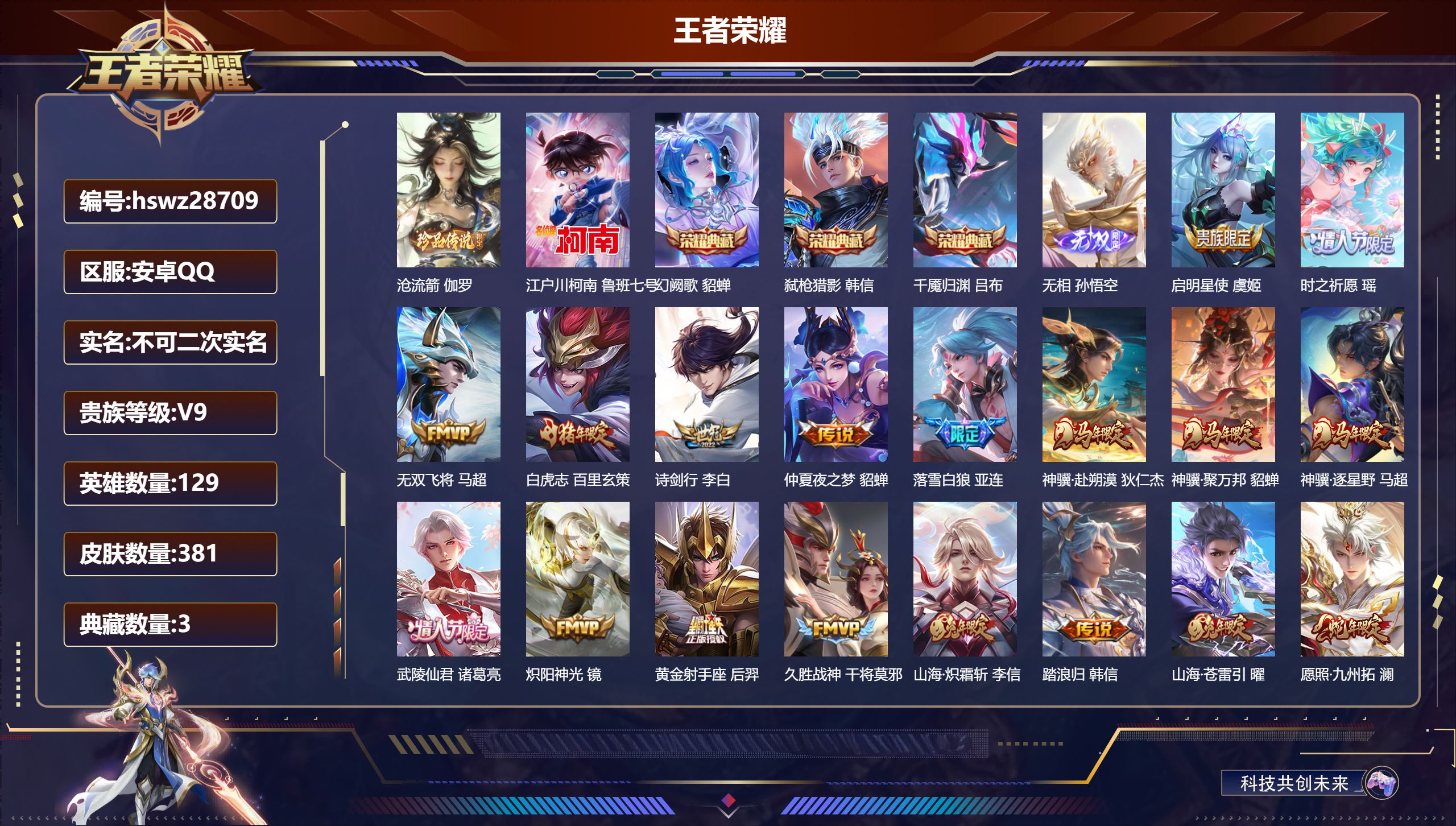 PX_2568265-Q/至尊星耀/381皮肤/129英雄/3典藏/0珍品无双/1无双/2珍品传说/26传说/111史诗/9稀有英雄 【2,珍品传说】沧流箭,伽罗,江户川柯南,鲁班七号, 【3,典藏皮肤】幻阙歌,貂蝉,弑枪猎影,韩信,千魇归渊,吕布, 【1,无双皮肤】无相,孙悟空, 【26,传说皮肤】启明星使,虞姬,时之祈愿,瑶,无双飞将,马超,白虎志,百里玄策,诗剑行,李白,仲夏夜之梦,貂蝉,落雪白狼,亚连,神骥·赴朔漠,狄仁杰,神骥·聚万邦,貂蝉,神骥·逐星野,马超,武陵仙君,诸葛亮,炽阳神光,镜,黄金射手座,后羿,久胜战神,干将莫邪,山海·炽霜斩,李信,踏浪归,韩信,山海·苍雷引,曜,愿照·九州拓,澜,愿照·众生和,妲己,神树通天,后羿,幻光神枪,云缨,愿照·山河定,司空震,祥瑞亨通,裴擒虎,愿照·岁时盈,虞姬,曦玄引,貂蝉,鸣野蒿,桑启, 【111,史诗皮肤】时之奇旅,安琪拉,电玩小子,鲁班七号,末日机甲,吕布,白昼王子,嬴政,紫霞仙子,露娜,银河之约,李元芳,暗渊魔法,司马懿,暗影游猎,马可波罗,燃音魔法,高渐离,冰霜恋舞曲,干将莫邪,苍穹之光,项羽,天秀·启明,杨戬,狮舞东方,鲁班七号,猫狗日记,大乔,德古拉伯爵,刘邦,山海·玄木吟,马可波罗,心灵战警,亚瑟,星君·亢金,达摩,五谷丰年,鬼谷子,无心,元歌,鬼剑武藏,宫本武藏,百相守梦,黄忠,迷踪丽影,阿轲,星夜王子,白起,守夜人,弈星,无限星赏官,公孙离,线条小狗,周瑜,百晓客,明世隐,顽趣,梦奇,冰锋战神,关羽,修罗,橘右京,魅力维加斯,妲己,黄金分割率,诸葛亮,偶像歌手,王昭君,荣光圣徽,蒙恬,女仆咖啡,妲己,逐梦之音,貂蝉,赏金猎手,澜,九幽镇关,项羽,星界游侠,暃,晚萤,娜可露露,舞动绿茵,蔡文姬,繁星吟游,蔡文姬,鹰眼统帅,狄仁杰,李小龙,裴擒虎,光弋星穹,莱西奥,纤云弄巧,云中君,驯魔猎人,兰陵王,龙骑士,墨子,金属风暴,墨子,逐梦之影,韩信,特工魅影,百里守约,猫狗日记,孙策,原初追逐者,百里玄策,逐浪之夏,李元芳,奇幻香踪,扁鹊,真我赫兹,百里守约,未来纪元,赵云,藏狐·褐绒,老夫子,时之彼端,妲己,黎明之约,雅典娜,魔术师,狄仁杰,龙之律动,狂铁,唤灵魅影,貂蝉,神威,马超,皇家上将,赵云,冰冠公主,雅典娜,至尊宝,孙悟空,辉光之辰,后羿,功夫厨神,程咬金,梁祝,上官婉儿,电玩·爆裂旋风,刘禅,天才门将,刘禅,圣诞恋歌,貂蝉,水晶猎龙者,花木兰,山海·碧波行,瑶,心动手记,海诺,怒海争锋,黄忠,圣诞狂欢,吕布,器灵·浮梦炉,赵怀真,天狼绘梦者,上官婉儿,浮光幕影,芈月,夏日便利店,蔡文姬,星界战将,牛魔,地狱岩魂,廉颇,茶境仙,孙膑,蔷薇恋人,孙尚香,冰雪圆舞曲,甄姬,月团寄思,沈梦溪,千年之狐,李白,节奏热浪,阿轲,暗夜猫娘,阿轲,织梦人,西施,曙光守护者,铠,瑞麟志,花木兰,心灵骇客,安琪拉,箭羽风息,伽罗,乱世虎臣,张飞,真我赫兹,镜,绅士熊喵,刘禅,缤纷独角兽,小乔,魔法小厨娘,安琪拉,线条小狗,小乔,蓝屏警告,典韦,天狼狩猎者,裴擒虎,水果甜心,孙尚香,化蝶舞,阿轲,江河有灵,阿古朵,幽灵船长,曹操,乘风破浪,夏侯惇,暗隐猎兽者,兰陵王, 【177,勇者皮肤】圆桌骑士,盾山,烛龙,曹操,爱心护理,阿轲,太极少年,赵怀真,沙漠行僧,达摩,大漠名商,沈梦溪,缤纷绘卷,张良,纽约教父,刘备,拳王,达摩,大发明家,达摩,龙舞盛年,沈梦溪,乐园追猎者,白起,丁香结,小乔,功夫炙烤,廉颇,铁甲之心,典韦,沉稳之力,孙尚香,海盐诗旅,桑启,幻泉雾影,海月,朔风刀,夏侯惇,醍醐杖,老夫子,朔望之晖,女娲,归虚梦演,孙膑,汉昭烈帝,刘备,热血海滩,哪吒,白色死神,白起,黑桃队长,鲁班七号,黄金武士,典韦,夺宝奇兵,刘邦,御旌,牛魔,阴阳师,狄仁杰,径山谋武,孙权,次元突破,哪吒,古海寻踪,张良,牛运亨通,牛魔,科学大爆炸,项羽,戏梦巡演,空空儿,功夫老勺,老夫子,西部大镖客,牛魔,鲨炮海盗猫,沈梦溪,虎啸剑宗,刘邦,海滩派对,项羽,完美运算,后羿,万华元夜,狄仁杰,克喵,鬼谷子,踏浪烽翎,莱西奥,演武夺筹,程咬金,红桃皇后,芈月,奇妙博物学,庄周,美猴王,孙悟空,猎兽之王,吕布,野性能量,吕布,哥特玫瑰,露娜,守护之力,大乔,无双福将,程咬金,百相守梦,影,原初探秘者,鬼谷子,星空之诺,沈梦溪,潮玩探月行,猪八戒,鸿运当头,亚瑟,天穹祈灯,鬼谷子,西部大镖客,猪八戒,疑决卦,明世隐,如懿,安琪拉,化身博士,扁鹊,阿尔法小队,后羿,五福同心,张飞,金色潮汐,朵莉亚,次元傲视,杨戬,星际陆战队,程咬金,幻乐之宴,鬼谷子,霸王丸,宫本武藏,虹云星官,明世隐,雾影缉谜,兰陵王,舞狮寰,吕布,救世之瞳,扁鹊,赤刃凌霄,敖隐,潮玩骑兵,杨戬,赤莲之焰,周瑜,死亡骑士,亚瑟,浪漫序章,刘备,敏锐之力,李白,危途狂花,戈娅,胡桃狂想曲,蒙犽,幽兰居士,张良,玩偶对对碰,安琪拉,掌控之力,诸葛亮,海滩丽影,钟无艳,忍·炎影,赵云,狰,白起,雪境奇遇,西施,重明,芈月,炽热元素使,姜子牙,坚韧之力,苏烈,唤灵魔甲,刘禅,万事如意,刘备,逐霄战戟,吕布,谜偶窥秘,鬼谷子,擒涛扼浪,裴擒虎,苍云破阵,蒙恬,糖果风暴,安琪拉,乓乓大师,鲁班大师,死亡摇滚,高渐离,溯影追猎,虞姬,极光幻客,蚩奼,探海日志,鲁班大师,女武神,艾琳,天使之翼,孙膑,雾都夜雨,干将莫邪,玩趣恶龙,高渐离,兔女郎,花木兰,龙腾万里,关羽,金庭之子,兰陵王,未来纪元,宫本武藏,千军破阵,苏烈,往忆晖光,明世隐,零食大作战,姬小满,荣光之誓,亚瑟,花好人间,甄姬,万象初新,宫本武藏,聚星闪耀,钟无艳,潮玩造梦师,刘备,御銮,盾山,时尚教父,姜子牙,春野之旅,钟无艳,秘密基地,刘禅,穷奇,典韦,教廷特使,