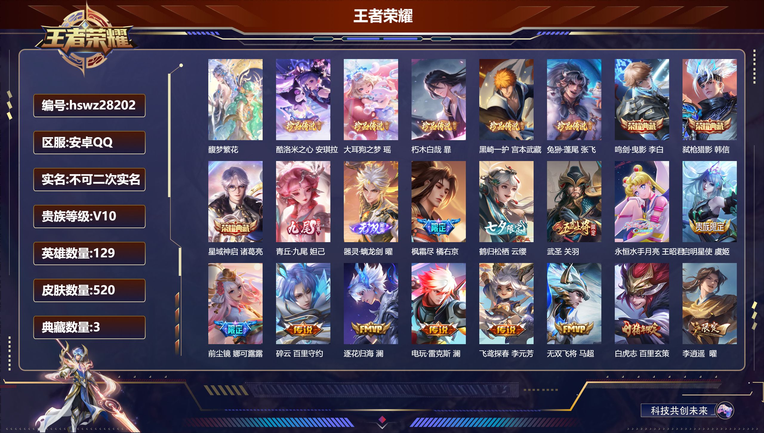 PX_2556292-Q/至尊星耀/162皮肤/128英雄/0典藏/0珍品无双/3无双/2珍品传说/17传说/53史诗/8稀有英雄 【2,珍品传说】沧流箭,伽罗,器灵·落星盏,嫦娥, 【3,无双皮肤】无相,孙悟空,离恨烟,公孙离,器灵·螭龙剑,曜, 【17,传说皮肤】逐花归海,澜,李逍遥,,曜,云鹰飞将,曜,记忆之芯,公孙离,星君·娄金,李元芳,地狱之眼,宫本武藏,神骥·越千峰,云缨,炽阳神光,镜,黄金射手座,后羿,乘龙·问璇玑,孙尚香,末日机甲,孙尚香,画中仙,干将莫邪,踏浪归,韩信,绛天战甲,铠,山海·苍雷引,曜,祥瑞亨通,裴擒虎,鸣野蒿,桑启, 【53,史诗皮肤】紫霞仙子,露娜,奇遇舞章,艾琳,天秀·音浪,高渐离,妄想食味,姬小满,山海·玄木吟,马可波罗,心灵战警,亚瑟,星君·亢金,达摩,五谷丰年,鬼谷子,诗语江南,西施,星夜王子,白起,寅虎·心曲,杨玉环,线条小狗,周瑜,百晓客,明世隐,魅力维加斯,妲己,偶像歌手,王昭君,白蛇,大乔,九幽镇关,项羽,舞动绿茵,蔡文姬,鹰眼统帅,狄仁杰,末日机甲,莱西奥,如梦令,后羿,金属风暴,墨子,特工魅影,百里守约,逐浪之夏,李元芳,黎明之约,雅典娜,魔术师,狄仁杰,埋骨钱,暃,龙之律动,狂铁,皇家上将,赵云,冰冠公主,雅典娜,功夫厨神,程咬金,东方月初,大司命,天才门将,刘禅,圣诞恋歌,貂蝉,水晶猎龙者,花木兰,破空之剑,亚连,心动手记,海诺,魅语,不知火舞,器灵·浮梦炉,赵怀真,夏日便利店,蔡文姬,星界战将,牛魔,地狱岩魂,廉颇,冰雪圆舞曲,甄姬,节奏热浪,阿轲,心灵骇客,安琪拉,夜都魔契,曹操,琥珀纪元,伽罗,谪仙醉月,李白,线条小狗,小乔,炽弈燎原,弈星,水果甜心,孙尚香,幽灵船长,曹操,暗隐猎兽者,兰陵王, 【64,勇者皮肤】时空谍影,海诺,爱心护理,阿轲,太极少年,赵怀真,沙漠行僧,达摩,缤纷绘卷,张良,丁香结,小乔,功夫炙烤,廉颇,沉稳之力,孙尚香,海盐诗旅,桑启,汉昭烈帝,刘备,黄金武士,典韦,阴阳师,狄仁杰,径山谋武,孙权,次元突破,哪吒,古海寻踪,张良,功夫老勺,老夫子,鲨炮海盗猫,沈梦溪,海滩派对,项羽,万华元夜,狄仁杰,演武夺筹,程咬金,西部游侠,莱西奥,哥特玫瑰,露娜,百相守梦,影,潮玩探月行,猪八戒,天穹祈灯,鬼谷子,五福同心,张飞,雾影缉谜,兰陵王,舞狮寰,吕布,赤刃凌霄,敖隐,死亡骑士,亚瑟,浪漫序章,刘备,危途狂花,戈娅,玩偶对对碰,安琪拉,炽热元素使,姜子牙,唤灵魔甲,刘禅,擒涛扼浪,裴擒虎,乓乓大师,鲁班大师,极光幻客,蚩奼,探海日志,鲁班大师,女武神,艾琳,兔女郎,花木兰,未来纪元,宫本武藏,千军破阵,苏烈,荣光之誓,亚瑟,花好人间,甄姬,万象初新,宫本武藏,教廷特使,韩信,街头霸王,韩信,云中旅人,李元芳,春野闲踪,苏烈,幻想奇妙夜,王昭君,驱傩正仪,钟馗,命运角斗场,狂铁,特工战影,狂铁,虚灵犬护,钟馗,神迹守卫,孙悟空,剑破天穹,刘邦,天穹之誓,姜子牙,星梦巡礼,姜子牙,谧流熔炉,太乙真人,夏日便利店,虞姬,线条小狗,周瑜,噬灭天穹,东皇太一,敬我三分,盘古, 【26,其他皮肤】沧流箭,伽罗,伊势巫女,大乔,前尘,金蝉,超能战警,曹操,花见巫女,伽罗,灼热之刃,李信,海之征途,孙策,精灵王,后羿,碧珀绯影,暃,魇语军师,司马懿,午夜歌剧院,元歌,启蛰,司空震,花间舞,公孙离,剑舞者,花木兰,范海辛,李白,维京掠夺者,苍,激情绿茵,马可波罗,归虚梦演,西施,尼罗河女神,女娲,归虚梦演,曜,孤猎,澜,加勒比小姐,虞姬,踏雪寻梅,弈星,秩序猎龙将,蒙恬,赤焰之缨,云缨,器灵·落星盏,嫦娥, 【8,稀有英雄】敖隐,不知火舞,橘右京,夏洛特,娜可露露,韩信,艾琳,赵云, 营地ID:,