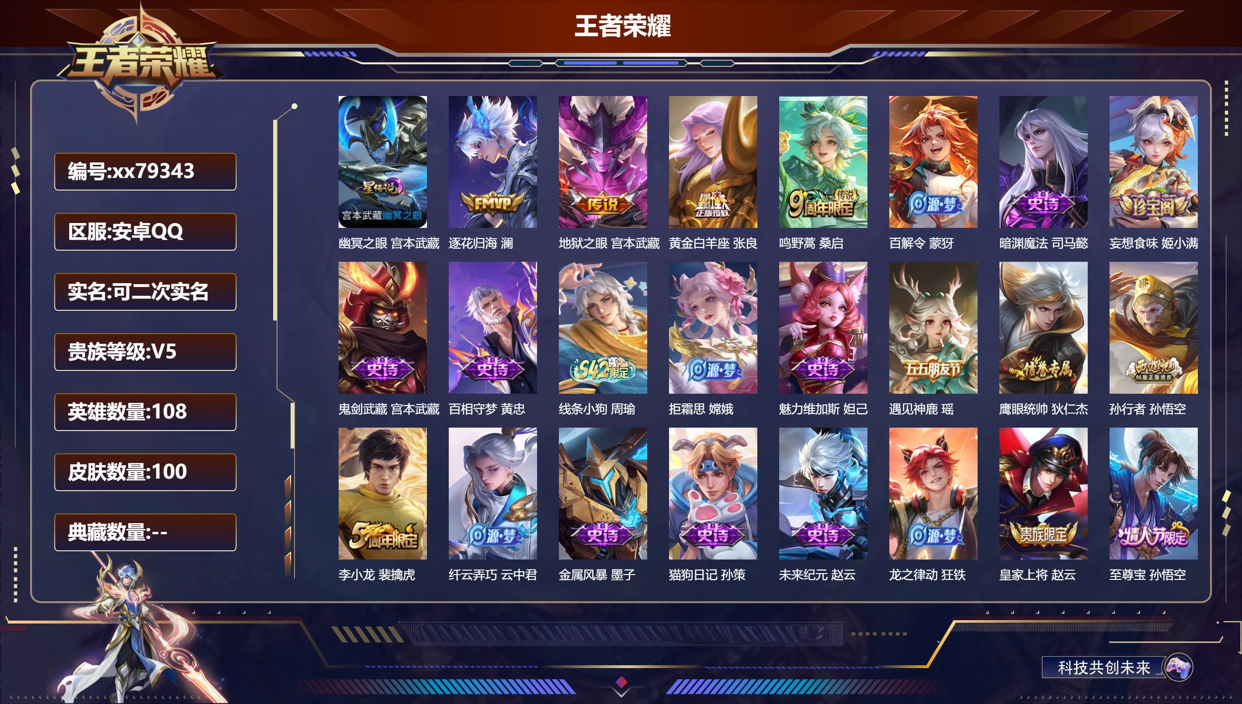 PX_2573056-,可二次,V5,贵族积分9338,安卓QQ/100皮肤/108英雄/0典藏/0珍品无双/0无双/0珍品传说/4传说/27史诗/6稀有英雄 【1,星传说皮肤】,幽冥之眼,宫本武藏, 【4,传说皮肤】,逐花归海,澜,地狱之眼,宫本武藏,黄金白羊座,张良,鸣野蒿,桑启, 【27,史诗皮肤】,百解令,蒙犽,暗渊魔法,司马懿,妄想食味,姬小满,鬼剑武藏,宫本武藏,百相守梦,黄忠,线条小狗,周瑜,拒霜思,嫦娥,魅力维加斯,妲己,遇见神鹿,瑶,鹰眼统帅,狄仁杰,孙行者,孙悟空,李小龙,裴擒虎,纤云弄巧,云中君,金属风暴,墨子,猫狗日记,孙策,未来纪元,赵云,龙之律动,狂铁,皇家上将,赵云,至尊宝,孙悟空,功夫厨神,程咬金,圣诞狂欢,吕布,青焰无极,镜,冰雪圆舞曲,甄姬,节奏热浪,阿轲,曙光守护者,铠,水果甜心,孙尚香,幽灵船长,曹操, 【58,勇者皮肤】,时空谍影,海诺,暖冬絮语,程咬金,纽约教父,刘备,龙舞盛年,沈梦溪,丁香结,小乔,铁甲之心,典韦,白色死神,白起,黄金武士,典韦,阴阳师,狄仁杰,古海寻踪,张良,功夫老勺,老夫子,海滩派对,项羽,完美运算,后羿,克喵,鬼谷子,踏浪烽翎,莱西奥,鸿运当头,亚瑟,天穹祈灯,鬼谷子,无尽旅途,扁鹊,五福同心,张飞,金色潮汐,朵莉亚,星际陆战队,程咬金,死亡骑士,亚瑟,敏锐之力,李白,玩偶对对碰,安琪拉,忍·炎影,赵云,炽热元素使,姜子牙,坚韧之力,苏烈,唤灵魔甲,刘禅,乓乓大师,鲁班大师,逐霄之志,曹操,兔女郎,花木兰,罗小黑战记,哪吒,荣光之誓,亚瑟,春野之旅,钟无艳,秘密基地,刘禅,教廷特使,韩信,妄想特派,李元芳,西部大镖客,孙悟空,重装意志,盘古,少女阿狸,妲己,蔚蓝守将,蒙恬,死霸装,白起,漠中幻影,嫦娥,白执事,赵云,剑破天穹,刘邦,异域游侠,刘备,苍威无极,项羽,熔金海岸,周瑜,天穹之誓,姜子牙,谧流熔炉,太乙真人,群星魔术团,程咬金,经纬探寻者,盘古,暗都幽影,大司命,鹤鸣心笺,艾琳,锦麟游梦,庄周,逆浪荇歌,甄姬,线条小狗,周瑜,噬灭天穹,东皇太一, 【13,其他皮肤】,战争骑士,夏侯惇,潮流仙人,老夫子,棒球奇才,沈梦溪,龙域领主,铠,花见巫女,伽罗,灼热之刃,李信,英喵野望,刘禅,午夜歌剧院,元歌,启蛰,司空震,修竹墨客,上官婉儿,激情绿茵,马可波罗,荷鲁斯之眼,云中君,西部大镖客,孙悟空, 【6,稀有英雄】,不知火舞,橘右京,夏洛特,娜可露露,韩信,赵云, 营地ID:,