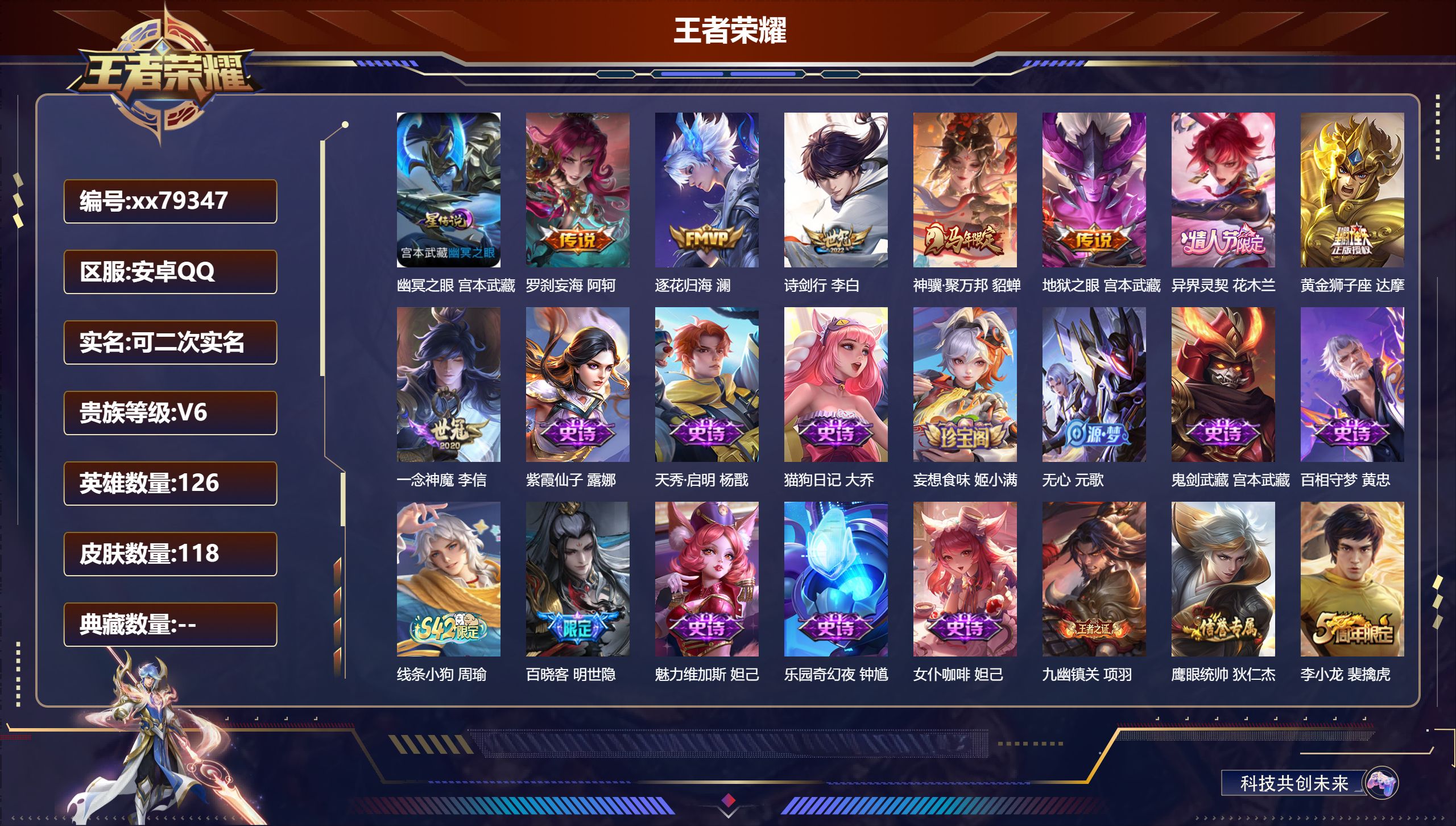 PX_2573063-,可二次,V6,贵族积分16981,安卓QQ/118皮肤/126英雄/0典藏/0珍品无双/0无双/0珍品传说/8传说/41史诗/7稀有英雄,历史(省标阿珂) 【1,星传说皮肤】,幽冥之眼,宫本武藏, 【8,传说皮肤】,罗刹妄海,阿轲,逐花归海,澜,诗剑行,李白,神骥·聚万邦,貂蝉,地狱之眼,宫本武藏,异界灵契,花木兰,黄金狮子座,达摩,一念神魔,李信, 【41,史诗皮肤】,紫霞仙子,露娜,天秀·启明,杨戬,猫狗日记,大乔,妄想食味,姬小满,无心,元歌,鬼剑武藏,宫本武藏,百相守梦,黄忠,线条小狗,周瑜,百晓客,明世隐,魅力维加斯,妲己,乐园奇幻夜,钟馗,女仆咖啡,妲己,九幽镇关,项羽,鹰眼统帅,狄仁杰,李小龙,裴擒虎,光弋星穹,莱西奥,春霖将至,上官婉儿,特工魅影,百里守约,原初追逐者,百里玄策,逐浪之夏,李元芳,未来纪元,赵云,鸭鸭历险记,刘禅,魔术师,狄仁杰,龙之律动,狂铁,皇家上将,赵云,功夫厨神,程咬金,水晶猎龙者,花木兰,圣诞狂欢,吕布,青焰无极,镜,茶境仙,孙膑,节奏热浪,阿轲,暗夜猫娘,阿轲,曙光守护者,铠,心灵骇客,安琪拉,百相守梦,周瑜,天穹守望者,后羿,线条小狗,小乔,水果甜心,孙尚香,化蝶舞,阿轲,幽灵船长,曹操,暗隐猎兽者,兰陵王, 【55,勇者皮肤】,时空谍影,海诺,太极少年,赵怀真,拳王,达摩,铁甲之心,典韦,阴阳师,狄仁杰,径山谋武,孙权,海滩派对,项羽,克喵,鬼谷子,踏浪烽翎,莱西奥,野性能量,吕布,守护之力,大乔,百相守梦,影,潮玩牛仔,马可波罗,死亡骑士,亚瑟,浪漫序章,刘备,敏锐之力,李白,掌控之力,诸葛亮,忍·炎影,赵云,雪境奇遇,西施,坚韧之力,苏烈,万事如意,刘备,溯影追猎,虞姬,兔女郎,花木兰,未来纪元,宫本武藏,罗小黑战记,哪吒,往忆晖光,明世隐,荣光之誓,亚瑟,教廷特使,韩信,西部大镖客,孙悟空,少女阿狸,妲己,春野闲踪,苏烈,布丁狗之约,阿古朵,命运加冕,露娜,小满鸭,姬小满,幻想奇妙夜,王昭君,灵野札记,张良,鸭鸭历险记,沈梦溪,死霸装,白起,虚灵犬护,钟馗,班班快跑,鲁班七号,苍威无极,项羽,铁骨偃魂,典韦,苍林狼骑,苍,魅影绮裳,影,访茗客,马超,谧流熔炉,太乙真人,暗都幽影,大司命,鹤鸣心笺,艾琳,锦麟游梦,庄周,逆浪荇歌,甄姬,百相守梦,孙策,海之女神,海月,线条小狗,周瑜,玫蓝誓约,戈娅,景韶洛都,明世隐, 【16,其他皮肤】,伊势巫女,大乔,龙域领主,铠,灼热之刃,李信,精灵王,后羿,午夜歌剧院,元歌,启蛰,司空震,隐刃,兰陵王,修竹墨客,上官婉儿,埃及法老,杨戬,归虚梦演,曜,创世神祝,盘古,绝影神枪,百里守约,孤猎,澜,加勒比小姐,虞姬,天启骑士,关羽,西部大镖客,孙悟空, 【7,稀有英雄】,不知火舞,橘右京,夏洛特,娜可露露,韩信,艾琳,赵云, 营地ID:,