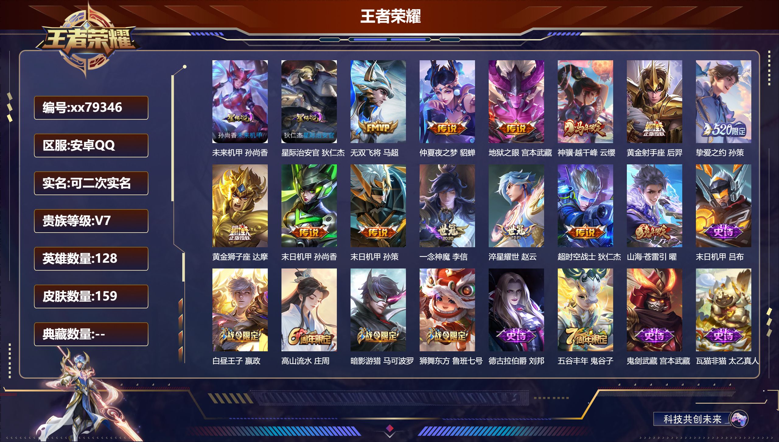 PX_2573059-,可二次,V7,贵族积分34467,安卓QQ/159皮肤/128英雄/0典藏/0珍品无双/0无双/0珍品传说/13传说/33史诗/8稀有英雄 【2,星传说皮肤】,未来机甲,孙尚香,星际治安官,狄仁杰, 【13,传说皮肤】,无双飞将,马超,仲夏夜之梦,貂蝉,地狱之眼,宫本武藏,神骥·越千峰,云缨,黄金射手座,后羿,挚爱之约,孙策,黄金狮子座,达摩,末日机甲,孙尚香,末日机甲,孙策,一念神魔,李信,淬星耀世,赵云,超时空战士,狄仁杰,山海·苍雷引,曜, 【33,史诗皮肤】,末日机甲,吕布,白昼王子,嬴政,高山流水,庄周,暗影游猎,马可波罗,狮舞东方,鲁班七号,德古拉伯爵,刘邦,五谷丰年,鬼谷子,鬼剑武藏,宫本武藏,瓦猫非猫,太乙真人,线条小狗,周瑜,百晓客,明世隐,修罗,橘右京,魅力维加斯,妲己,鹰眼统帅,狄仁杰,李小龙,裴擒虎,龙骑士,墨子,优雅恋人,嬴政,魔术师,狄仁杰,皇家上将,赵云,功夫厨神,程咬金,梁祝,上官婉儿,云间偶戏,元歌,水晶猎龙者,花木兰,一生所爱,露娜,圣诞狂欢,吕布,火炮绅士,黄忠,航海奇遇记,老夫子,千年之狐,李白,心灵骇客,安琪拉,乱世虎臣,张飞,水果甜心,孙尚香,幽灵船长,曹操,乘风破浪,夏侯惇, 【68,勇者皮肤】,沙漠行僧,达摩,大漠名商,沈梦溪,缤纷绘卷,张良,纽约教父,刘备,大发明家,达摩,丁香结,小乔,功夫炙烤,廉颇,沉稳之力,孙尚香,幻夜卜梦,芈月,海盐诗旅,桑启,幻泉雾影,海月,朔风刀,夏侯惇,醍醐杖,老夫子,朔望之晖,女娲,归虚梦演,孙膑,黄金武士,典韦,夺宝奇兵,刘邦,御旌,牛魔,阴阳师,狄仁杰,次元突破,哪吒,功夫老勺,老夫子,鲨炮海盗猫,沈梦溪,海滩派对,项羽,万华元夜,狄仁杰,演武夺筹,程咬金,猎兽之王,吕布,原初探秘者,鬼谷子,潮玩探月行,猪八戒,天穹祈灯,鬼谷子,疑决卦,明世隐,化身博士,扁鹊,潮玩骑士王,亚瑟,五福同心,张飞,幻乐之宴,鬼谷子,霸王丸,宫本武藏,虹云星官,明世隐,死亡骑士,亚瑟,掌控之力,诸葛亮,海滩丽影,钟无艳,狰,白起,坚韧之力,苏烈,万事如意,刘备,擒涛扼浪,裴擒虎,乓乓大师,鲁班大师,探海日志,鲁班大师,龙腾万里,关羽,金庭之子,兰陵王,千军破阵,苏烈,万象初新,宫本武藏,御銮,盾山,单词大作战,雅典娜,秘密基地,刘禅,教廷特使,韩信,云中旅人,李元芳,神迹守卫,墨子,少女阿狸,妲己,混沌棋,弈星,御霄,米莱狄,蔚蓝守将,蒙恬,驱傩正仪,钟馗,神迹守卫,钟馗,命运角斗场,狂铁,特工战影,狂铁,饕餮,太乙真人,劲辣红锅,太乙真人,剑破天穹,刘邦,线条小狗,周瑜,线条小狗,桑启, 【46,其他皮肤】,金属狂潮,高渐离,战争骑士,夏侯惇,圣殿之光,刘邦,芝加哥教父,黄忠,潮流仙人,老夫子,三太子,哪吒,龙域领主,铠,超能战警,曹操,第七人偶,干将莫邪,万圣前夜,小乔,灼热之刃,李信,熊喵少女,阿古朵,海之征途,孙策,福禄兄弟,鲁班七号,帝国元帅,项羽,冰刃幻境,镜,碧珀绯影,暃,星航指挥官,诸葛亮,魇语军师,司马懿,英喵野望,刘禅,午夜歌剧院,元歌,启蛰,司空震,隐刃,兰陵王,街头旋风,裴擒虎,东海龙王,东皇太一,剑舞者,花木兰,范海辛,李白,维京掠夺者,苍,占星师,明世隐,归虚梦演,蒙犽,激情绿茵,马可波罗,阿摩司公爵,鬼谷子,年年有余,猪八戒,尼罗河女神,女娲,锦衣卫,狄仁杰,归虚梦演,曜,威尼斯狂欢,百里玄策,战争女神,雅典娜,荷鲁斯之眼,云中君,创世神祝,盘古,绝影神枪,百里守约,加勒比小姐,虞姬,精准探案法,米莱狄,精灵公主,王昭君,地府判官,钟馗,天启骑士,关羽, 【8,稀有英雄】,敖隐,不知火舞,橘右京,夏洛特,娜可露露,韩信,艾琳,赵云, 营地ID:,