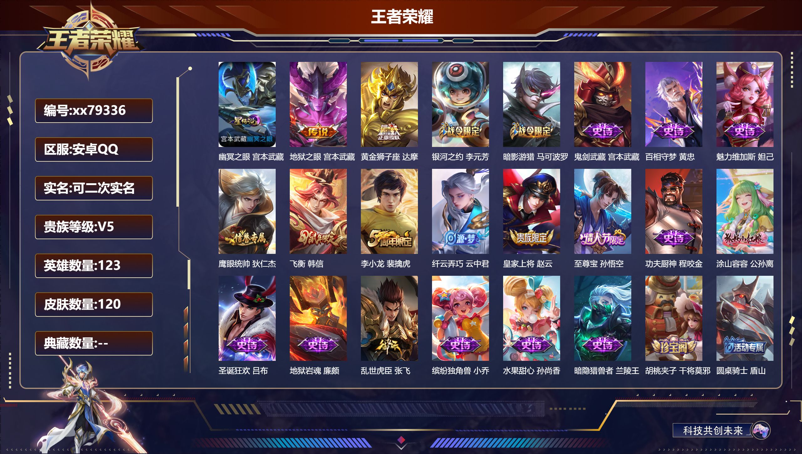 PX_2573044-,可二次,V5,贵族积分8677,安卓QQ/120皮肤/123英雄/0典藏/0珍品无双/0无双/0珍品传说/2传说/19史诗/7稀有英雄 【1,星传说皮肤】,幽冥之眼,宫本武藏, 【2,传说皮肤】,地狱之眼,宫本武藏,黄金狮子座,达摩, 【19,史诗皮肤】,银河之约,李元芳,暗影游猎,马可波罗,鬼剑武藏,宫本武藏,百相守梦,黄忠,魅力维加斯,妲己,鹰眼统帅,狄仁杰,飞衡,韩信,李小龙,裴擒虎,纤云弄巧,云中君,皇家上将,赵云,至尊宝,孙悟空,功夫厨神,程咬金,涂山容容,公孙离,圣诞狂欢,吕布,地狱岩魂,廉颇,乱世虎臣,张飞,缤纷独角兽,小乔,水果甜心,孙尚香,暗隐猎兽者,兰陵王, 【69,勇者皮肤】,胡桃夹子,干将莫邪,圆桌骑士,盾山,烛龙,曹操,缤纷绘卷,张良,纽约教父,刘备,拳王,达摩,丁香结,小乔,沉稳之力,孙尚香,醍醐杖,老夫子,归虚梦演,孙膑,黑桃队长,鲁班七号,黄金武士,典韦,御旌,牛魔,阴阳师,狄仁杰,炼金王,扁鹊,次元突破,哪吒,功夫老勺,老夫子,海滩派对,项羽,万华元夜,狄仁杰,演武夺筹,程咬金,奇妙博物学,庄周,野性能量,吕布,哥特玫瑰,露娜,守护之力,大乔,无双福将,程咬金,瓷语鉴心,露娜,原初探秘者,鬼谷子,星空之诺,沈梦溪,西部大镖客,猪八戒,疑决卦,明世隐,化身博士,扁鹊,次元傲视,杨戬,幻乐之宴,鬼谷子,霸王丸,宫本武藏,虹云星官,明世隐,救世之瞳,扁鹊,死亡骑士,亚瑟,敏锐之力,李白,玩偶对对碰,安琪拉,海滩丽影,钟无艳,忍·炎影,赵云,狰,白起,重明,芈月,炽热元素使,姜子牙,坚韧之力,苏烈,万事如意,刘备,乓乓大师,鲁班大师,天使之翼,孙膑,兔女郎,花木兰,龙腾万里,关羽,罗小黑战记,哪吒,花好人间,甄姬,御銮,盾山,时尚教父,姜子牙,秘密基地,刘禅,穷奇,典韦,教廷特使,韩信,西部大镖客,孙悟空,凯尔特女王,虞姬,少女阿狸,妲己,混沌棋,弈星,命运加冕,露娜,驱傩正仪,钟馗,虚灵犬护,钟馗,白执事,赵云,饕餮,太乙真人,星梦巡礼,姜子牙,鹤鸣心笺,艾琳,逆浪荇歌,甄姬, 【31,其他皮肤】,伊势巫女,大乔,战争骑士,夏侯惇,极冰防御线,盾山,龙域领主,铠,生化警戒,钟无艳,超能战警,曹操,第七人偶,干将莫邪,海之征途,孙策,火炮千金,孙尚香,福禄兄弟,鲁班七号,帝国元帅,项羽,精灵王,后羿,海军大将,周瑜,午夜歌剧院,元歌,隐刃,兰陵王,花间舞,公孙离,街头旋风,裴擒虎,范海辛,李白,激情绿茵,马可波罗,埃及法老,杨戬,天堂福音,张良,尼罗河女神,女娲,华尔街大亨,程咬金,威尼斯狂欢,百里玄策,幸存者,马超,特种部队,李元芳,绝影神枪,百里守约,仙境爱丽丝,妲己,精灵公主,王昭君,美梦成真,梦奇,西部大镖客,孙悟空, 【7,稀有英雄】,不知火舞,橘右京,夏洛特,娜可露露,韩信,艾琳,赵云, 营地ID:,