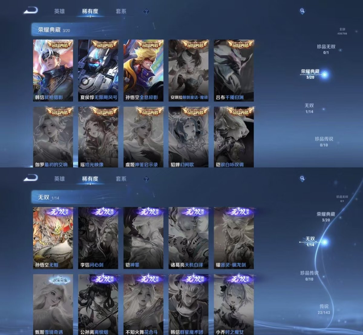 PX_2573010-【精品号手慢无】v7,273皮,1典藏武则天,1珍品传说,6传说皮。打野35段、对抗34段;9400分金标孙悟空。黑崎一护、炽阳神光、琥珀纪元马超、至尊宝、愿照·九州拓等多款热门皮肤,2按键2签名1星传说。5152星币,内有改名卡