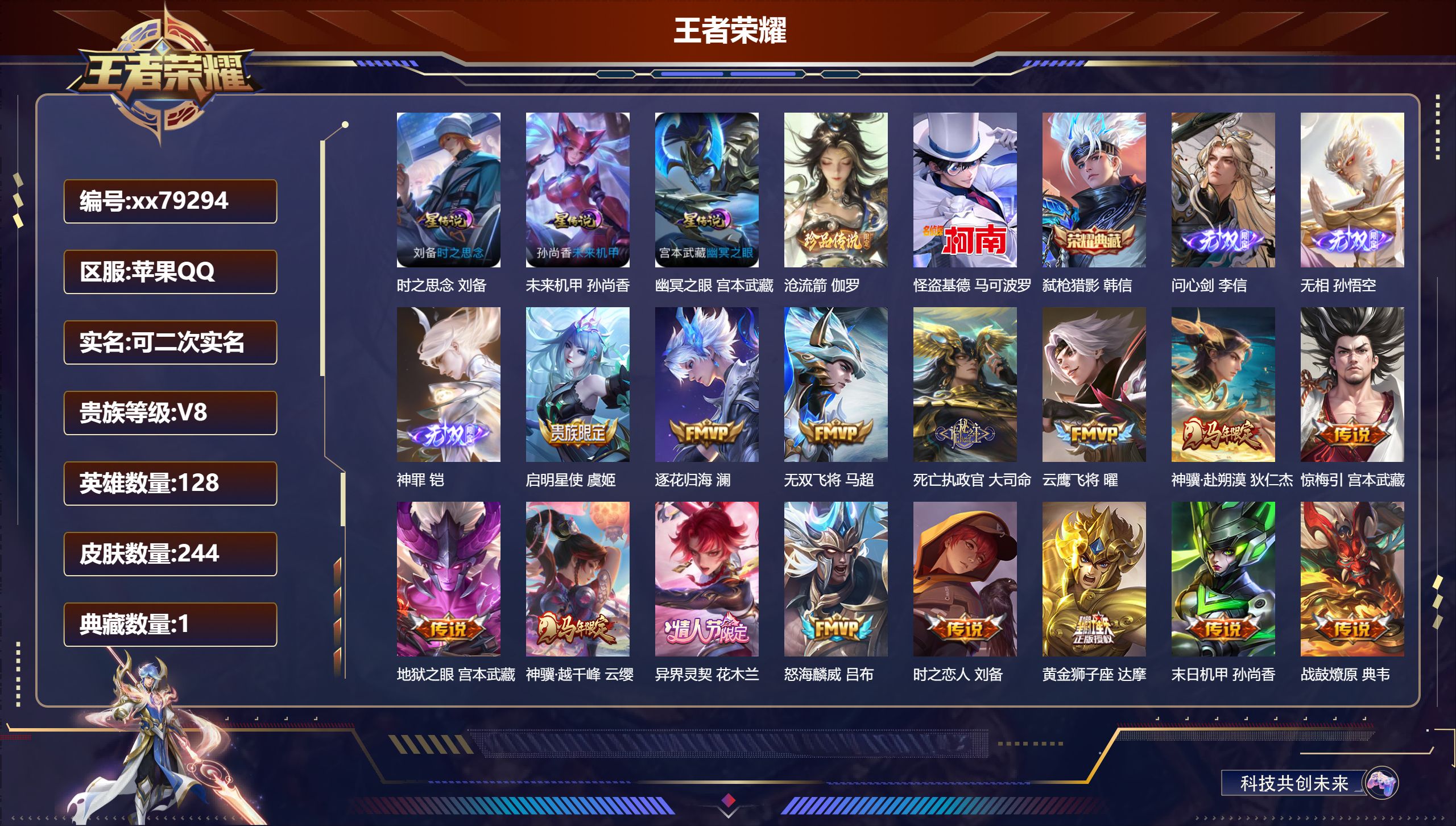 PX_2572412-,可二次,V8,贵族积分62137,苹果QQ/244皮肤/128英雄/1典藏/0珍品无双/3无双/2珍品传说/20传说/69史诗/8稀有英雄,历史(省标刘备,) 【3,星传说皮肤】,时之思念,刘备,未来机甲,孙尚香,幽冥之眼,宫本武藏, 【2,珍品传说】,沧流箭,伽罗,怪盗基德,马可波罗, 【1,典藏皮肤】,弑枪猎影,韩信, 【3,无双皮肤】,问心剑,李信,无相,孙悟空,神罪,铠, 【20,传说皮肤】,启明星使,虞姬,逐花归海,澜,无双飞将,马超,死亡执政官,大司命,云鹰飞将,曜,神骥·赴朔漠,狄仁杰,惊梅引,宫本武藏,地狱之眼,宫本武藏,神骥·越千峰,云缨,异界灵契,花木兰,怒海麟威,吕布,时之恋人,刘备,黄金狮子座,达摩,末日机甲,孙尚香,战鼓燎原,典韦,踏浪归,韩信,冠军飞将,花木兰,千山共赴,干将莫邪,玄雷天君,嬴政,幻光神枪,云缨, 【69,史诗皮肤】,末日机甲,吕布,紫霞仙子,露娜,百解令,蒙犽,高山流水,庄周,冰霜恋舞曲,干将莫邪,天秀·启明,杨戬,巫礼祀神,少司缘,鬼剑武藏,宫本武藏,星夜王子,白起,无限星赏官,公孙离,地狱燃心,司空震,线条小狗,周瑜,百晓客,明世隐,撼世英歌,盘古,摇滚巨星,嬴政,修罗,橘右京,拒霜思,嫦娥,魅力维加斯,妲己,黄金分割率,诸葛亮,偶像歌手,王昭君,女仆咖啡,妲己,九幽镇关,项羽,暗夜贵公子,嬴政,鹰眼统帅,狄仁杰,大圣娶亲,孙悟空,李小龙,裴擒虎,光弋星穹,莱西奥,金属风暴,墨子,傲雪梅枪,韩信,特工魅影,百里守约,猫狗日记,孙策,逐浪之夏,李元芳,未来纪元,赵云,优雅恋人,嬴政,魔术师,狄仁杰,热力回旋,百里玄策,埋骨钱,暃,龙之律动,狂铁,皇家上将,赵云,冰冠公主,雅典娜,至尊宝,孙悟空,功夫厨神,程咬金,圣诞恋歌,貂蝉,水晶猎龙者,花木兰,涂山容容,公孙离,圣诞狂欢,吕布,魅语,不知火舞,群星魔术团,上官婉儿,器灵·浮梦炉,赵怀真,星界战将,牛魔,茶境仙,孙膑,蔷薇恋人,孙尚香,冰雪圆舞曲,甄姬,雪上飞焰,哪吒,千年之狐,李白,节奏热浪,阿轲,暗夜猫娘,阿轲,曙光守护者,铠,万灵启世,女娲,乱世虎臣,张飞,百相守梦,周瑜,龙胆,赵云,绅士熊喵,刘禅,百相守梦,百里守约,线条小狗,小乔,水果甜心,孙尚香,幽灵船长,曹操,乘风破浪,夏侯惇,暗隐猎兽者,兰陵王, 【112,勇者皮肤】,时空谍影,海诺,太极少年,赵怀真,沙漠行僧,达摩,拳王,达摩,大发明家,达摩,乐园追猎者,白起,丁香结,小乔,功夫炙烤,廉颇,铁甲之心,典韦,海盐诗旅,桑启,幻泉雾影,海月,醍醐杖,老夫子,汉昭烈帝,刘备,白色死神,白起,黄金武士,典韦,王牌新星,海月,阴阳师,狄仁杰,径山谋武,孙权,古海寻踪,张良,牛运亨通,牛魔,科学大爆炸,项羽,功夫老勺,老夫子,鲨炮海盗猫,沈梦溪,海滩派对,项羽,万华元夜,狄仁杰,克喵,鬼谷子,踏浪烽翎,莱西奥,演武夺筹,程咬金,红桃皇后,芈月,野性能量,吕布,守护之力,大乔,无双福将,程咬金,瓷语鉴心,露娜,百相守梦,影,原初探秘者,鬼谷子,潮玩探月行,猪八戒,天穹祈灯,鬼谷子,决胜大满贯,曹操,疑决卦,明世隐,化身博士,扁鹊,阿尔法小队,后羿,霸王丸,宫本武藏,雾影缉谜,兰陵王,潮玩牛仔,马可波罗,舞狮寰,吕布,赤刃凌霄,敖隐,死亡骑士,亚瑟,敏锐之力,李白,破局者,亚连,玩偶对对碰,安琪拉,掌控之力,诸葛亮,海滩丽影,钟无艳,落日弦歌,高渐离,忍·炎影,赵云,雪境奇遇,西施,坚韧之力,苏烈,唤灵魔甲,刘禅,擒涛扼浪,裴擒虎,苍云破阵,蒙恬,糖果风暴,安琪拉,乓乓大师,鲁班大师,逐霄之志,曹操,溯影追猎,虞姬,极光幻客,蚩奼,探海日志,鲁班大师,天使之翼,孙膑,兔女郎,花木兰,龙腾万里,关羽,未来纪元,宫本武藏,罗小黑战记,哪吒,千军破阵,苏烈,往忆晖光,明世隐,零食大作战,姬小满,荣光之誓,亚瑟,花好人间,甄姬,万象初新,宫本武藏,聚星闪耀,钟无艳,秘密基地,刘禅,教廷特使,韩信,街头霸王,韩信,云中旅人,李元芳,西部大镖客,孙悟空,紫罗兰之誓,妲己,重装意志,盘古,少女阿狸,妲己,混沌棋,弈星,布丁狗之约,阿古朵,命运加冕,露娜,小满鸭,姬小满,幻想奇妙夜,王昭君,驱傩正仪,钟馗,虚灵犬护,钟馗,班班快跑,鲁班七号,罗小黑战记,张良,剑破天穹,刘邦,青衿临川,桑启,异域游侠,刘备,熔金海岸,周瑜,苍林狼骑,苍,魅影绮裳,影,访茗客,马超,星梦巡礼,姜子牙,谧流熔炉,太乙真人,暗都幽影,大司命,鹤鸣心笺,艾琳,逆浪荇歌,甄姬,百相守梦,孙策,执弈定局,雅典娜,海之女神,海月,线条小狗,周瑜,线条小狗,桑启,百相守梦,老夫子, 【41,其他皮肤】,沧流箭,伽罗,伊势巫女,大乔,战争骑士,夏侯惇,潮流仙人,老夫子,棒球奇才,沈梦溪,超能战警,曹操,花见巫女,伽罗,爱与和平,苏烈,未来旅行,孙膑,第七人偶,干将莫邪,灼热之刃,李信,木偶奇遇记,鲁班七号,帝国元帅,项羽,精灵王,后羿,碧珀绯影,暃,星航指挥官,诸葛亮,魇语军师,司马懿,英喵野望,刘禅,午夜歌剧院,元歌,隐刃,兰陵王,霓裳曲,杨玉环,异域舞娘,貂蝉,东海龙王,东皇太一,修竹墨客,上官婉儿,剑舞者,花木兰,范海辛,李白,维京掠夺者,苍,激情绿茵,马可波罗,幸存者,马超,创世神祝,盘古,特种部队,李元芳,绝影神枪,百里守约,森,瑶,孤猎,澜,精准探案法,米莱狄,精灵公主,王昭君,赤焰之缨,云缨,美梦成真,梦奇,天启骑士,关羽,怪盗基德,马可波罗,西部大镖客,孙悟空, 【8,稀有英雄】,嬴政,不知火舞,橘右京,夏洛特,娜可露露,韩信,艾琳,赵云, 营地ID:,