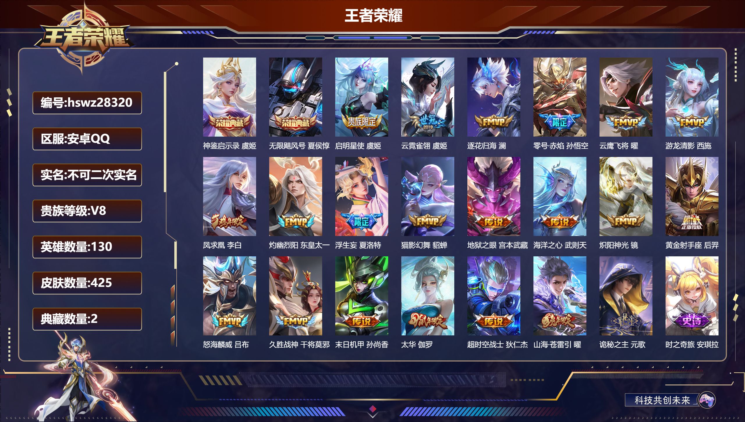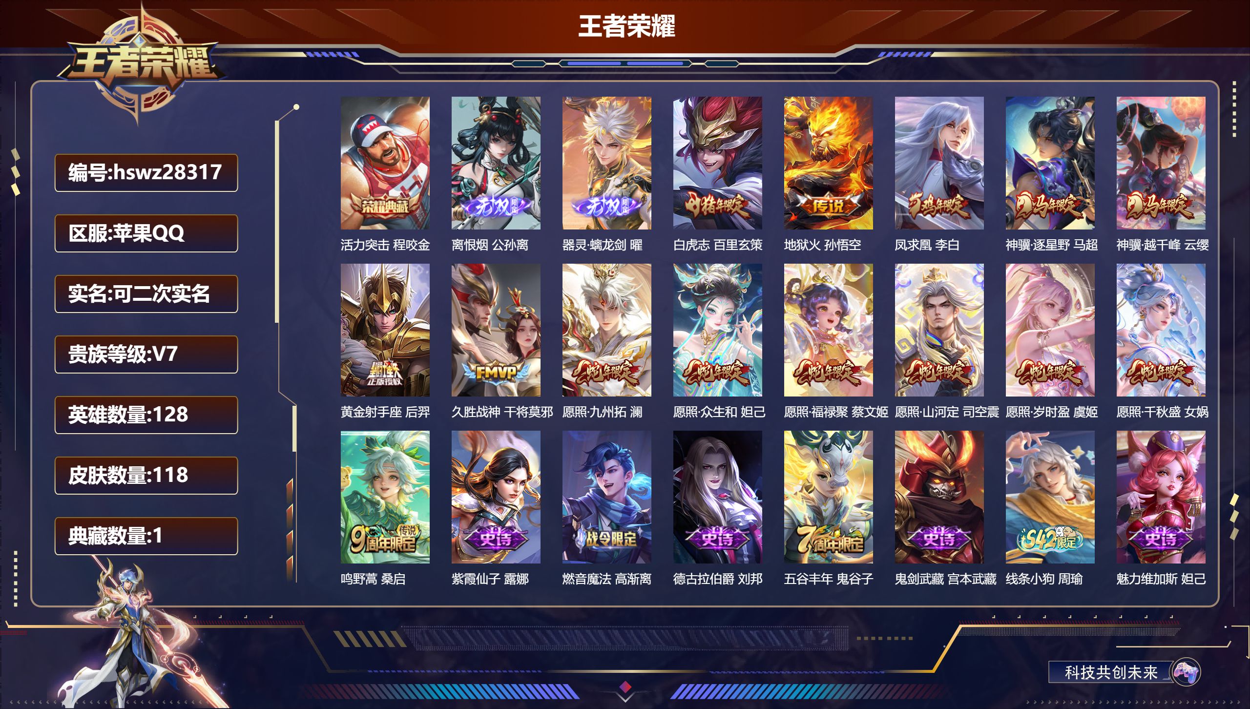 PX_2571382-Q-V9-最强王者段位-128英雄-338皮肤-4典藏皮肤-4无双-3珍品传说-44传说-100史诗 【英雄全皮】:孙权全皮,敖隐全皮,夏洛特全皮,空空儿全皮,影全皮 【荣耀典藏】:芈月大秦宣太后,李白鸣剑曳影,伽罗最初的交响,吕布千魇归渊 【无双皮肤】:孙悟空无相,铠神罪,诸葛亮天机白泽,曜器灵螭龙剑 【珍品传说】:伽罗沧流箭,宫本武藏黑崎一护,孙策时之奇旅 【传说皮肤】:云缨神骥越千峰,关羽神骥镇沧海,朵莉亚神骥鸣幻洲,狄仁杰神骥赴朔漠,貂蝉神骥聚万邦,马超神骥逐星野,花木兰异界灵契,杨戬纵目迁山,后羿神树通天,曹操万灵伏威,司马懿九山相柳,后羿千劫归真,司空震愿照山河定,女娲愿照千秋盛,妲己愿照众生和,澜愿照九州拓,蔡文姬愿照福禄聚,虞姬愿照岁时盈,云缨幻光神枪,裴擒虎祥瑞亨通,嬴政玄雷天君,夏侯惇霜北刀,马超琥珀纪元,夏洛特浮生妄,吕布怒海麟威,李白诗剑行,马可波罗深海之息,裴擒虎寅虎赤拳,李元芳飞鸢探春,铠绛天战甲,镜炽阳神光,虞姬启明星使,关羽武圣,曜云鹰飞将,李信一念神魔,刘备时之恋人,张良黄金白羊座,干将莫邪久胜战神,虞姬云霓雀翎,达摩黄金狮子座,杨戬永曜之星,孙尚香末日机甲,宫本武藏地狱之眼,狄仁杰超时空战士 【限定皮肤】:夏侯惇霜北刀,狄仁杰阴阳师,赵云皇家上将,赵云龙胆,墨子神迹守卫,嬴政优雅恋人,孙尚香蔷薇恋人,鲁班七号狮舞东方,钟无艳超时空战士,吕布御风骁将,周瑜赤莲之焰,元歌云间偶戏,元歌无心,夏侯惇朔风刀,甄姬落雪兰心,典韦穷奇,马可波罗暗影游猎,马可波罗深海之息,狄仁杰魔术师,狄仁杰万华元夜,达摩星际陆战队,达摩沙漠行僧,项羽海滩派对,老夫子圣诞老人,老夫子醍醐杖,老夫子航海奇遇记,关羽武圣,程咬金演武夺筹,韩信逐梦之影,韩信飞衡,韩信傲雪梅枪,兰陵王驯魔猎人,亚瑟潮玩骑士王,牛魔御旌,后羿辉光之辰,李元芳银河之约,李元芳云中旅人,虞姬启明星使,钟馗神迹守卫,钟馗驱傩正仪,杨戬永曜之星,杨戬潮玩骑兵,干将莫邪冰霜恋舞曲,雅典娜单词大作战,雅典娜黎明之约,太乙真人华丽摇滚,鬼谷子原初探秘者,鬼谷子五谷丰年,苏烈千军破阵,百里守约朱雀志,弈星混沌棋,沈梦溪星空之诺,明世隐疑决卦,裴擒虎李小龙,裴擒虎寅虎赤拳,狂铁御狮,米莱狄御霄,米莱狄胡桃异想国,云中君纤云弄巧,盾山御銮,猪八戒西部大镖客,上官婉儿梁祝,蒙犽狂想玩偶喵,鲁班大师探海