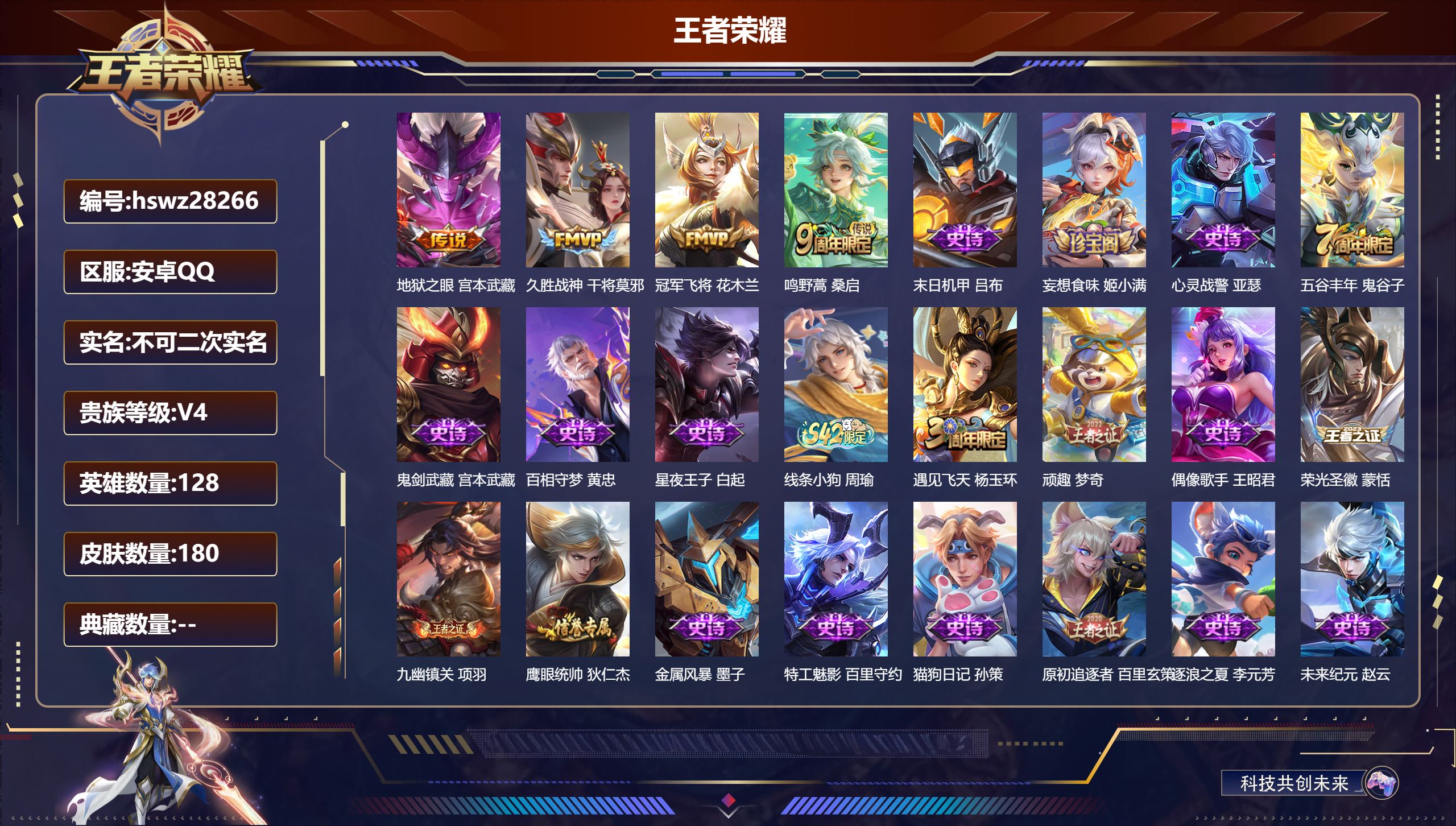 PX_2557974-Q/至尊星耀/180皮肤/128英雄/0典藏/0珍品无双/0无双/0珍品传说/4传说/47史诗/8稀有英雄 【4,传说皮肤】地狱之眼,宫本武藏,久胜战神,干将莫邪,冠军飞将,花木兰,鸣野蒿,桑启, 【47,史诗皮肤】末日机甲,吕布,妄想食味,姬小满,心灵战警,亚瑟,五谷丰年,鬼谷子,鬼剑武藏,宫本武藏,百相守梦,黄忠,星夜王子,白起,线条小狗,周瑜,遇见飞天,杨玉环,顽趣,梦奇,偶像歌手,王昭君,荣光圣徽,蒙恬,九幽镇关,项羽,鹰眼统帅,狄仁杰,金属风暴,墨子,特工魅影,百里守约,猫狗日记,孙策,原初追逐者,百里玄策,逐浪之夏,李元芳,未来纪元,赵云,灵蛊蚀心,扁鹊,黎明之约,雅典娜,埋骨钱,暃,龙之律动,狂铁,冰冠公主,雅典娜,功夫厨神,程咬金,电玩·爆裂旋风,刘禅,天才门将,刘禅,圣诞恋歌,貂蝉,水晶猎龙者,花木兰,涂山容容,公孙离,圣诞狂欢,吕布,魅语,不知火舞,群星魔术团,上官婉儿,星界战将,牛魔,地狱岩魂,廉颇,冰雪圆舞曲,甄姬,月团寄思,沈梦溪,节奏热浪,阿轲,曙光守护者,铠,万灵启世,女娲,百相守梦,周瑜,缤纷独角兽,小乔,水果甜心,孙尚香,江河有灵,阿古朵,幽灵船长,曹操,暗隐猎兽者,兰陵王, 【104,勇者皮肤】圆桌骑士,盾山,沙漠行僧,达摩,大漠名商,沈梦溪,缤纷绘卷,张良,纽约教父,刘备,大发明家,达摩,龙舞盛年,沈梦溪,乐园追猎者,白起,功夫炙烤,廉颇,沉稳之力,孙尚香,海盐诗旅,桑启,幻泉雾影,海月,归虚梦演,孙膑,汉昭烈帝,刘备,热血海滩,哪吒,白色死神,白起,黄金武士,典韦,阴阳师,狄仁杰,径山谋武,孙权,古海寻踪,张良,功夫老勺,老夫子,西部大镖客,牛魔,鲨炮海盗猫,沈梦溪,海滩派对,项羽,完美运算,后羿,克喵,鬼谷子,踏浪烽翎,莱西奥,西部游侠,莱西奥,哥特玫瑰,露娜,百相守梦,影,潮玩探月行,猪八戒,天穹祈灯,鬼谷子,化身博士,扁鹊,阿尔法小队,后羿,五福同心,张飞,幻乐之宴,鬼谷子,东方不败,武则天,虹云星官,明世隐,雾影缉谜,兰陵王,潮玩牛仔,马可波罗,救世之瞳,扁鹊,赤刃凌霄,敖隐,浪漫序章,刘备,危途狂花,戈娅,掌控之力,诸葛亮,海滩丽影,钟无艳,忍·炎影,赵云,雪境奇遇,西施,炽热元素使,姜子牙,坚韧之力,苏烈,万事如意,刘备,擒涛扼浪,裴擒虎,乓乓大师,鲁班大师,死亡摇滚,高渐离,溯影追猎,虞姬,极光幻客,蚩奼,探海日志,鲁班大师,女武神,艾琳,雾都夜雨,干将莫邪,兔女郎,花木兰,龙腾万里,关羽,金庭之子,兰陵王,罗小黑战记,哪吒,荣光之誓,亚瑟,聚星闪耀,钟无艳,时尚教父,姜子牙,春野之旅,钟无艳,教廷特使,韩信,街头霸王,韩信,云中旅人,李元芳,妄想特派,李元芳,西部大镖客,孙悟空,蔚蓝守将,蒙恬,春野闲踪,苏烈,布丁狗之约,阿古朵,命运加冕,露娜,小满鸭,姬小满,灵野札记,张良,命运角斗场,狂铁,死霸装,白起,特工战影,狂铁,虚灵犬护,钟馗,华丽摇滚,太乙真人,劲辣红锅,太乙真人,剑破天穹,刘邦,铁骨偃魂,典韦,熔金海岸,周瑜,苍林狼骑,苍,天穹之誓,姜子牙,魅影绮裳,影,星梦巡礼,姜子牙,谧流熔炉,太乙真人,群星魔术团,程咬金,鹤鸣心笺,艾琳,锦麟游梦,庄周,云械蓝图,云中君,逆浪荇歌,甄姬,百相守梦,孙策,海之女神,海月,线条小狗,周瑜,噬灭天穹,东皇太一,敬我三分,盘古,玫蓝誓约,戈娅,景韶洛都,明世隐, 【27,其他皮肤】前尘,金蝉,潮流仙人,老夫子,极冰防御线,盾山,花见巫女,伽罗,未来旅行,孙膑,第七人偶,干将莫邪,万圣前夜,小乔,帝国元帅,项羽,冰刃幻境,镜,碧珀绯影,暃,午夜歌剧院,元歌,启蛰,司空震,修竹墨客,上官婉儿,维京掠夺者,苍,激情绿茵,马可波罗,年年有余,猪八戒,尼罗河女神,女娲,锦衣卫,狄仁杰,归虚梦演,曜,幸存者,马超,战争女神,雅典娜,特种部队,李元芳,绝影神枪,百里守约,孤猎,澜,踏雪寻梅,弈星,赤焰之缨,云缨,西部大镖客,孙悟空, 【8,稀有英雄】敖隐,不知火舞,橘右京,夏洛特,娜可露露,韩信,艾琳,赵云, 营地ID:,