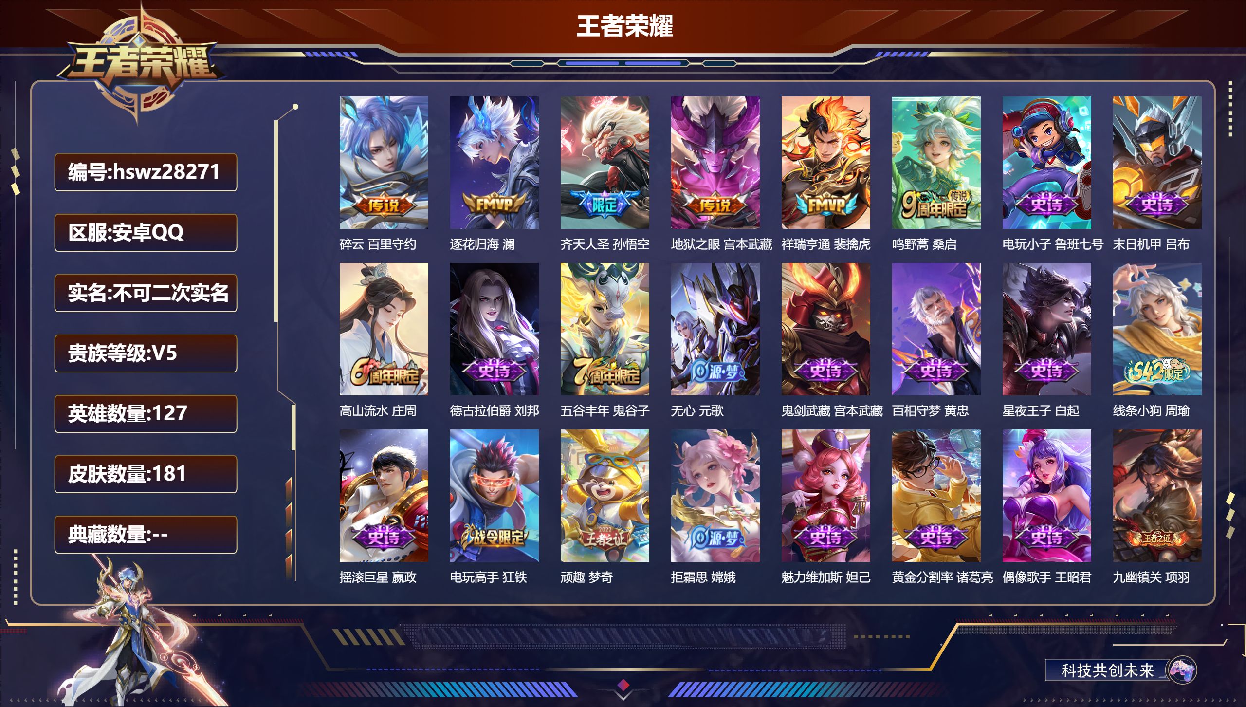 PX_2557991-Q/永恒钻石/181皮肤/127英雄/0典藏/0珍品无双/0无双/0珍品传说/6传说/44史诗/7稀有英雄 【6,传说皮肤】碎云,百里守约,逐花归海,澜,齐天大圣,孙悟空,地狱之眼,宫本武藏,祥瑞亨通,裴擒虎,鸣野蒿,桑启, 【44,史诗皮肤】电玩小子,鲁班七号,末日机甲,吕布,高山流水,庄周,德古拉伯爵,刘邦,五谷丰年,鬼谷子,无心,元歌,鬼剑武藏,宫本武藏,百相守梦,黄忠,星夜王子,白起,线条小狗,周瑜,摇滚巨星,嬴政,电玩高手,狂铁,顽趣,梦奇,拒霜思,嫦娥,魅力维加斯,妲己,黄金分割率,诸葛亮,偶像歌手,王昭君,九幽镇关,项羽,舞动绿茵,蔡文姬,暗夜贵公子,嬴政,鹰眼统帅,狄仁杰,孙行者,孙悟空,李小龙,裴擒虎,光弋星穹,莱西奥,金属风暴,墨子,特工魅影,百里守约,逐浪之夏,李元芳,未来纪元,赵云,龙之律动,狂铁,皇家上将,赵云,冰冠公主,雅典娜,功夫厨神,程咬金,圣诞恋歌,貂蝉,水晶猎龙者,花木兰,涂山容容,公孙离,魅语,不知火舞,蔷薇恋人,孙尚香,冰雪圆舞曲,甄姬,千年之狐,李白,超时空战士,钟无艳,乱世虎臣,张飞,时之恋人,孙尚香,水果甜心,孙尚香,幽灵船长,曹操, 【97,勇者皮肤】胡桃夹子,干将莫邪,太极少年,赵怀真,沙漠行僧,达摩,大漠名商,沈梦溪,纽约教父,刘备,大发明家,达摩,龙舞盛年,沈梦溪,丁香结,小乔,功夫炙烤,廉颇,沉稳之力,孙尚香,海盐诗旅,桑启,幻泉雾影,海月,白色死神,白起,黑桃队长,鲁班七号,落雪兰心,甄姬,阴阳师,狄仁杰,次元突破,哪吒,古海寻踪,张良,功夫老勺,老夫子,西部大镖客,牛魔,鲨炮海盗猫,沈梦溪,海滩派对,项羽,万华元夜,狄仁杰,克喵,鬼谷子,踏浪烽翎,莱西奥,演武夺筹,程咬金,红桃皇后,芈月,西部游侠,莱西奥,哥特玫瑰,露娜,无双福将,程咬金,百相守梦,影,潮玩探月行,猪八戒,天穹祈灯,鬼谷子,化身博士,扁鹊,阿尔法小队,后羿,幻乐之宴,鬼谷子,东方不败,武则天,虹云星官,明世隐,雾影缉谜,兰陵王,潮玩牛仔,马可波罗,死亡骑士,亚瑟,敏锐之力,李白,海滩丽影,钟无艳,忍·炎影,赵云,炽热元素使,姜子牙,坚韧之力,苏烈,唤灵魔甲,刘禅,逐霄战戟,吕布,擒涛扼浪,裴擒虎,乓乓大师,鲁班大师,逐霄之志,曹操,溯影追猎,虞姬,探海日志,鲁班大师,天使之翼,孙膑,雾都夜雨,干将莫邪,兔女郎,花木兰,龙腾万里,关羽,金庭之子,兰陵王,未来纪元,宫本武藏,罗小黑战记,哪吒,千军破阵,苏烈,往忆晖光,明世隐,荣光之誓,亚瑟,万象初新,宫本武藏,潮玩造梦师,刘备,时尚教父,姜子牙,秘密基地,刘禅,教廷特使,韩信,街头霸王,韩信,云中旅人,李元芳,妄想特派,李元芳,西部大镖客,孙悟空,少女阿狸,妲己,蔚蓝守将,蒙恬,春野闲踪,苏烈,布丁狗之约,阿古朵,命运加冕,露娜,午后时光,王昭君,小满鸭,姬小满,幻想奇妙夜,王昭君,灵野札记,张良,驱傩正仪,钟馗,命运角斗场,狂铁,虚灵犬护,钟馗,劲辣红锅,太乙真人,剑破天穹,刘邦,天穹之誓,姜子牙,长夏之忆,貂蝉,星梦巡礼,姜子牙,夏日便利店,虞姬,鹤鸣心笺,艾琳,锦麟游梦,庄周,云械蓝图,云中君,逆浪荇歌,甄姬,线条小狗,周瑜,噬灭天穹,东皇太一,灵卦秘语,少司缘, 【36,其他皮肤】金属狂潮,高渐离,前尘,金蝉,潮流仙人,老夫子,龙域领主,铠,超能战警,曹操,未来旅行,孙膑,第七人偶,干将莫邪,灼热之刃,李信,木偶奇遇记,鲁班七号,精灵王,后羿,绯红之刃,露娜,冰刃幻境,镜,碧珀绯影,暃,魇语军师,司马懿,英喵野望,刘禅,午夜歌剧院,元歌,启蛰,司空震,隐刃,兰陵王,花间舞,公孙离,异域舞娘,貂蝉,街头旋风,裴擒虎,剑舞者,花木兰,维京掠夺者,苍,占星师,明世隐,激情绿茵,马可波罗,锦衣卫,狄仁杰,一千零一夜,张良,威尼斯狂欢,百里玄策,幸存者,马超,战争女神,雅典娜,荷鲁斯之眼,云中君,孤猎,澜,赤焰之缨,云缨,美梦成真,梦奇,圆桌骑士,太乙真人,西部大镖客,孙悟空, 【7,稀有英雄】不知火舞,橘右京,夏洛特,娜可露露,韩信,艾琳,赵云, 营地ID:,