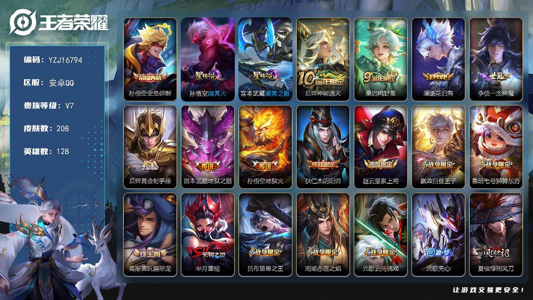 PX_2552112-实名:,不可修改,贵族等级:,V7,英雄数:,124,皮肤数:,93,传说皮:,地狱火,限定皮:,游园惊梦,大圣娶亲