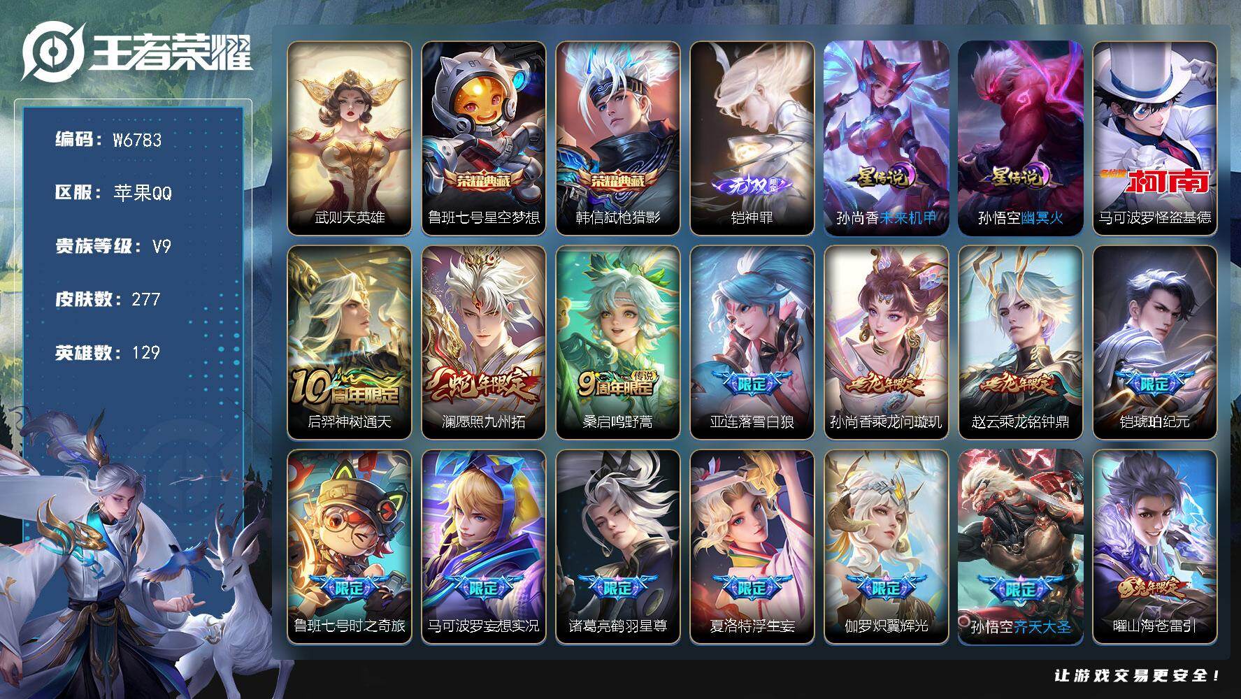 PX_2559674-【W6783】【亮点:4.5K低场次质量号-铠神罪-基德】苹果Q-不可二次-贵9-129英雄-277皮肤-3典藏-2星元-1无双-1珍品传说-31传说-75限定-15按键-贵族积分149429-营地ID:499203925(热门:武则天英雄,鲁班七号星空梦想,韩信弑枪猎影-澜愿照九州拓-孙尚香乘龙问璇玑,赵云乘龙铭钟鼎,铠琥珀纪元-曜山海苍雷引,李信山海炽霜斩) 【星元皮肤】:孙悟空幽冥火,孙尚香未来机甲