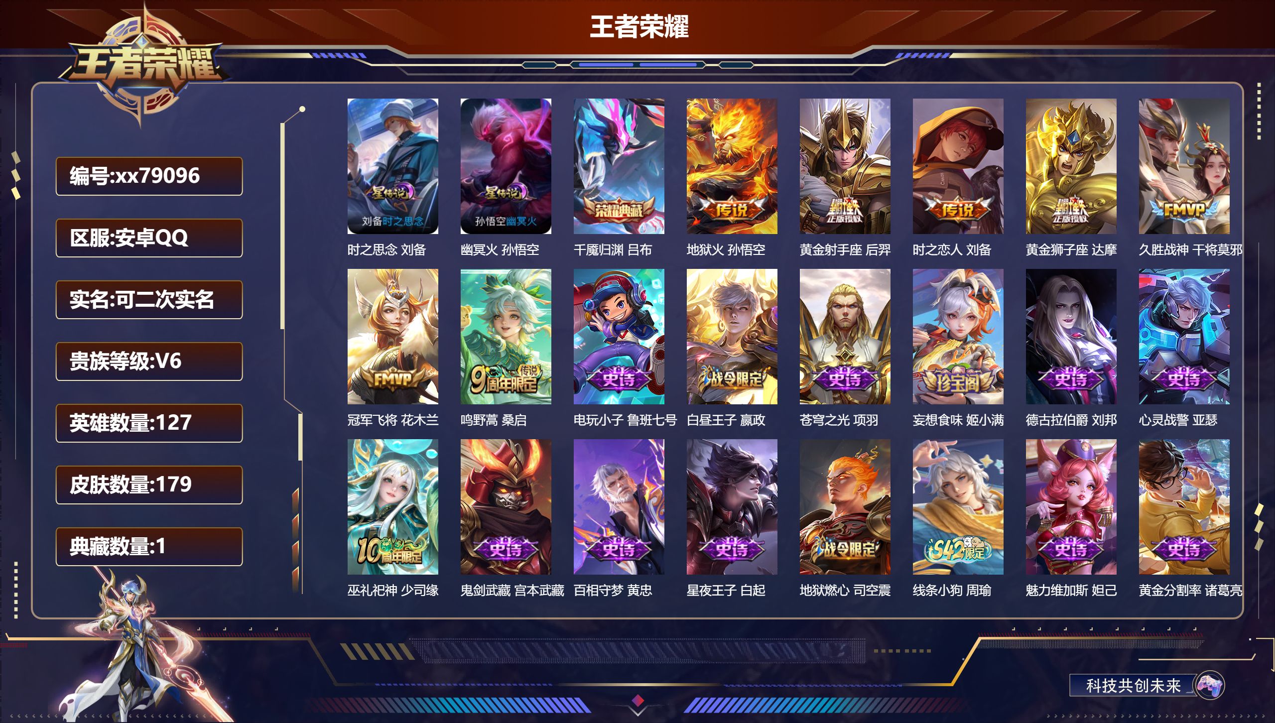PX_2568909-,可二次,V6,贵族积分16711,安卓QQ/179皮肤/127英雄/1典藏/0珍品无双/0无双/0珍品传说/7传说/40史诗/8稀有英雄 【2,星传说皮肤】,时之思念,刘备,幽冥火,孙悟空, 【1,典藏皮肤】,千魇归渊,吕布, 【7,传说皮肤】,地狱火,孙悟空,黄金射手座,后羿,时之恋人,刘备,黄金狮子座,达摩,久胜战神,干将莫邪,冠军飞将,花木兰,鸣野蒿,桑启, 【40,史诗皮肤】,电玩小子,鲁班七号,白昼王子,嬴政,苍穹之光,项羽,妄想食味,姬小满,德古拉伯爵,刘邦,心灵战警,亚瑟,巫礼祀神,少司缘,鬼剑武藏,宫本武藏,百相守梦,黄忠,星夜王子,白起,地狱燃心,司空震,线条小狗,周瑜,魅力维加斯,妲己,黄金分割率,诸葛亮,鹰眼统帅,狄仁杰,大圣娶亲,孙悟空,金属风暴,墨子,逐梦之影,韩信,特工魅影,百里守约,猫狗日记,孙策,引擎之心,赵云,石田雨龙,后羿,魔术师,狄仁杰,皇家上将,赵云,冰冠公主,雅典娜,圣诞恋歌,貂蝉,水晶猎龙者,花木兰,地狱岩魂,廉颇,冰雪圆舞曲,甄姬,青蛇,小乔,千年之狐,李白,曙光守护者,铠,万灵启世,女娲,青龙志,铠,绅士熊喵,刘禅,蓝屏警告,典韦,水果甜心,孙尚香,化蝶舞,阿轲,江河有灵,阿古朵,乘风破浪,夏侯惇, 【94,勇者皮肤】,圆桌骑士,盾山,烛龙,曹操,沙漠行僧,达摩,大漠名商,沈梦溪,纽约教父,刘备,拳王,达摩,龙舞盛年,沈梦溪,功夫炙烤,廉颇,沉稳之力,孙尚香,海盐诗旅,桑启,幻泉雾影,海月,朔风刀,夏侯惇,醍醐杖,老夫子,朔望之晖,女娲,归虚梦演,孙膑,汉昭烈帝,刘备,热血海滩,哪吒,白色死神,白起,黄金武士,典韦,御旌,牛魔,阴阳师,狄仁杰,次元突破,哪吒,古海寻踪,张良,鲨炮海盗猫,沈梦溪,海滩派对,项羽,完美运算,后羿,万华元夜,狄仁杰,克喵,鬼谷子,踏浪烽翎,莱西奥,西部游侠,莱西奥,猎兽之王,吕布,野性能量,吕布,守护之力,大乔,百相守梦,影,原初探秘者,鬼谷子,潮玩探月行,猪八戒,天穹祈灯,鬼谷子,疑决卦,明世隐,化身博士,扁鹊,五福同心,张飞,星际陆战队,程咬金,幻乐之宴,鬼谷子,霸王丸,宫本武藏,死亡骑士,亚瑟,幽兰居士,张良,玩偶对对碰,安琪拉,掌控之力,诸葛亮,海滩丽影,钟无艳,忍·炎影,赵云,狰,白起,重明,芈月,万事如意,刘备,擒涛扼浪,裴擒虎,乓乓大师,鲁班大师,探海日志,鲁班大师,玩趣恶龙,高渐离,兔女郎,花木兰,龙腾万里,关羽,流音漫舞,艾琳,未来纪元,宫本武藏,荣光之誓,亚瑟,万象初新,宫本武藏,聚星闪耀,钟无艳,御銮,盾山,秘密基地,刘禅,穷奇,典韦,教廷特使,韩信,街头霸王,韩信,妄想特派,李元芳,西部大镖客,孙悟空,少女阿狸,妲己,混沌棋,弈星,御霄,米莱狄,布丁狗之约,阿古朵,命运加冕,露娜,小满鸭,姬小满,驱傩正仪,钟馗,命运角斗场,狂铁,死霸装,白起,特工战影,狂铁,御狮,狂铁,漠中幻影,嫦娥,饕餮,太乙真人,劲辣红锅,太乙真人,剑破天穹,刘邦,熔金海岸,周瑜,星梦巡礼,姜子牙,鹤鸣心笺,艾琳,锦麟游梦,庄周,逆浪荇歌,甄姬,海之女神,海月,线条小狗,周瑜,灵卦秘语,少司缘,玫蓝誓约,戈娅, 【39,其他皮肤】,金属狂潮,高渐离,战争骑士,夏侯惇,龙域领主,铠,第七人偶,干将莫邪,灼热之刃,李信,木偶奇遇记,鲁班七号,福禄兄弟,鲁班七号,精灵王,后羿,绯红之刃,露娜,魇语军师,司马懿,午夜歌剧院,元歌,启蛰,司空震,隐刃,兰陵王,霓裳曲,杨玉环,花间舞,公孙离,异域舞娘,貂蝉,修竹墨客,上官婉儿,范海辛,李白,维京掠夺者,苍,归虚梦演,蒙犽,激情绿茵,马可波罗,归虚梦演,西施,锦衣卫,狄仁杰,一千零一夜,张良,威尼斯狂欢,百里玄策,创世神祝,盘古,特种部队,李元芳,绝影神枪,百里守约,蔷薇王座,蔡文姬,森,瑶,秩序猎龙将,蒙恬,精准探案法,米莱狄,精灵公主,王昭君,赤焰之缨,云缨,露花倒影,嫦娥,美梦成真,梦奇,天启骑士,关羽,圆桌骑士,太乙真人,西部大镖客,孙悟空, 【8,稀有英雄】,嬴政,不知火舞,橘右京,夏洛特,娜可露露,韩信,艾琳,赵云, 营地ID:,