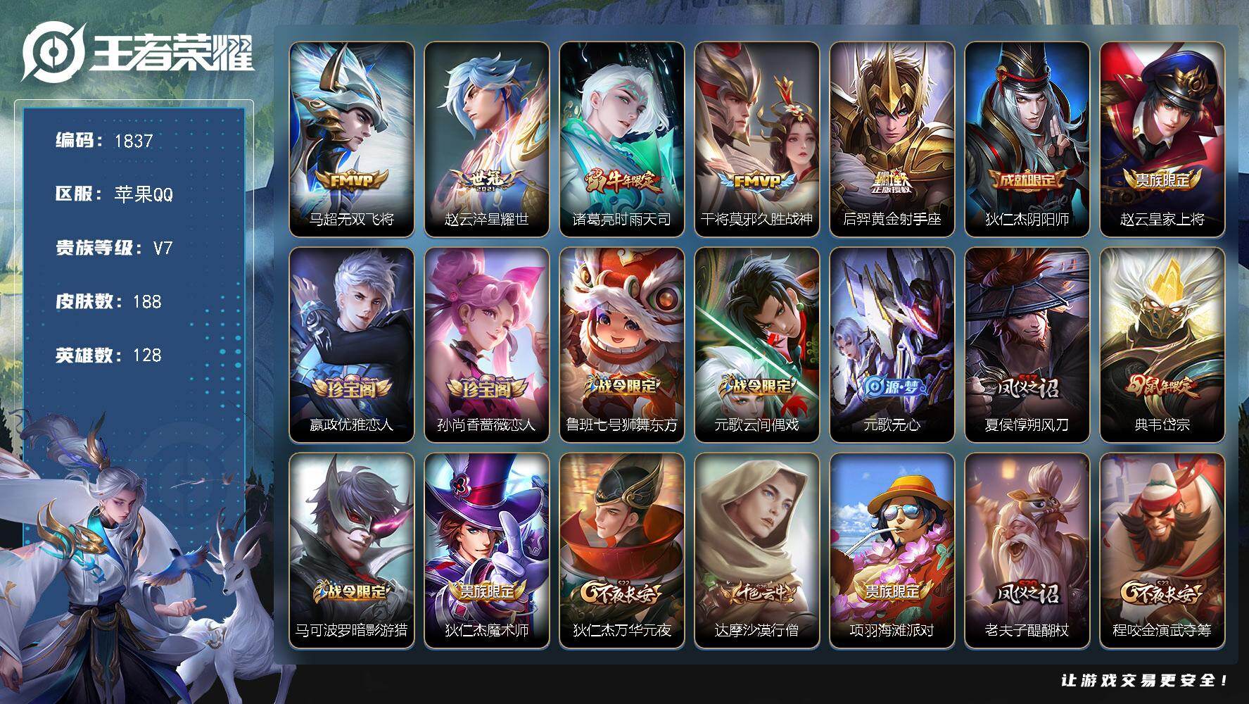 PX_2546210-【188皮5传说,无双飞将,淬星耀世,时雨天司,至尊宝】苹果Q-V7-永恒钻石IV段位-128英雄-188皮肤-5传说-48史诗 【英雄全皮】:孙权全皮 【传说皮肤】:马超无双飞将,赵云淬星耀世,诸葛亮时雨天司,干将莫邪久胜战神,后羿黄金射手座 【限定皮肤】:狄仁杰阴阳师,赵云皇家上将,嬴政优雅恋人,孙尚香蔷薇恋人,鲁班七号狮舞东方,元歌云间偶戏,元歌无心,夏侯惇朔风刀,典韦岱宗,马可波罗暗影游猎,狄仁杰魔术师,狄仁杰万华元夜,达摩沙漠行僧,项羽海滩派对,老夫子醍醐杖,程咬金演武夺筹,韩信逐梦之影,韩信飞衡,韩信傲雪梅枪,兰陵王金庭之子,亚瑟潮玩骑士王,孙悟空至尊宝,孙悟空孙行者,李元芳云中旅人,钟馗驱傩正仪,鬼谷子原初探秘者,鬼谷子五谷丰年,诸葛亮时雨天司,苏烈千军破阵,百里守约朱雀志,弈星混沌棋,沈梦溪大漠名商,明世隐疑决卦,裴擒虎李小龙,裴擒虎擒涛扼浪,猪八戒西部大镖客,鲁班大师探海日志,桑启海盐诗旅,张良古海寻踪,鬼谷子天穹祈灯,刘邦剑破天穹 【年限皮肤】:百里守约朱雀志,典韦岱宗,韩信飞衡,诸葛亮时雨天司 【赛季限定】:夏侯惇朔风刀,弈星混沌棋,明世隐疑决卦,老夫子醍醐杖,鬼谷子原初探秘者,狄仁杰万华元夜,程咬金演武夺筹,钟馗驱傩正仪,苏烈千军破阵,达摩沙漠行僧,兰陵王金庭之子,沈梦溪大漠名商,李元芳云中旅人,桑启海盐诗旅,裴擒虎擒涛扼浪,鲁班大师探海日志,张良古海寻踪,鬼谷子天穹祈灯,刘邦剑破天穹,东皇太一噬灭天穹,太乙真人谧流熔炉,钟馗虚灵犬护 【战令限定】:鲁班七号狮舞东方,马可波罗暗影游猎,猪八戒西部大镖客,元歌云间偶戏,亚瑟潮玩骑士王,孙悟空神迹守卫,刘禅鸭鸭历险记,沈梦溪鸭鸭历险记,周瑜线条小狗,小乔线条小狗 【史诗皮肤】:太乙真人瓦猫非猫,周瑜线条小狗,小乔线条小狗,后羿石田雨龙,狂铁龙之律动,刘禅鸭鸭历险记,元歌无心,鬼谷子五谷丰年,澜赏金猎手,韩信傲雪梅枪,孙悟空孙行者,安琪拉时之奇旅,元歌云间偶戏,裴擒虎李小龙,马可波罗暗影游猎,橘右京修罗,小乔青蛇,典韦岱宗,韩信飞衡,狄仁杰鹰眼统帅,鲁班七号狮舞东方,百里守约朱雀志,阿轲节奏热浪,程咬金功夫厨神,铠曙光守护者,百里守约特工魅影,亚瑟心灵战警,诸葛亮黄金分割率,兰陵王暗隐猎兽者,韩信逐梦之影,花木兰水晶猎龙者,孙悟空至尊宝,韩信白龙吟,吕布末日机甲,李白千年之狐,曹操幽灵船长,墨子金属风暴,妲己女仆咖啡,妲己魅力维加斯,嬴政摇滚巨星,嬴政优雅恋人,孙尚香水果甜心,孙尚香蔷薇恋人,宫本武藏鬼剑武藏,狄仁杰魔术师,甄姬冰雪圆舞曲,貂蝉圣诞恋歌,赵云皇家上将,阿轲暗夜猫娘 【其他皮肤】:影百相守梦,鲁班七号班班快跑,鬼谷子谜偶窥秘,虞姬溯影追猎,孙权径山谋武,鬼谷子克喵,莱西奥踏浪烽翎,白起死霸装,姬小满小满鸭,雅典娜潮玩士官长,露娜命运加冕,沈梦溪鸭鸭历险记,钟馗虚灵犬护,明世隐景韶洛都,姜子牙星梦巡礼,太乙真人谧流熔炉,东皇太一噬灭天穹,孙悟空神迹守卫,刘邦剑破天穹,廉颇功夫炙烤,海诺时空谍影,鬼谷子天穹祈灯,后羿完美运算,张良古海寻踪,李元芳妄想特派,鲁班大师探海日志,裴擒虎擒涛扼浪,猪八戒潮玩探月行,桑启海盐诗旅,李元芳云中旅人,蒙恬蔚蓝守将,沈梦溪大漠名商,兰陵王金庭之子,刘邦虎啸剑宗,程咬金无双福将,达摩沙漠行僧,苏烈千军破阵,鲁班大师乓乓大师,钟馗驱傩正仪,程咬金演武夺筹,露娜瓷语鉴心,刘禅秘密基地,亚瑟潮玩骑士王,狄仁杰万华元夜,鬼谷子原初探秘者,狂铁特工战影,猪八戒西部大镖客,老夫子醍醐杖,盾山圆桌骑士,明世隐疑决卦,哪吒次元突破,弈星混沌棋,夏侯惇朔风刀,沈梦溪鲨炮海盗猫,吕布野性能量,明世隐虹云星官,诸葛亮掌控之力,孙尚香沉稳之力,老夫子功夫老勺,狂铁命运角斗场,王昭君幻想奇妙夜,宫本武藏霸王丸,钟无艳海滩丽影,关羽龙腾万里,刘备纽约教父,狄仁杰阴阳师,后羿阿尔法小队,宫本武藏万象初新,刘备万事如意,甄姬花好人间,花木兰兔女郎,亚瑟死亡骑士,典韦黄金武士,妲己少女阿狸,姜子牙时尚教父,孙膑天使之翼,安琪拉玩偶对对碰,宫本武藏未来纪元,牛魔西部大镖客,白起白色死神,赵云忍炎影,韩信街头霸王,韩信教廷特使,项羽海滩派对,金蝉前尘,云缨赤焰之缨,澜孤猎,蒙犽归虚梦演,西施归虚梦演,马超幸存者,曜归虚梦演,云中君荷鲁斯之眼,瑶森,猪八戒年年有余,嫦娥露花倒影,上官婉儿修竹墨客,李信灼热之刃,伽罗花见巫女,司马懿魇语军师,孙策海之征途,元歌午夜歌剧院,弈星踏雪寻梅,裴擒虎街头旋风,公孙离花间舞,明世隐占星师,梦奇美梦成真,百里玄策威尼斯狂欢,百里守约绝影神枪,铠龙域领主,干将莫邪第七人偶,大乔伊势巫女,诸葛亮星航指挥官,杨戬埃及法老,苍维京掠夺者,夏侯惇战争骑士,关羽天启骑士,李元芳特种部队,李白范海辛,兰陵王隐刃,刘禅英喵野望,后羿精灵王,孙悟空西部大镖客,小乔万圣前夜,张良一千零一夜,曹操超能战警,曹操死神来了,狄仁杰锦衣卫,王昭君精灵公主,貂蝉异域舞娘,钟无艳生化警戒,项羽帝国元帅,高渐离金属狂潮,鲁班七号木偶奇遇记,鲁班七号福禄兄弟 【内测皮肤】:孙尚香蔷薇恋人,嬴政优雅恋人,狂铁特工战影 【营地ID】:1738459806