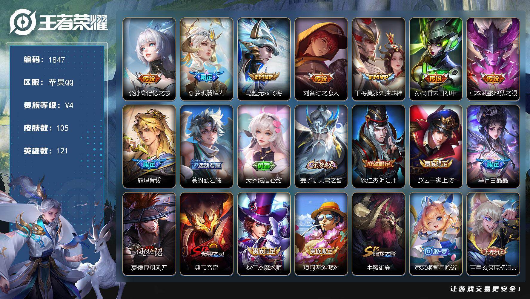 PX_2546219-【105皮肤7传说,无双飞将,埋骨钱,公孙离记忆之芯,末日机甲,白晶晶】苹果Q-V4-最强王者段位-121英雄-105皮肤-7传说-29史诗 【英雄全皮】:孙权全皮 【传说皮肤】:公孙离记忆之芯,伽罗炽翼辉光,马超无双飞将,刘备时之恋人,干将莫邪久胜战神,孙尚香末日机甲,宫本武藏地狱之眼 【限定皮肤】:暃埋骨钱,蒙犽顽岩魄,大乔绒语心约,姜子牙天穹之誓,狄仁杰阴阳师,赵云皇家上将,芈月白晶晶,夏侯惇朔风刀,典韦穷奇,狄仁杰魔术师,项羽海滩派对,牛魔御旌,蔡文姬繁星吟游,百里玄策原初追逐者,弈星混沌棋,公孙离玉兔公主,明世隐疑决卦,裴擒虎李小龙,狂铁御狮,米莱狄御霄,伽罗炽翼辉光,盾山御銮,艾琳流音漫舞,司空震地狱燃心,阿古朵江河有灵,张良古海寻踪,鬼谷子天穹祈灯,姬小满妄想食味,刘邦剑破天穹,程咬金群星魔术团,芈月浮光幕影,周瑜熔金海岸 【赛季限定】:典韦穷奇,狂铁御狮,米莱狄御霄,牛魔御旌,盾山御銮,夏侯惇朔风刀,弈星混沌棋,明世隐疑决卦,张良古海寻踪,鬼谷子天穹祈灯,刘邦剑破天穹,姜子牙天穹之誓,百里玄策原初追逐者 【战令限定】:司空震地狱燃心,艾琳流音漫舞 【史诗皮肤】:大司命东方月初,暃埋骨钱,蒙犽顽岩魄,芈月浮光幕影,姬小满妄想食味,阿古朵江河有灵,司空震地狱燃心,百里守约真我赫兹,公孙离玉兔公主,芈月白晶晶,裴擒虎李小龙,百里玄策原初追逐者,不知火舞魅语,蔡文姬繁星吟游,公孙离无限星赏官,狄仁杰鹰眼统帅,大乔猫狗日记,蔡文姬舞动绿茵,雅典娜冰冠公主,兰陵王暗隐猎兽者,张飞乱世虎臣,吕布圣诞狂欢,妲己女仆咖啡,妲己魅力维加斯,孙尚香水果甜心,宫本武藏鬼剑武藏,狄仁杰魔术师,甄姬冰雪圆舞曲,赵云皇家上将 【其他皮肤】:艾琳鹤鸣心笺,孙权径山谋武,大乔绒语心约,周瑜熔金海岸,姜子牙天穹之誓,程咬金群星魔术团,刘邦剑破天穹,嫦娥漠中幻影,鬼谷子天穹祈灯,后羿完美运算,张良古海寻踪,艾琳流音漫舞,戈娅危途狂花,鲁班大师乓乓大师,狂铁特工战影,盾山圆桌骑士,明世隐疑决卦,弈星混沌棋,夏侯惇朔风刀,盾山御銮,牛魔御旌,张良幽兰居士,明世隐虹云星官,米莱狄御霄,狂铁御狮,典韦穷奇,老夫子功夫老勺,钟无艳海滩丽影,关羽龙腾万里,刘备汉昭烈帝,刘备纽约教父,狄仁杰阴阳师,甄姬花好人间,张飞五福同心,花木兰兔女郎,达摩拳王,亚瑟死亡骑士,妲己少女阿狸,宫本武藏未来纪元,扁鹊化身博士,芈月红桃皇后,赵云忍炎影,达摩大发明家,阿轲爱心护理,韩信街头霸王,韩信教廷特使,项羽海滩派对,云缨赤焰之缨,司空震启蛰,阿古朵熊喵少女,马超幸存者,云中君荷鲁斯之眼,盘古创世神祝,李信灼热之刃,沈梦溪棒球奇才,司马懿魇语军师,元歌午夜歌剧院,弈星踏雪寻梅,裴擒虎街头旋风,公孙离花间舞,百里玄策威尼斯狂欢,铠龙域领主,干将莫邪第七人偶,大乔伊势巫女,杨戬埃及法老,马可波罗激情绿茵,小乔万圣前夜,狄仁杰锦衣卫,露娜绯红之刃 【内测皮肤】:狂铁特工战影 【营地ID】:1661398043