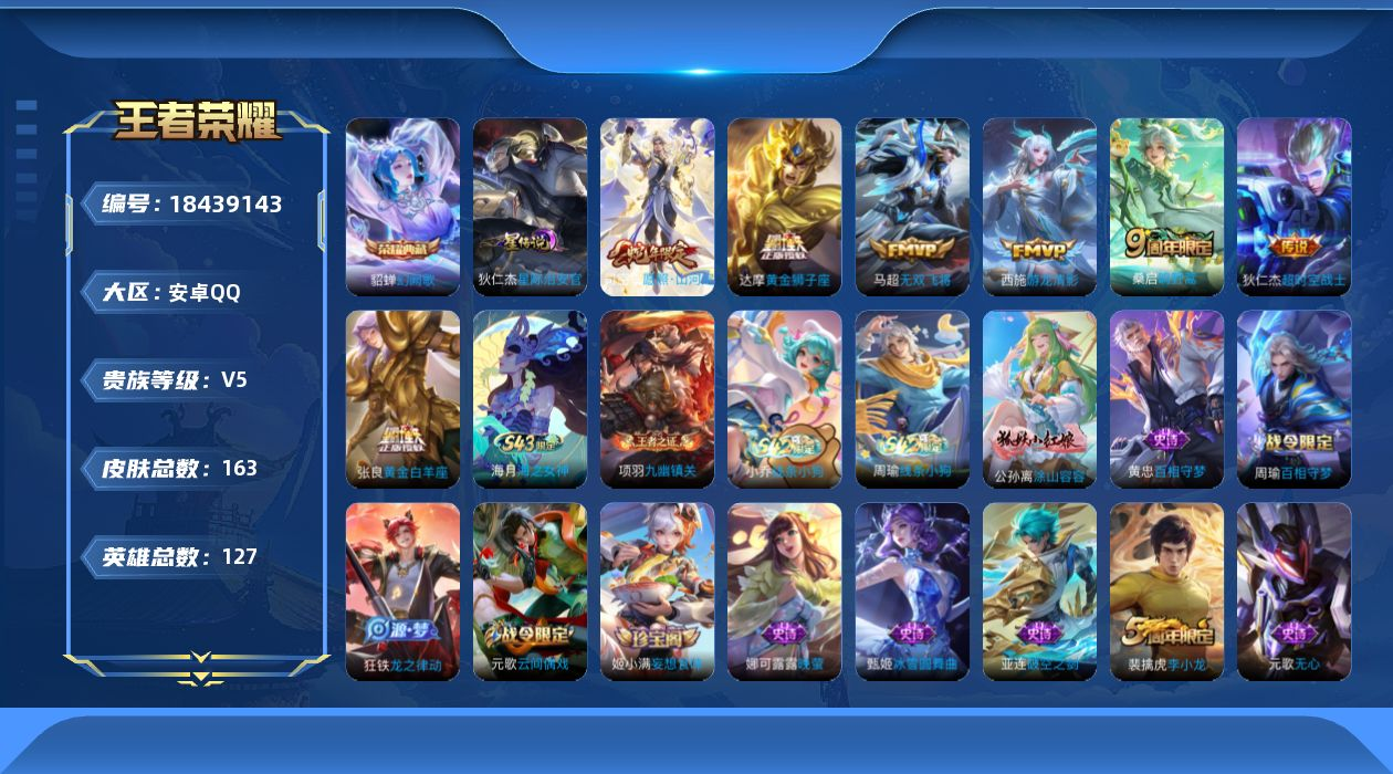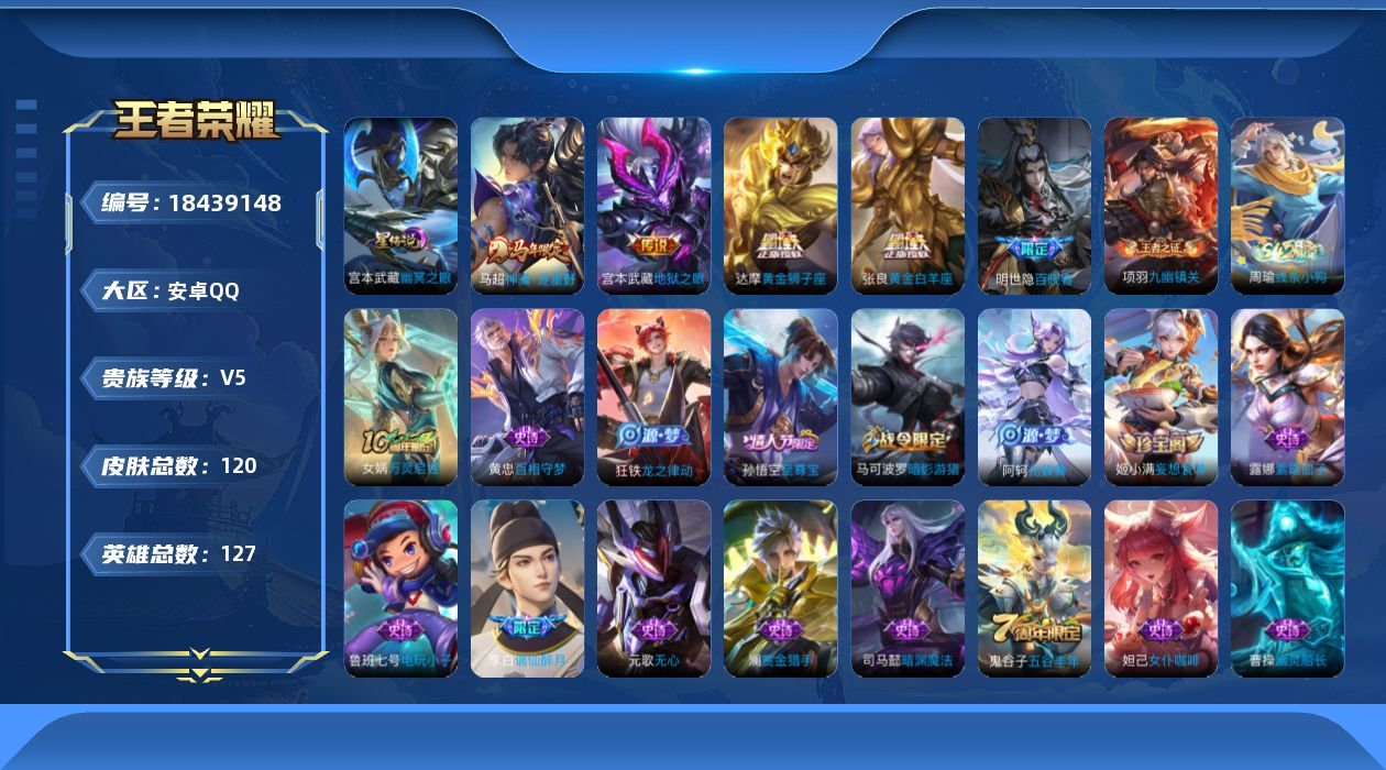 PX_2546215-【122皮1典藏5传说,星空梦想,至尊宝,冰锋战神,仲夏夜之梦】安卓Q-V0-荣耀黄金I段位-109英雄-122皮肤-1典藏皮肤-5传说-22史诗 【荣耀典藏】:鲁班七号星空梦想 【传说皮肤】:后羿黄金射手座,貂蝉仲夏夜之梦,孙尚香末日机甲,宫本武藏地狱之眼,孙悟空地狱火 【限定皮肤】:白起狰,狄仁杰阴阳师,虞姬凯尔特女王,赵云皇家上将,赵云引擎之心,庄周蜃楼王,孙膑妖精王,扁鹊炼金王,芈月重明,甄姬游园惊梦,曹操烛龙,典韦穷奇,狄仁杰魔术师,狄仁杰万华元夜,达摩沙漠行僧,项羽海滩派对,老夫子醍醐杖,关羽冰锋战神,程咬金演武夺筹,兰陵王金庭之子,孙悟空美猴王,孙悟空至尊宝,牛魔御旌,钟馗驱傩正仪,杨玉环遇见飞天,太乙真人饕餮,鬼谷子原初探秘者,苏烈千军破阵,明世隐疑决卦,裴擒虎李小龙,狂铁御狮,米莱狄御霄,云中君纤云弄巧,盾山御銮 【年限皮肤】:孙悟空美猴王 【赛季限定】:庄周蜃楼王,孙膑妖精王,扁鹊炼金王,虞姬凯尔特女王,白起狰,太乙真人饕餮,曹操烛龙,芈月重明,典韦穷奇,狂铁御狮,米莱狄御霄,牛魔御旌,盾山御銮,明世隐疑决卦,老夫子醍醐杖,鬼谷子原初探秘者,狄仁杰万华元夜,程咬金演武夺筹,钟馗驱傩正仪,苏烈千军破阵,达摩沙漠行僧,兰陵王金庭之子 【史诗皮肤】:云中君纤云弄巧,裴擒虎李小龙,狄仁杰鹰眼统帅,杨玉环遇见飞天,李元芳逐浪之夏,铠曙光守护者,百里守约特工魅影,雅典娜冰冠公主,甄姬游园惊梦,兰陵王暗隐猎兽者,赵云引擎之心,孙悟空至尊宝,关羽冰锋战神,韩信白龙吟,李白千年之狐,墨子金属风暴,妲己魅力维加斯,孙尚香水果甜心,狄仁杰魔术师,貂蝉圣诞恋歌,赵云未来纪元,赵云皇家上将 【其他皮肤】:兰陵王金庭之子,达摩沙漠行僧,苏烈千军破阵,鲁班大师乓乓大师,钟馗驱傩正仪,程咬金演武夺筹,狄仁杰万华元夜,鬼谷子原初探秘者,老夫子醍醐杖,盾山圆桌骑士,明世隐疑决卦,孙膑归虚梦演,盾山御銮,牛魔御旌,张良幽兰居士,明世隐虹云星官,米莱狄御霄,项羽科学大爆炸,狂铁御狮,鬼谷子幻乐之宴,典韦穷奇,牛魔制霸全明星,老夫子功夫老勺,芈月重明,曹操烛龙,宫本武藏霸王丸,太乙真人饕餮,钟无艳海滩丽影,白起狰,虞姬凯尔特女王,关羽龙腾万里,扁鹊炼金王,李元芳黑猫爱糖果,孙膑妖精王,刘备纽约教父,庄周蜃楼王,狄仁杰阴阳师,后羿阿尔法小队,宫本武藏万象初新,甄姬花好人间,花木兰兔女郎,孙悟空美猴王,达摩拳王,亚瑟死亡骑士,妲己少女阿狸,姜子牙时尚教父,宫本武藏未来纪元,扁鹊化身博士,达摩大发明家,阿轲致命风华,露娜哥特玫瑰,韩信街头霸王,韩信教廷特使,项羽海滩派对,鲁班大师归虚梦演,瑶森,嫦娥露花倒影,李信灼热之刃,沈梦溪棒球奇才,伽罗花见巫女,孙策海之征途,元歌午夜歌剧院,弈星踏雪寻梅,公孙离花间舞,明世隐占星师,梦奇美梦成真,苏烈爱与和平,百里玄策威尼斯狂欢,百里守约绝影神枪,铠龙域领主,大乔伊势巫女,黄忠芝加哥教父,诸葛亮星航指挥官,哪吒三太子,杨戬埃及法老,苍维京掠夺者,马可波罗激情绿茵,夏侯惇战争骑士,蔡文姬蔷薇王座,刘邦圣殿之光,李元芳特种部队,钟馗地府判官,李白范海辛,兰陵王隐刃,刘禅英喵野望,后羿精灵王,周瑜海军大将,孙悟空西部大镖客,小乔万圣前夜,曹操超能战警,曹操死神来了,王昭君精灵公主,钟无艳生化警戒,露娜绯红之刃 【营地ID】:93780695