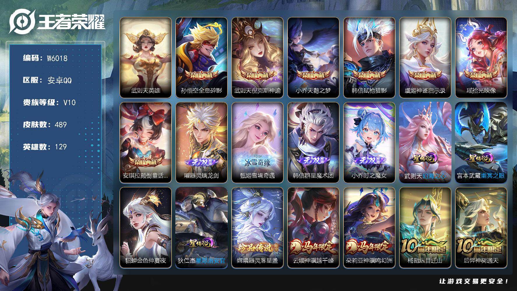 PX_2543236-【W6018】精品贵10-满铭文(热门皮肤)拾光映像.颠倒童话魔镜.神鉴启示录.天鹅之梦.雪境奇遇.时之魔女.安卓Q-不可二次-贵10-129英雄-489皮肤-8典藏-4无双-1珍品传说-4星元-52传说-199限定-43个性按键.贵族积分25万-营地ID:341660226 【星元皮肤】:宫本武藏幽冥之眼,武则天幻海之心,狄仁杰星际治安官,貂蝉金色仲夏夜