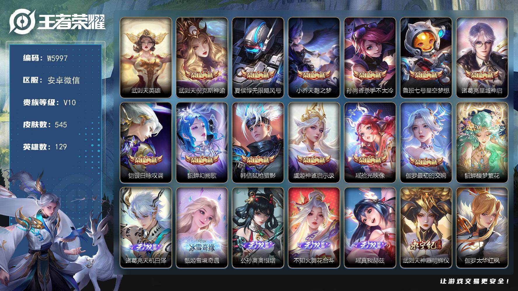 PX_2552576-【W5997】无双贵10-馥梦繁花全套-安卓微信-可二次-129英雄-545皮肤-1珍品无双-16典藏(3小兵/武则天)-6无双-7珍品传说-90传说-6天幕-5专属播报-8星元-181按键-金色高级灵宝-满铭文-全皮紫瑶-拾光映像/倪克斯神谕/弑枪猎影/神鉴启示录/花合斗/离恨烟/雪境奇遇/天机白泽/沧流箭/酷洛米之心/怪盗基德-满(蛇/龙)年限定套-贵族积分70W-营地ID:1822086475 【星元皮肤】:伽罗太华红枫,兰陵王荆棘舞步,诸葛亮岁雨灵司,瑶时之愿境,鲁班七号寅虎焰心,孙尚香未来机甲,孙悟空幽冥火,貂蝉金色仲夏夜