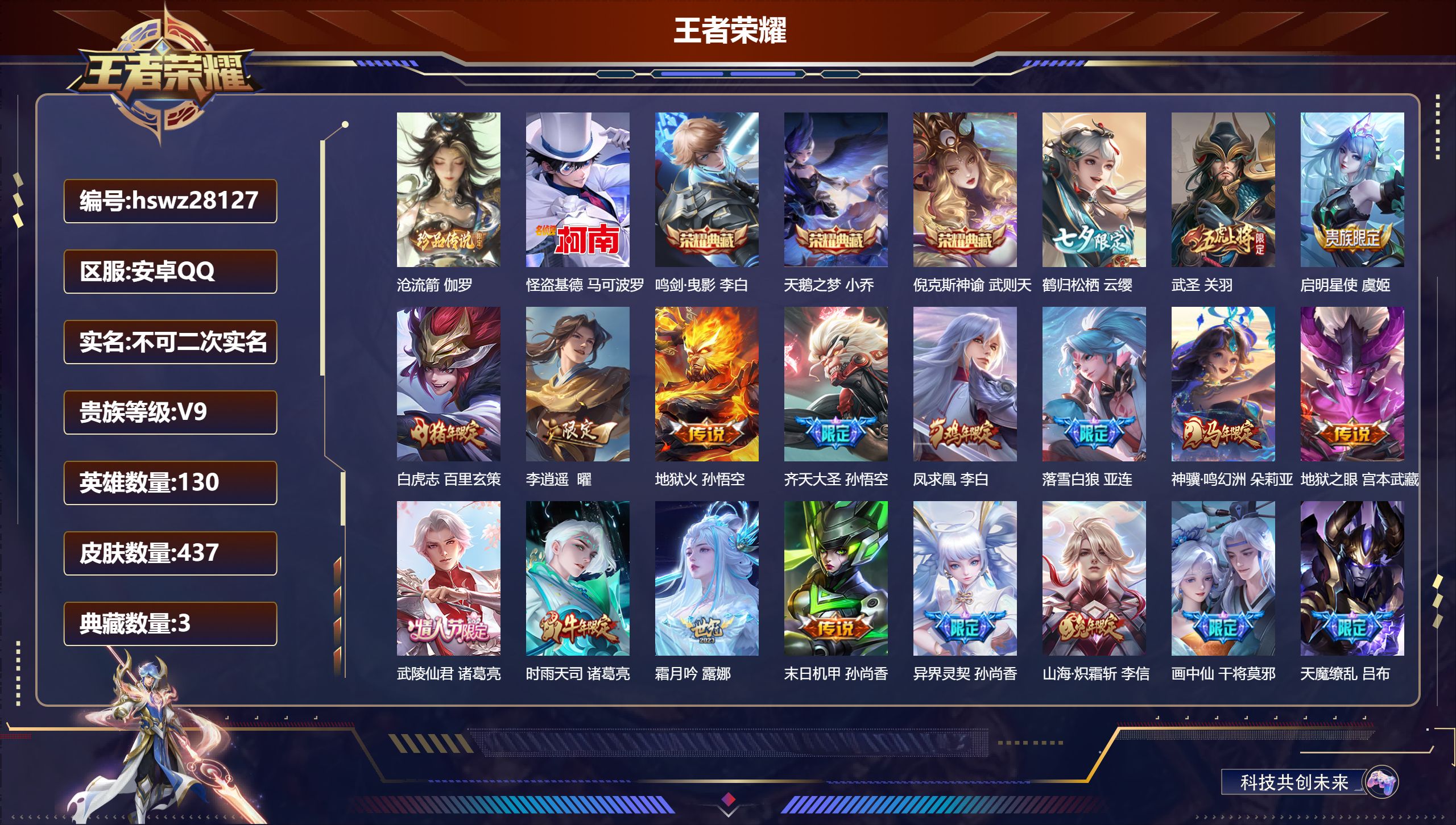 PX_2555851-Q/荣耀王者/437皮肤/130英雄/3典藏/0珍品无双/0无双/2珍品传说/29传说/137史诗/10稀有英雄 【2,珍品传说】沧流箭,伽罗,怪盗基德,马可波罗, 【3,典藏皮肤】鸣剑·曳影,李白,天鹅之梦,小乔,倪克斯神谕,武则天, 【29,传说皮肤】鹤归松栖,云缨,武圣,关羽,启明星使,虞姬,白虎志,百里玄策,李逍遥,,曜,地狱火,孙悟空,齐天大圣,孙悟空,凤求凰,李白,落雪白狼,亚连,神骥·鸣幻洲,朵莉亚,地狱之眼,宫本武藏,武陵仙君,诸葛亮,时雨天司,诸葛亮,霜月吟,露娜,末日机甲,孙尚香,异界灵契,孙尚香,山海·炽霜斩,李信,画中仙,干将莫邪,天魔缭乱,吕布,淬星耀世,赵云,寅虎·赤拳,裴擒虎,超时空战士,狄仁杰,山海·苍雷引,曜,金乌负日,海月,愿照·九州拓,澜,幻光神枪,云缨,愿照·山河定,司空震,鸣野蒿,桑启,映山客,王昭君, 【137,史诗皮肤】时之奇旅,安琪拉,电玩小子,鲁班七号,末日机甲,吕布,白昼王子,嬴政,逐梦之星,马可波罗,紫霞仙子,露娜,百解令,蒙犽,高山流水,庄周,匿光追影者,镜,暗渊魔法,司马懿,燃音魔法,高渐离,天秀·音浪,高渐离,苍穹之光,项羽,天秀·启明,杨戬,狮舞东方,鲁班七号,猫狗日记,大乔,德古拉伯爵,刘邦,山海·玄木吟,马可波罗,心灵战警,亚瑟,五谷丰年,鬼谷子,诗语江南,西施,无心,元歌,鬼剑武藏,宫本武藏,百相守梦,黄忠,星夜王子,白起,寅虎·心曲,杨玉环,无限星赏官,公孙离,地狱燃心,司空震,线条小狗,周瑜,百晓客,明世隐,遇见飞天,杨玉环,摇滚巨星,嬴政,电玩高手,狂铁,顽趣,梦奇,冰锋战神,关羽,蜜橘之夏,公孙离,修罗,橘右京,拒霜思,嫦娥,魅力维加斯,妲己,黄金分割率,诸葛亮,乐园奇幻夜,钟馗,偶像歌手,王昭君,荣光圣徽,蒙恬,女仆咖啡,妲己,赏金猎手,澜,九幽镇关,项羽,星界游侠,暃,晚萤,娜可露露,猪悟能,猪八戒,遇见神鹿,瑶,舞动绿茵,蔡文姬,暗夜贵公子,嬴政,鹰眼统帅,狄仁杰,胡桃异想国,米莱狄,大圣娶亲,孙悟空,玫瑰异探,镜,孙行者,孙悟空,李小龙,裴擒虎,春霖将至,上官婉儿,纤云弄巧,云中君,如梦令,后羿,金属风暴,墨子,逐梦之影,韩信,傲雪梅枪,韩信,特工魅影,百里守约,猫狗日记,孙策,原初追逐者,百里玄策,逐浪之夏,李元芳,奇幻香踪,扁鹊,时之祈愿,云中君,未来纪元,赵云,引擎之心,赵云,灵蛊蚀心,扁鹊,朱雀志,百里守约,雪豹·霜爪,百里守约,黎明之约,雅典娜,石田雨龙,后羿,鸭鸭历险记,刘禅,驭风魔法,戈娅,魔术师,狄仁杰,龙之律动,狂铁,神威,马超,皇家上将,赵云,冰冠公主,雅典娜,至尊宝,孙悟空,功夫厨神,程咬金,梁祝,上官婉儿,电玩·爆裂旋风,刘禅,天才门将,刘禅,圣诞恋歌,貂蝉,云间偶戏,元歌,水晶猎龙者,花木兰,涂山容容,公孙离,百木心枪,赵云,一生所爱,露娜,圣诞狂欢,吕布,魅语,不知火舞,器灵·浮梦炉,赵怀真,天狼绘梦者,上官婉儿,罗小黑战记,百里玄策,星界战将,牛魔,永昼,夏洛特,天狼溯光者,伽罗,地狱岩魂,廉颇,茶境仙,孙膑,冰雪圆舞曲,甄姬,火炮绅士,黄忠,月团寄思,沈梦溪,航海奇遇记,老夫子,千年之狐,李白,节奏热浪,阿轲,女儿国国王,甄姬,超时空战士,钟无艳,游园惊梦,甄姬,青春决赛季,花木兰,曙光守护者,铠,心灵骇客,安琪拉,寅虎·御盾,廉颇,鹤归松栖,赵怀真,箭羽风息,伽罗,乱世虎臣,张飞,万物之道,弈星,龙胆,赵云,绅士熊喵,刘禅,缤纷独角兽,小乔,陌上桑,艾琳,百相守梦,百里守约,线条小狗,小乔,蓝屏警告,典韦,真爱魔法,干将莫邪,水果甜心,孙尚香,化蝶舞,阿轲,江河有灵,阿古朵,狼魂孤将,苍,幽灵船长,曹操,乘风破浪,夏侯惇,暗隐猎兽者,兰陵王, 【185,勇者皮肤】时空谍影,海诺,玲珑珍味,西施,圆桌骑士,盾山,烛龙,曹操,爱心护理,阿轲,太极少年,赵怀真,星际陆战队,达摩,沙漠行僧,达摩,大漠名商,沈梦溪,暖冬絮语,程咬金,缤纷绘卷,张良,纽约教父,刘备,拳王,达摩,大发明家,达摩,龙舞盛年,沈梦溪,乐园追猎者,白起,丁香结,小乔,功夫炙烤,廉颇,铁甲之心,典韦,沉稳之力,孙尚香,幻夜卜梦,芈月,海盐诗旅,桑启,幻泉雾影,海月,朔风刀,夏侯惇,醍醐杖,老夫子,朔望之晖,女娲,归虚梦演,孙膑,汉昭烈帝,刘备,白色死神,白起,黄金武士,典韦,落雪兰心,甄姬,御旌,牛魔,阴阳师,狄仁杰,炼金王,扁鹊,径山谋武,孙权,致命风华,阿轲,次元突破,哪吒,古海寻踪,张良,牛运亨通,牛魔,戏梦巡演,空空儿,功夫老勺,老夫子,西部大镖客,牛魔,鲨炮海盗猫,沈梦溪,虎啸剑宗,刘邦,海滩派对,项羽,完美运算,后羿,万华元夜,狄仁杰,克喵,鬼谷子,制霸全明星,牛魔,踏浪烽翎,莱西奥,演武夺筹,程咬金,红桃皇后,芈月,奇妙博物学,庄周,西部游侠,莱西奥,美猴王,孙悟空,猎兽之王,吕布,野性能量,吕布,哥特玫瑰,露娜,守护之力,大乔,无双福将,程咬金,瓷语鉴心,露娜,潮玩探月行,猪八戒,鸿运当头,亚瑟,天穹祈灯,鬼谷子,决胜大满贯,曹操,西部大镖客,猪八戒,疑决卦,明世隐,化身博士,扁鹊,阿尔法小队,后羿,无尽旅途,扁鹊,五福同心,张飞,金色潮汐,朵莉亚,次元傲视,杨戬,星际陆战队,程咬金,幻乐之宴,鬼谷子,东方不败,武则天,霸王丸,宫本武藏,虹云星官,明世隐,雾影缉谜,兰陵王,舞狮寰,吕布,救世之瞳,扁鹊,赤刃凌霄,敖隐,潮玩骑兵,杨戬,死亡骑士,亚瑟,浪漫序章,刘备,敏锐之力,李白,危途狂花,戈娅,胡桃狂想曲,蒙犽,破局者,亚连,玩偶对对碰,安琪拉,掌控之力,诸葛亮,海滩丽影,钟无艳,圣弓游侠,后羿,忍·炎影,赵云,狰,白起,重明,芈月,炽热元素使,姜子牙,坚韧之力,苏烈,唤灵魔甲,刘禅,万事如意,刘备,逐霄