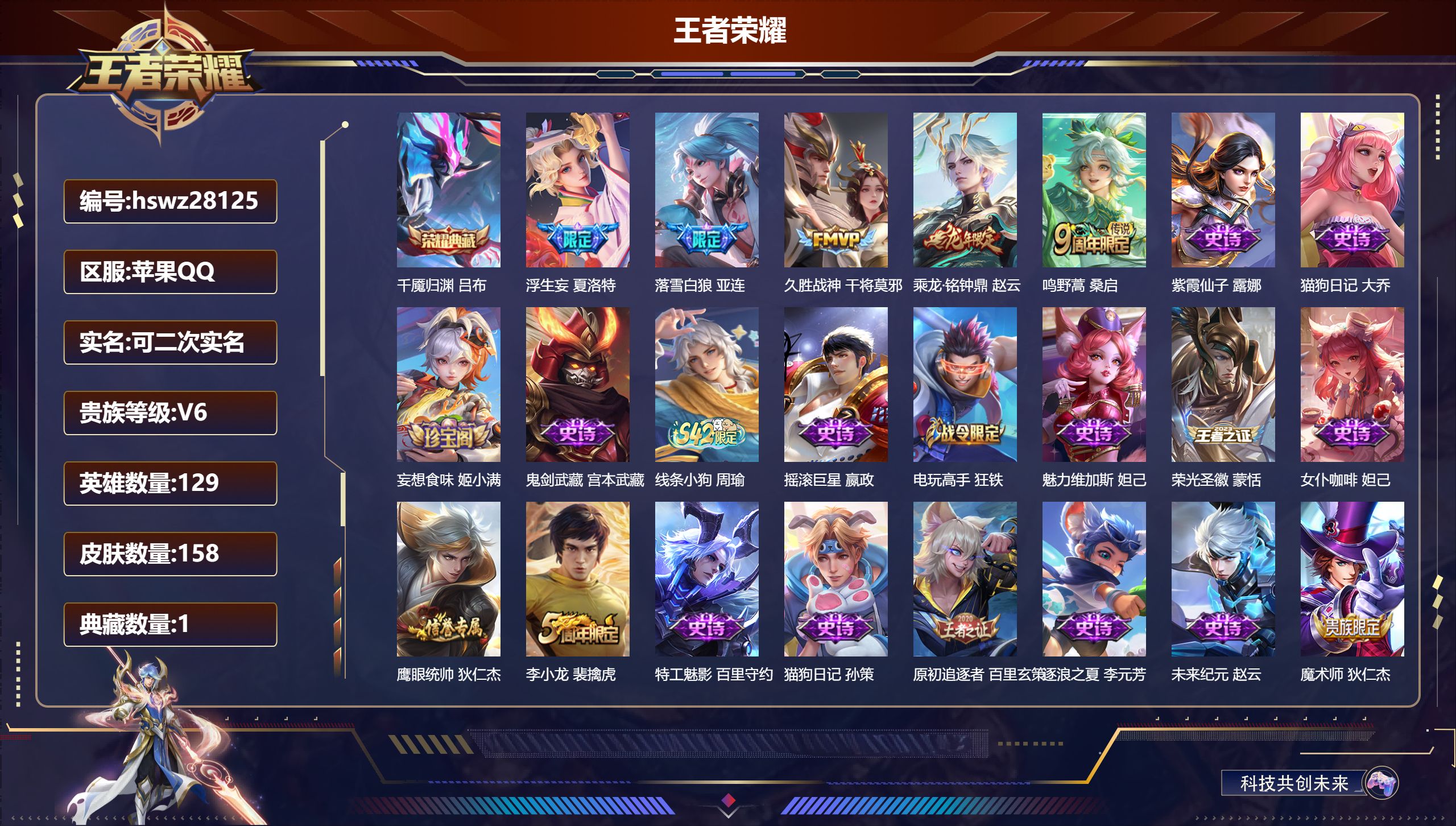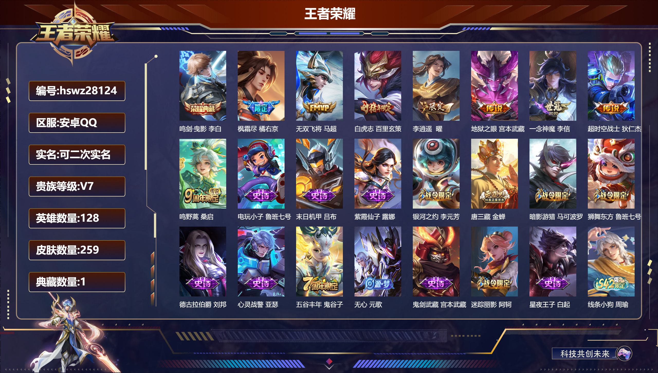 PX_2555842-Q/最强王者/259皮肤/128英雄/1典藏/0珍品无双/0无双/0珍品传说/8传说/68史诗/8稀有英雄 【1,典藏皮肤】鸣剑·曳影,李白, 【8,传说皮肤】枫霜尽,橘右京,无双飞将,马超,白虎志,百里玄策,李逍遥,,曜,地狱之眼,宫本武藏,一念神魔,李信,超时空战士,狄仁杰,鸣野蒿,桑启, 【68,史诗皮肤】电玩小子,鲁班七号,末日机甲,吕布,紫霞仙子,露娜,银河之约,李元芳,唐三藏,金蝉,暗影游猎,马可波罗,狮舞东方,鲁班七号,德古拉伯爵,刘邦,心灵战警,亚瑟,五谷丰年,鬼谷子,无心,元歌,鬼剑武藏,宫本武藏,迷踪丽影,阿轲,星夜王子,白起,线条小狗,周瑜,摇滚巨星,嬴政,电玩高手,狂铁,顽趣,梦奇,修罗,橘右京,魅力维加斯,妲己,偶像歌手,王昭君,女仆咖啡,妲己,赏金猎手,澜,猪悟能,猪八戒,繁星吟游,蔡文姬,鹰眼统帅,狄仁杰,匿光启智者,鲁班大师,玫瑰异探,镜,李小龙,裴擒虎,纤云弄巧,云中君,驯魔猎人,兰陵王,金属风暴,墨子,逐梦之影,韩信,猫狗日记,孙策,原初追逐者,百里玄策,逐浪之夏,李元芳,未来纪元,赵云,朱雀志,百里守约,黎明之约,雅典娜,优雅恋人,嬴政,魔术师,狄仁杰,皇家上将,赵云,冰冠公主,雅典娜,至尊宝,孙悟空,功夫厨神,程咬金,梁祝,上官婉儿,天才门将,刘禅,圣诞恋歌,貂蝉,云间偶戏,元歌,水晶猎龙者,花木兰,烈魂,黄忠,圣诞狂欢,吕布,地狱岩魂,廉颇,蔷薇恋人,孙尚香,冰雪圆舞曲,甄姬,航海奇遇记,老夫子,超时空战士,钟无艳,青龙志,铠,心灵骇客,安琪拉,乱世虎臣,张飞,吟游魔法,明世隐,缤纷独角兽,小乔,蓝屏警告,典韦,水果甜心,孙尚香,狂想玩偶喵,蒙犽,幽灵船长,曹操,乘风破浪,夏侯惇,暗隐猎兽者,兰陵王, 【127,勇者皮肤】圆桌骑士,盾山,爱心护理,阿轲,沙漠行僧,达摩,大漠名商,沈梦溪,纽约教父,刘备,拳王,达摩,大发明家,达摩,龙舞盛年,沈梦溪,丁香结,小乔,功夫炙烤,廉颇,铁甲之心,典韦,沉稳之力,孙尚香,海盐诗旅,桑启,幻泉雾影,海月,朔风刀,夏侯惇,醍醐杖,老夫子,朔望之晖,女娲,归虚梦演,孙膑,白色死神,白起,黑桃队长,鲁班七号,黄金武士,典韦,落雪兰心,甄姬,夺宝奇兵,刘邦,御旌,牛魔,阴阳师,狄仁杰,次元突破,哪吒,古海寻踪,张良,牛运亨通,牛魔,科学大爆炸,项羽,功夫老勺,老夫子,西部大镖客,牛魔,鲨炮海盗猫,沈梦溪,虎啸剑宗,刘邦,海滩派对,项羽,完美运算,后羿,万华元夜,狄仁杰,无尽征程,廉颇,演武夺筹,程咬金,红桃皇后,芈月,野性能量,吕布,哥特玫瑰,露娜,守护之力,大乔,无双福将,程咬金,百相守梦,影,原初探秘者,鬼谷子,星空之诺,沈梦溪,潮玩探月行,猪八戒,西部大镖客,猪八戒,疑决卦,明世隐,如懿,安琪拉,化身博士,扁鹊,潮玩骑士王,亚瑟,五福同心,张飞,夜都怪侠,白起,次元傲视,杨戬,星际陆战队,程咬金,幻乐之宴,鬼谷子,虹云星官,明世隐,救世之瞳,扁鹊,赤莲之焰,周瑜,死亡骑士,亚瑟,敏锐之力,李白,危途狂花,戈娅,胡桃狂想曲,蒙犽,破局者,亚连,玩偶对对碰,安琪拉,掌控之力,诸葛亮,海滩丽影,钟无艳,忍·炎影,赵云,狰,白起,重明,芈月,炽热元素使,姜子牙,坚韧之力,苏烈,唤灵魔甲,刘禅,万事如意,刘备,逐霄战戟,吕布,擒涛扼浪,裴擒虎,乓乓大师,鲁班大师,探海日志,鲁班大师,天使之翼,孙膑,玩趣恶龙,高渐离,兔女郎,花木兰,龙腾万里,关羽,金庭之子,兰陵王,未来纪元,宫本武藏,千军破阵,苏烈,荣光之誓,亚瑟,花好人间,甄姬,万象初新,宫本武藏,潮玩造梦师,刘备,御銮,盾山,单词大作战,雅典娜,秘密基地,刘禅,穷奇,典韦,教廷特使,韩信,街头霸王,韩信,云中旅人,李元芳,西部大镖客,孙悟空,神迹守卫,墨子,进击墨子号,墨子,少女阿狸,妲己,混沌棋,弈星,御霄,米莱狄,蔚蓝守将,蒙恬,春野闲踪,苏烈,契约魔法,米莱狄,布丁狗之约,阿古朵,暖冬·兔眠,嫦娥,命运加冕,露娜,午后时光,王昭君,小满鸭,姬小满,幻想奇妙夜,王昭君,灵野札记,张良,驱傩正仪,钟馗,潮玩士官长,雅典娜,神迹守卫,钟馗,虚灵犬护,钟馗,御狮,狂铁,白执事,赵云,华丽摇滚,太乙真人,劲辣红锅,太乙真人,剑破天穹,刘邦,熔金海岸,周瑜,天穹之誓,姜子牙,星梦巡礼,姜子牙,线条小狗,周瑜,噬灭天穹,东皇太一, 【57,其他皮肤】金属狂潮,高渐离,前尘,金蝉,圣殿之光,刘邦,芝加哥教父,黄忠,潮流仙人,老夫子,三太子,哪吒,龙域领主,铠,生化警戒,钟无艳,死神来了,曹操,花见巫女,伽罗,爱与和平,苏烈,未来旅行,孙膑,第七人偶,干将莫邪,万圣前夜,小乔,熊喵少女,阿古朵,木偶奇遇记,鲁班七号,福禄兄弟,鲁班七号,精灵王,后羿,碧珀绯影,暃,星航指挥官,诸葛亮,魇语军师,司马懿,英喵野望,刘禅,午夜歌剧院,元歌,启蛰,司空震,隐刃,兰陵王,霓裳曲,杨玉环,花间舞,公孙离,异域舞娘,貂蝉,街头旋风,裴擒虎,修竹墨客,上官婉儿,剑舞者,花木兰,范海辛,李白,维京掠夺者,苍,占星师,明世隐,归虚梦演,蒙犽,归虚梦演,西施,阿摩司公爵,鬼谷子,画中游,桑启,锦衣卫,狄仁杰,一千零一夜,张良,归虚梦演,曜,幸存者,马超,战争女神,雅典娜,神奇女侠,雅典娜,荷鲁斯之眼,云中君,创世神祝,盘古,蔷薇王座,蔡文姬,加勒比小姐,虞姬,踏雪寻梅,弈星,秩序猎龙将,蒙恬,精准探案法,米莱狄,精灵公主,王昭君,赤焰之缨,云缨,地府判官,钟馗,美梦成真,梦奇,圆桌骑士,太乙真人,西部大镖客,孙悟空, 【8,稀有英雄】嬴政,不知火舞,橘右京,夏洛特,娜可露露,韩信,艾琳,赵云, 营地ID:,