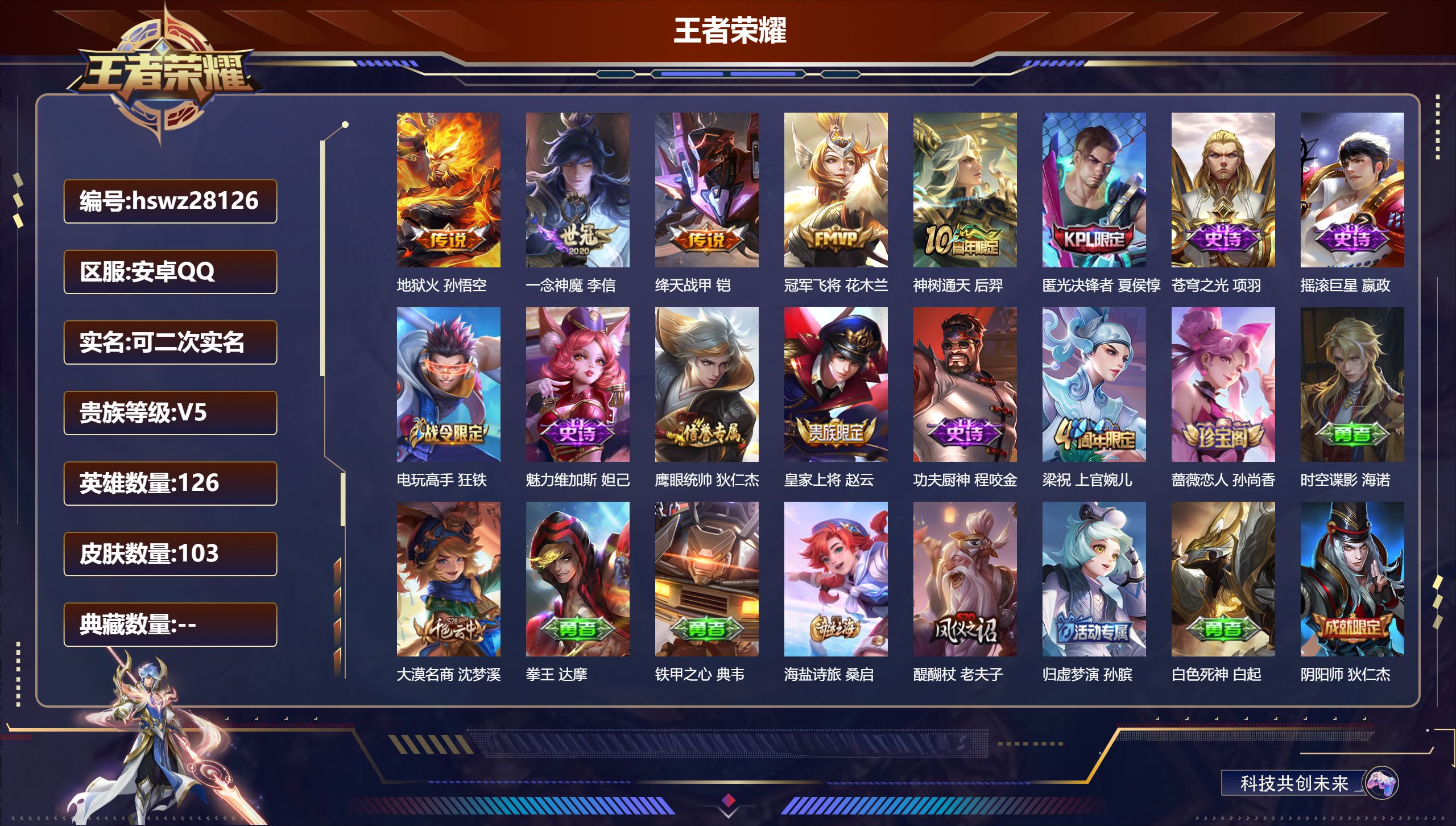 PX_2555846-Q/尊贵铂金/103皮肤/126英雄/0典藏/0珍品无双/0无双/0珍品传说/5传说/10史诗/6稀有英雄 【5,传说皮肤】地狱火,孙悟空,一念神魔,李信,绛天战甲,铠,冠军飞将,花木兰,神树通天,后羿, 【10,史诗皮肤】匿光决锋者,夏侯惇,苍穹之光,项羽,摇滚巨星,嬴政,电玩高手,狂铁,魅力维加斯,妲己,鹰眼统帅,狄仁杰,皇家上将,赵云,功夫厨神,程咬金,梁祝,上官婉儿,蔷薇恋人,孙尚香, 【60,勇者皮肤】时空谍影,海诺,大漠名商,沈梦溪,拳王,达摩,铁甲之心,典韦,海盐诗旅,桑启,醍醐杖,老夫子,归虚梦演,孙膑,白色死神,白起,阴阳师,狄仁杰,次元突破,哪吒,牛运亨通,牛魔,功夫老勺,老夫子,西部大镖客,牛魔,海滩派对,项羽,万华元夜,狄仁杰,野性能量,吕布,哥特玫瑰,露娜,无双福将,程咬金,原初探秘者,鬼谷子,潮玩探月行,猪八戒,天穹祈灯,鬼谷子,星际陆战队,程咬金,死亡骑士,亚瑟,敏锐之力,李白,掌控之力,诸葛亮,海滩丽影,钟无艳,忍·炎影,赵云,炽热元素使,姜子牙,坚韧之力,苏烈,万事如意,刘备,擒涛扼浪,裴擒虎,乓乓大师,鲁班大师,探海日志,鲁班大师,兔女郎,花木兰,龙腾万里,关羽,金庭之子,兰陵王,未来纪元,宫本武藏,千军破阵,苏烈,零食大作战,姬小满,万象初新,宫本武藏,教廷特使,韩信,云中旅人,李元芳,西部大镖客,孙悟空,进击墨子号,墨子,少女阿狸,妲己,蔚蓝守将,蒙恬,契约魔法,米莱狄,布丁狗之约,阿古朵,命运加冕,露娜,午后时光,王昭君,灵野札记,张良,特工战影,狂铁,虚灵犬护,钟馗,熔金海岸,周瑜,苍林狼骑,苍,天穹之誓,姜子牙,星梦巡礼,姜子牙,谧流熔炉,太乙真人,鹤鸣心笺,艾琳,噬灭天穹,东皇太一, 【29,其他皮肤】战争骑士,夏侯惇,圣殿之光,刘邦,芝加哥教父,黄忠,潮流仙人,老夫子,三太子,哪吒,棒球奇才,沈梦溪,超能战警,曹操,海之征途,孙策,木偶奇遇记,鲁班七号,福禄兄弟,鲁班七号,帝国元帅,项羽,绯红之刃,露娜,英喵野望,刘禅,异域舞娘,貂蝉,街头旋风,裴擒虎,归虚梦演,鲁班大师,剑舞者,花木兰,范海辛,李白,激情绿茵,马可波罗,埃及法老,杨戬,威尼斯狂欢,百里玄策,荷鲁斯之眼,云中君,创世神祝,盘古,特种部队,李元芳,孤猎,澜,踏雪寻梅,弈星,赤焰之缨,云缨,天启骑士,关羽,西部大镖客,孙悟空, 【6,稀有英雄】不知火舞,橘右京,夏洛特,娜可露露,韩信,赵云, 营地ID:,