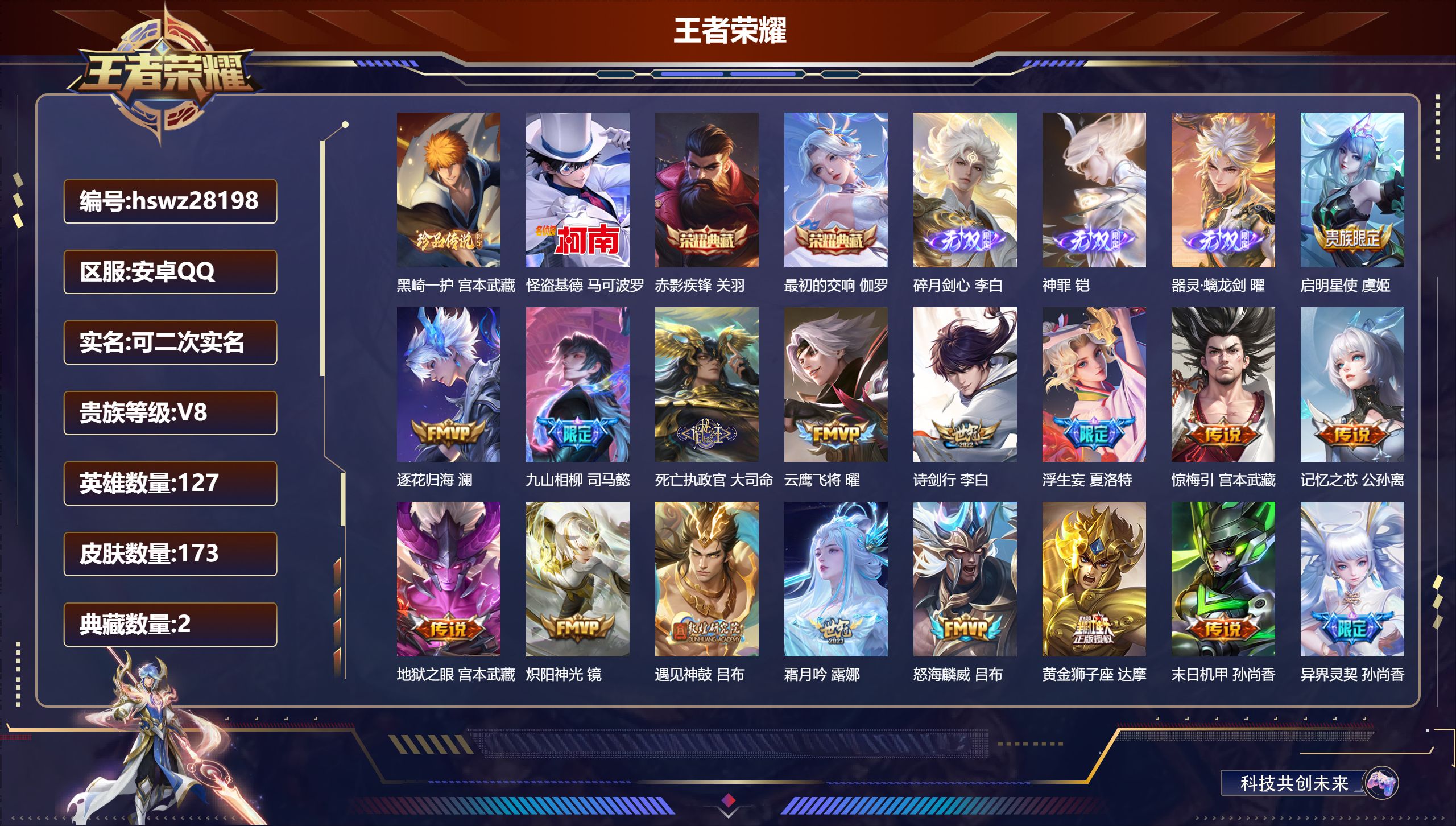 PX_2556307-Q/永恒钻石/173皮肤/127英雄/2典藏/0珍品无双/3无双/2珍品传说/20传说/65史诗/8稀有英雄 【2,珍品传说】黑崎一护,宫本武藏,怪盗基德,马可波罗, 【2,典藏皮肤】赤影疾锋,关羽,最初的交响,伽罗, 【3,无双皮肤】碎月剑心,李白,神罪,铠,器灵·螭龙剑,曜, 【20,传说皮肤】启明星使,虞姬,逐花归海,澜,九山相柳,司马懿,死亡执政官,大司命,云鹰飞将,曜,诗剑行,李白,浮生妄,夏洛特,惊梅引,宫本武藏,记忆之芯,公孙离,地狱之眼,宫本武藏,炽阳神光,镜,遇见神鼓,吕布,霜月吟,露娜,怒海麟威,吕布,黄金狮子座,达摩,末日机甲,孙尚香,异界灵契,孙尚香,山海·炽霜斩,李信,山海·苍雷引,曜,霜北刀,夏侯惇, 【65,史诗皮肤】电玩小子,鲁班七号,末日机甲,吕布,暗影游猎,马可波罗,苍穹之光,项羽,天秀·启明,杨戬,山海·玄木吟,马可波罗,心灵战警,亚瑟,五谷丰年,鬼谷子,鬼剑武藏,宫本武藏,百相守梦,黄忠,守夜人,弈星,无限星赏官,公孙离,地狱燃心,司空震,线条小狗,周瑜,玉兔公主,公孙离,摇滚巨星,嬴政,顽趣,梦奇,蜜橘之夏,公孙离,魅力维加斯,妲己,偶像歌手,王昭君,荣光圣徽,蒙恬,赏金猎手,澜,星界游侠,暃,暗夜贵公子,嬴政,鹰眼统帅,狄仁杰,光弋星穹,莱西奥,匿光侦查者,李元芳,原初追逐者,百里玄策,逐浪之夏,李元芳,奇幻香踪,扁鹊,石田雨龙,后羿,鸭鸭历险记,刘禅,驭风魔法,戈娅,魔术师,狄仁杰,龙之律动,狂铁,皇家上将,赵云,冰冠公主,雅典娜,至尊宝,孙悟空,功夫厨神,程咬金,圣诞恋歌,貂蝉,水晶猎龙者,花木兰,涂山容容,公孙离,魅语,不知火舞,器灵·浮梦炉,赵怀真,顽趣,阿古朵,夏日便利店,蔡文姬,冰雪圆舞曲,甄姬,月团寄思,沈梦溪,节奏热浪,阿轲,暗夜猫娘,阿轲,万灵启世,女娲,青龙志,铠,心灵骇客,安琪拉,乘龙·聚宝船,安琪拉,箭羽风息,伽罗,乱世虎臣,张飞,百相守梦,周瑜,万物之道,弈星,绅士熊喵,刘禅,缤纷独角兽,小乔,时之恋人,孙尚香,水果甜心,孙尚香,江河有灵,阿古朵,幽灵船长,曹操,暗隐猎兽者,兰陵王, 【65,勇者皮肤】时空谍影,海诺,玲珑珍味,西施,太极少年,赵怀真,大漠名商,沈梦溪,纽约教父,刘备,拳王,达摩,大发明家,达摩,丁香结,小乔,沉稳之力,孙尚香,海盐诗旅,桑启,白色死神,白起,黄金武士,典韦,王牌新星,海月,阴阳师,狄仁杰,径山谋武,孙权,古海寻踪,张良,牛运亨通,牛魔,鲨炮海盗猫,沈梦溪,海滩派对,项羽,完美运算,后羿,克喵,鬼谷子,踏浪烽翎,莱西奥,红桃皇后,芈月,西部游侠,莱西奥,潮玩探月行,猪八戒,天穹祈灯,鬼谷子,阿尔法小队,后羿,霸王丸,宫本武藏,潮玩骑兵,杨戬,死亡骑士,亚瑟,敏锐之力,李白,破局者,亚连,掌控之力,诸葛亮,忍·炎影,赵云,坚韧之力,苏烈,擒涛扼浪,裴擒虎,溯影追猎,虞姬,极光幻客,蚩奼,探海日志,鲁班大师,玩趣恶龙,高渐离,流音漫舞,艾琳,金庭之子,兰陵王,未来纪元,宫本武藏,罗小黑战记,哪吒,往忆晖光,明世隐,零食大作战,姬小满,荣光之誓,亚瑟,万象初新,宫本武藏,街头霸王,韩信,云中旅人,李元芳,妄想特派,李元芳,重装意志,盘古,暖冬·兔眠,嫦娥,命运加冕,露娜,鸭鸭历险记,沈梦溪,死霸装,白起,虚灵犬护,钟馗,白执事,赵云,劲辣红锅,太乙真人,魅影绮裳,影,鹤鸣心笺,艾琳,逆浪荇歌,甄姬,百相守梦,孙策,线条小狗,周瑜,线条小狗,桑启, 【19,其他皮肤】金属狂潮,高渐离,潮流仙人,老夫子,龙域领主,铠,花见巫女,伽罗,万圣前夜,小乔,熊喵少女,阿古朵,木偶奇遇记,鲁班七号,冰刃幻境,镜,魇语军师,司马懿,启蛰,司空震,花间舞,公孙离,维京掠夺者,苍,绝影神枪,百里守约,孤猎,澜,踏雪寻梅,弈星,秩序猎龙将,蒙恬,赤焰之缨,云缨,怪盗基德,马可波罗,黑崎一护,宫本武藏, 【8,稀有英雄】敖隐,不知火舞,橘右京,夏洛特,娜可露露,韩信,艾琳,赵云, 营地ID:,