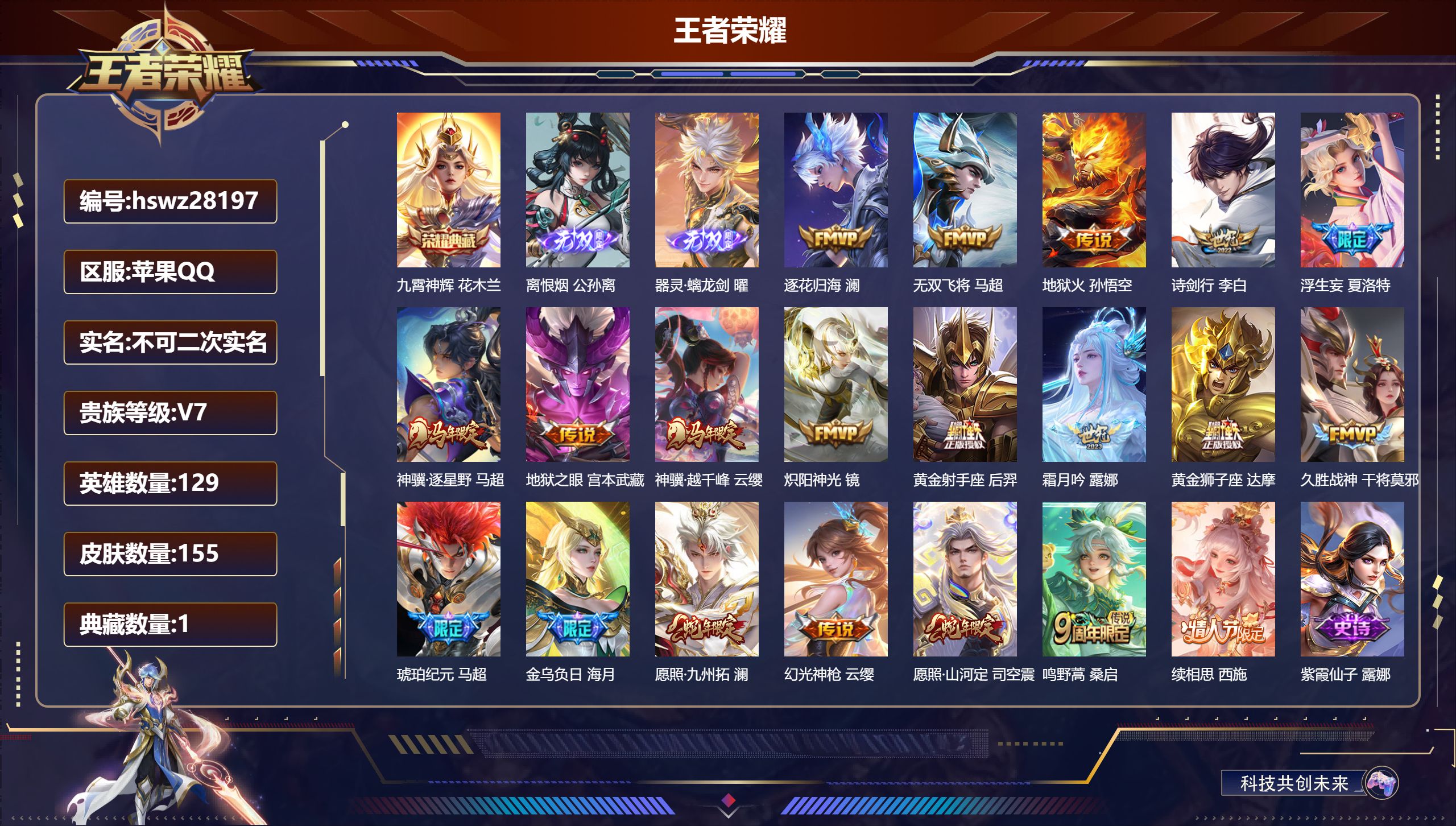 PX_2556302-Q/至尊星耀/155皮肤/129英雄/1典藏/0珍品无双/2无双/0珍品传说/20传说/39史诗/9稀有英雄 【1,典藏皮肤】九霄神辉,花木兰, 【2,无双皮肤】离恨烟,公孙离,器灵·螭龙剑,曜, 【20,传说皮肤】逐花归海,澜,无双飞将,马超,地狱火,孙悟空,诗剑行,李白,浮生妄,夏洛特,神骥·逐星野,马超,地狱之眼,宫本武藏,神骥·越千峰,云缨,炽阳神光,镜,黄金射手座,后羿,霜月吟,露娜,黄金狮子座,达摩,久胜战神,干将莫邪,琥珀纪元,马超,金乌负日,海月,愿照·九州拓,澜,幻光神枪,云缨,愿照·山河定,司空震,鸣野蒿,桑启,续相思,西施, 【39,史诗皮肤】紫霞仙子,露娜,暗影游猎,马可波罗,妄想食味,姬小满,百相守梦,黄忠,线条小狗,周瑜,赞萌露比,云缨,女仆咖啡,妲己,九幽镇关,项羽,暗夜贵公子,嬴政,鹰眼统帅,狄仁杰,金属风暴,墨子,特工魅影,百里守约,猫狗日记,孙策,原初追逐者,百里玄策,逐浪之夏,李元芳,黎明之约,雅典娜,魔术师,狄仁杰,龙之律动,狂铁,神威,马超,皇家上将,赵云,梁祝,上官婉儿,圣诞恋歌,貂蝉,水晶猎龙者,花木兰,涂山容容,公孙离,破空之剑,亚连,星界战将,牛魔,茶境仙,孙膑,冰雪圆舞曲,甄姬,青蛇,小乔,节奏热浪,阿轲,万灵启世,女娲,箭羽风息,伽罗,乱世虎臣,张飞,缤纷独角兽,小乔,百相守梦,百里守约,水果甜心,孙尚香,江河有灵,阿古朵,幽灵船长,曹操,乘风破浪,夏侯惇, 【80,勇者皮肤】太极少年,赵怀真,拳王,达摩,龙舞盛年,沈梦溪,丁香结,小乔,汉昭烈帝,刘备,白色死神,白起,阴阳师,狄仁杰,径山谋武,孙权,古海寻踪,张良,功夫老勺,老夫子,鲨炮海盗猫,沈梦溪,鲤鱼之梦,庄周,海滩派对,项羽,克喵,鬼谷子,踏浪烽翎,莱西奥,红桃皇后,芈月,西部游侠,莱西奥,哥特玫瑰,露娜,百相守梦,影,天穹祈灯,鬼谷子,化身博士,扁鹊,阿尔法小队,后羿,五福同心,张飞,赤刃凌霄,敖隐,浪漫序章,刘备,玩偶对对碰,安琪拉,雪境奇遇,西施,炽热元素使,姜子牙,坚韧之力,苏烈,擒涛扼浪,裴擒虎,乓乓大师,鲁班大师,逐霄之志,曹操,溯影追猎,虞姬,极光幻客,蚩奼,探海日志,鲁班大师,女武神,艾琳,雾都夜雨,干将莫邪,龙腾万里,关羽,未来纪元,宫本武藏,罗小黑战记,哪吒,零食大作战,姬小满,荣光之誓,亚瑟,万象初新,宫本武藏,街头霸王,韩信,少女阿狸,妲己,春野闲踪,苏烈,布丁狗之约,阿古朵,暖冬·兔眠,嫦娥,命运加冕,露娜,小满鸭,姬小满,灵野札记,张良,命运角斗场,狂铁,死霸装,白起,特工战影,狂铁,虚灵犬护,钟馗,漠中幻影,嫦娥,白执事,赵云,神迹守卫,孙悟空,剑破天穹,刘邦,异域游侠,刘备,铁骨偃魂,典韦,熔金海岸,周瑜,苍林狼骑,苍,天穹之誓,姜子牙,魅影绮裳,影,访茗客,马超,谧流熔炉,太乙真人,群星魔术团,程咬金,暗都幽影,大司命,鹤鸣心笺,艾琳,锦麟游梦,庄周,云械蓝图,云中君,逆浪荇歌,甄姬,海之女神,海月,线条小狗,周瑜,百相守梦,老夫子,噬灭天穹,东皇太一,敬我三分,盘古,玫蓝誓约,戈娅,景韶洛都,明世隐, 【14,其他皮肤】第七人偶,干将莫邪,灼热之刃,李信,绯红之刃,露娜,冰刃幻境,镜,碧珀绯影,暃,午夜歌剧院,元歌,启蛰,司空震,花间舞,公孙离,东海龙王,东皇太一,激情绿茵,马可波罗,尼罗河女神,女娲,幸存者,马超,绝影神枪,百里守约,赤焰之缨,云缨, 【9,稀有英雄】敖隐,嬴政,不知火舞,橘右京,夏洛特,娜可露露,韩信,艾琳,赵云, 营地ID:,