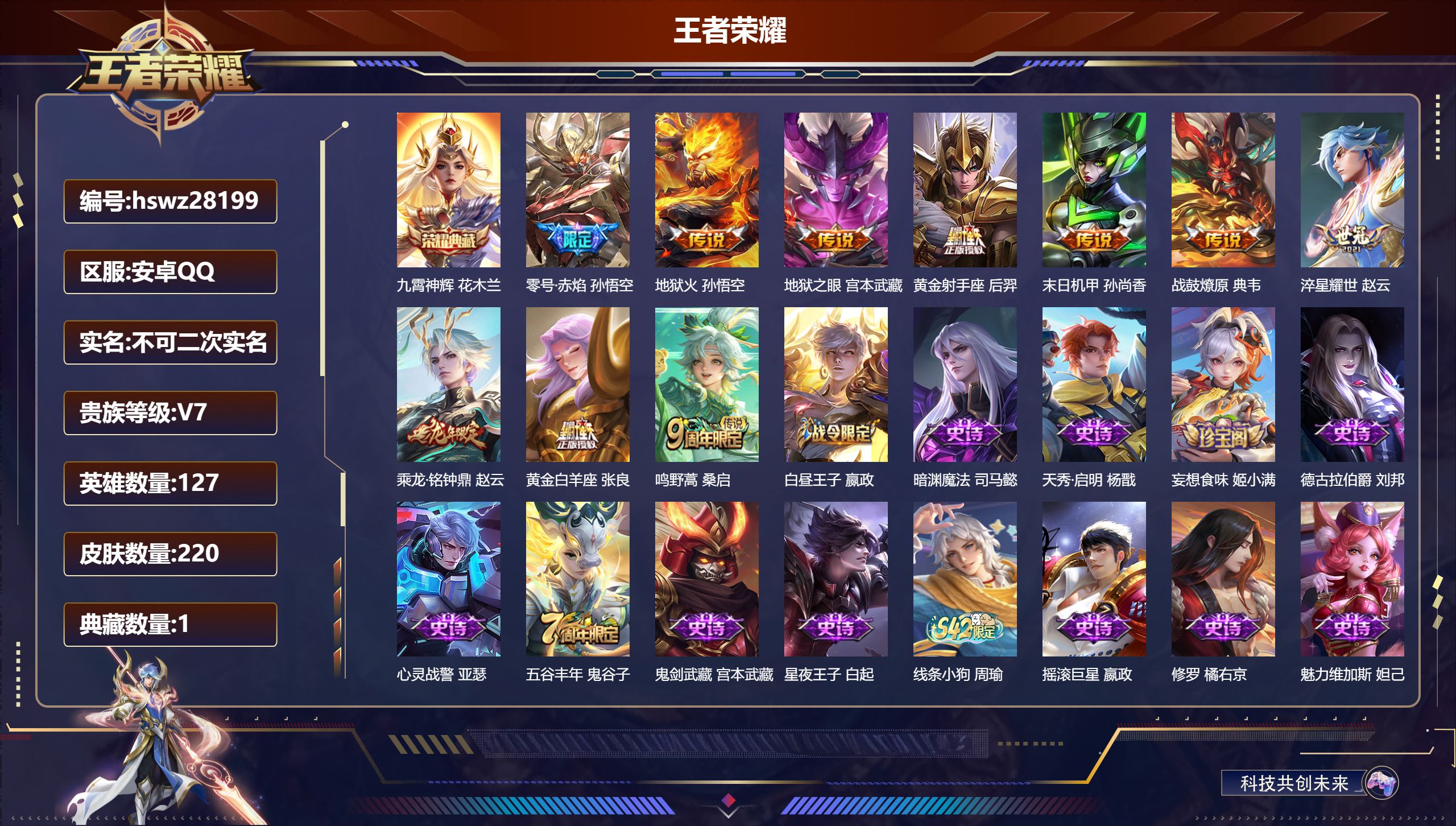 PX_2556308-Q/至尊星耀/220皮肤/127英雄/1典藏/0珍品无双/0无双/0珍品传说/10传说/59史诗/8稀有英雄 【1,典藏皮肤】九霄神辉,花木兰, 【10,传说皮肤】零号·赤焰,孙悟空,地狱火,孙悟空,地狱之眼,宫本武藏,黄金射手座,后羿,末日机甲,孙尚香,战鼓燎原,典韦,淬星耀世,赵云,乘龙·铭钟鼎,赵云,黄金白羊座,张良,鸣野蒿,桑启, 【59,史诗皮肤】白昼王子,嬴政,暗渊魔法,司马懿,天秀·启明,杨戬,妄想食味,姬小满,德古拉伯爵,刘邦,心灵战警,亚瑟,五谷丰年,鬼谷子,鬼剑武藏,宫本武藏,星夜王子,白起,线条小狗,周瑜,摇滚巨星,嬴政,修罗,橘右京,魅力维加斯,妲己,偶像歌手,王昭君,梅西,裴擒虎,女仆咖啡,妲己,晚萤,娜可露露,鹰眼统帅,狄仁杰,大圣娶亲,孙悟空,李小龙,裴擒虎,驯魔猎人,兰陵王,金属风暴,墨子,特工魅影,百里守约,猫狗日记,孙策,原初追逐者,百里玄策,未来纪元,赵云,黎明之约,雅典娜,魔术师,狄仁杰,龙之律动,狂铁,顽岩魄,蒙犽,皇家上将,赵云,梁祝,上官婉儿,电玩·爆裂旋风,刘禅,天才门将,刘禅,水晶猎龙者,花木兰,撼地雄心,廉颇,涂山容容,公孙离,破空之剑,亚连,圣诞狂欢,吕布,魅语,不知火舞,白龙吟,韩信,夏日便利店,蔡文姬,星界战将,牛魔,冰雪圆舞曲,甄姬,青蛇,小乔,雪上飞焰,哪吒,千年之狐,李白,节奏热浪,阿轲,暗夜猫娘,阿轲,万灵启世,女娲,青龙志,铠,心灵骇客,安琪拉,乱世虎臣,张飞,缤纷独角兽,小乔,线条小狗,小乔,水果甜心,孙尚香,幽灵船长,曹操,乘风破浪,夏侯惇,暗隐猎兽者,兰陵王, 【105,勇者皮肤】胡桃夹子,干将莫邪,烛龙,曹操,爱心护理,阿轲,沙漠行僧,达摩,大漠名商,沈梦溪,缤纷绘卷,张良,拳王,达摩,大发明家,达摩,龙舞盛年,沈梦溪,功夫炙烤,廉颇,沉稳之力,孙尚香,海盐诗旅,桑启,朔风刀,夏侯惇,醍醐杖,老夫子,汉昭烈帝,刘备,白色死神,白起,黄金武士,典韦,御旌,牛魔,阴阳师,狄仁杰,次元突破,哪吒,古海寻踪,张良,科学大爆炸,项羽,功夫老勺,老夫子,西部大镖客,牛魔,鲨炮海盗猫,沈梦溪,海滩派对,项羽,万华元夜,狄仁杰,演武夺筹,程咬金,红桃皇后,芈月,西部游侠,莱西奥,猎兽之王,吕布,野性能量,吕布,哥特玫瑰,露娜,守护之力,大乔,无双福将,程咬金,百相守梦,影,原初探秘者,鬼谷子,潮玩探月行,猪八戒,天穹祈灯,鬼谷子,疑决卦,明世隐,如懿,安琪拉,化身博士,扁鹊,阿尔法小队,后羿,五福同心,张飞,星际陆战队,程咬金,幻乐之宴,鬼谷子,霸王丸,宫本武藏,虹云星官,明世隐,雾影缉谜,兰陵王,赤莲之焰,周瑜,死亡骑士,亚瑟,敏锐之力,李白,破局者,亚连,海滩丽影,钟无艳,忍·炎影,赵云,重明,芈月,炽热元素使,姜子牙,坚韧之力,苏烈,万事如意,刘备,擒涛扼浪,裴擒虎,乓乓大师,鲁班大师,溯影追猎,虞姬,探海日志,鲁班大师,天使之翼,孙膑,兔女郎,花木兰,龙腾万里,关羽,金庭之子,兰陵王,罗小黑战记,哪吒,千军破阵,苏烈,零食大作战,姬小满,荣光之誓,亚瑟,花好人间,甄姬,万象初新,宫本武藏,御銮,盾山,春野之旅,钟无艳,秘密基地,刘禅,穷奇,典韦,教廷特使,韩信,街头霸王,韩信,云中旅人,李元芳,妄想特派,李元芳,西部大镖客,孙悟空,少女阿狸,妲己,混沌棋,弈星,御霄,米莱狄,契约魔法,米莱狄,幻想奇妙夜,王昭君,驱傩正仪,钟馗,命运角斗场,狂铁,御狮,狂铁,白执事,赵云,神迹守卫,孙悟空,罗小黑战记,张良,剑破天穹,刘邦,熔金海岸,周瑜,天穹之誓,姜子牙,暗都幽影,大司命,夏日便利店,虞姬,鹤鸣心笺,艾琳,逆浪荇歌,甄姬,线条小狗,周瑜,噬灭天穹,东皇太一,动物派对,亚瑟,敬我三分,盘古,景韶洛都,明世隐, 【47,其他皮肤】伊势巫女,大乔,三太子,哪吒,龙域领主,铠,死神来了,曹操,花见巫女,伽罗,第七人偶,干将莫邪,灼热之刃,李信,熊喵少女,阿古朵,海之征途,孙策,木偶奇遇记,鲁班七号,福禄兄弟,鲁班七号,帝国元帅,项羽,精灵王,后羿,冰刃幻境,镜,碧珀绯影,暃,魇语军师,司马懿,午夜歌剧院,元歌,启蛰,司空震,花间舞,公孙离,异域舞娘,貂蝉,街头旋风,裴擒虎,东海龙王,东皇太一,修竹墨客,上官婉儿,剑舞者,花木兰,范海辛,李白,激情绿茵,马可波罗,埃及法老,杨戬,归虚梦演,西施,年年有余,猪八戒,尼罗河女神,女娲,锦衣卫,狄仁杰,威尼斯狂欢,百里玄策,幸存者,马超,战争女神,雅典娜,创世神祝,盘古,特种部队,李元芳,绝影神枪,百里守约,森,瑶,孤猎,澜,加勒比小姐,虞姬,踏雪寻梅,弈星,秩序猎龙将,蒙恬,精灵公主,王昭君,赤焰之缨,云缨,地府判官,钟馗,美梦成真,梦奇,西部大镖客,孙悟空, 【8,稀有英雄】嬴政,不知火舞,橘右京,夏洛特,娜可露露,韩信,艾琳,赵云, 营地ID:,