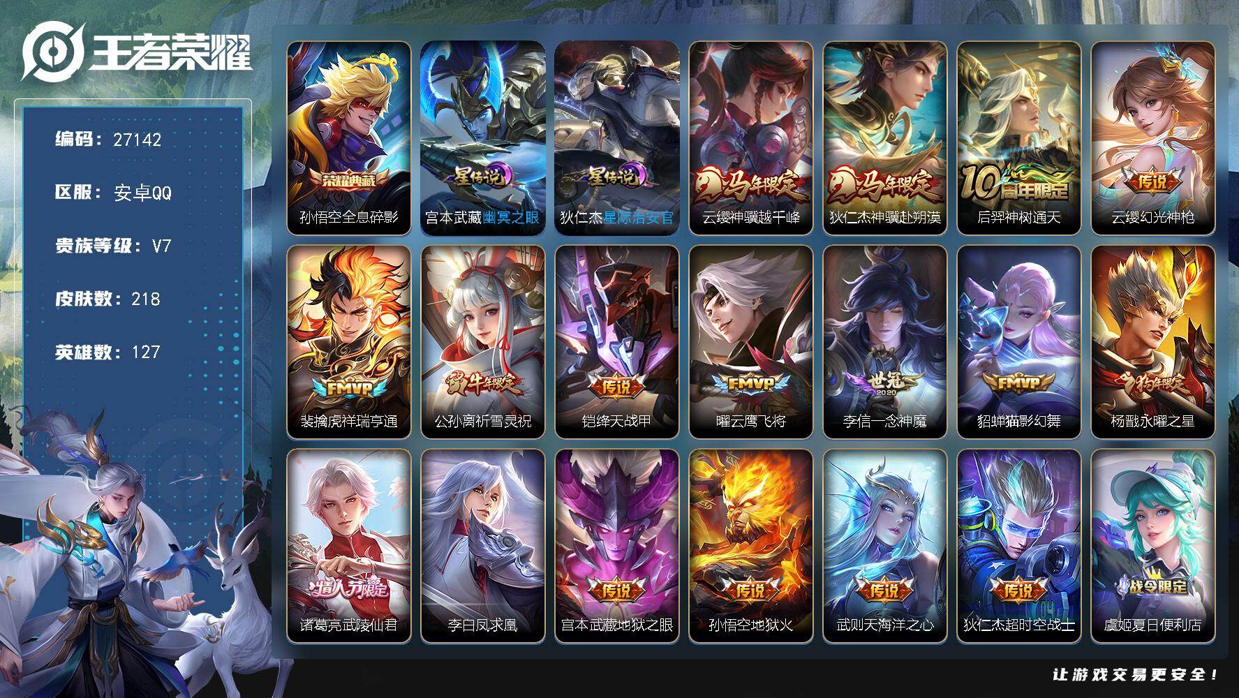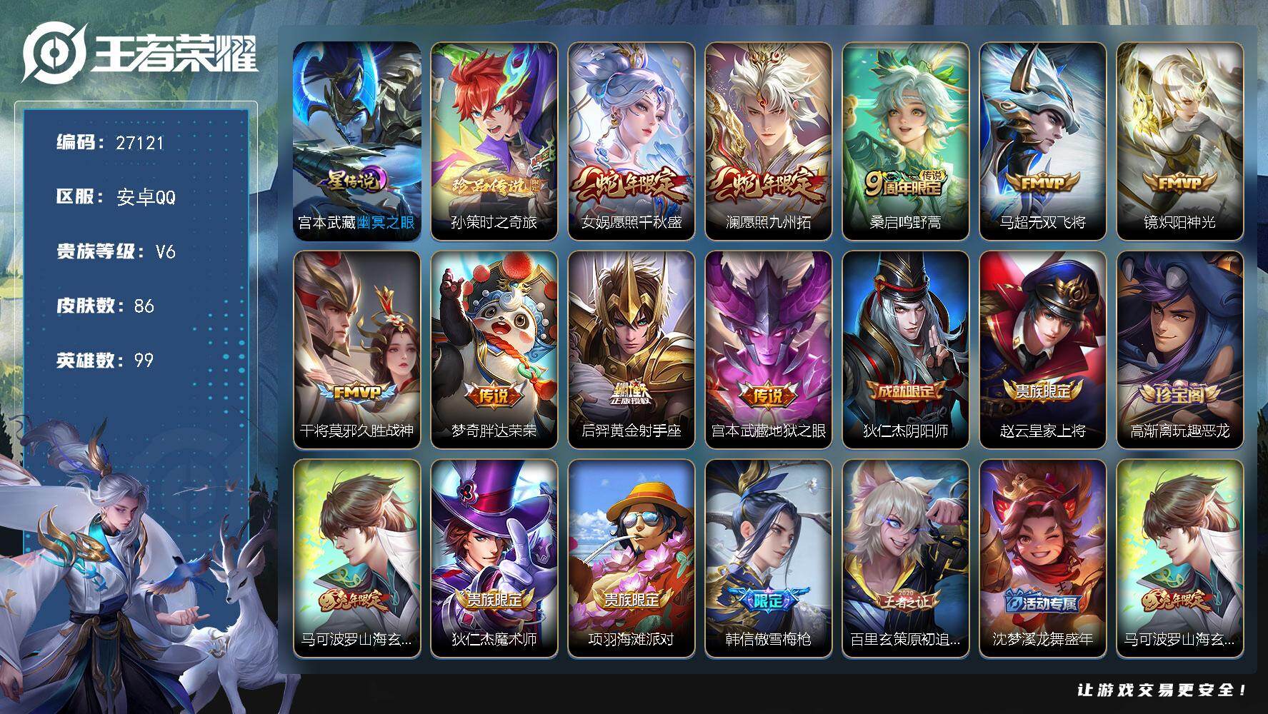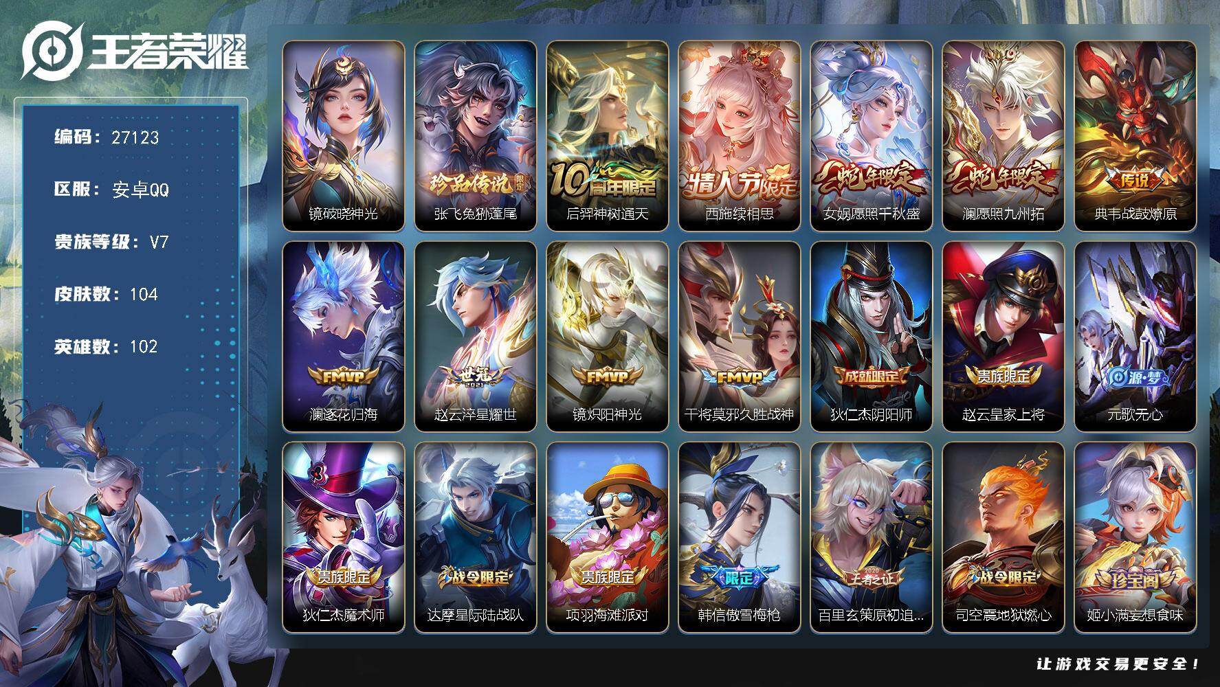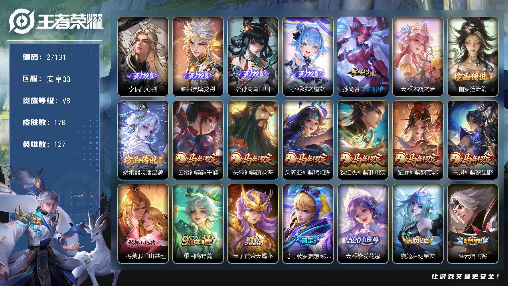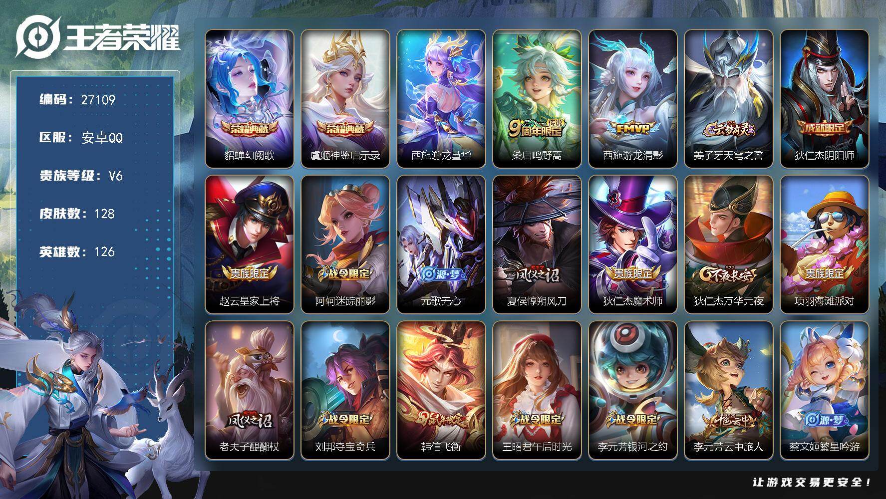 PX_2527019-可换绑【精品女小号·虞姬貂蝉典藏·游龙清影带星传说·幻珠鲛人·聚宝船·白鹤梁神女·飞衡·无二次】3538星币,幸运值265,4按键,1星传说,8王者印记,五级铭文110,无二次安卓Q-V6-128皮肤-2典藏皮肤-2传说-43史诗【荣耀典藏】:貂蝉幻阙歌,虞姬神鉴启示录【星元皮肤】:西施游龙堇华【传说皮肤】:桑启鸣野蒿,西施游龙清影【限定皮肤】:姜子牙天穹之誓,狄仁杰阴阳师,赵云皇家上将,阿轲迷踪丽影,元歌无心,夏侯惇朔风刀,狄仁杰魔术师,狄仁杰万华元夜,项羽海滩派对,老夫子醍醐杖,刘邦夺宝奇兵,韩信飞衡,王昭君午后时光,李元芳银河之约,李元芳云中旅人,蔡文姬繁星吟游,鬼谷子原初探秘者,鬼谷子五谷丰年,大乔白鹤梁神女,弈星混沌棋,沈梦溪星空之诺,沈梦溪大漠名商,明世隐疑决卦,裴擒虎擒涛扼浪,狂铁电玩高手,上官婉儿天狼绘梦者,嫦娥拒霜思,嫦娥暖冬兔眠,鲁班大师探海日志,桑启海盐诗旅,暃星界游侠,张良古海寻踪,蒙犽百解令,鬼谷子天穹祈灯,姬小满妄想食味,安琪拉乘龙聚宝船,周瑜熔金海岸【年限皮肤】:韩信飞衡,安琪拉乘龙聚宝船【赛季限定】:夏侯惇朔风刀,弈星混沌棋,明世隐疑决卦,老夫子醍醐杖,鬼谷子原初探秘者,狄仁杰万华元夜,沈梦溪大漠名商,李元芳云中旅人,桑启海盐诗旅,裴擒虎擒涛扼浪,鲁班大师探海日志,张良古海寻踪,鬼谷子天穹祈灯,姜子牙天穹之誓,东皇太一噬灭天穹,钟馗虚灵犬护,甄姬逆浪荇歌,亚瑟荣光之誓,牛魔星界战将,项羽九幽镇关【战令限定】:李元芳银河之约,沈梦溪星空之诺,阿轲迷踪丽影,刘邦夺宝奇兵,狂铁电玩高手,王昭君午后时光,暃星界游侠,嫦娥暖冬兔眠,刘禅鸭鸭历险记,沈梦溪鸭鸭历险记,周瑜线条小狗【史诗皮肤】:周瑜线条小狗,项羽九幽镇关,朵莉亚幻珠鲛人,黄忠百相守梦,狂铁龙之律动,刘禅鸭鸭历险记,牛魔星界战将,安琪拉乘龙聚宝船,姬小满妄想食味,蒙犽百解令,暃星界游侠,元歌无心,鬼谷子五谷丰年,狂铁电玩高手,嫦娥拒霜思,大乔白鹤梁神女,上官婉儿天狼绘梦者,孙尚香时之恋人,阿轲迷踪丽影,韩信飞衡,娜可露露晚萤,李元芳银河之约,蔡文姬繁星吟游,公孙离无限星赏官,狄仁杰鹰眼统帅,伽罗箭羽风息,阿轲节奏热浪,亚瑟心灵战警,小乔缤纷独角兽,夏侯惇乘风破浪,李白千年之狐,曹操幽灵船长,妲己女仆咖啡,妲己魅力维加斯,孙尚香水果甜心,狄仁杰魔术师,王昭君偶像歌手,甄姬冰雪圆舞曲,貂蝉圣诞恋歌,赵云未来纪元,赵云皇家上将,阿轲暗夜猫娘,露娜紫霞仙子,鲁班七号电玩小子【其他皮肤】:桑启线条小狗,虞姬溯影追猎,艾琳鹤鸣心笺,亚瑟荣光之誓,莱西奥踏浪烽翎,甄姬逆浪荇歌,白起死霸装,姬小满小满鸭,露娜命运加冕,阿古朵布丁狗之约,沈梦溪鸭鸭历险记,钟馗虚灵犬护,东皇太一噬灭天穹,周瑜熔金海岸,姜子牙天穹之誓,朵莉亚金色潮汐,鬼谷子天穹祈灯,张良古海寻踪,姬小满零食大作战,鲁班大师探海日志,太乙真人劲辣红锅,裴擒虎擒涛扼浪,海月幻泉雾影,嫦娥暖冬兔眠,桑启海盐诗旅,李元芳云中旅人,沈梦溪大漠名商,王昭君午后时光,鲁班大师乓乓大师,狄仁杰万华元夜,鬼谷子原初探秘者,老夫子醍醐杖,盾山圆桌骑士,刘邦夺宝奇兵,明世隐疑决卦,哪吒次元突破,弈星混沌棋,沈梦溪星空之诺,夏侯惇朔风刀,沈梦溪鲨炮海盗猫,小乔丁香结,大乔守护之力,苏烈坚韧之力,李白敏锐之力,孙尚香沉稳之力,王昭君幻想奇妙夜,关羽龙腾万里,刘备汉昭烈帝,刘备纽约教父,狄仁杰阴阳师,花木兰兔女郎,达摩拳王,亚瑟死亡骑士,典韦黄金武士,妲己少女阿狸,武则天东方不败,牛魔西部大镖客,达摩大发明家,阿轲爱心护理,韩信街头霸王,项羽海滩派对,司空震启蛰,澜孤猎,西施归虚梦演,曜归虚梦演,盘古创世神祝,上官婉儿修竹墨客,李信灼热之刃,司马懿魇语军师,元歌午夜歌剧院,杨玉环霓裳曲,公孙离花间舞,梦奇美梦成真,大乔伊势巫女,杨戬埃及法老,雅典娜战争女神,蔡文姬蔷薇王座,李元芳特种部队,妲己仙境爱丽丝,花木兰剑舞者