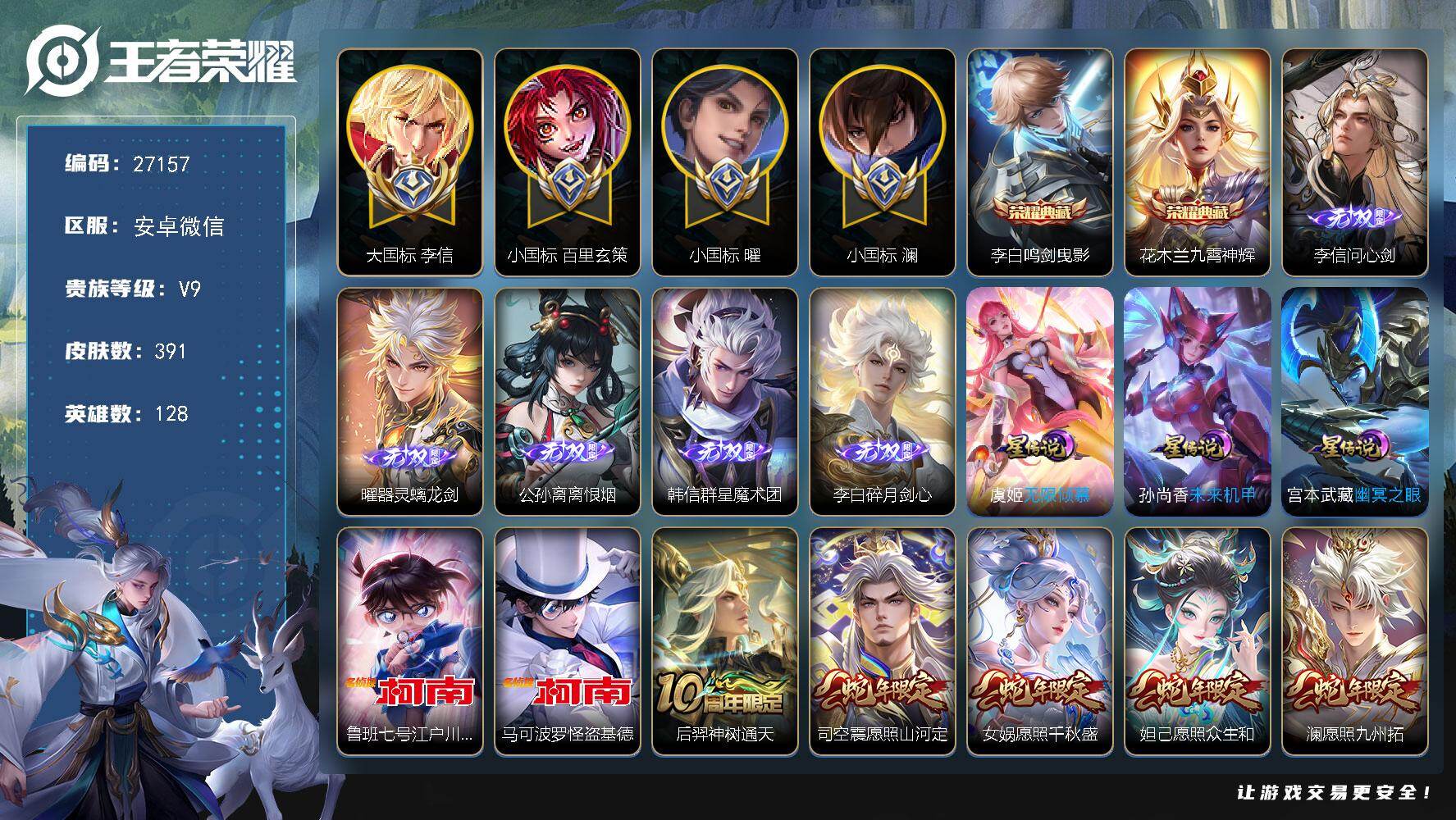 PX_2538542-可换绑【V9极品战力号·贵族积分17.8万·大国标李信1.4万·小国标曜1.24万·澜小国标1.24万·百里玄策小国标1.47万·韩信金标1.21万·打野69段·李信曜公孙离韩信李白5无双·双珍品怪盗基德江户川柯南】幸运值216,13按键,3星传说,1天幕,25王者印记,五级铭文290,无二次安卓WX-V9-391皮肤-2典藏皮肤-5无双-2珍品传说-52传说-126史诗【英雄全皮】:孙权全皮,娜可露露全皮,橘右京全皮,狂铁全皮,李信全皮,曜全皮,澜全皮,夏洛特全皮,司空震全皮,赵怀真全皮,戈娅全皮【荣耀典藏】:李白鸣剑曳影,花木兰九霄神辉【无双皮肤】:李信问心剑,曜器灵螭龙剑,公孙离离恨烟,韩信群星魔术团,李白碎月剑心【珍品传说】:鲁班七号江户川柯南,马可波罗怪盗基德【大国标】:大国标李信【小国标】:小国标曜,小国标澜,小国标百里玄策【天幕】:灿若星河天幕【星元皮肤】:宫本武藏幽冥之眼,孙尚香未来机甲,虞姬无限倾慕【传说皮肤】:后羿神树通天,司空震愿照山河定,女娲愿照千秋盛,妲己愿照众生和,澜愿照九州拓,蔡文姬愿照福禄聚,虞姬愿照岁时盈,云缨幻光神枪,桑启鸣野蒿,夏侯惇霜北刀,铠冥王哈迪斯,澜逐花归海,露娜霜月吟,云缨鹤归松栖,马可波罗妄想实况,诸葛亮鹤羽星尊,澜电玩雷克斯,夏洛特浮生妄,虞姬无限倾心,项羽无限倾心,孙悟空齐天大圣,小乔山海琳琅生,曜山海苍雷引,李信山海炽霜斩,李白诗剑行,橘右京枫霜尽,娜可露露前尘镜,露娜启示之音,赵云淬星耀世,曜李逍遥,,周瑜音你心动,李元芳飞鸢探春,兰陵王默契交锋,诸葛亮时雨天司,铠绛天战甲,镜炽阳神光,虞姬启明星使,孙悟空零号赤焰,关羽武圣,曜云鹰飞将,李信一念神魔,刘备时之恋人,张良黄金白羊座,干将莫邪久胜战神,达摩黄金狮子座,百里玄策白虎志,花木兰冠军飞将,杨戬永曜之星,孙尚香末日机甲,宫本武藏地狱之眼,孙悟空地狱火,狄仁杰超时空战士【限定皮肤】:公孙离离恨烟,夏侯惇霜北刀,铠冥王哈迪斯,暃埋骨钱,蒙犽顽岩魄,蔡文姬夏日便利店,虞姬夏日便利店,姜子牙天穹之誓,杨戬破阵退雄兵,狄仁杰阴阳师,小乔山海琳琅生,赵云皇家上将,赵云引擎之心,墨子神迹守卫,阿轲迷踪丽影,钟无艳超时空战士,芈月重明,吕布御风骁将,元歌云间偶戏,元歌无心,夏侯惇朔风刀,甄姬落雪兰心,典韦穷奇,典韦岱宗,马可波罗逐梦之星,马可波罗暗影游猎,马可波罗妄想实况,狄仁杰魔术师,狄仁杰万华元夜,达摩星际陆战队,项羽海滩派对,项羽霸王别姬,项羽无限倾心,老夫子醍醐杖,老夫子航海奇遇记,关羽冰锋战神,关羽武圣,关羽百相守梦,程咬金演武夺筹,露娜启示之音,韩信逐梦之影,韩信飞衡,王昭君午后时光,兰陵王默契交锋,兰陵王金庭之子,花木兰默契交锋,娜可露露前尘镜,橘右京枫霜尽,亚瑟潮玩骑士王,孙悟空美猴王,孙悟空至尊宝,孙悟空零号赤焰,孙悟空孙行者,孙悟空齐天大圣,牛魔御旌,后羿辉光之辰,李元芳银河之约,李元芳云中旅人,虞姬霸王别姬,虞姬启明星使,虞姬无限倾心,钟馗驱傩正仪,杨玉环遇见飞天,杨戬永曜之星,干将莫邪胡桃夹子,雅典娜单词大作战,雅典娜黎明之约,鬼谷子原初探秘者,鬼谷子五谷丰年,诸葛亮时雨天司,诸葛亮鹤羽星尊,黄忠烈魂,百里玄策白虎志,百里玄策原初追逐者,弈星混沌棋,梦奇顽趣,公孙离蜜橘之夏,沈梦溪大漠名商,明世隐疑决卦,裴擒虎天狼狩猎者,裴擒虎擒涛扼浪,狂铁御狮,狂铁电玩高手,米莱狄御霄,米莱狄胡桃异想国,云中君纤云弄巧,李信山海炽霜斩,伽罗天狼溯光者,盾山御銮,猪八戒西部大镖客,上官婉儿梁祝,上官婉儿神器万象笔,嫦娥拒霜思,嫦娥暖冬兔眠,曜李逍遥,,曜山海苍雷引,西施玲珑珍味,蒙犽狂想玩偶喵,鲁班大师探海日志,盘古冰霜神祇,桑启海盐诗旅,夏洛特浮生妄,暃星界游侠,戈娅驭风魔法,艾琳流音漫舞,赵怀真鹤归松栖,云缨鹤归松栖,司空震地狱燃心,阿古朵江河有灵,张良古海寻踪,蒙犽百解令,蒙恬荣光圣徽,高渐离燃音魔法,妲己灵卜魔法,鬼谷子天穹祈灯,李白碎月剑心,姬小满妄想食味,刘邦剑破天穹,程咬金群星魔术团,韩信群星魔术团,镜青焰无极,项羽苍威无极,周瑜熔金海岸【年限皮肤】:孙悟空美猴王,杨戬永曜之星,后羿辉光之辰,百里玄策白虎志,典韦岱宗,韩信飞衡,诸葛亮时雨天司,吕布御风骁将,小乔山海琳琅生,曜山海苍雷引,李信山海炽霜斩,司空震愿照山河定,女娲愿照千秋盛,妲己愿照众生和,澜愿照九州拓,蔡文姬愿照福禄聚,虞姬愿照岁时盈【赛季限定】:芈月重明,典韦穷奇,狂铁御狮,米莱狄御霄,牛魔御旌,盾山御銮,夏侯惇朔风刀,弈星混沌棋,明世隐疑决卦,老夫子醍醐杖,鬼谷子原初探秘者,狄仁杰万华元夜,程咬金演武夺筹,钟馗驱傩正仪,兰陵王金庭之子,沈梦溪大漠名商,李元芳云中旅人,桑启海盐诗旅,裴擒虎擒涛扼浪,鲁班大师探海日志,张良古海寻踪,鬼谷子天穹祈灯,刘邦剑破天穹,姜子牙天穹之誓,东皇太一噬灭天穹,太乙真人谧流熔炉,百里玄策原初追逐者,雅典娜黎明之约,梦奇顽趣,蒙恬荣光圣徽,牛魔星界战将,项羽九幽镇关【战令限定】:李元芳银河之约,阿轲迷踪丽影,马可波罗暗影游猎,猪八戒西部大镖客,蒙犽狂想玩偶喵,雅典娜单词大作战,元歌云间偶戏,亚瑟潮玩骑士王,米莱狄胡桃异想国,达摩星际陆战队,老夫子航海奇遇记,墨子神迹守卫,狂铁电玩高手,王昭君午后时光,钟无艳超时空战士,甄姬落雪兰心,暃星界游侠,嫦娥暖冬兔眠,